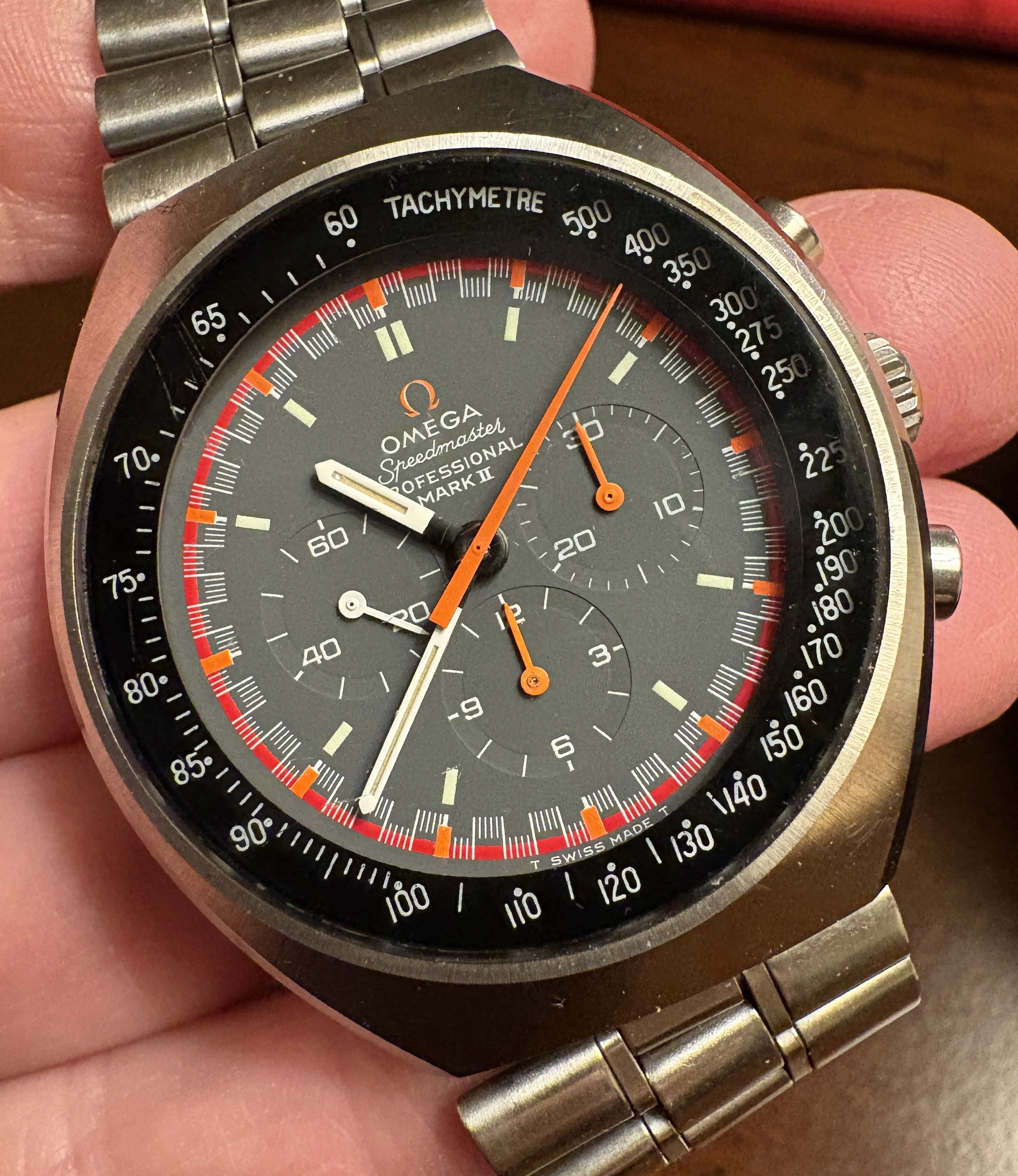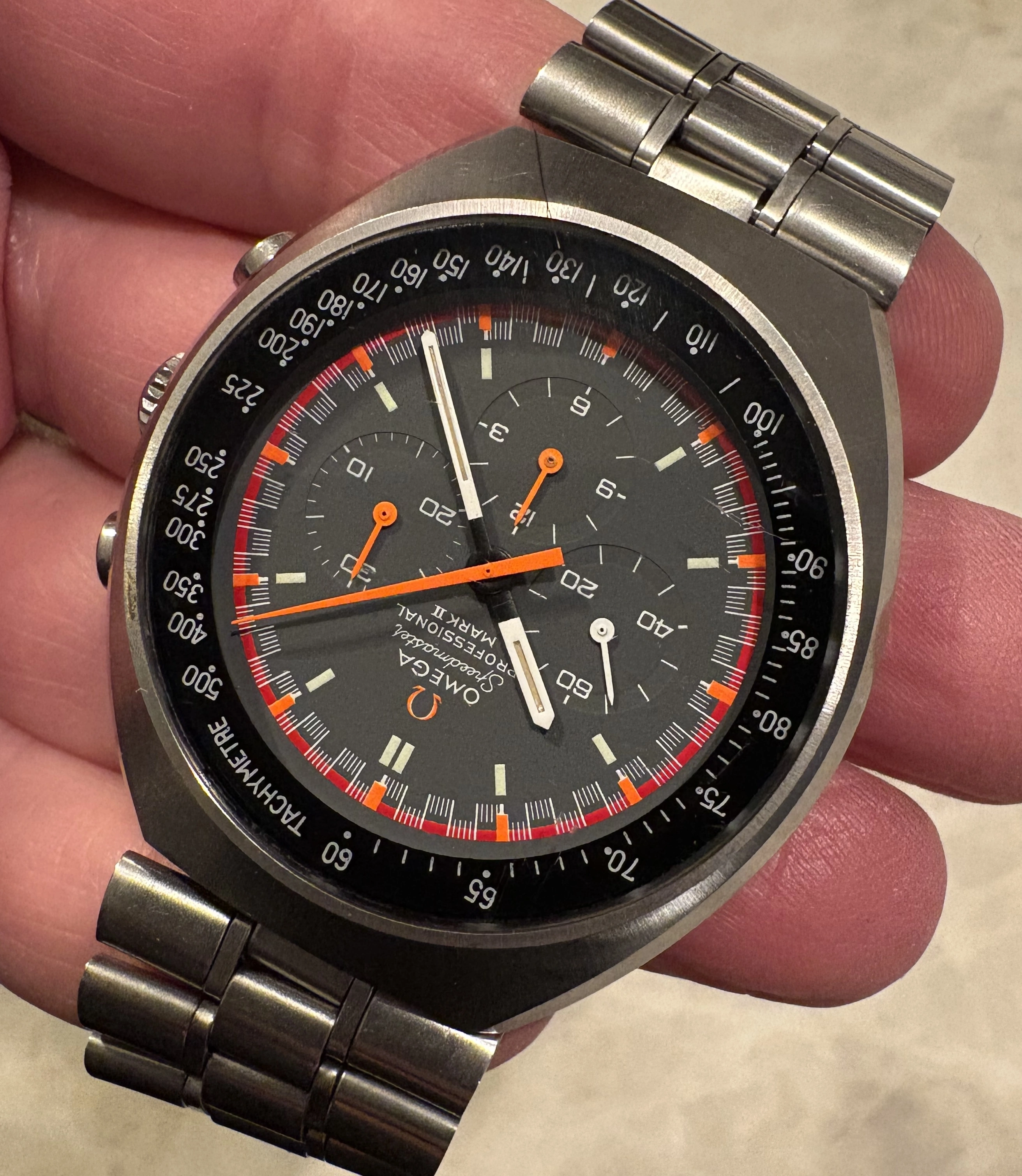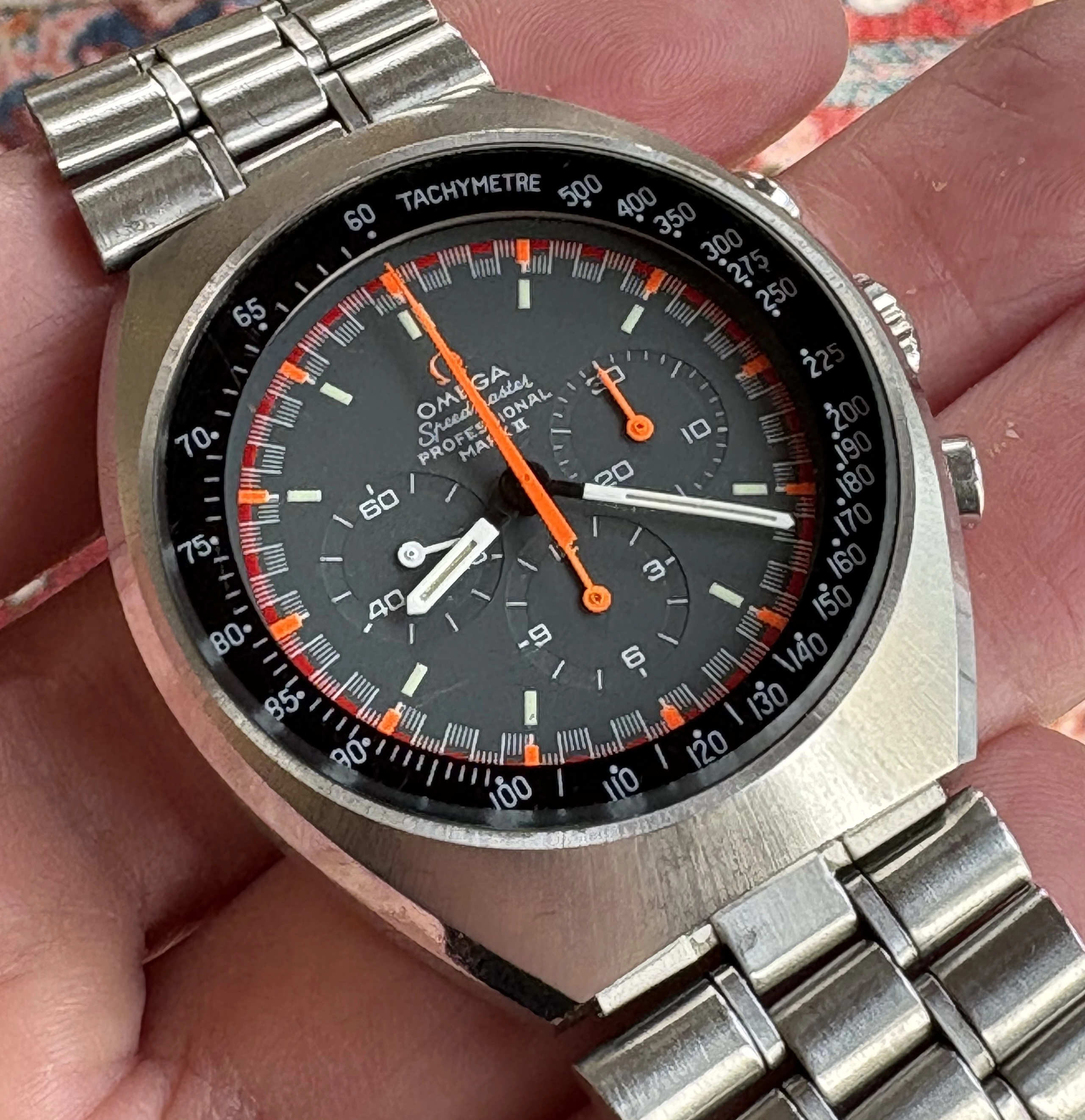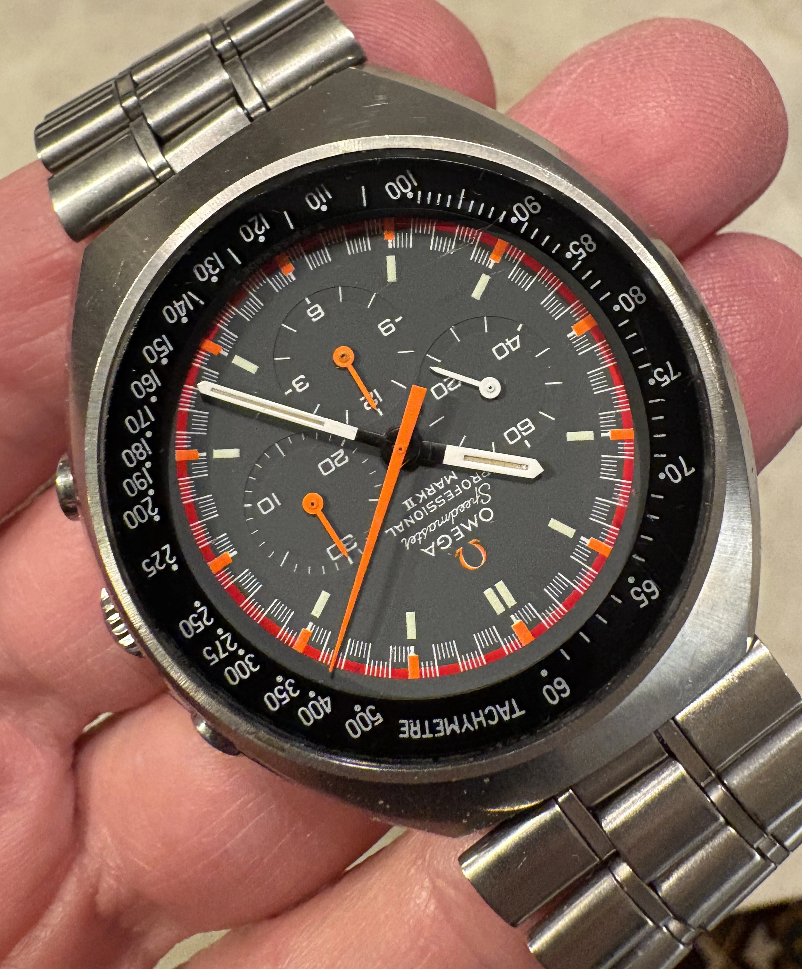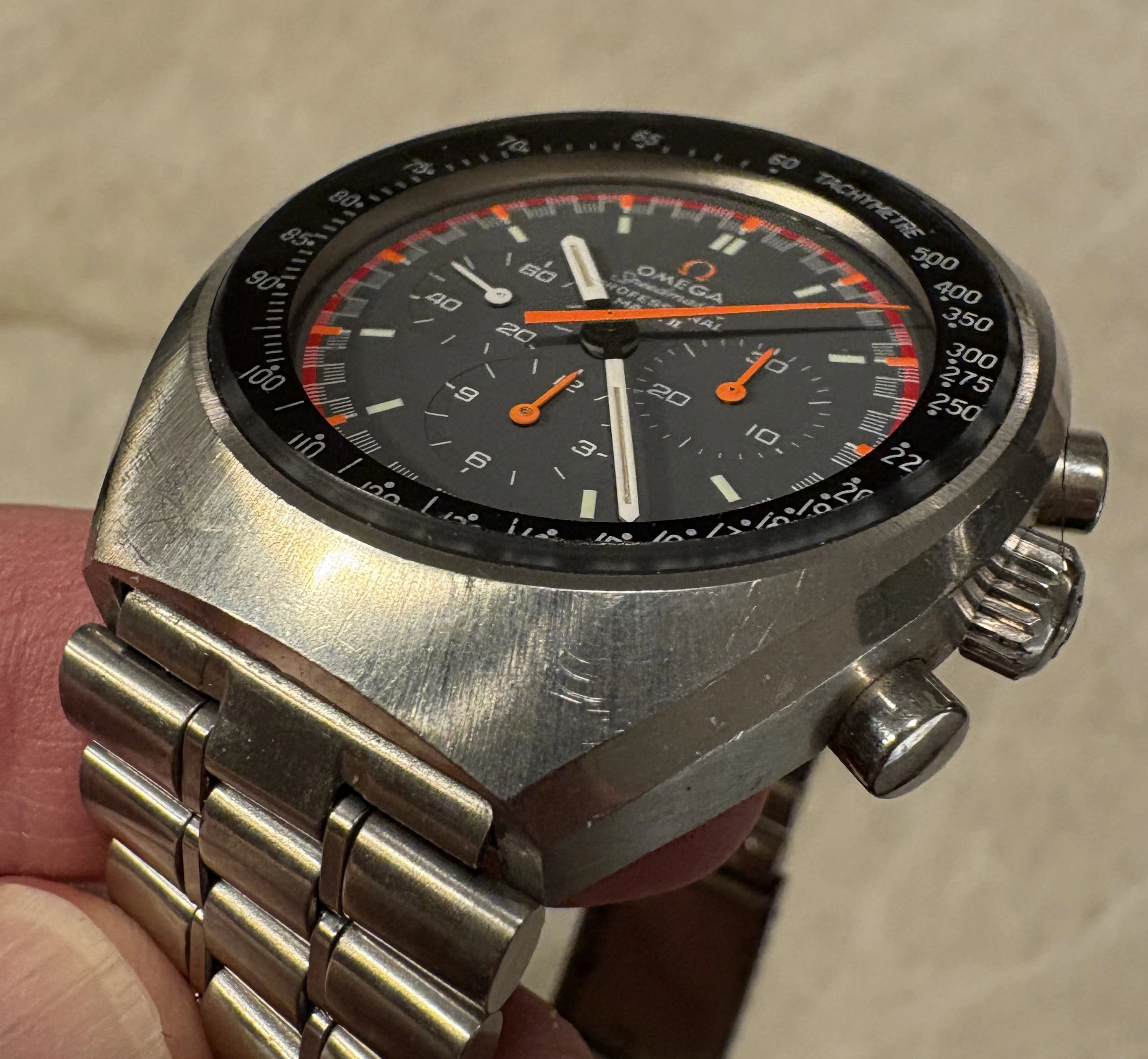 Nice honest Mk II Speedmaster 145.014 with racing dial. Notably, the dial and handset retain their vivid colors. The case shows some wear, but exhibits original finishes and sharp edges. Comes with original 21-link 1159 bracelet. This is a catch and release from a lot that I purchased locally from someone who had inherited a collection from a friend, and the condition of all the watches were similar - the owner clearly wore his watches, but maintained them and did not tamper with or polish them.