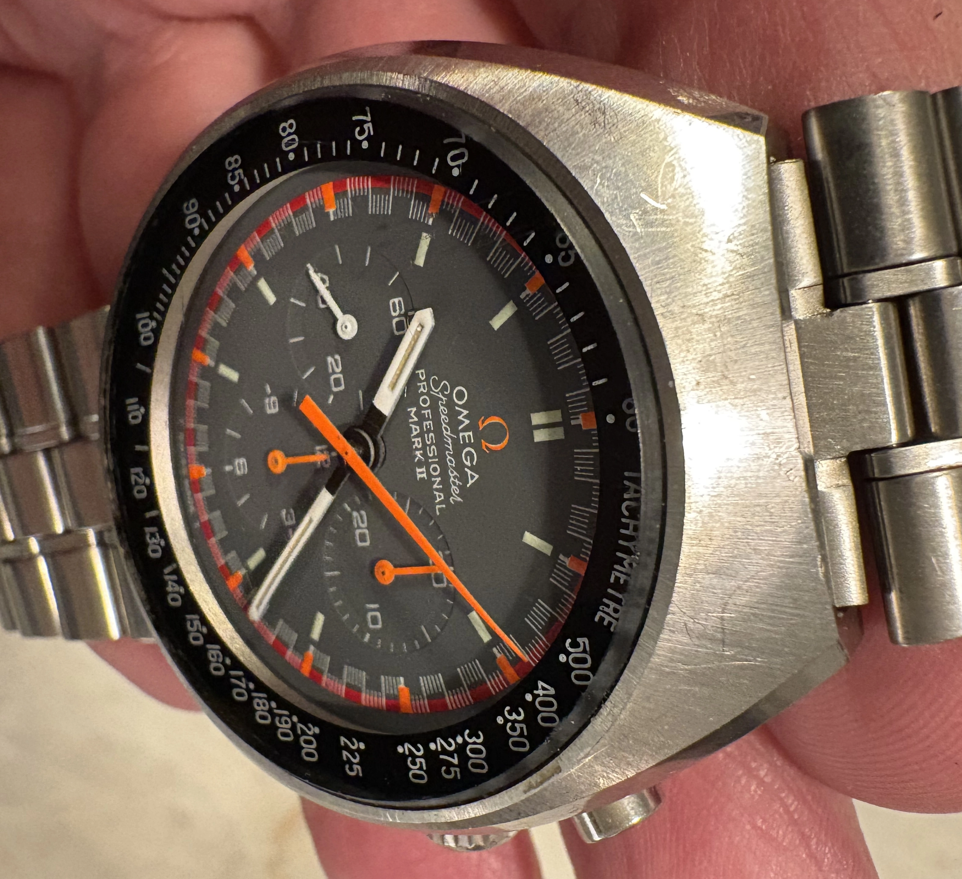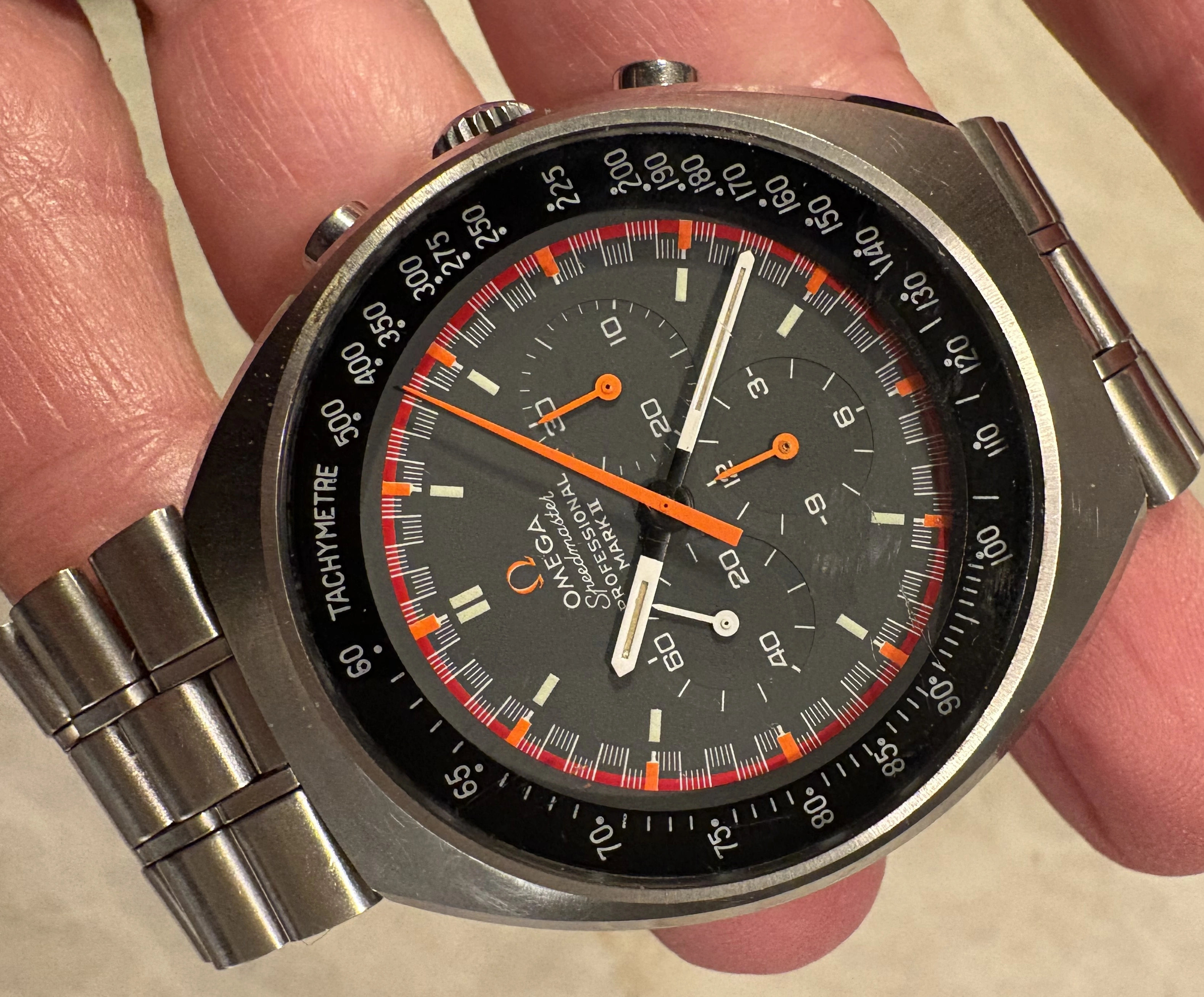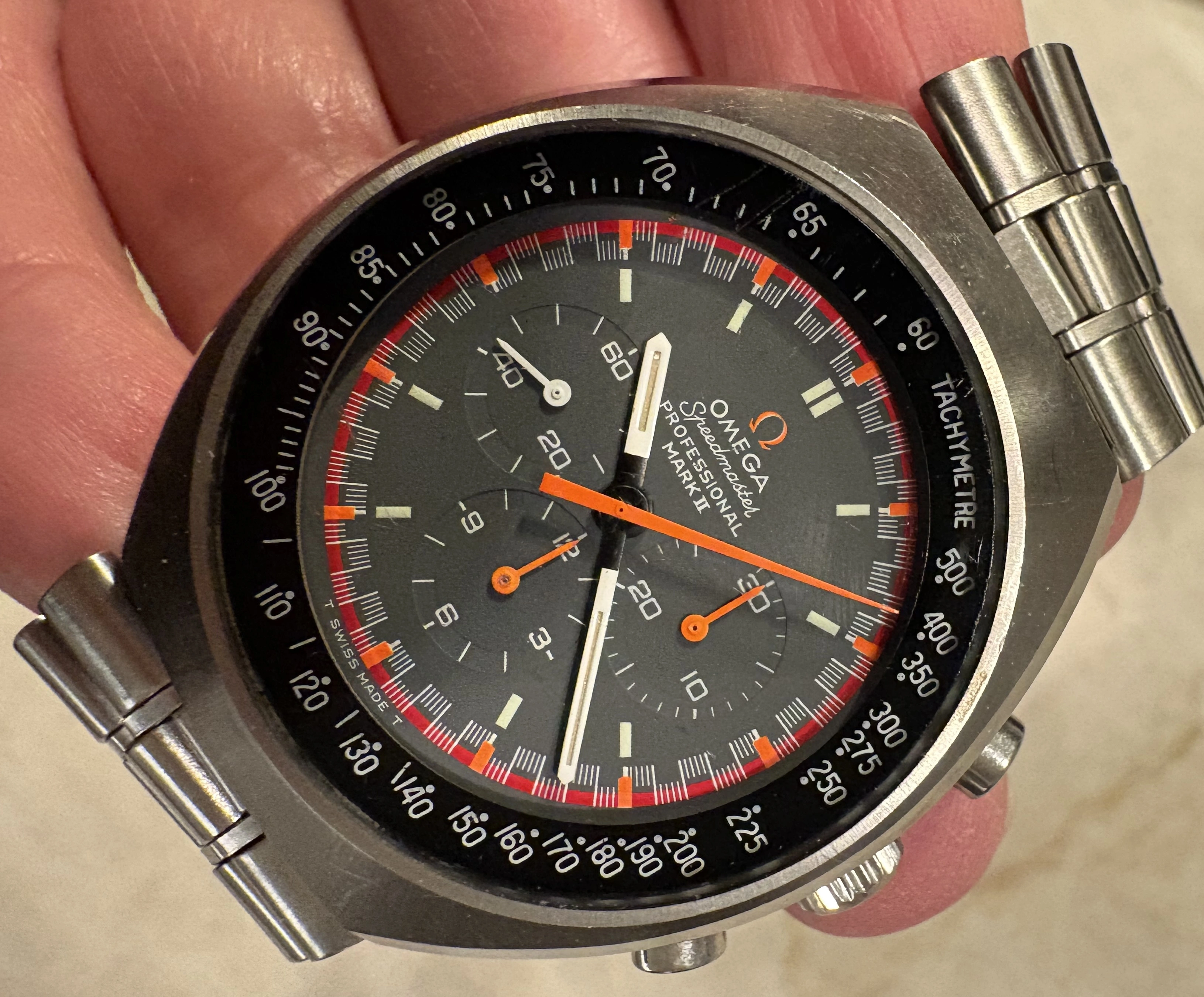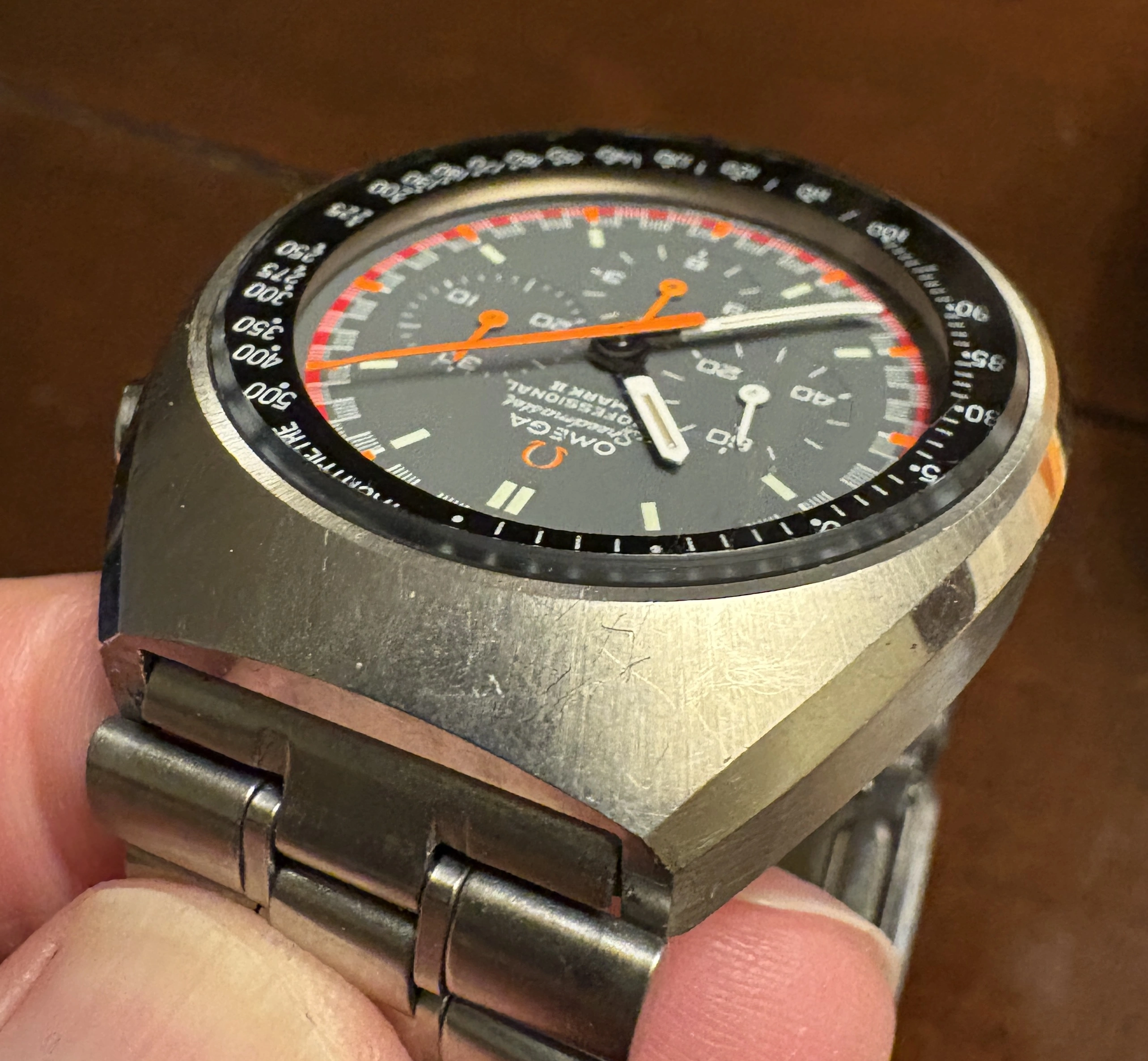 Nice honest Mk II Speedmaster 145.014 with racing dial. Notably, the dial and handset retain their vivid colors. The case shows some wear, but exhibits original finishes and sharp edges. Comes with original 21-link 1159 bracelet. This is a catch and release from a lot that I purchased locally from someone who had inherited a collection from a friend, and the condition of all the watches were similar - the owner clearly wore his watches, but maintained them and did not tamper with or polish them.