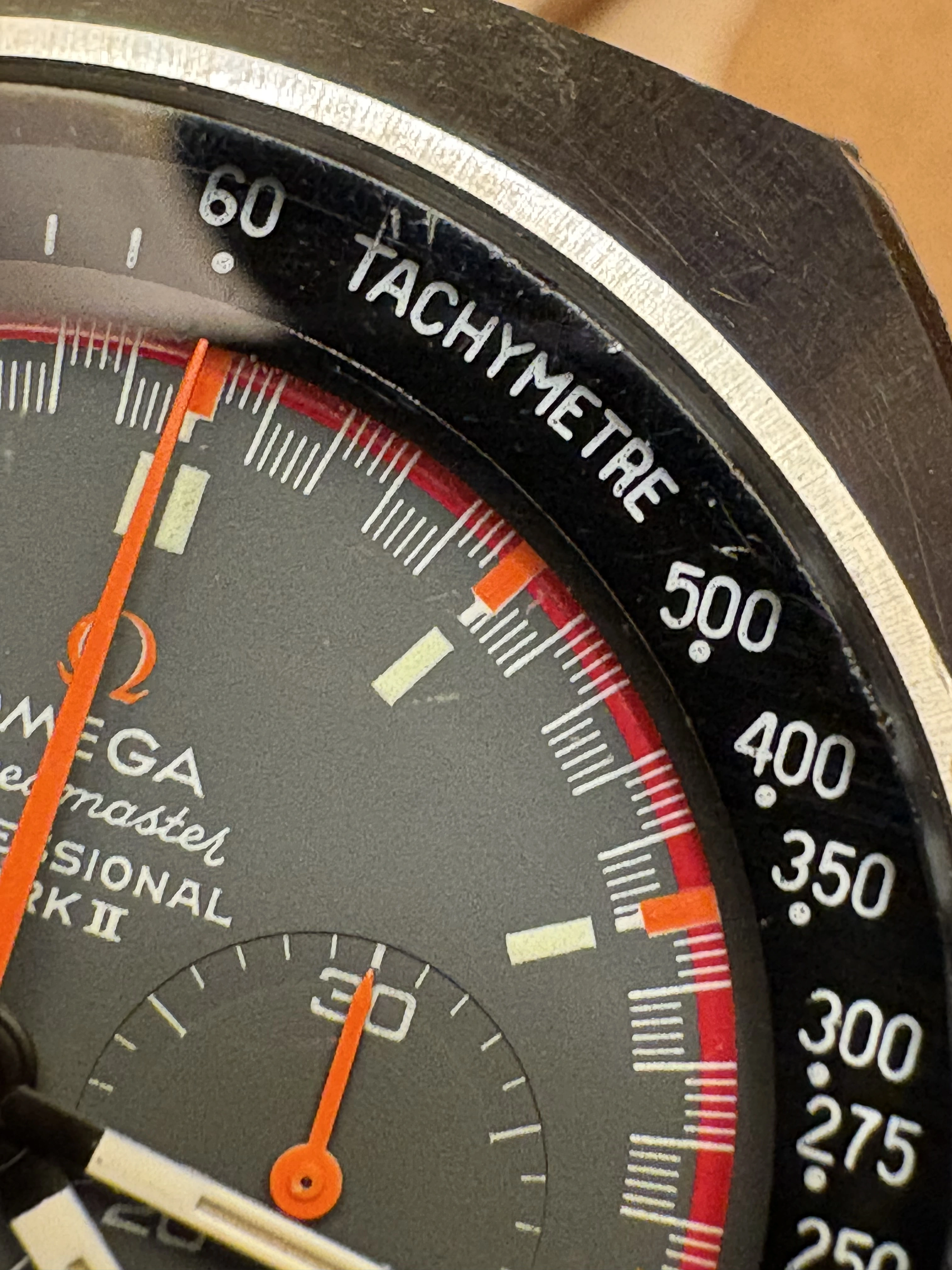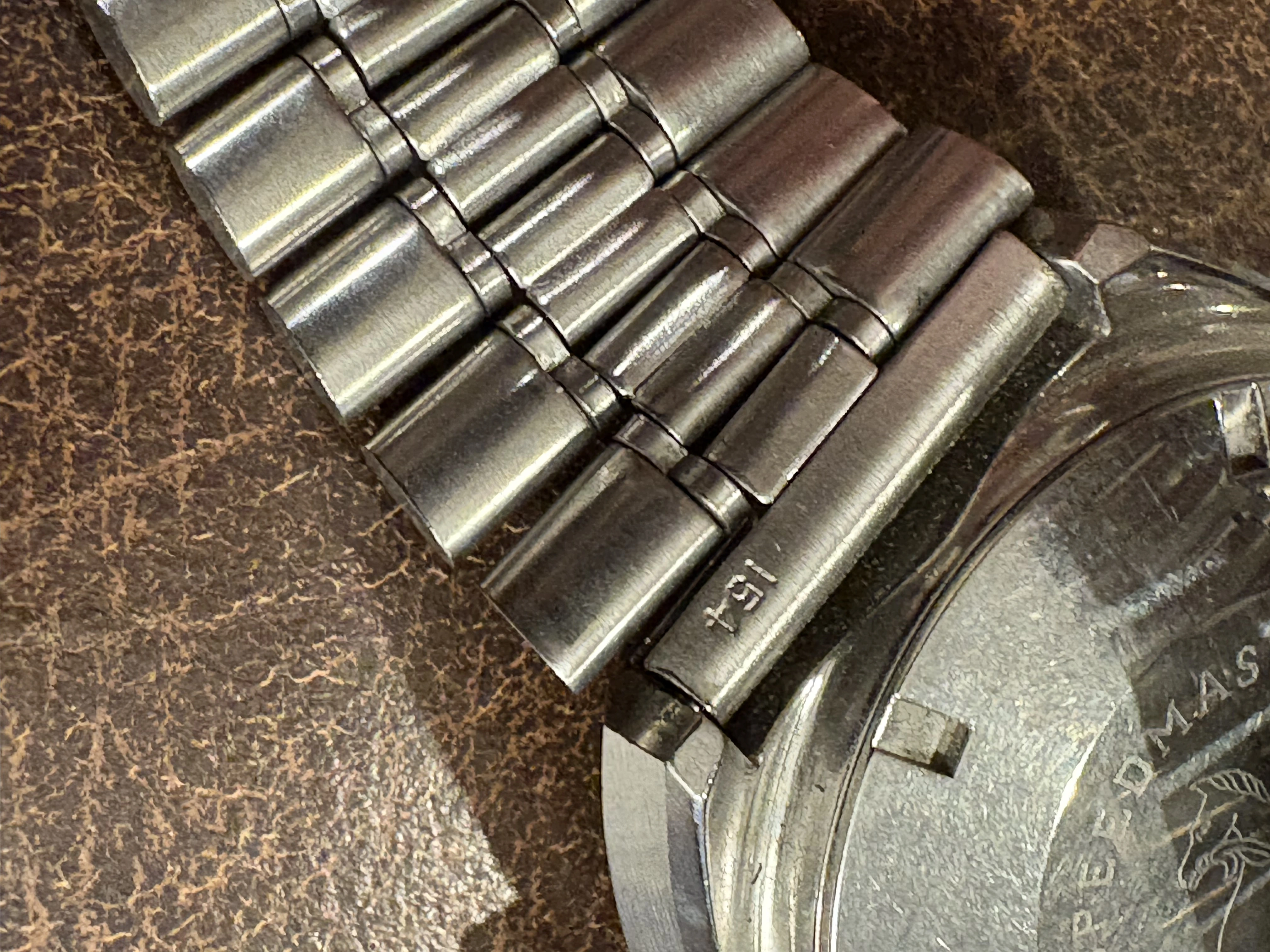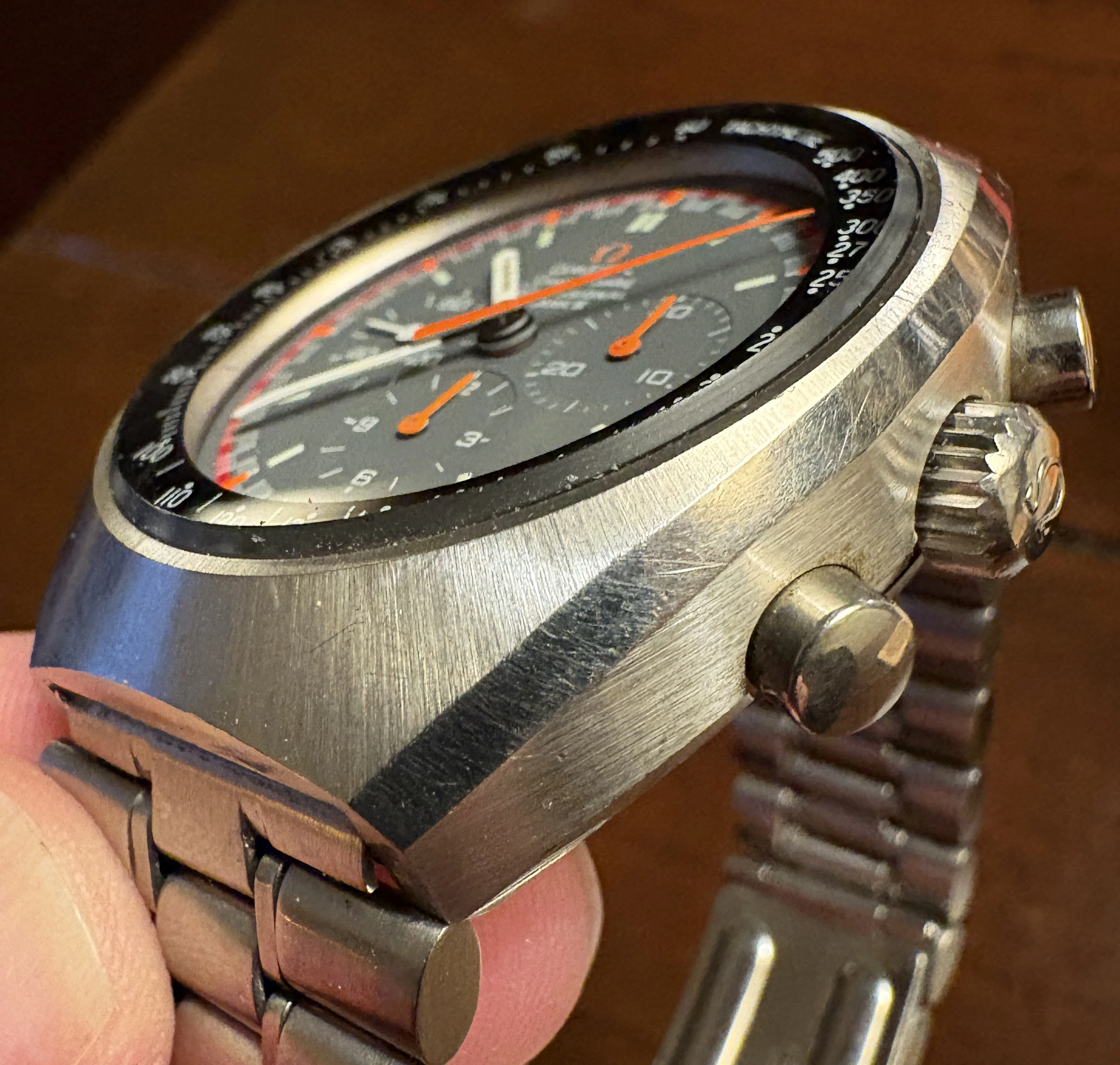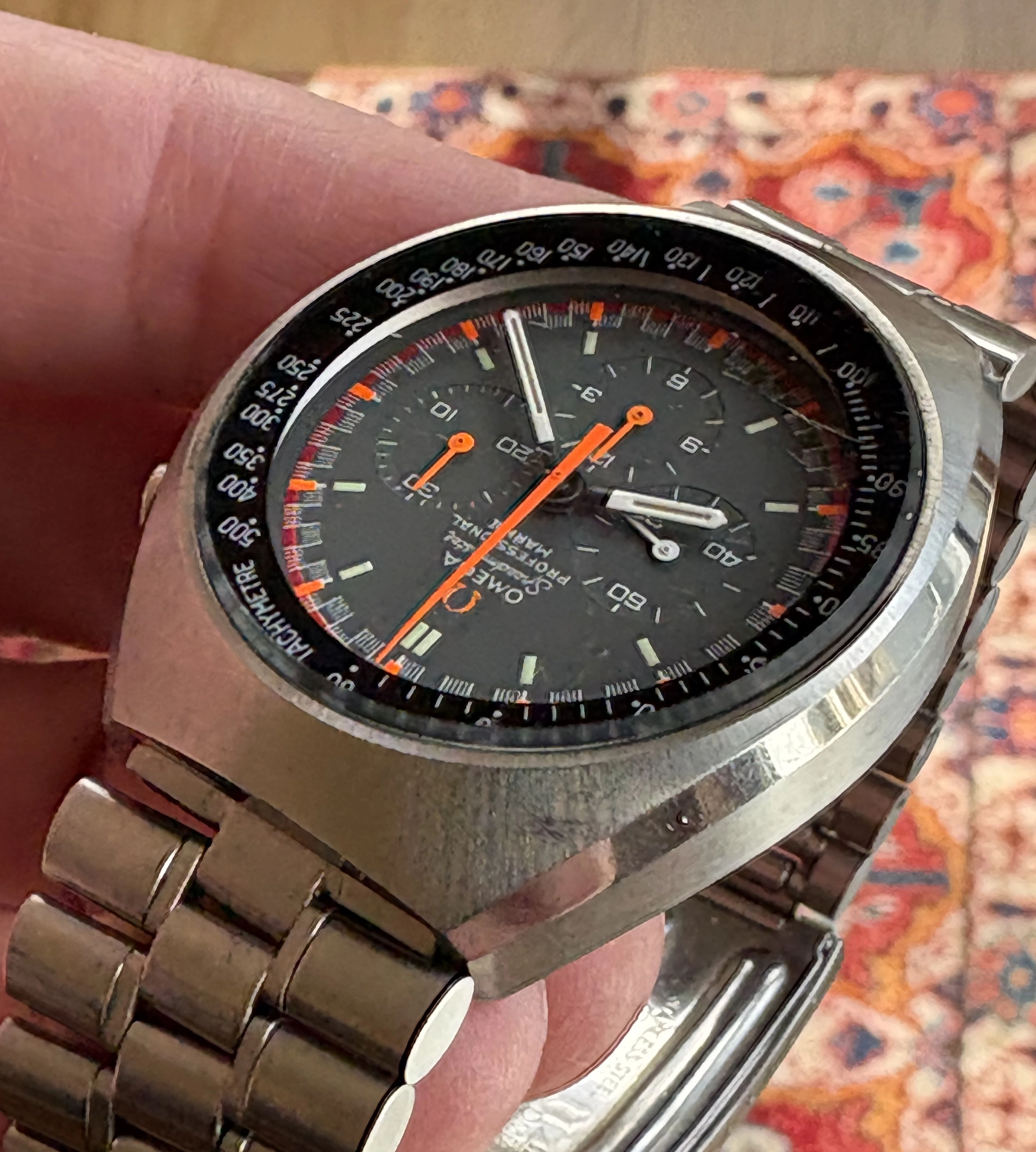 Nice honest Mk II Speedmaster 145.014 with racing dial. Notably, the dial and handset retain their vivid colors. The case shows some wear, but exhibits original finishes and sharp edges. Comes with original 21-link 1159 bracelet. This is a catch and release from a lot that I purchased locally from someone who had inherited a collection from a friend, and the condition of all the watches were similar - the owner clearly wore his watches, but maintained them and did not tamper with or polish them.