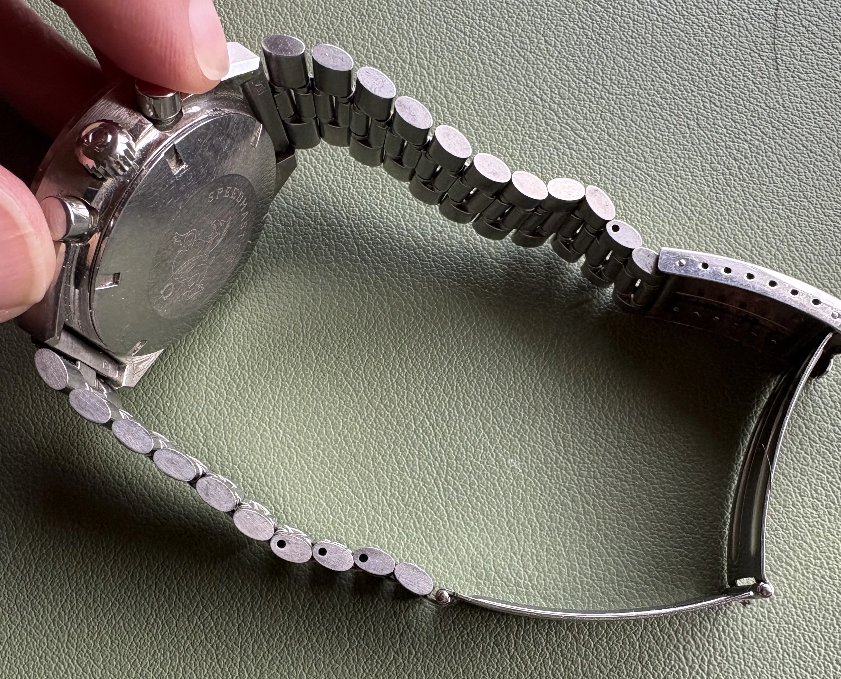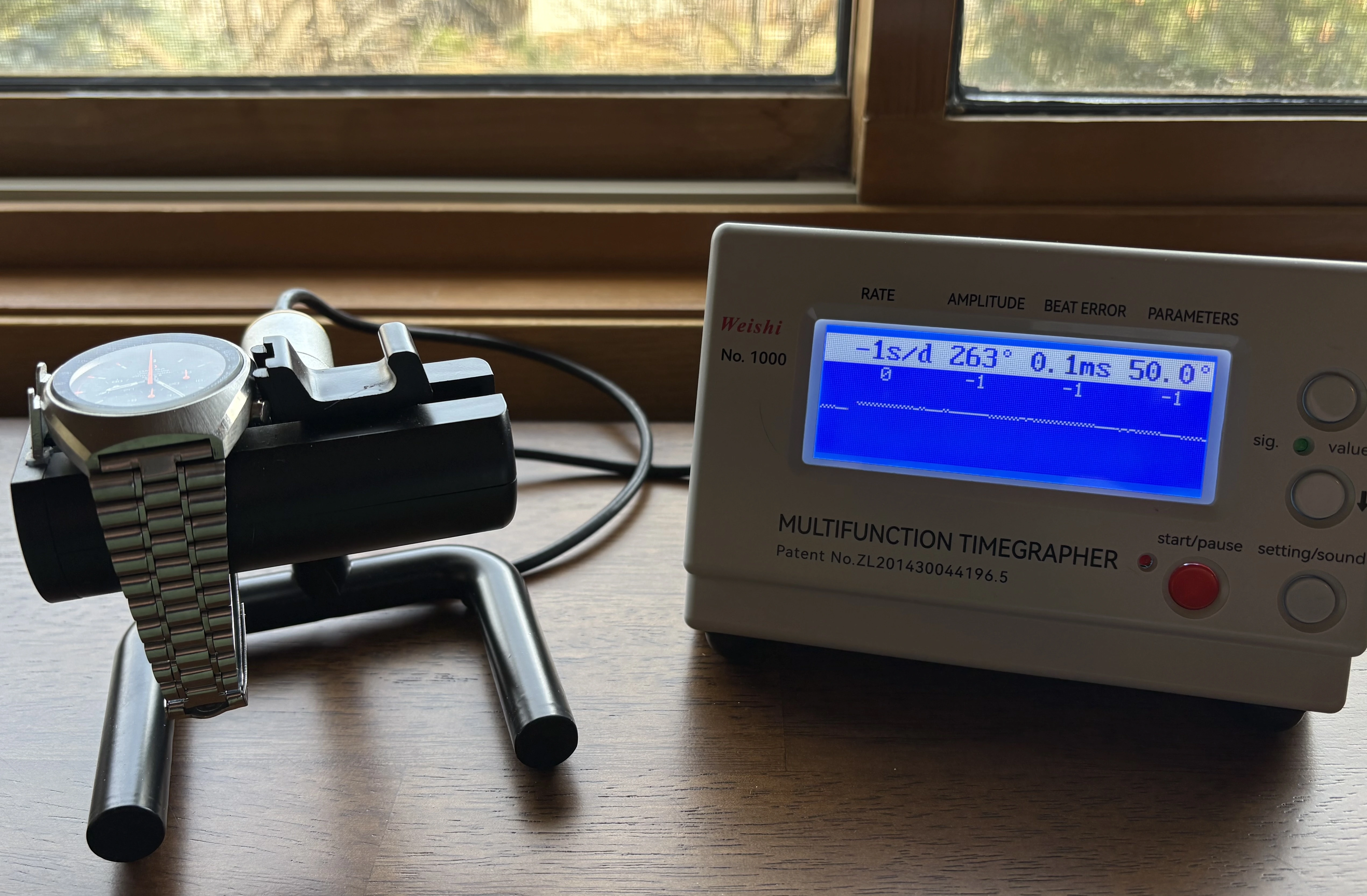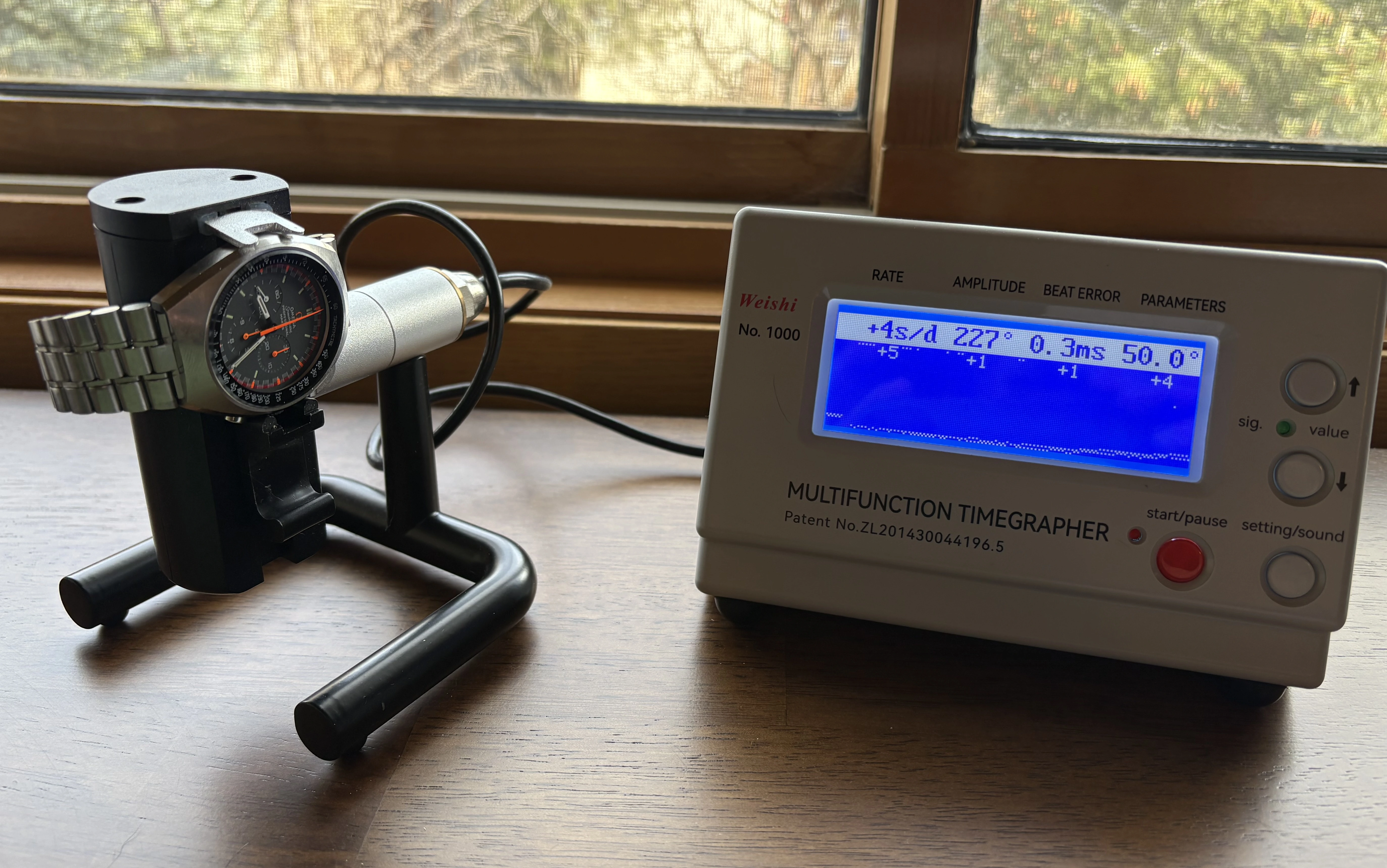 The watch has not been serviced in my possession, but is winding, setting, and running properly, including chronograph functions. As shown in the timegrapher photos, it is keeping good time but the amplitude is low, so a service is recommended for regular use.