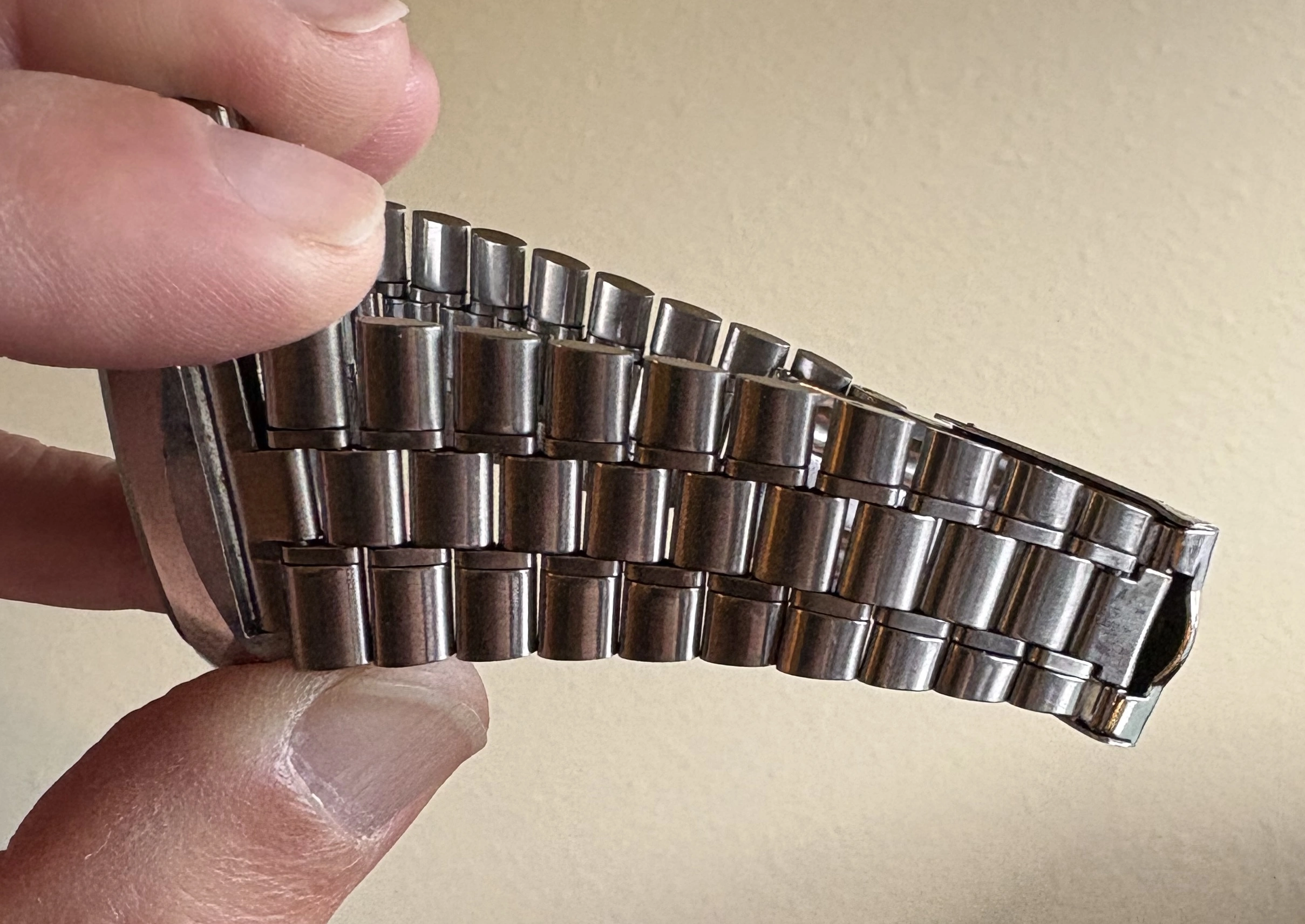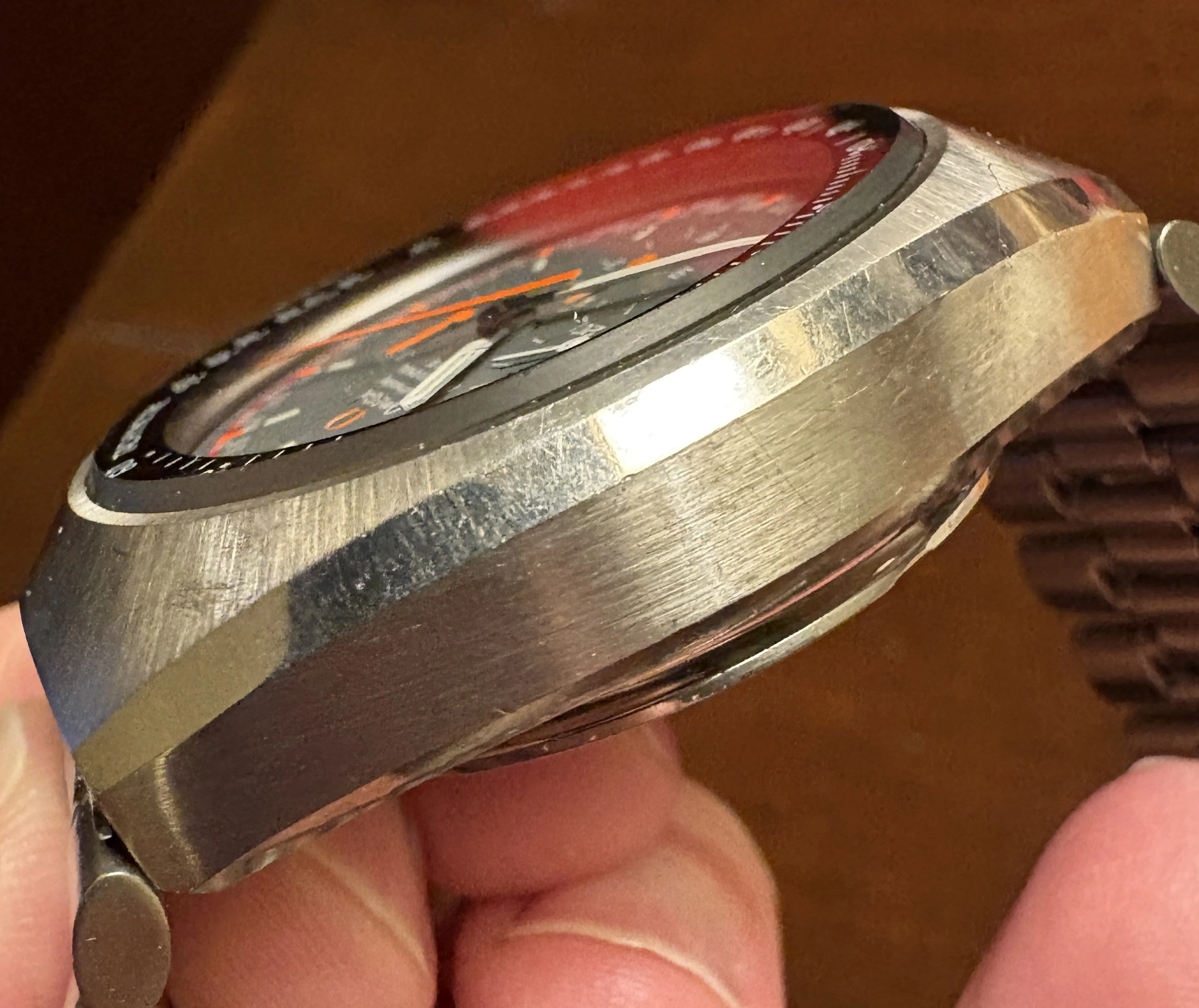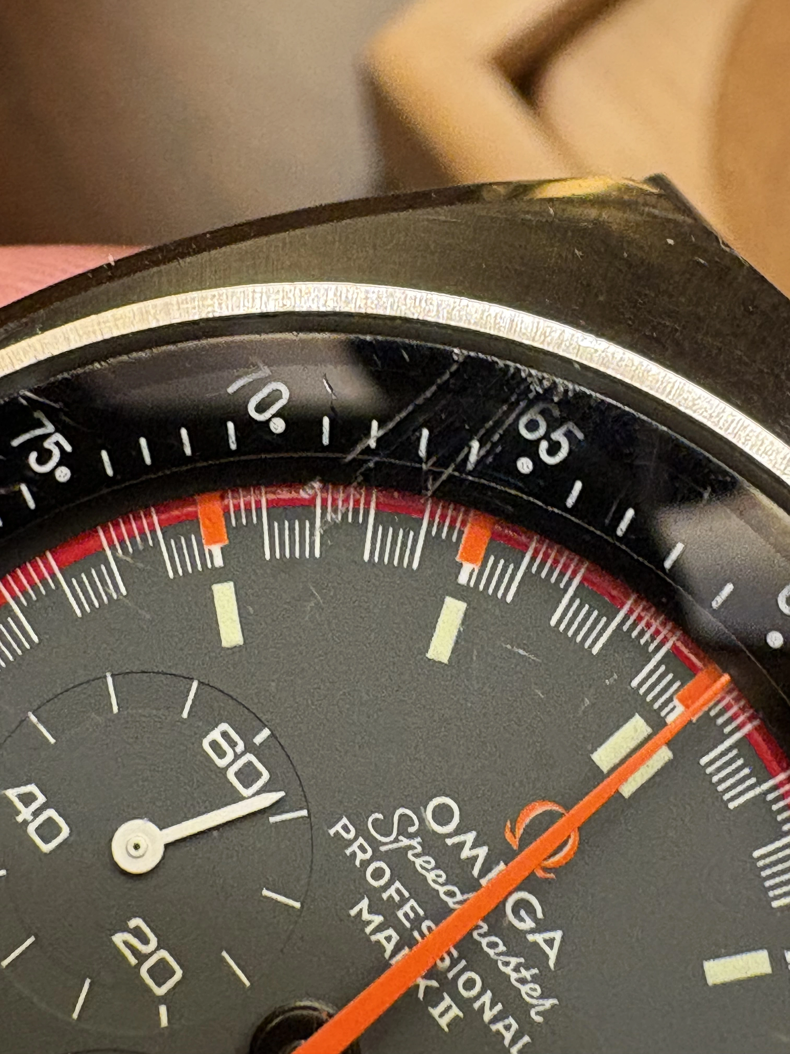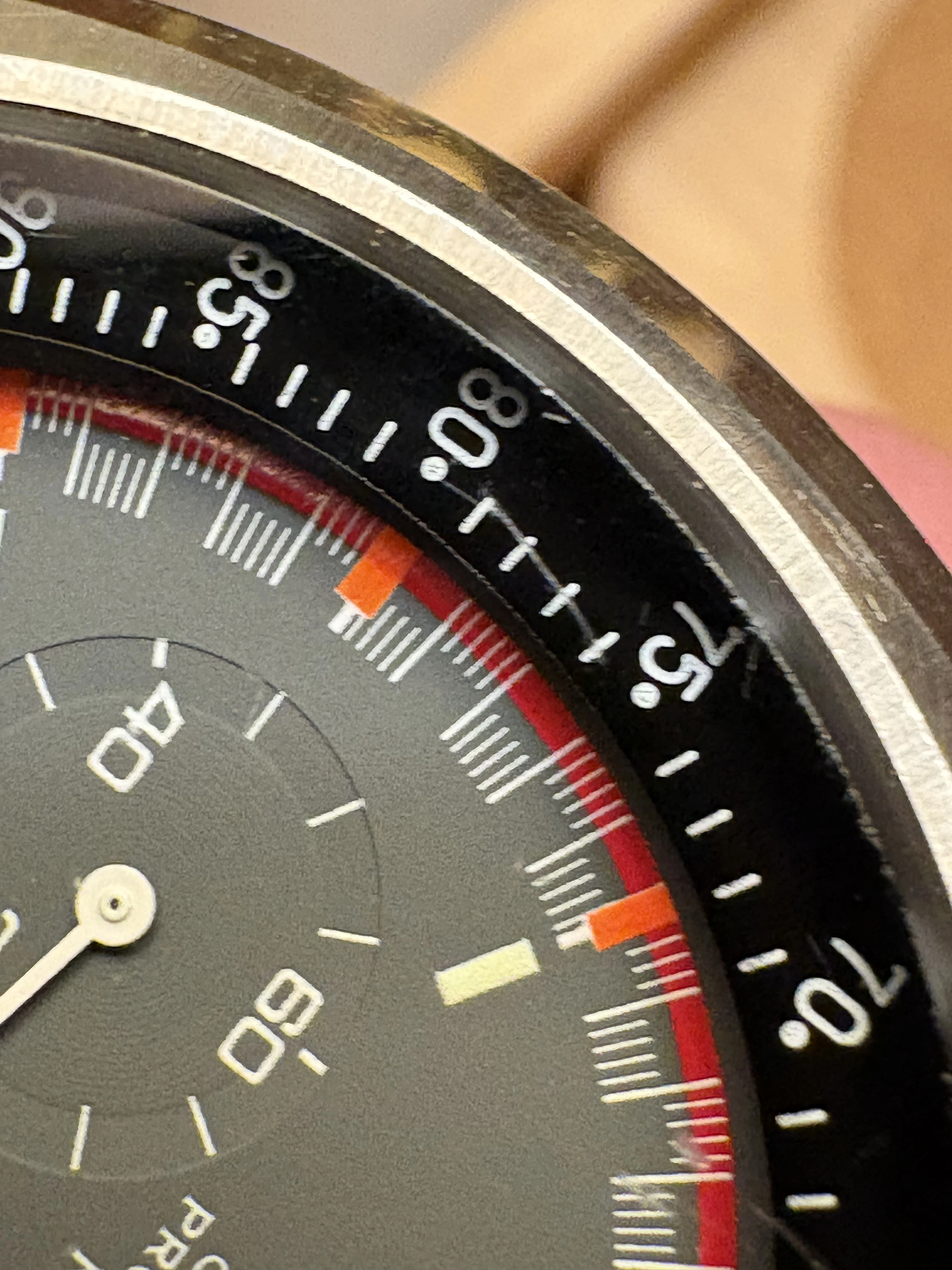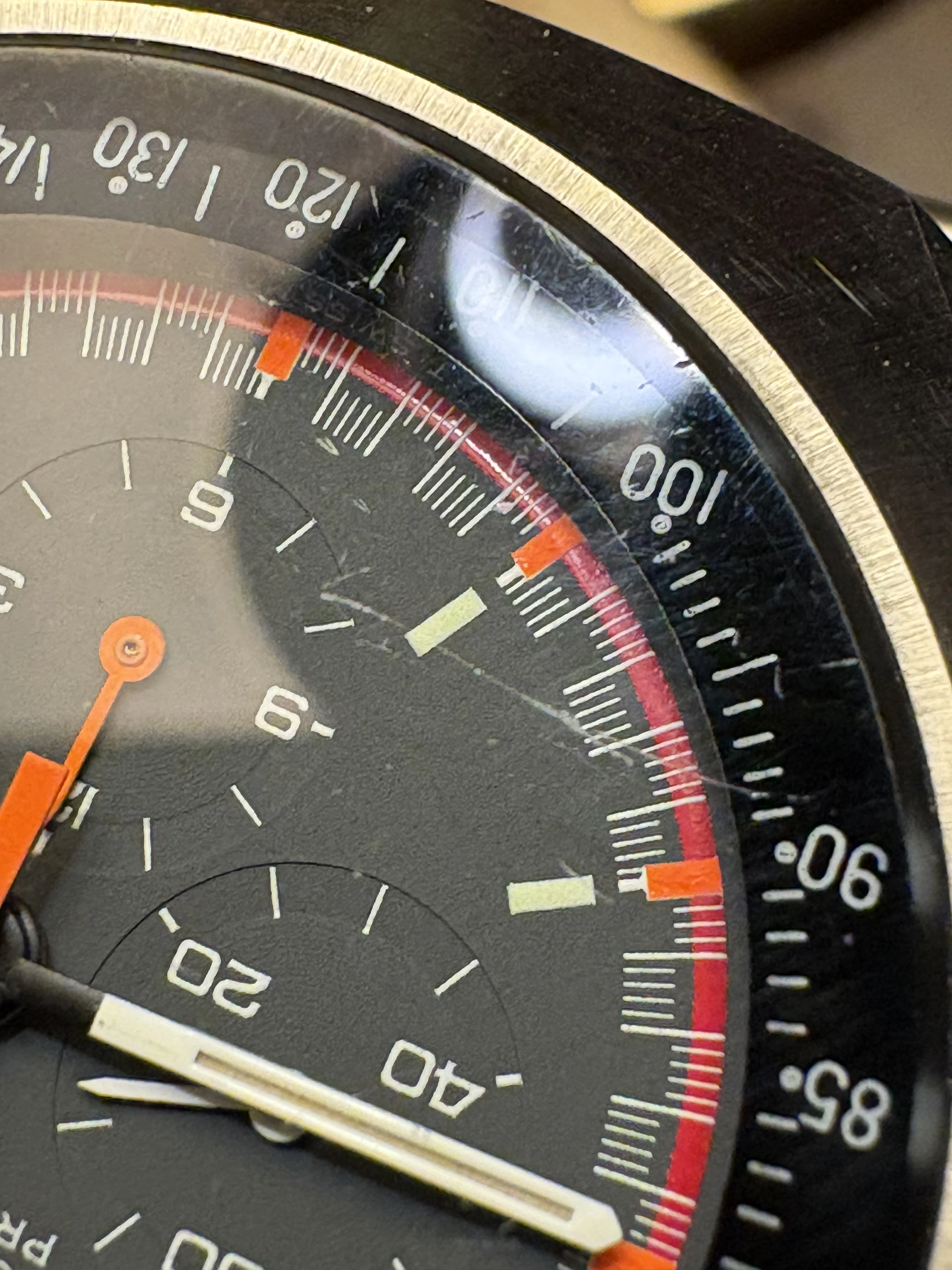 [Edit: a member messaged me to point out a chip at the edge of the crystal. After looking closely under magnification with light reflected at an angle, I confirmed that there are indeed some small chips and scratches at various places around the edge of the crystal and I was also able to see a longer scratch at 5 o'clock. They are hard to see under normal lighting and I don't find them distracting, but they are definitely there, so I've added some photos at the end, showing them clearly.]