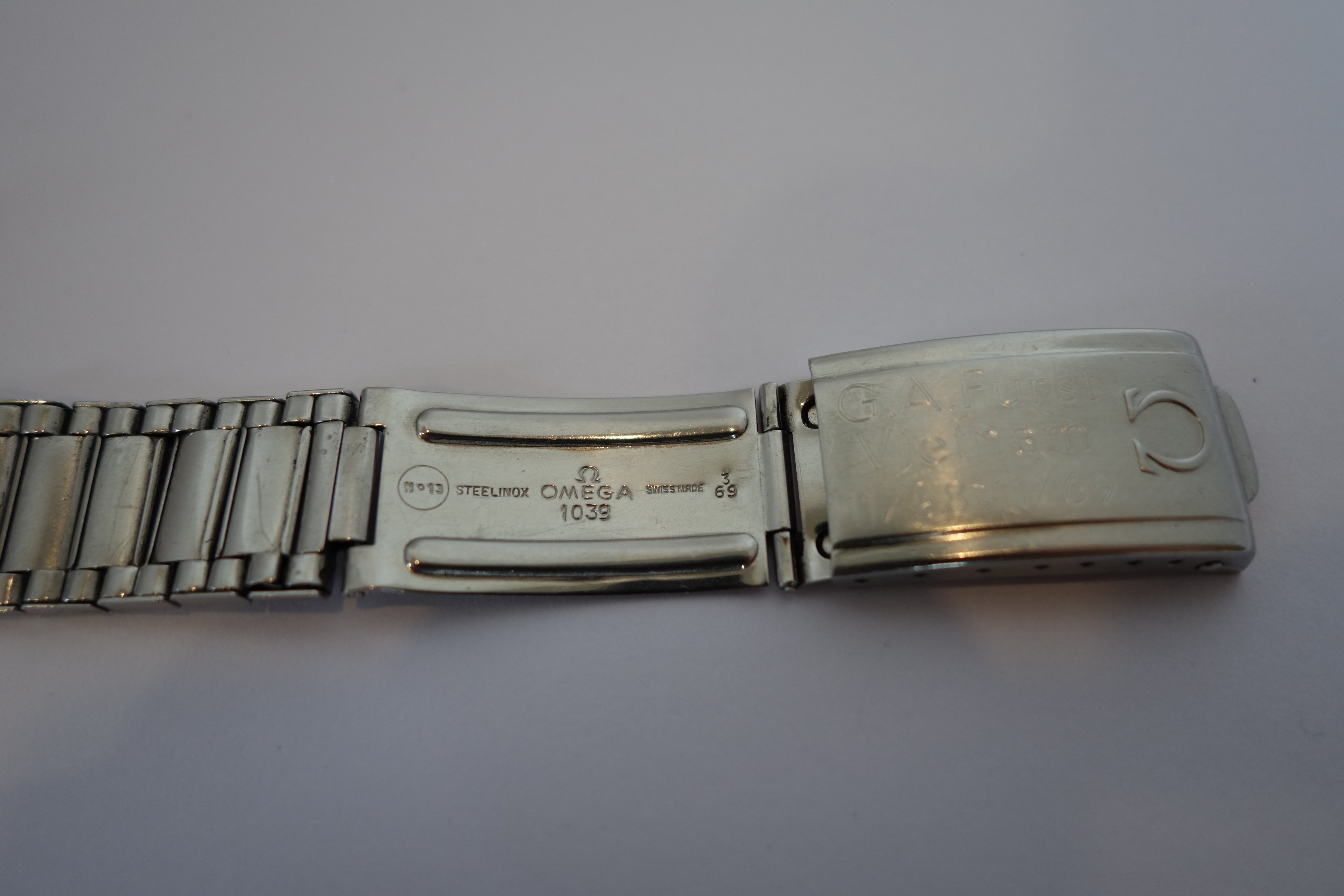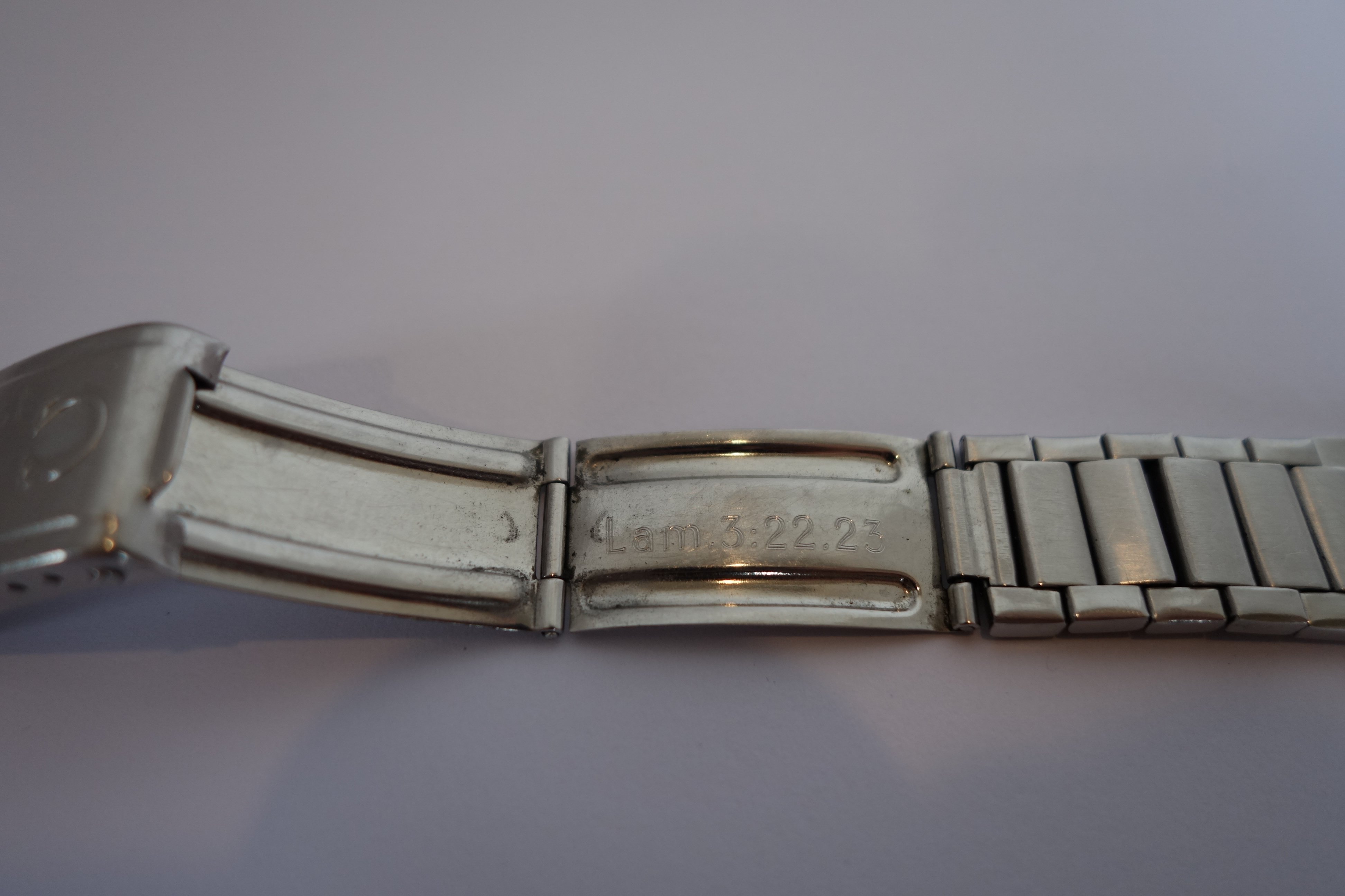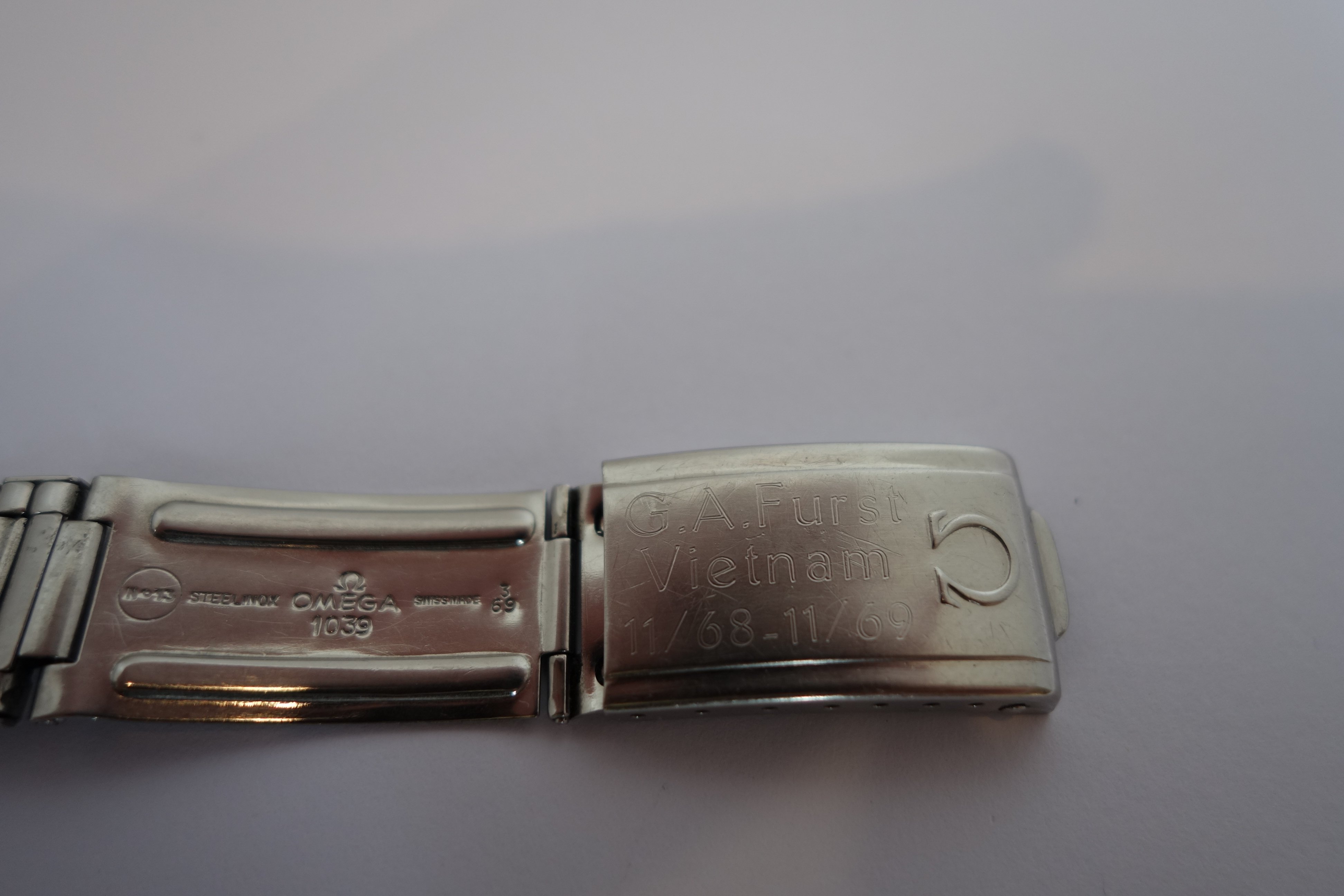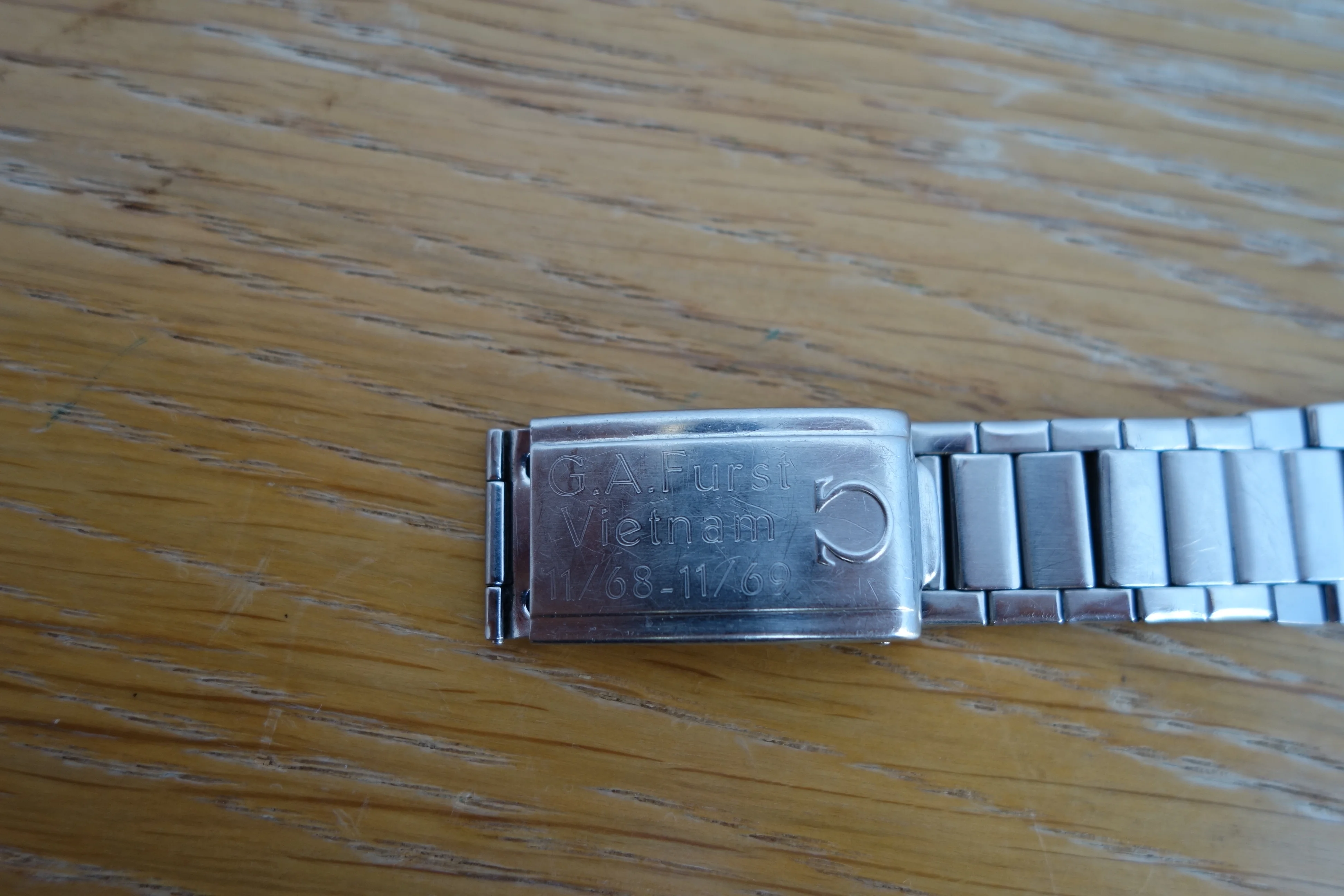 BRACELET: Omega 1039 with 516 endlinks is in very good condition. Clasp interior is stamped 3rd quarter of 1969. On the exterior is engraved "G.A. Furst Vietnam 11/68 - 11/69" and "Lam. 3:22:23" (Lamentations biblical verse) on the inside of one of the blades.