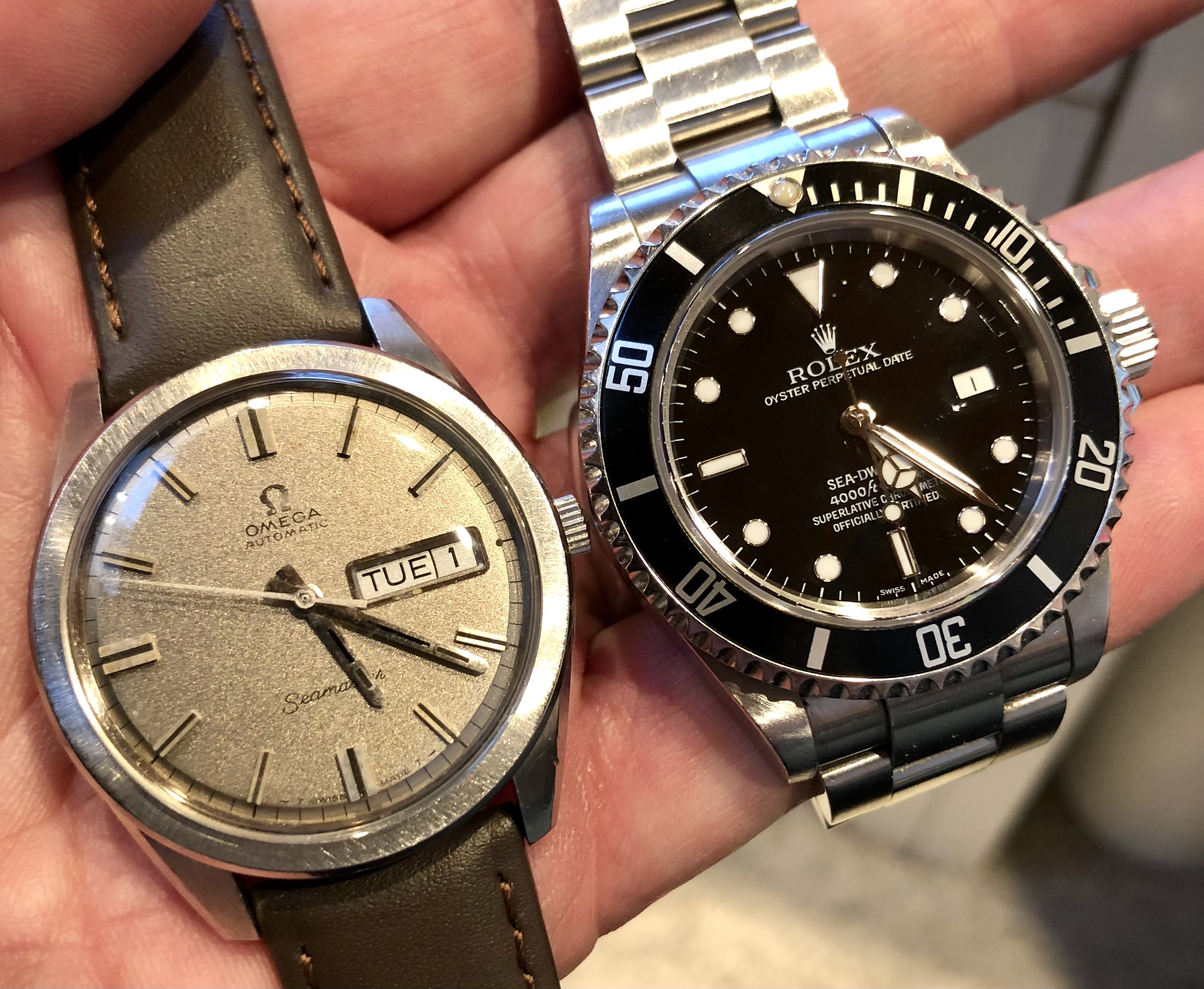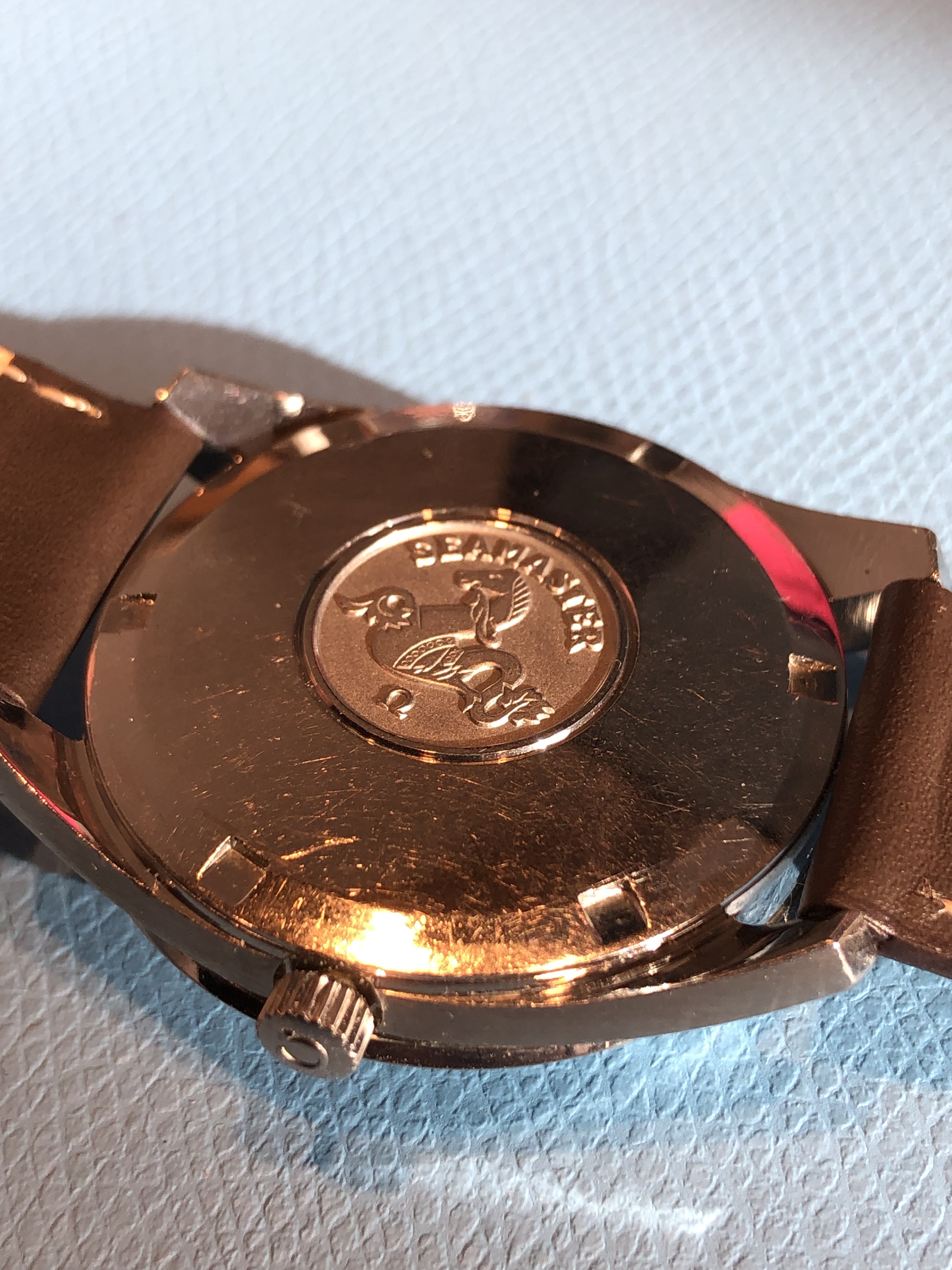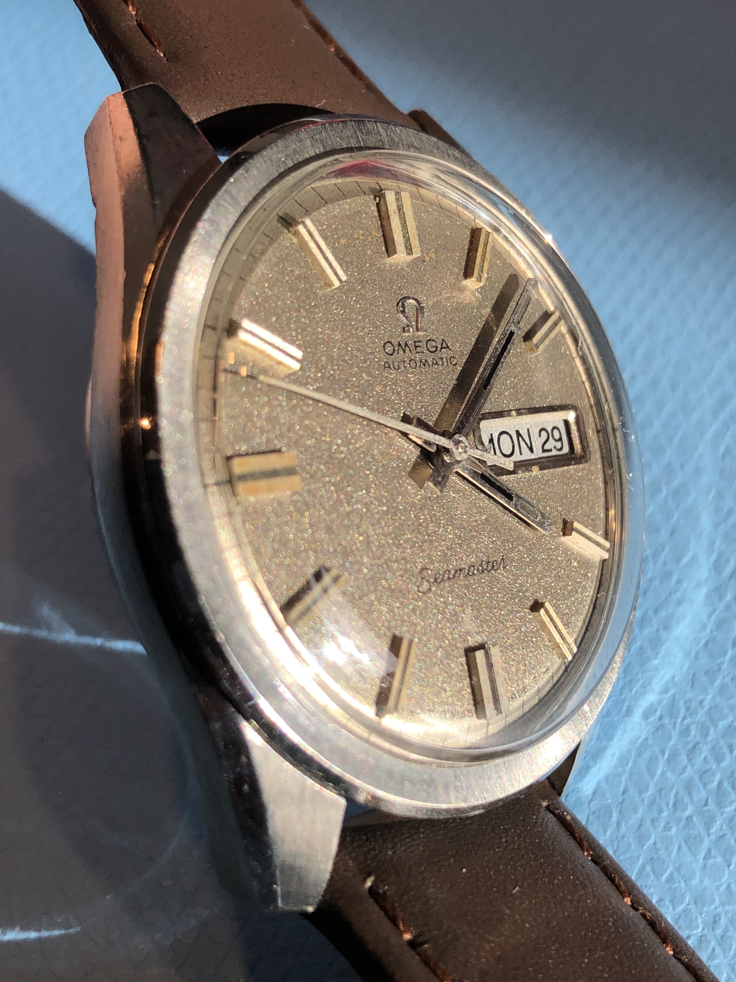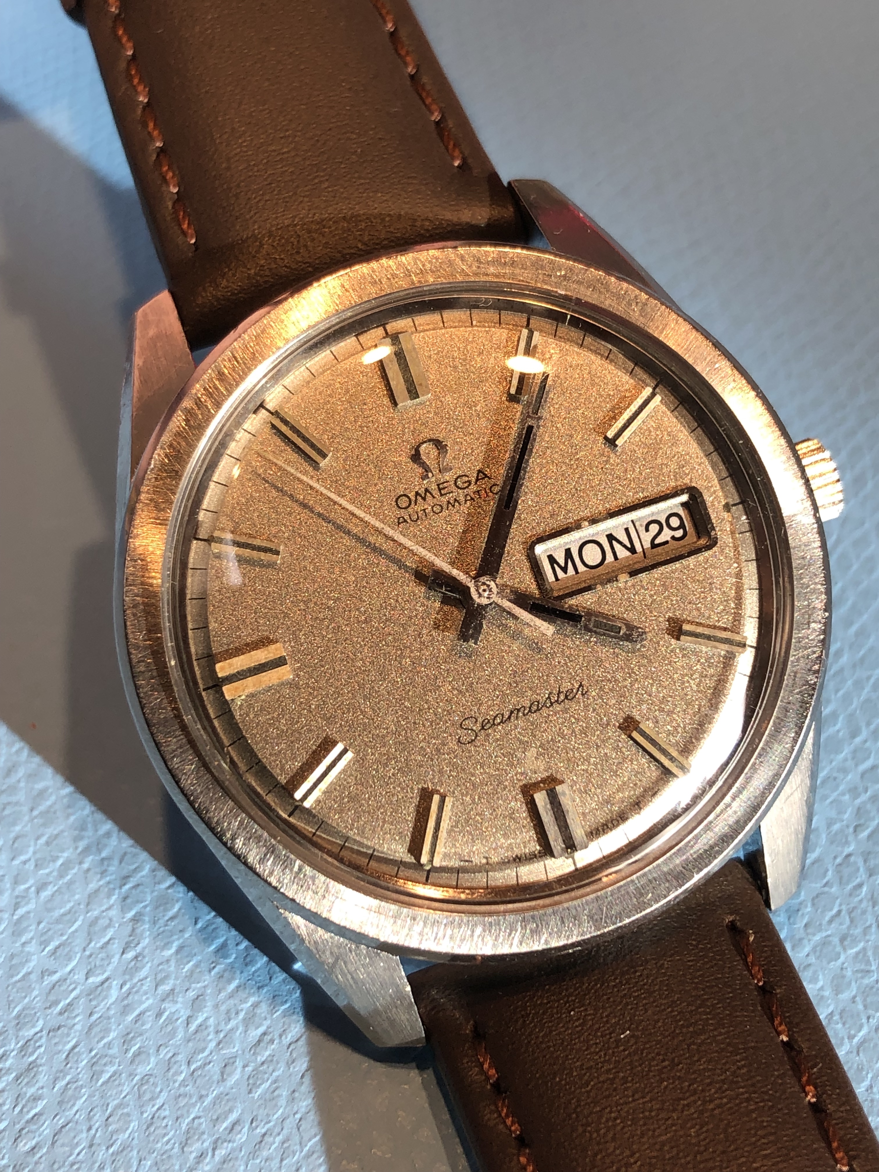 ·Up next and recently acquired for the collection is this 1970 Omega Seamaster 166 032 sparkle dial. I was drawn to this example because of the bronze / tobacco finish in the sparkle, but also the case seemed honest with radial brush and crisp edges along the sides and lugs. I initially paused because I wasn't sure about the black inlays in the hands to match the onyx indices, some earlier examples I had been viewing showed lume present in the end section of the hands, but then I came across a few later examples that had the black painted ends - hopefully correct. Thoughts on those hands and any other comments welcome.