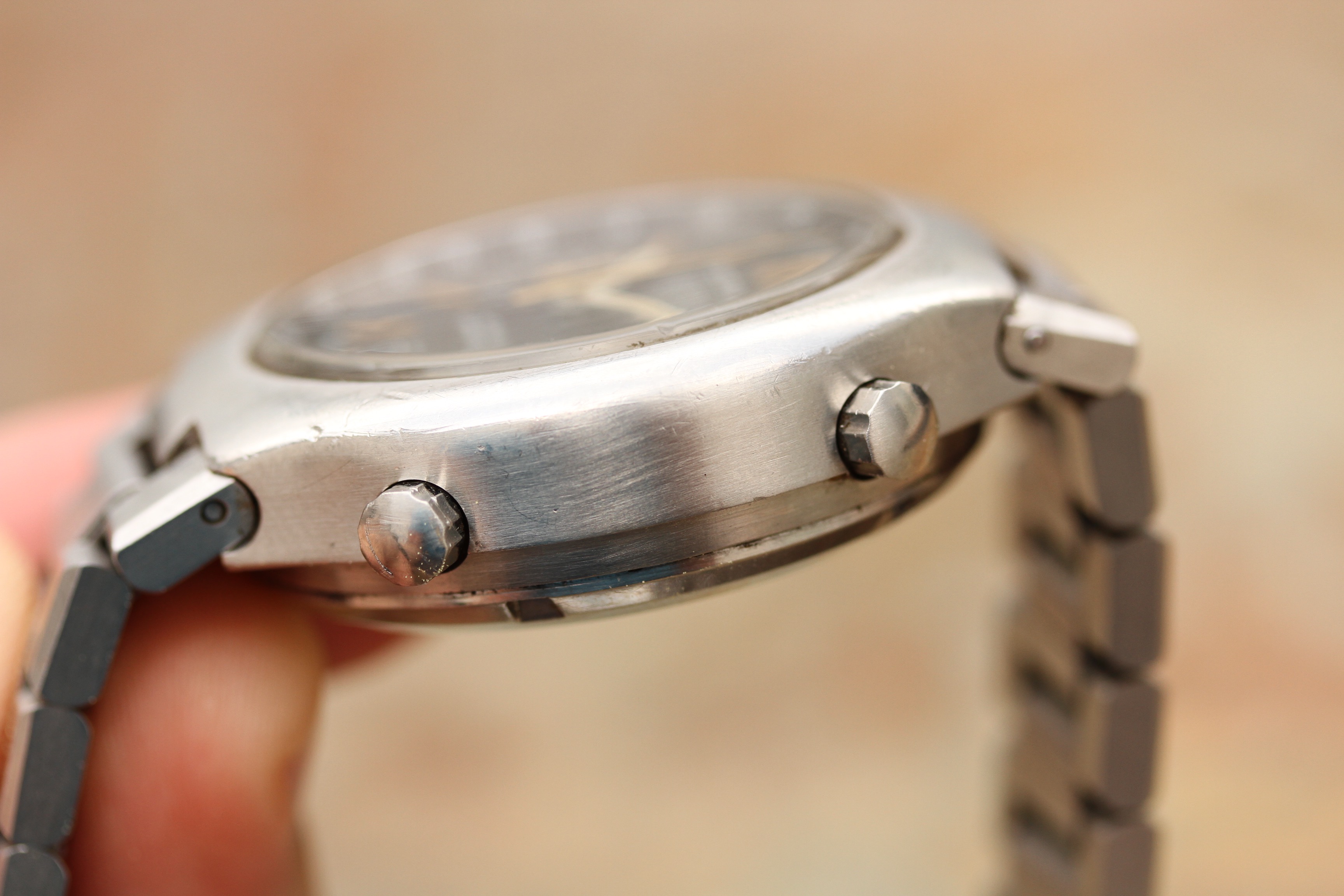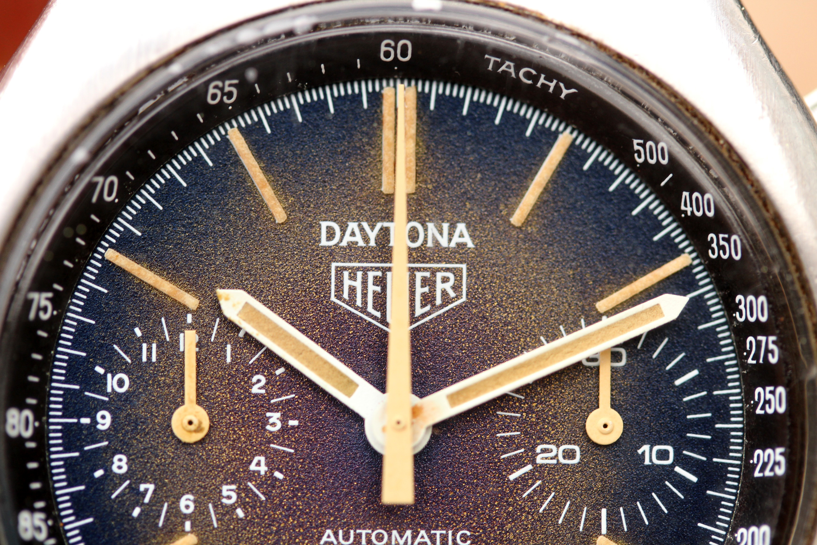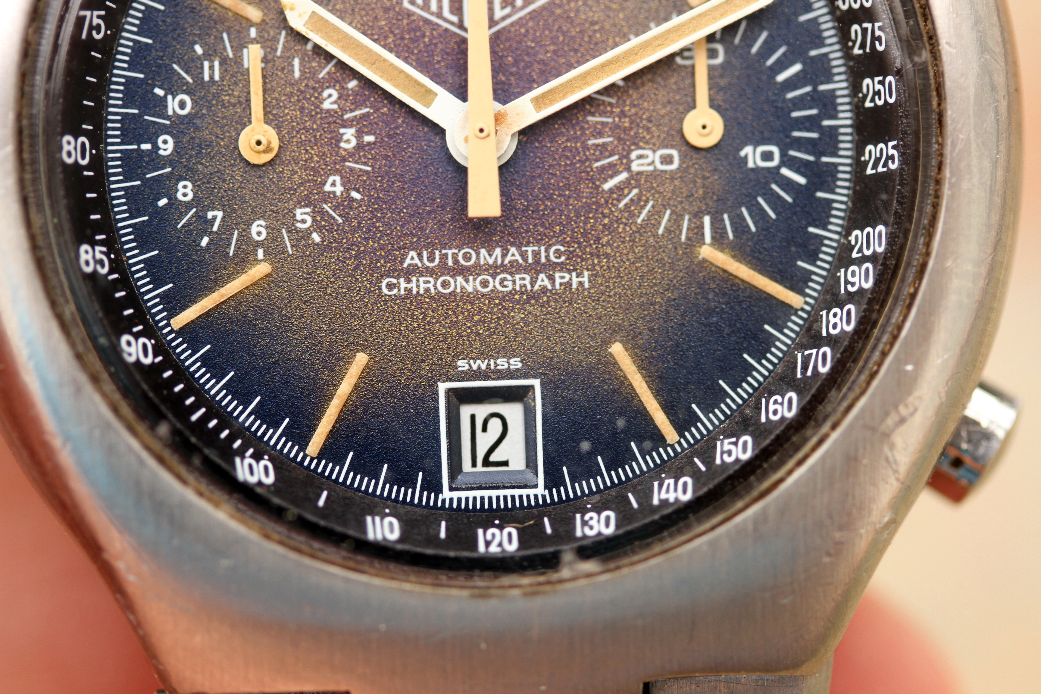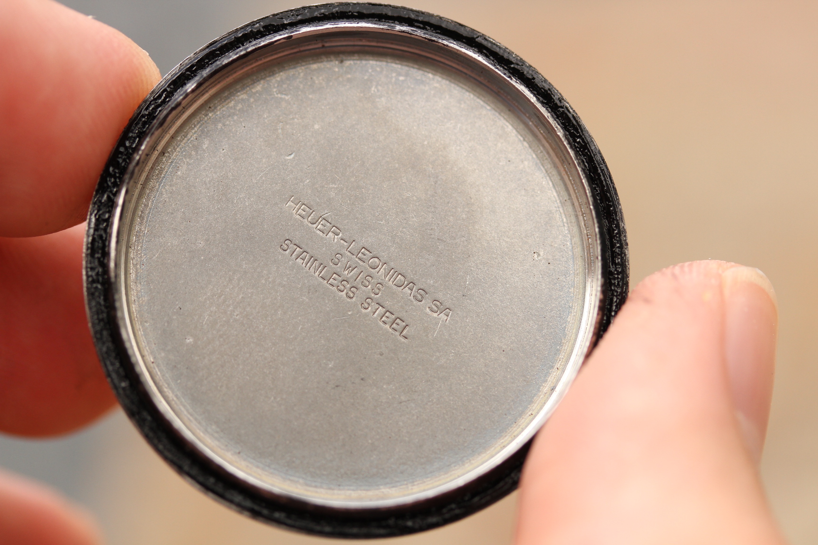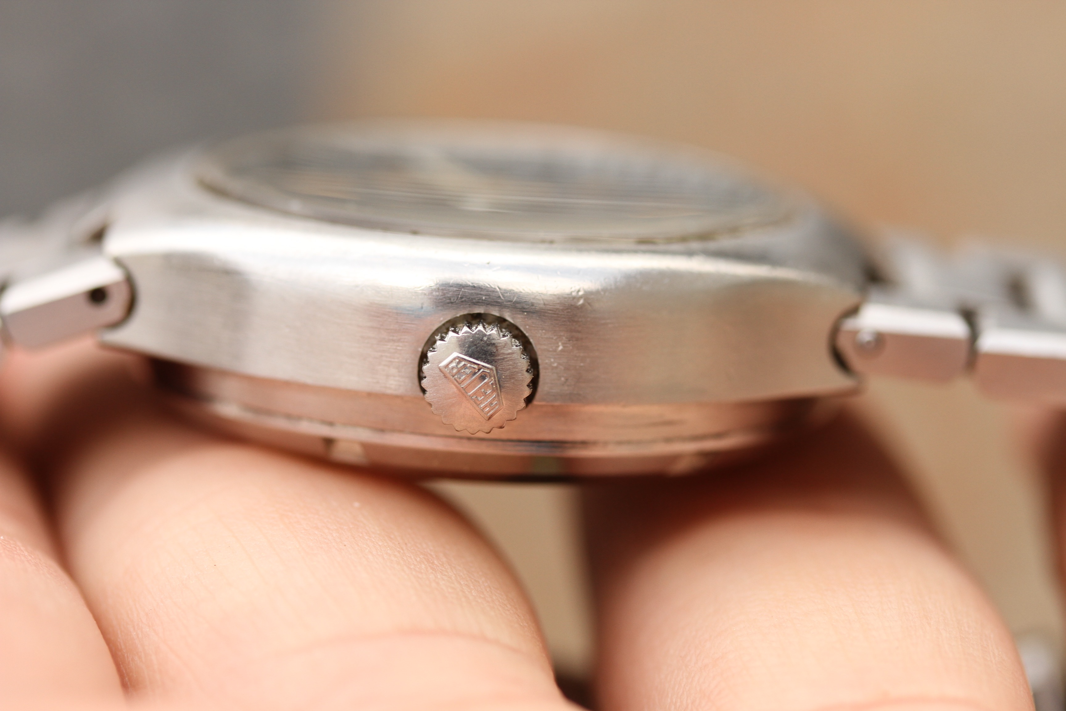 Excellent vintage condition case without any major dings or dents. Winding crown is signed Heuer and appears original, pushers are correct and original, beveled.