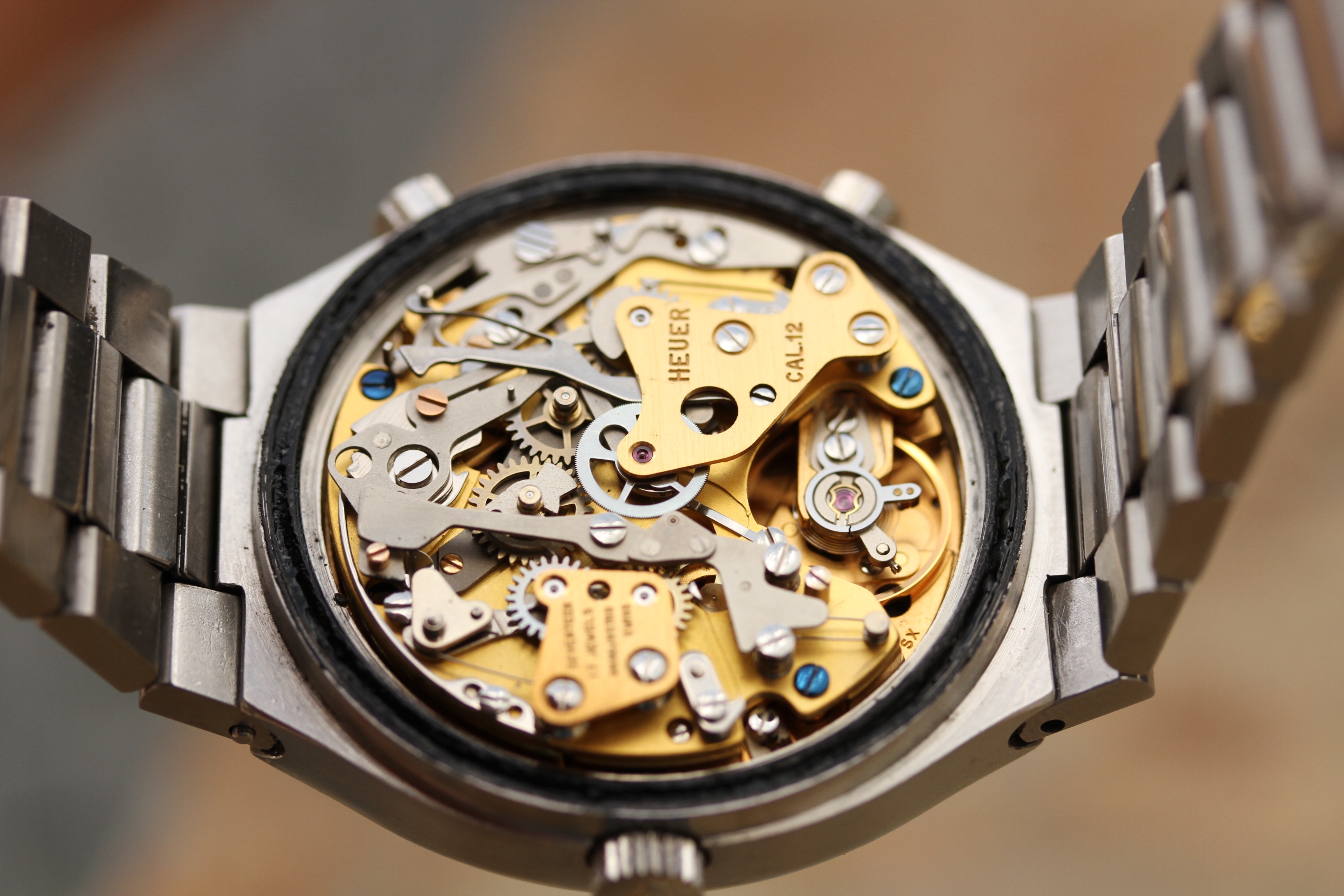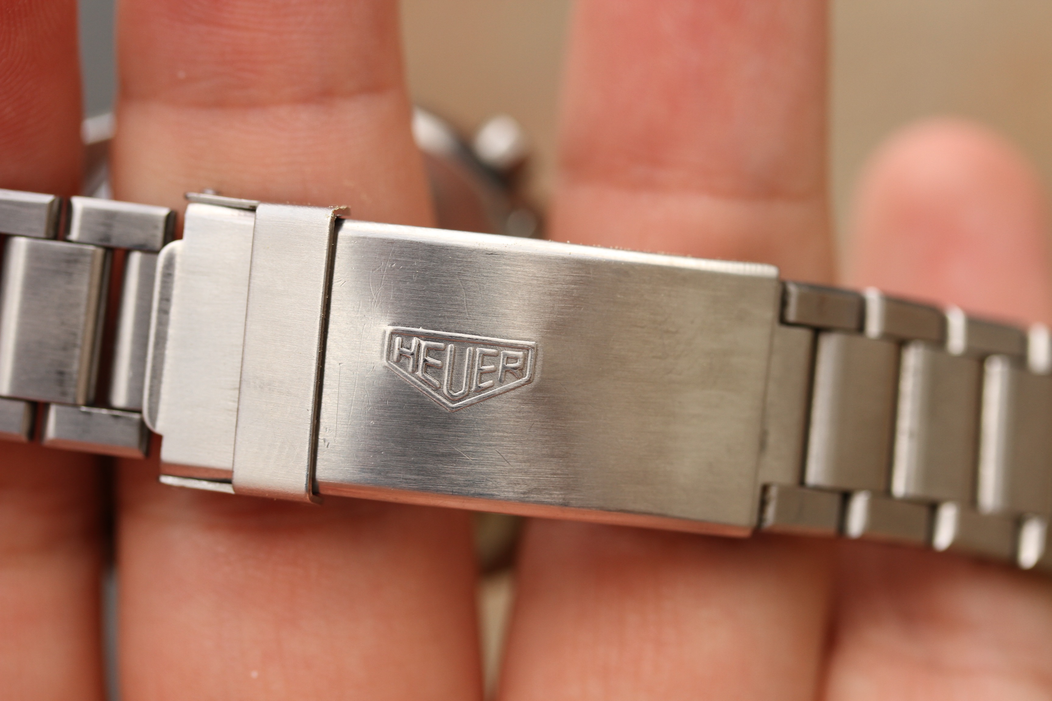 Bracelet is original, in excellent vintage condition, fits about a 7.5" wrist and signed Heuer on clasp.