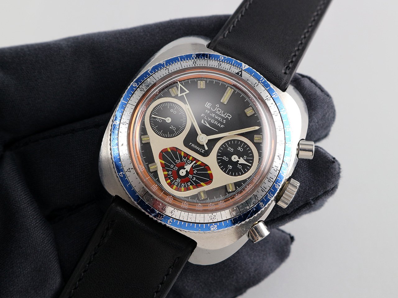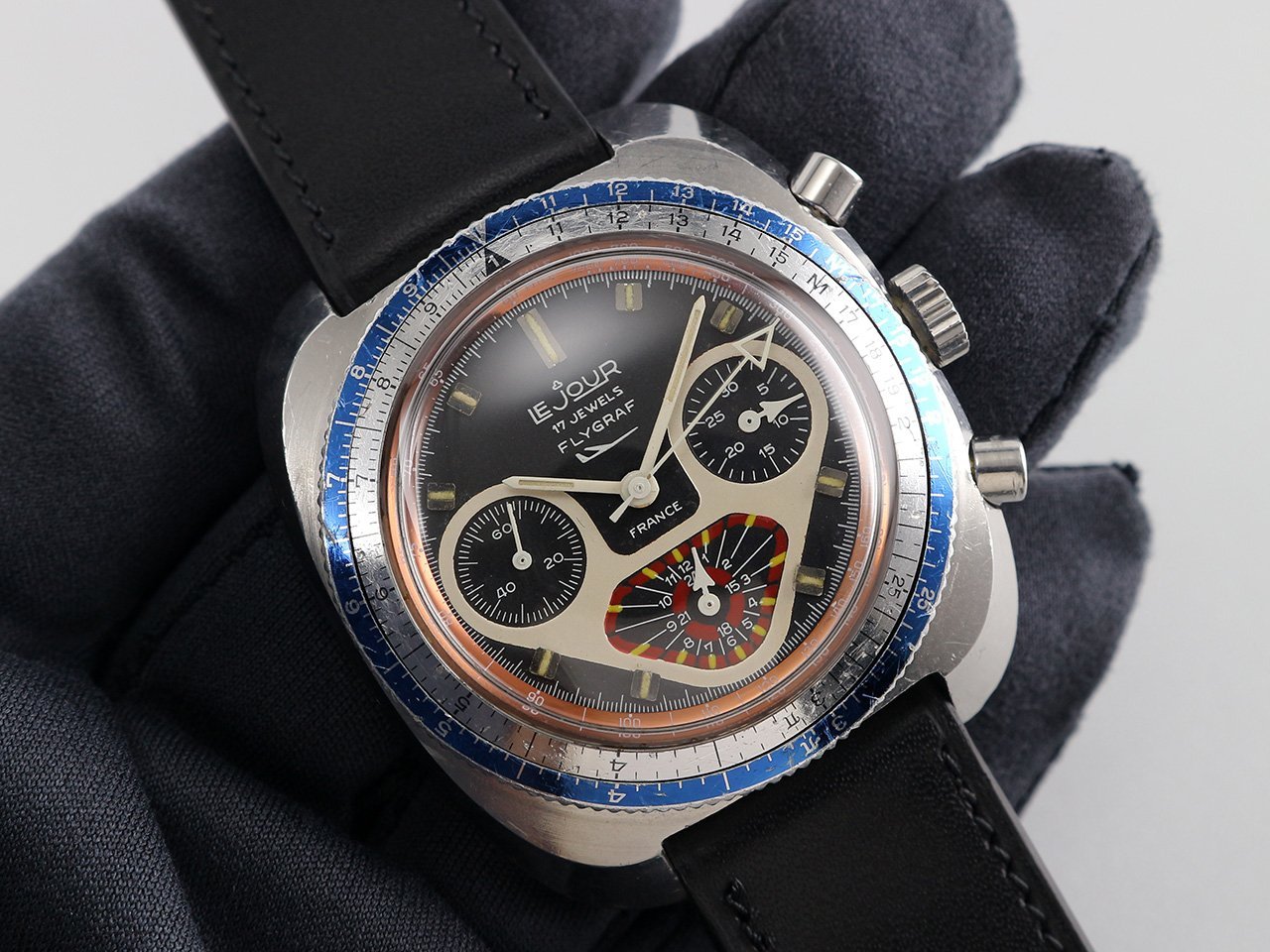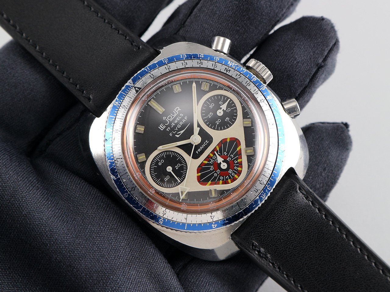 ·Up for sale is a very nice Le Jour Yema Flygraf ref. 92.103P. The original dial is still in great condition with Tritium indices & handset. The unpolished SS case is in good shape with 2 pieces aluminum rotating bezel. It measures 40.5mm wide w/o crown and 46.5mm lug to lug, the lug width is 20mm. Inside is the Valjoux 7736 chronograph movement, which was serviced a while ago, running strong & keeping good time.