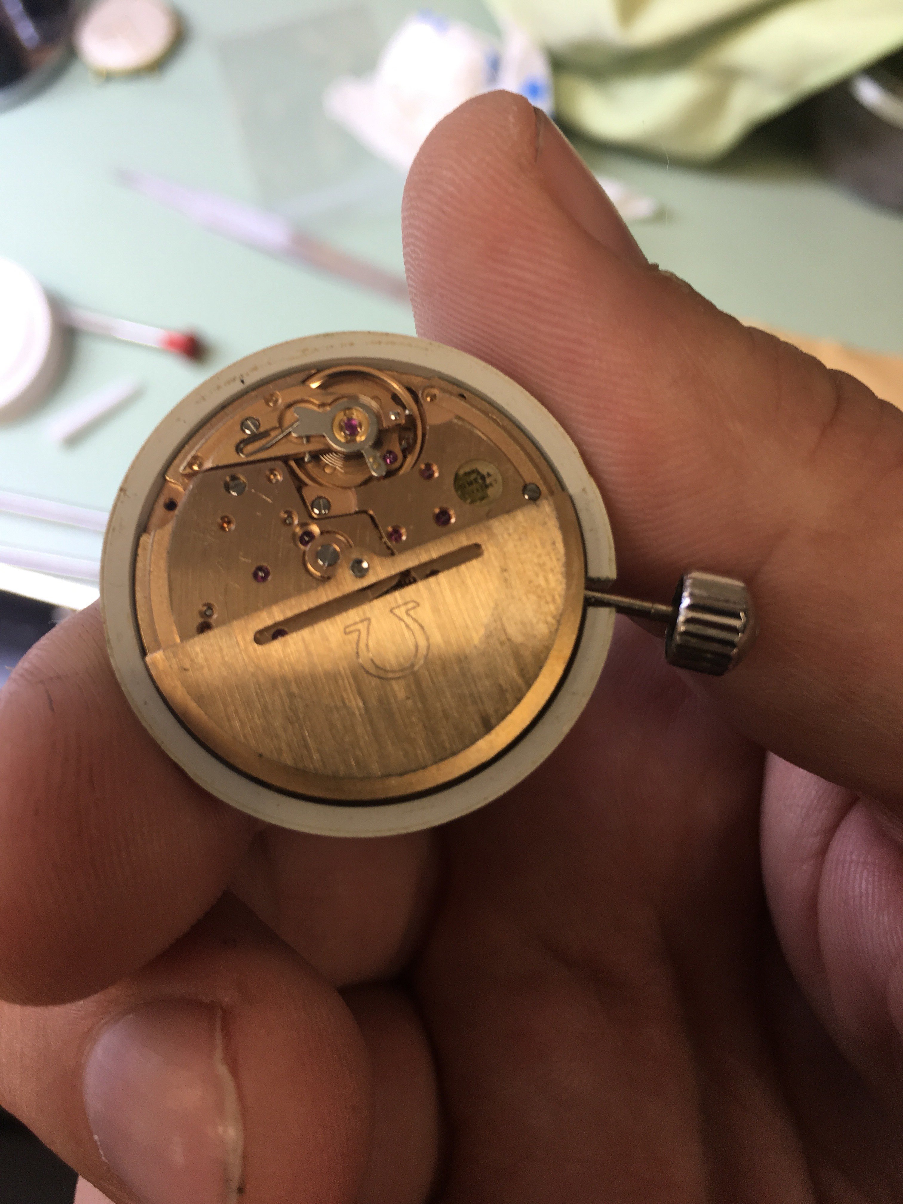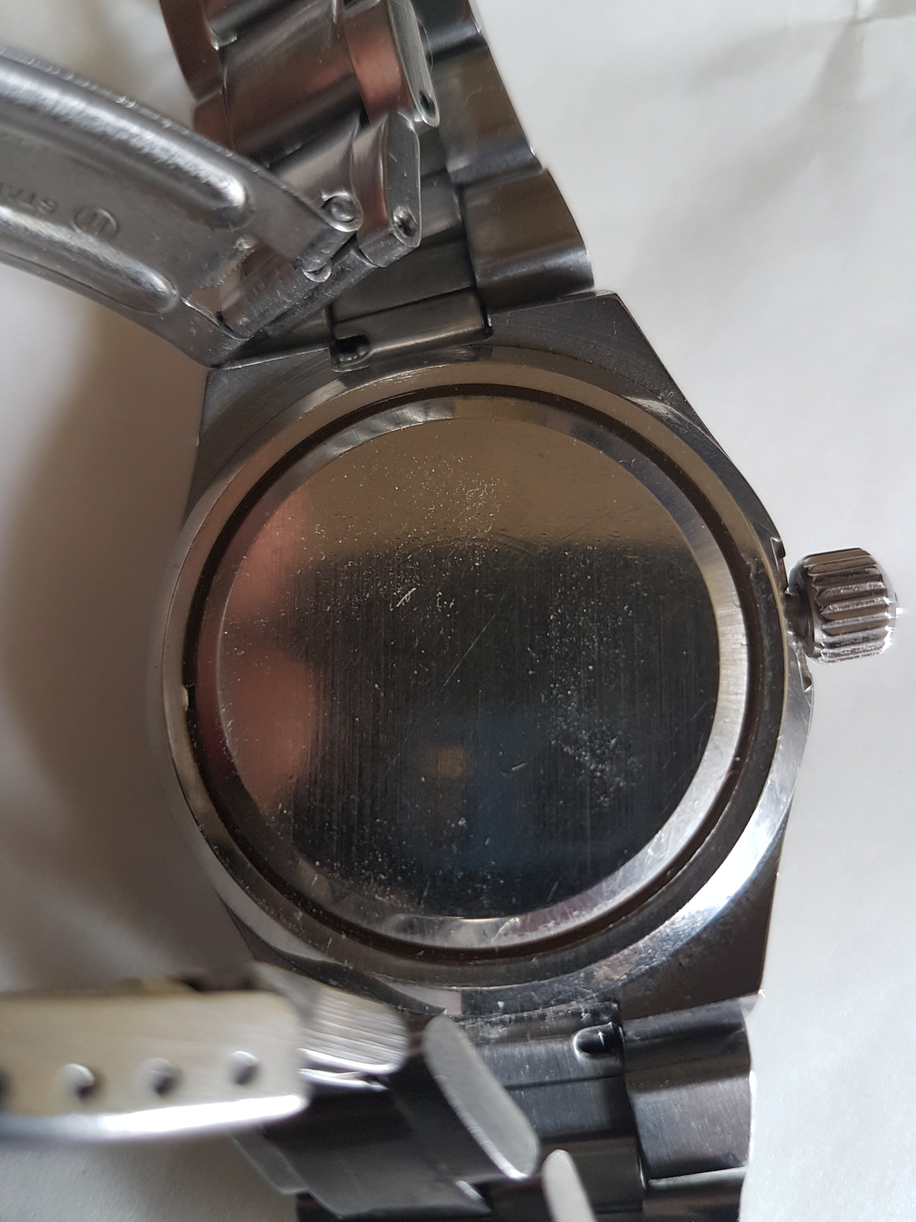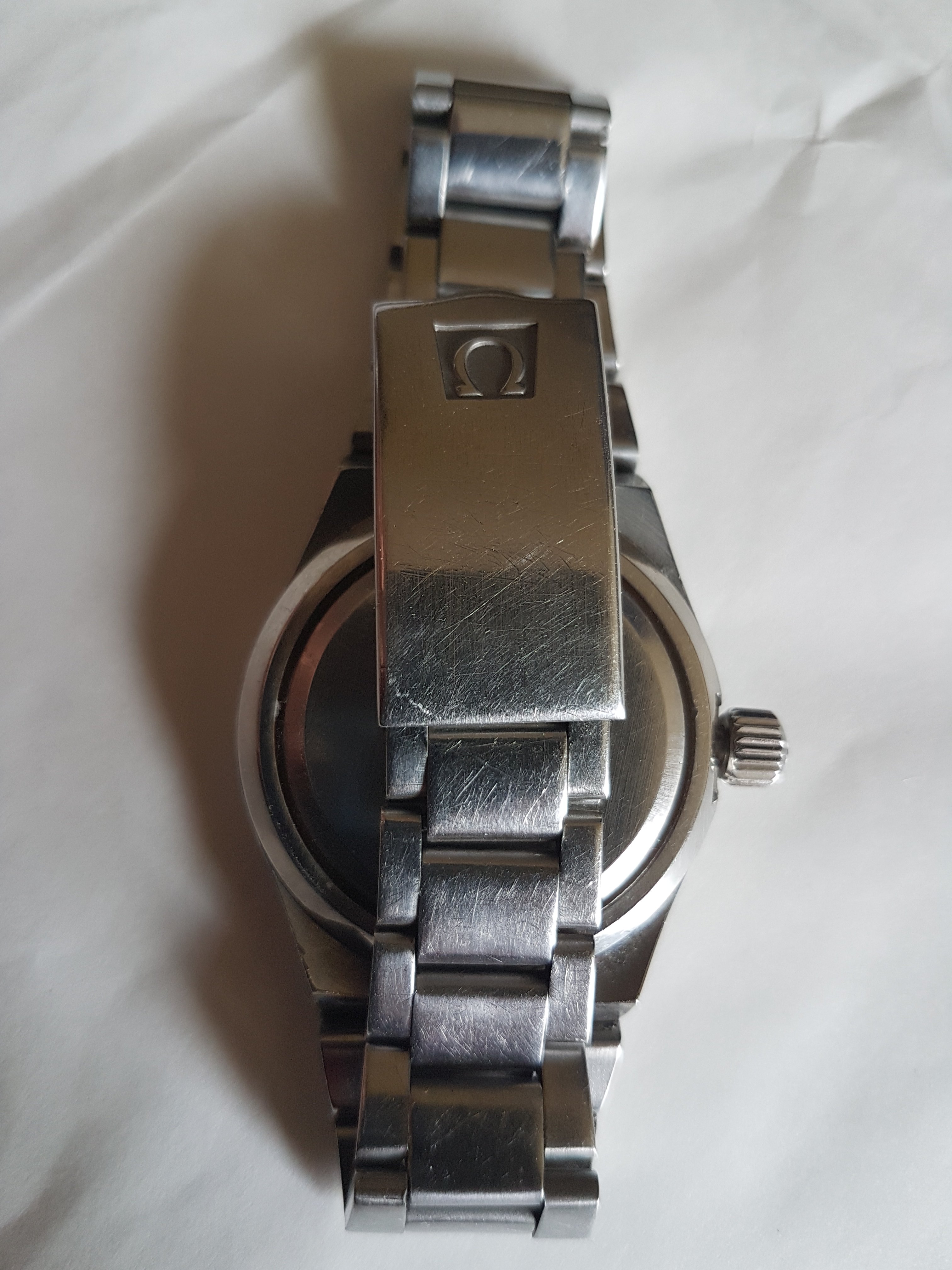 The watch is a comfortable fit on my 7 inch wrist with a bit of room to spare. The bracelet is the correct model and I am sure it is original to the watch. There is very little wear to the case, with one tiny dink on the back near the crown and no other bumps or scratches. The bracelet has the usual numerous but slight scratches from wear. The 1012 movement allows for easy adjustment of the date without the pull-push of its predecessor the 565. The last watchmaker took a movement photo as I asked but it wasn't a very good one and you can't read the serial number, so I can only say that it's mid 1970s. I can't open it to take another photo as it's a front loader.