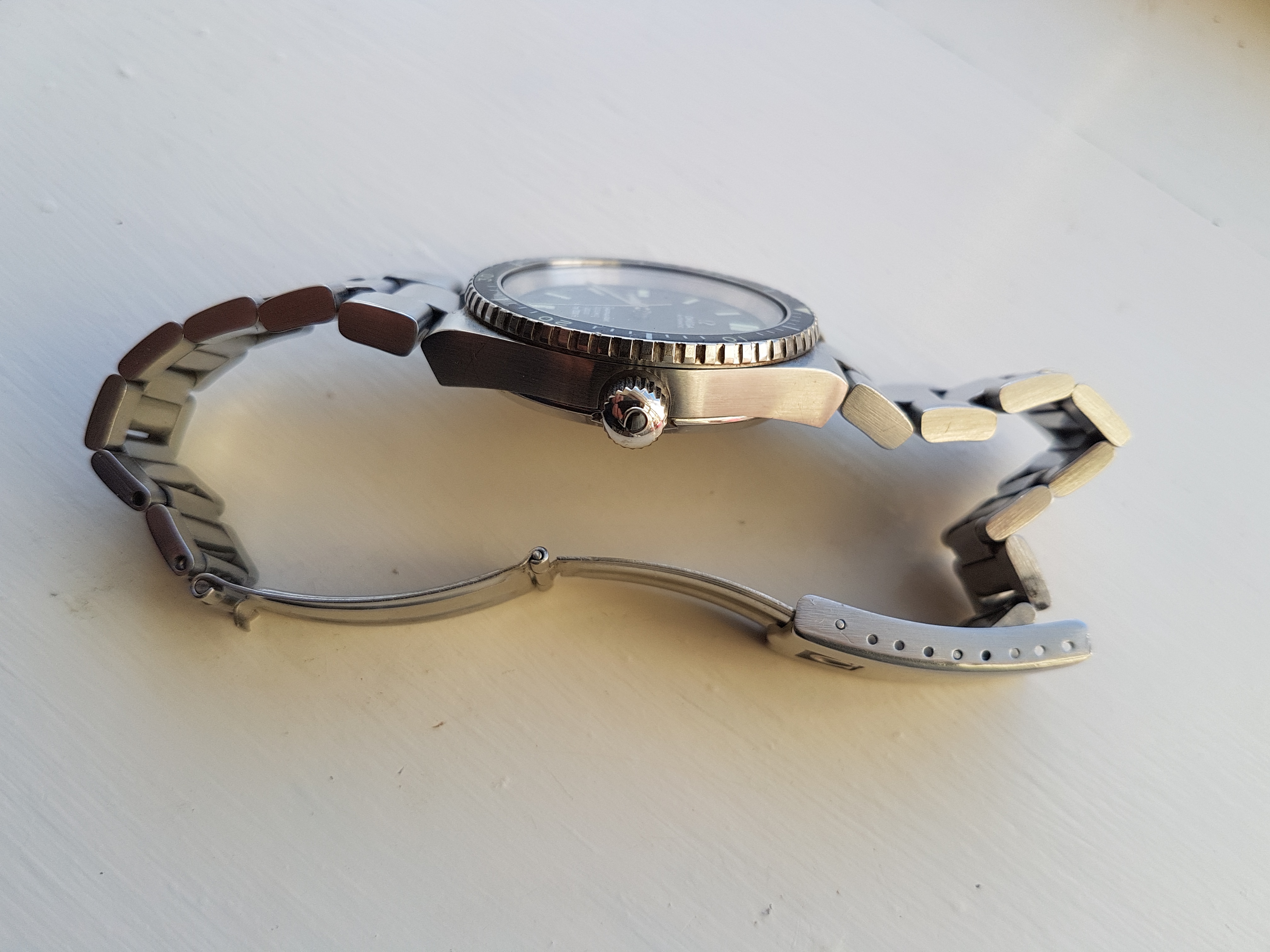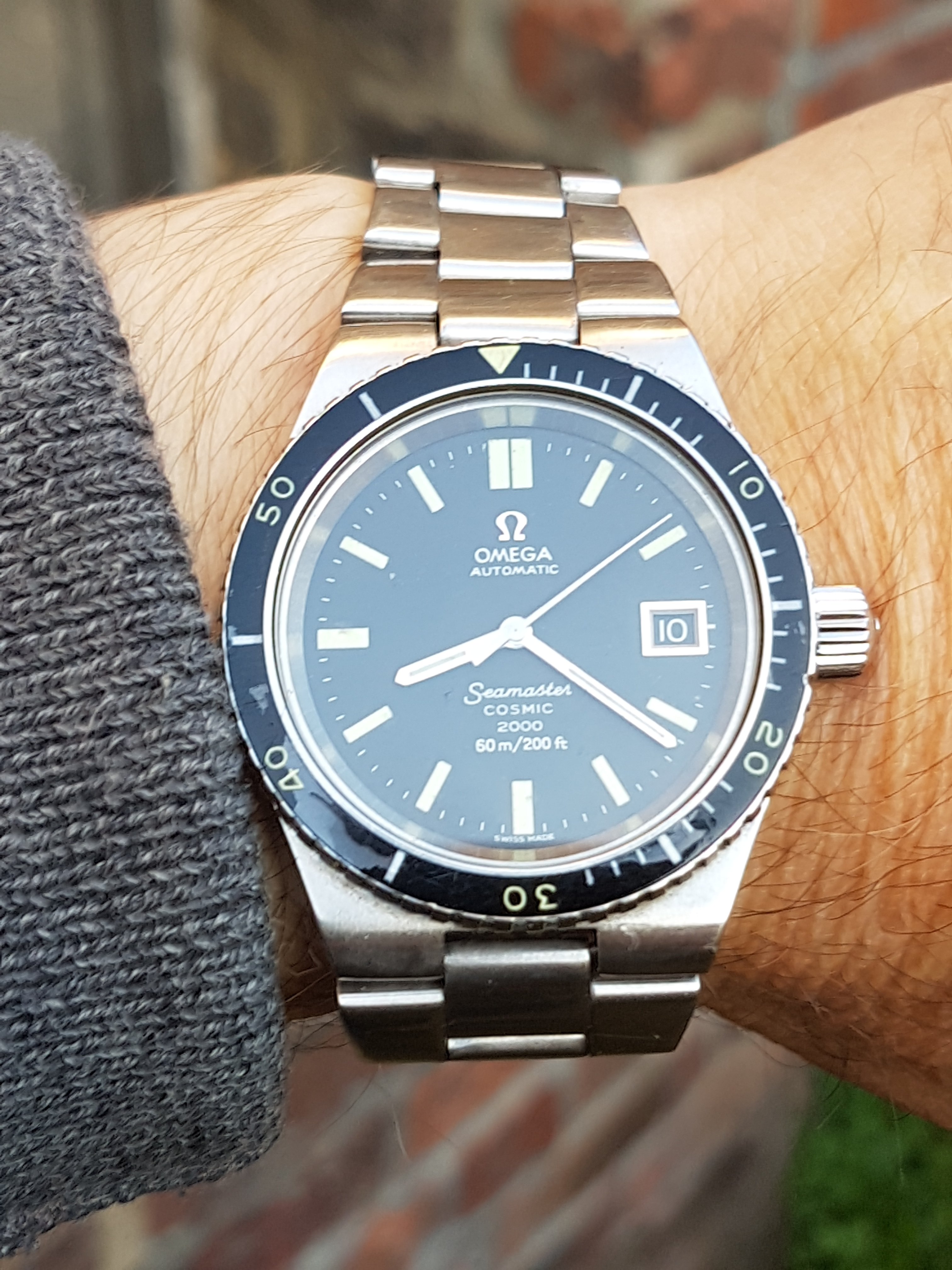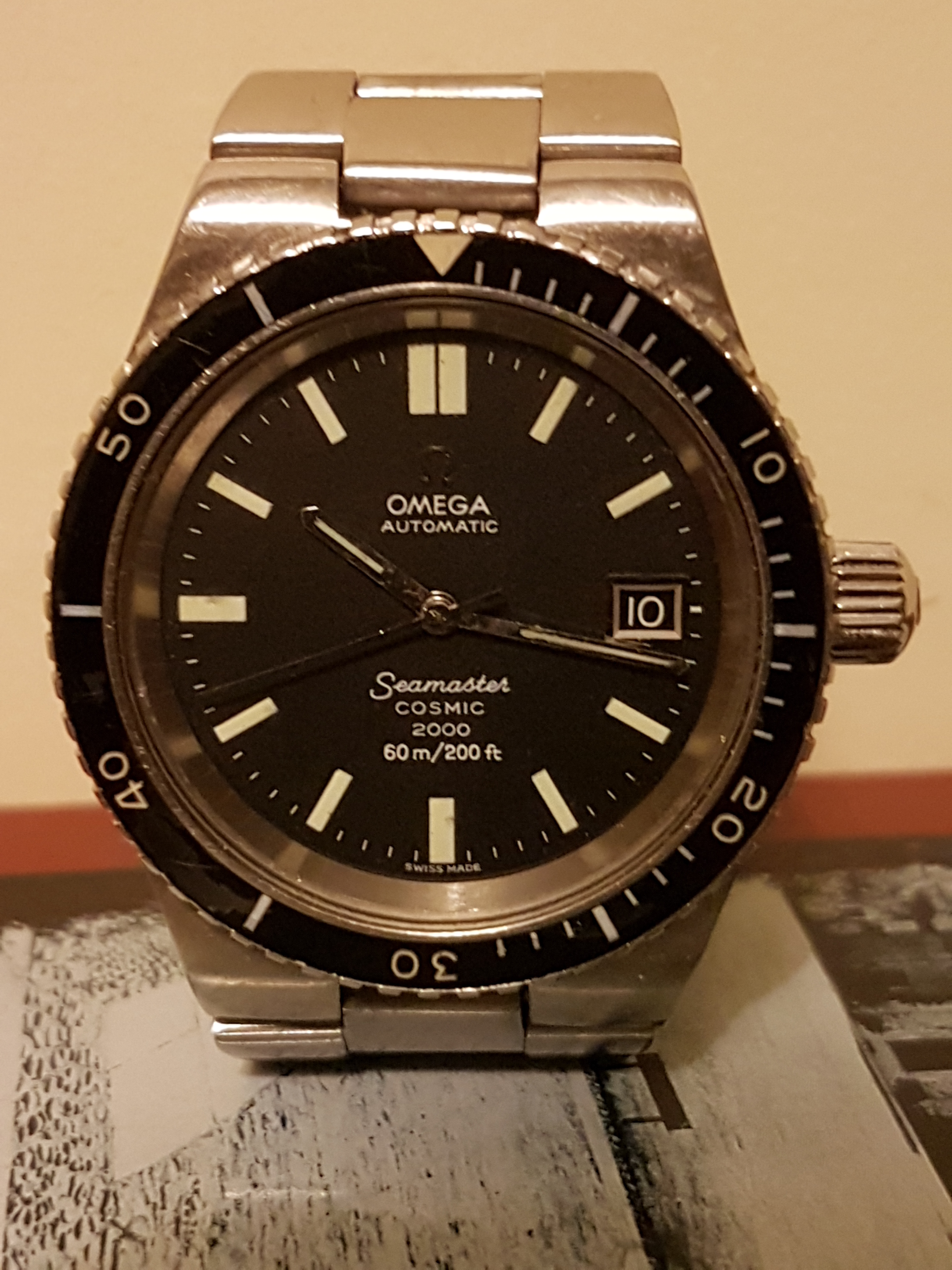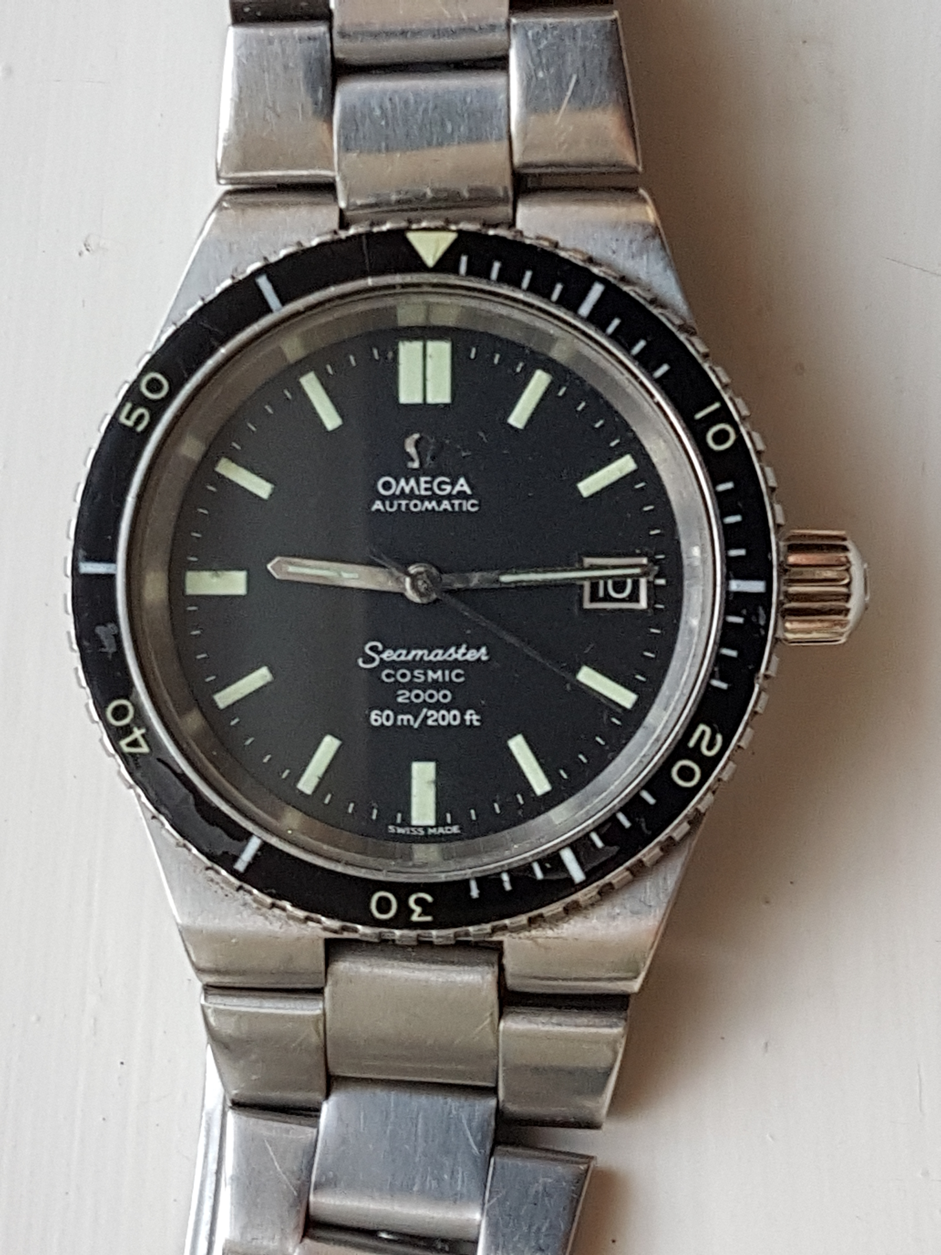 ·I am offering for sale my Cosmic 2000 dive watch. I bought it in 2013 and had it serviced then, and again in November 2018. The crown had to be replaced at the last service (the original crown seems to be a weak point of this model) but the service crown is almost identical in appearance and you wouldn't know without close scrutiny. The dial is original, unrefinished and virtually perfect. The hands are original and so is all the lume, which is in good shape. The watch has its original bezel, which have mostly been replaced. The bezel rotates freely and is in good condition apart from a slight knock at 18, also slight surface delamination which doesn't detract and is invariably present on original bezels.