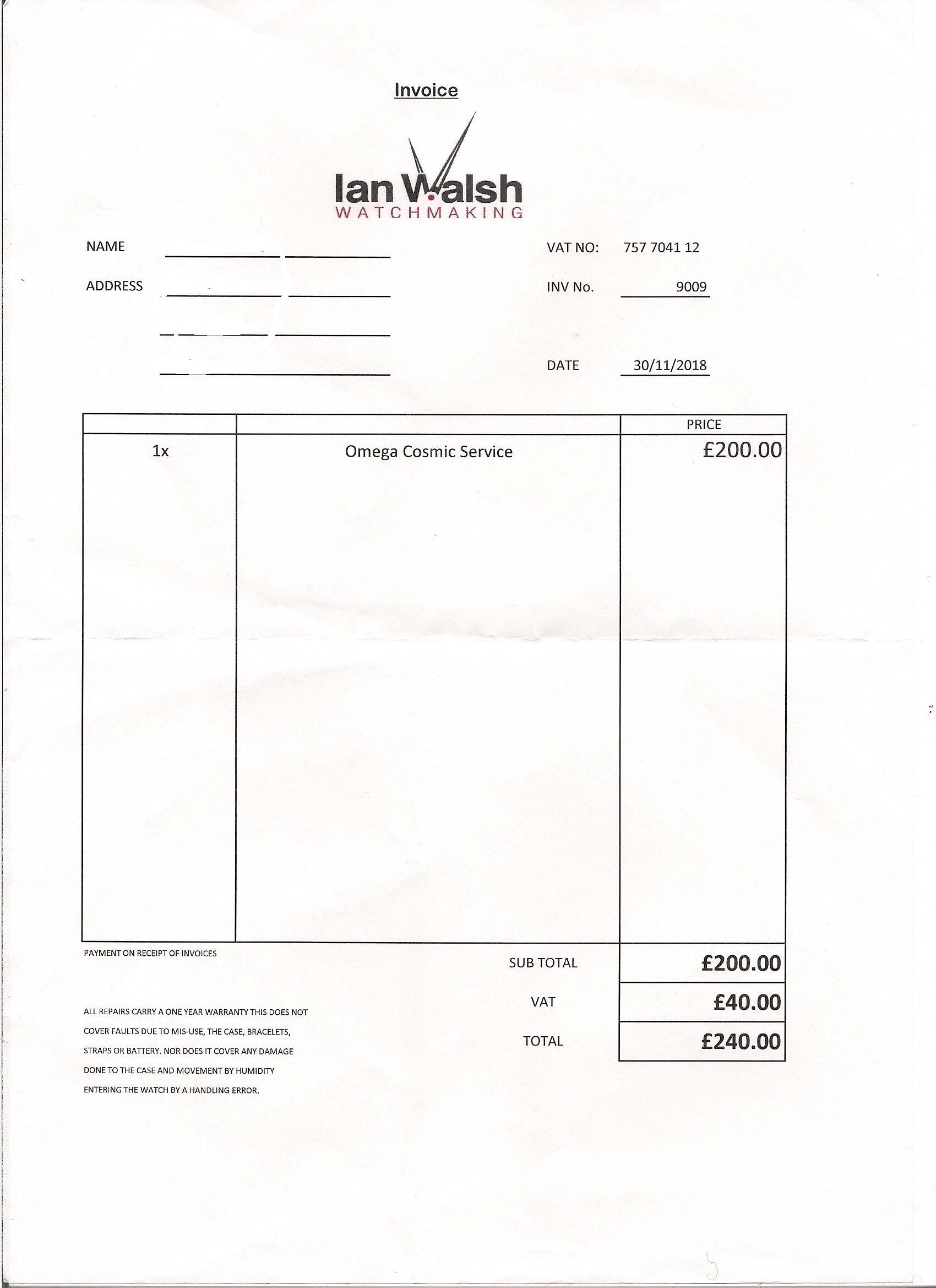 I am asking £1000 net to me, to include Royal Mail Special Delivery within the UK. I'm basing this price on ebay sold prices of £1200-1500 for the same model with no proof of service and in lesser condition, making allowance for the avoidance of their commission and of the general PITA of an ebay auction. I would much prefer a UK sale but will consider an EU sale at a push. I will accept payment by Paypal F and F, a bank transfer or a UK personal cheque and will ship as soon as funds have cleared.