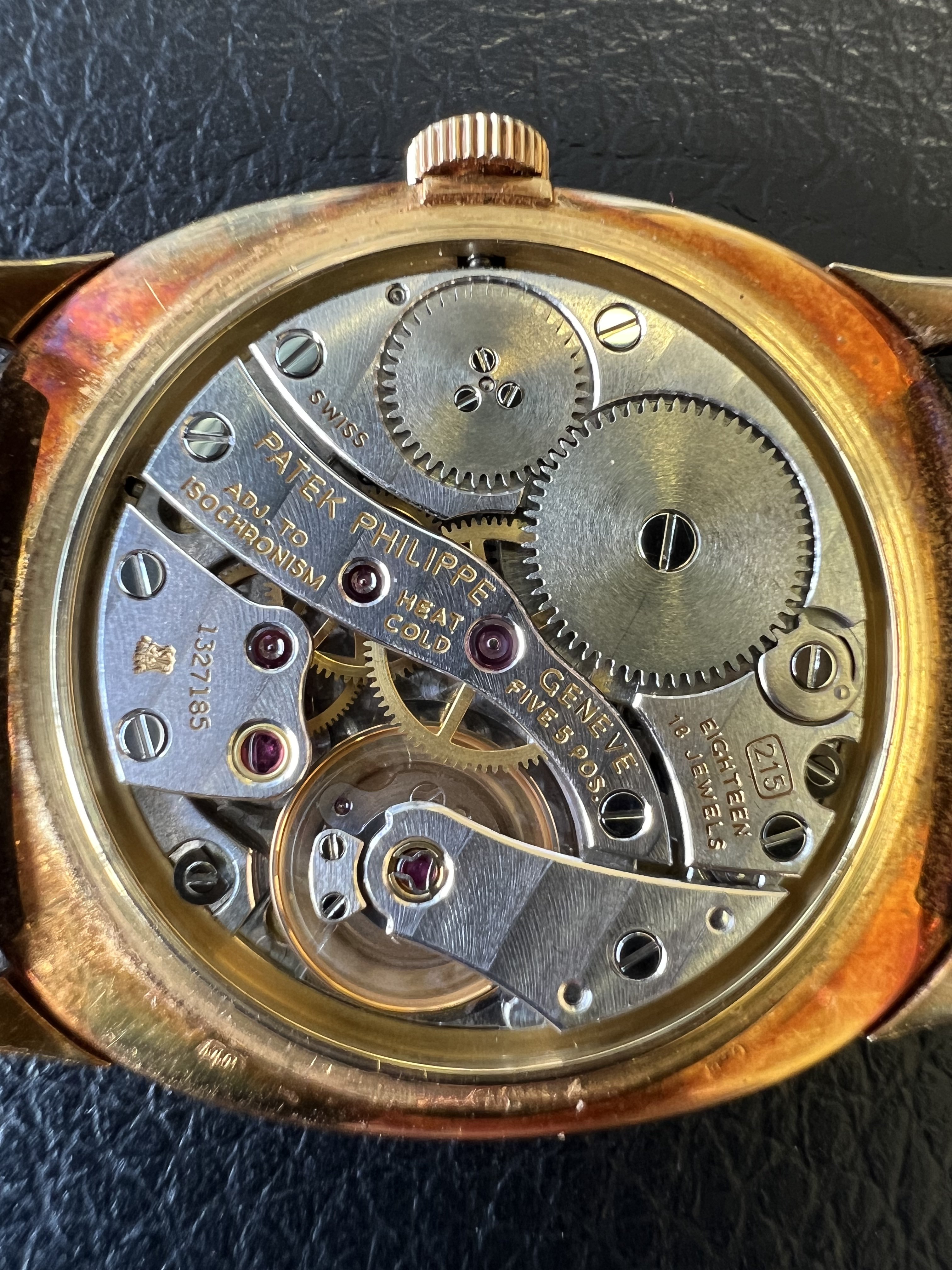 MOVEMENT: LOOK AT THAT! Speaking of work of art, the hand wound cal 215 by Patek is just incredible! Finished impeccably well - yes, if you zoom in you can see the Geneve Seal! Just an awesome piece of watchmaking history, went Patek was one of the few to have the Geneve Seal before they switched over to their own. Service history is unknown, but it winds and sets beautifully, as you’d expect for a high end movement like this. Of course being a two hander it’s hard to say exactly how accurate is but in my experience within about 20 seconds a day or less.