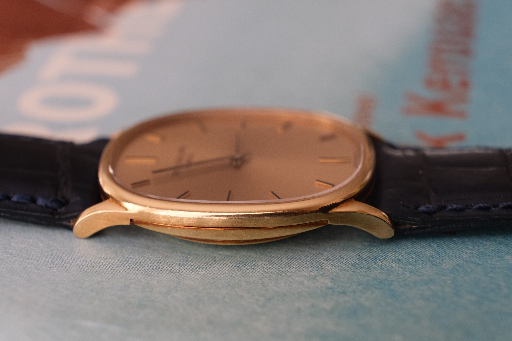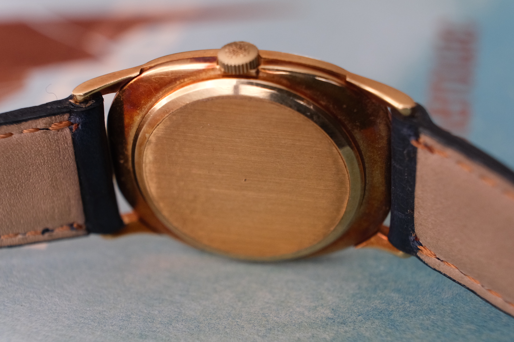 CASE: Beautiful, and I believe unpolished solid 18k case. From the Ellipse line, this measures 27MM wide by 37mm lug to lug, with that rounded tank shape it wears incredibly well, pictured on my 6.5 inch wrist I’d say it feels comparable to a 34 or 35mm round watch - just perfect for a dress watch with some a bit o’ funky flare! As you can see, the brushing on the sides of the case, looks all original and untouched, the case back is preserved with a sticker, and you can see the amazing patina forming on the gold, showing this thing has really not been touched! That of course could be wiped off very easily with a light polish, but I think it’s stunning, and will be leaving it untouched (hopefully the next owner will as well!) There are a few scratches and a ding on the front of the case that you can see below the six position, all to be expected for how soft solid 18k is.