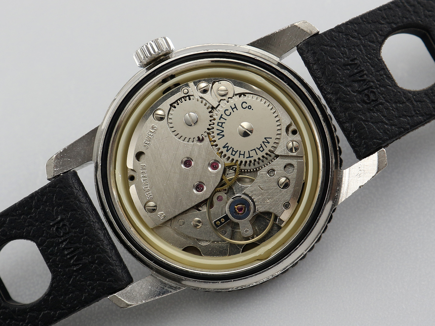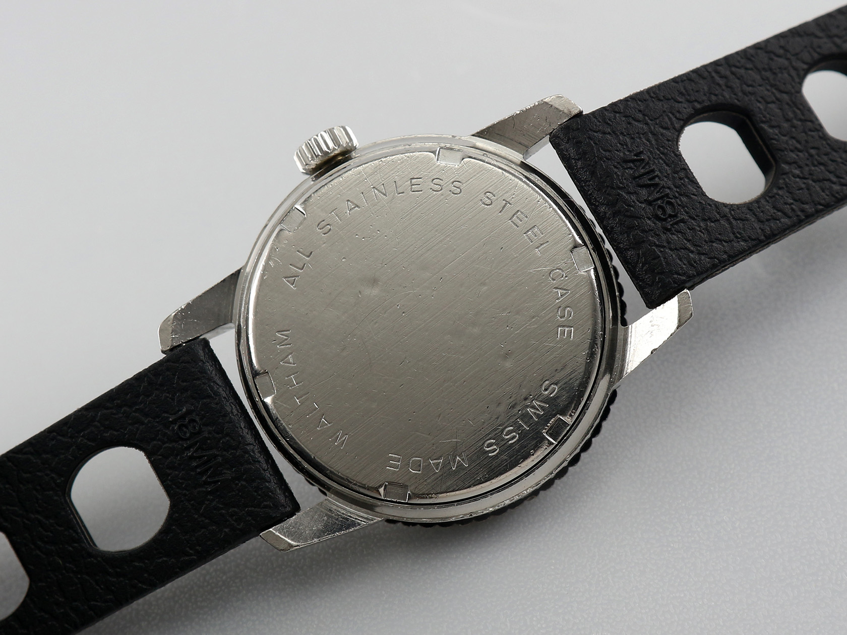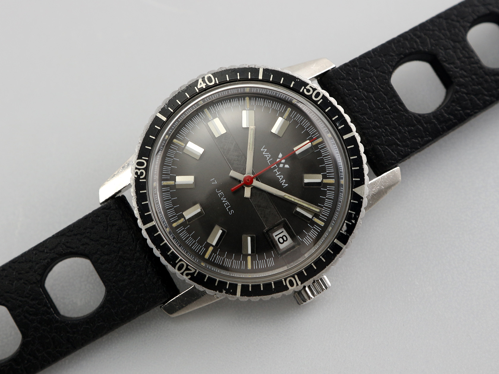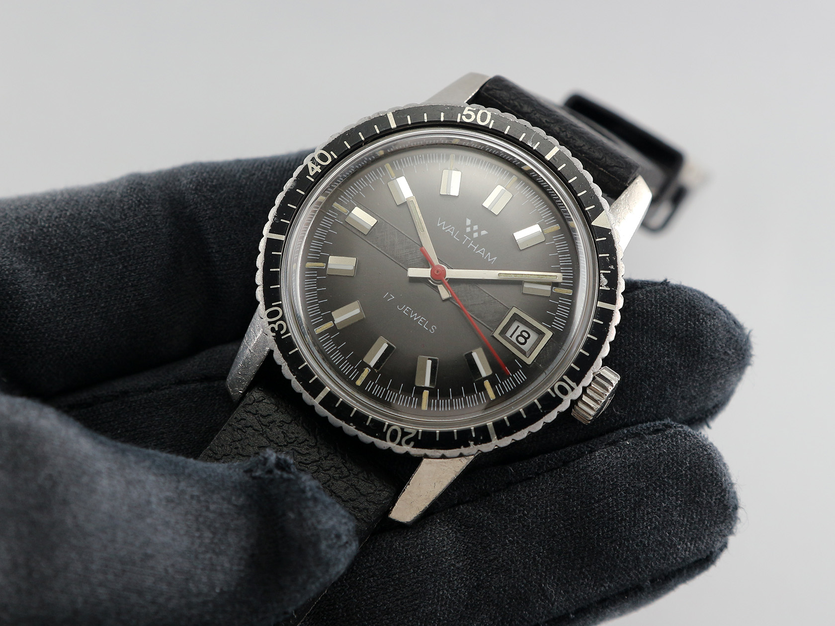 ·Up for sale today is a very nice Waltham hand-winding watch. The black dial is in great condition with a textured stripe that I call "runway". The stainless steel case is unpolished plus the original crown. It measures 36mm wide without crown and 43mm lug to lug, lug width is 18mm. Service history unknown but still running strong & keeping time.