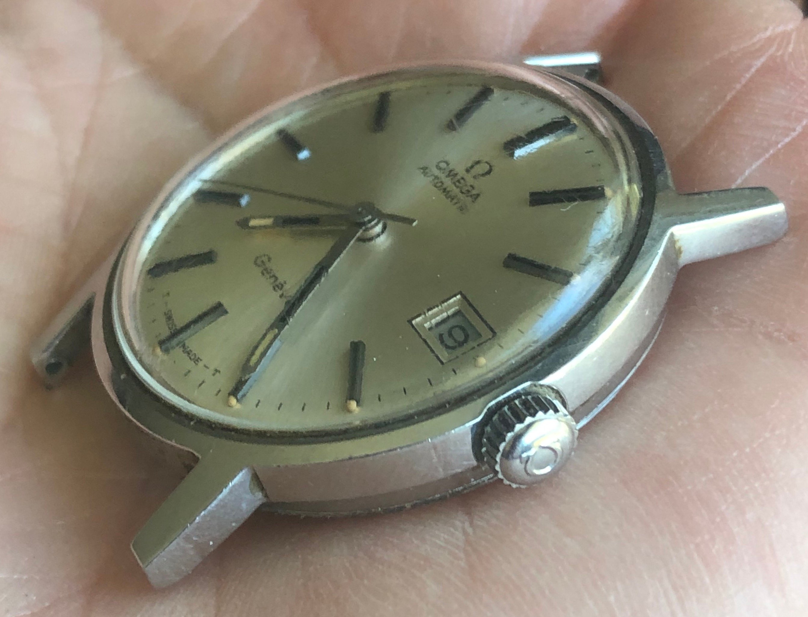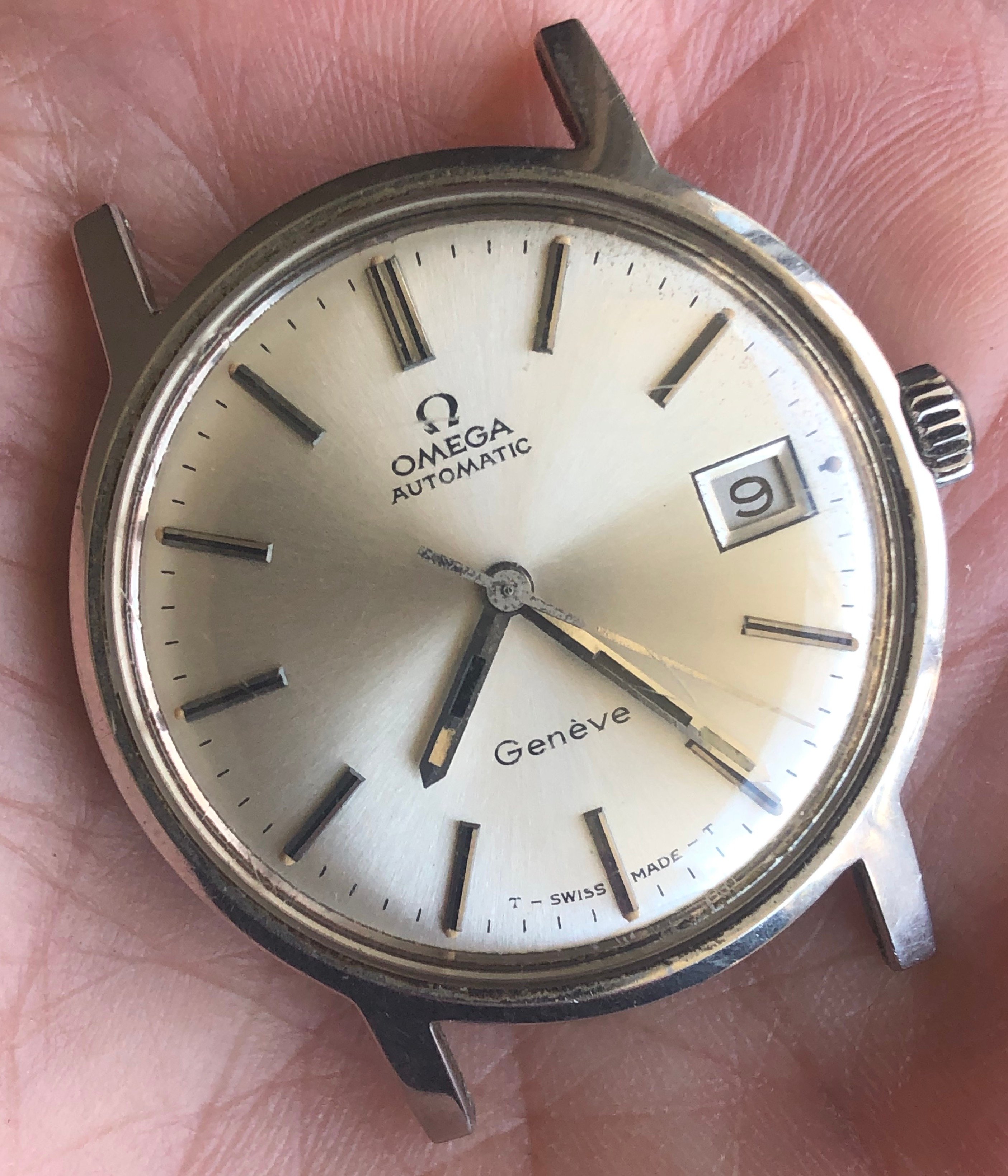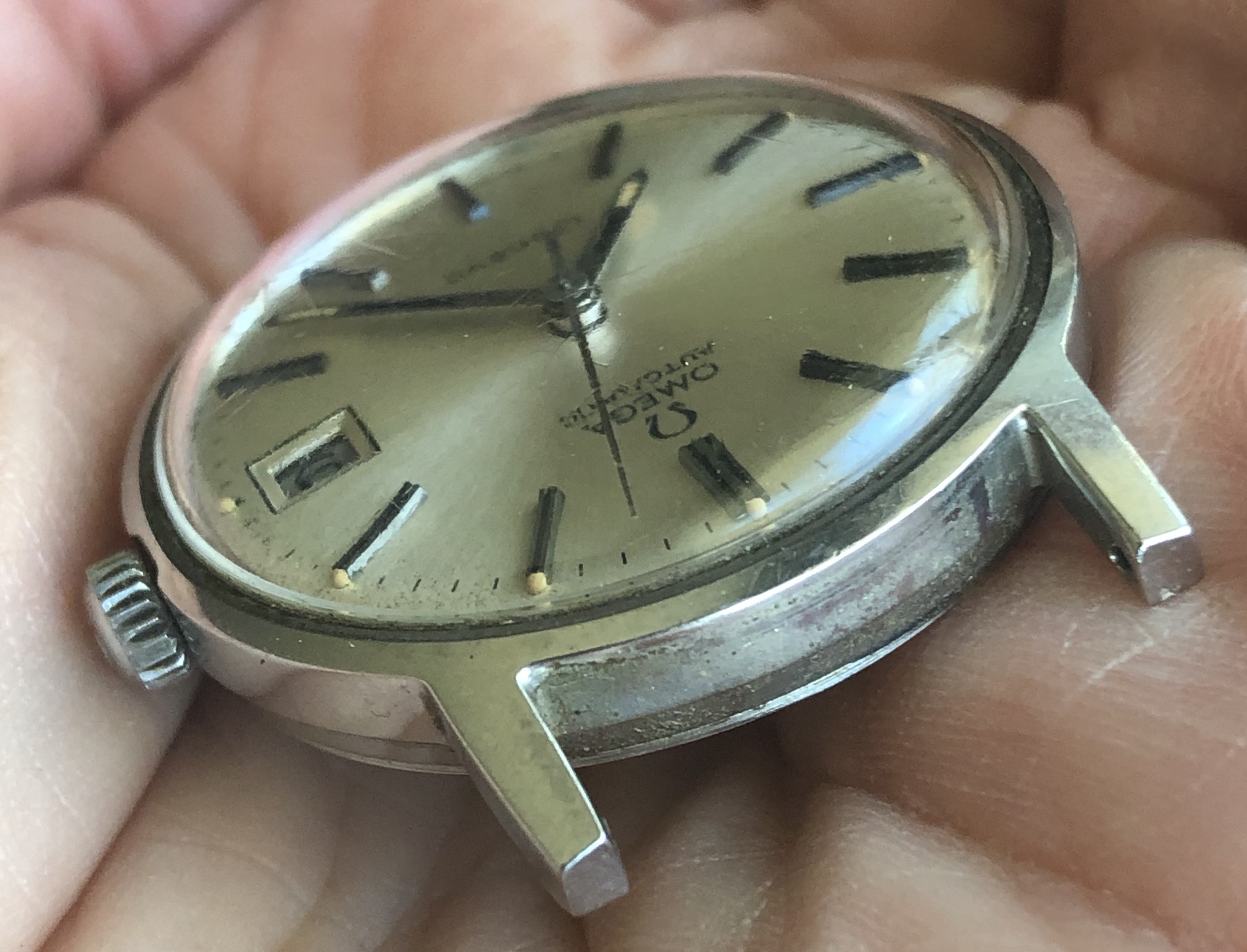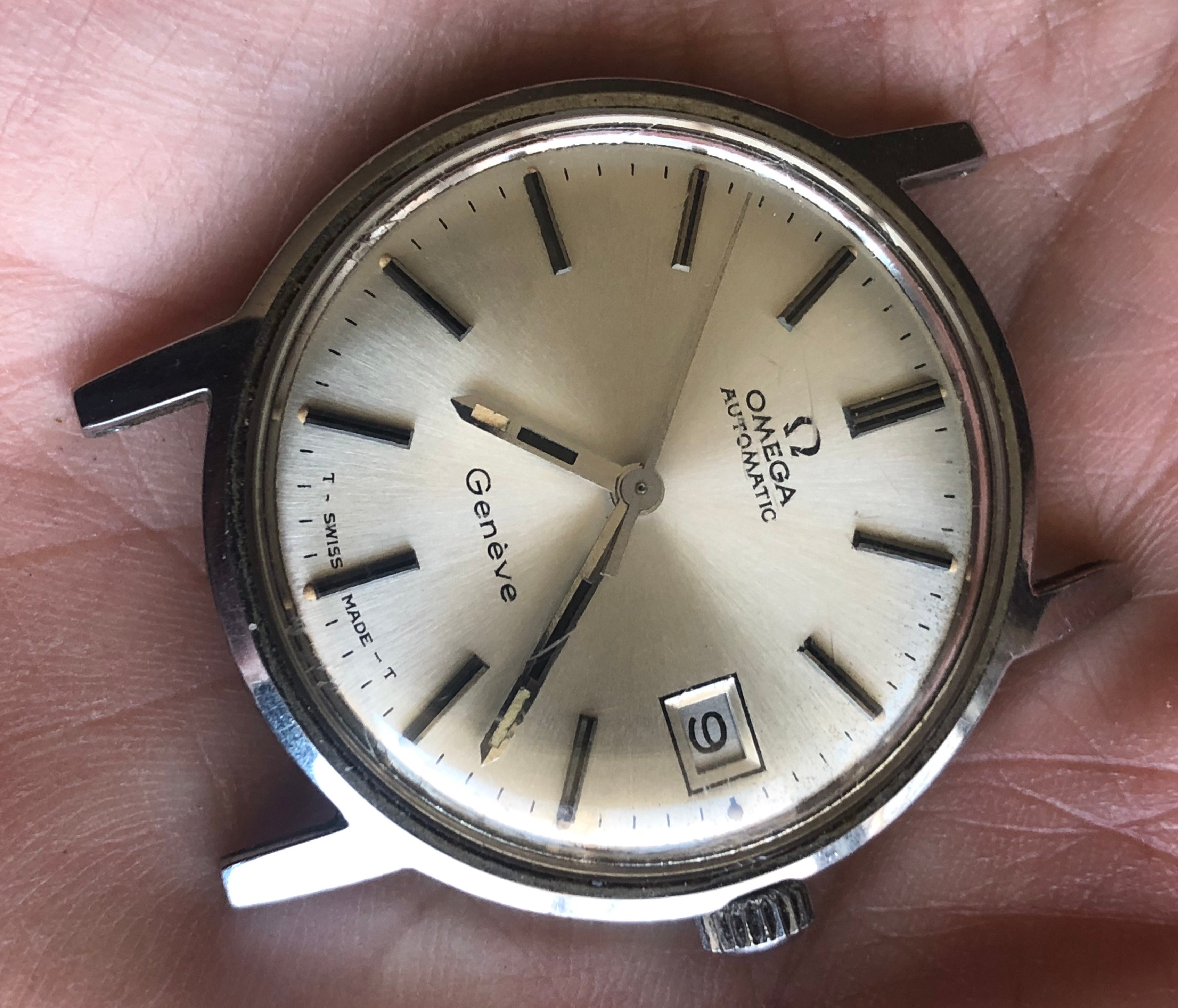 ·I bought this watch for the bracelet that was mounted on it with the intention of passing on the watch itself to another member. Nice entry-level vintage Omega, 35mm all-stainless case with high quality cal 565 movement. Attractive sunburst silver dial with beautifully aged lume dots and matching hands. Minor scratches on the Omega-signed crystal and a few tool marks on the caseback. The watch is running and setting and the movement looks clean by eye, but the crown is extremely stiff in the winding position and I can barely turn it, so it is being sold as needing service and priced accordingly.