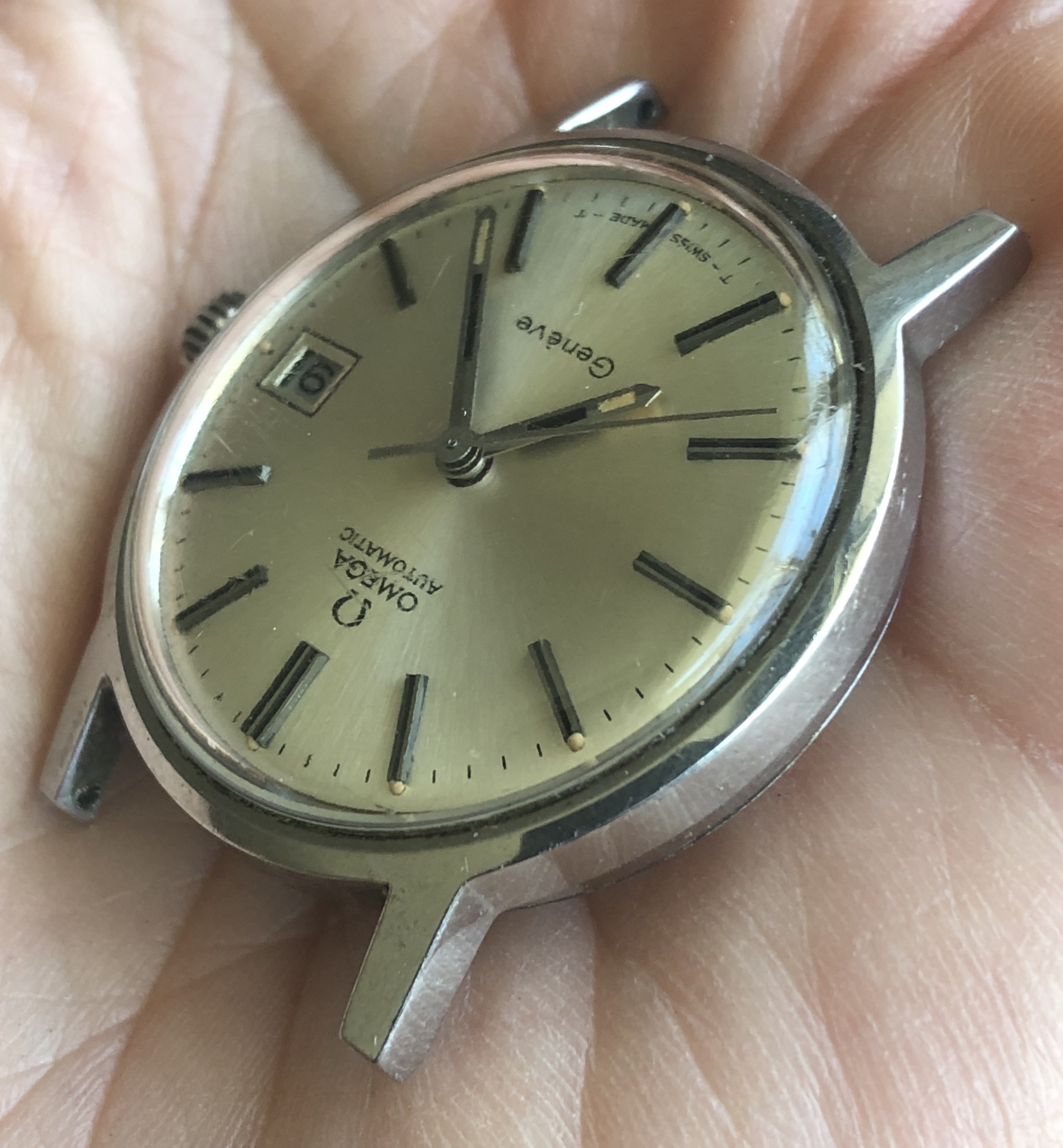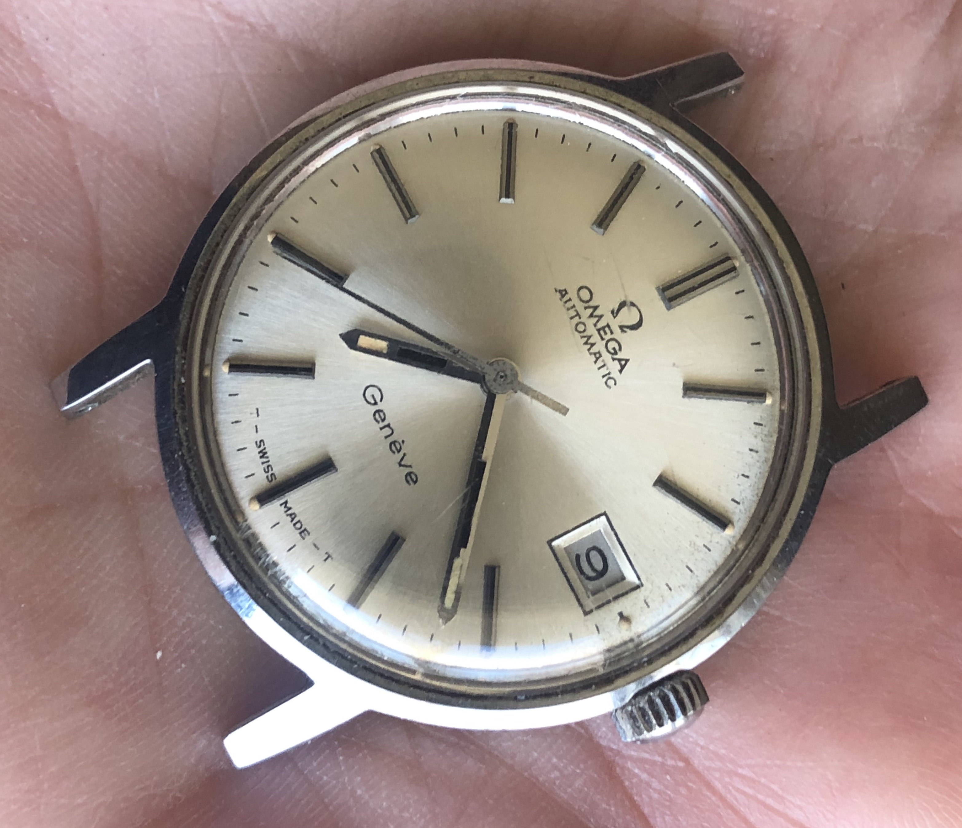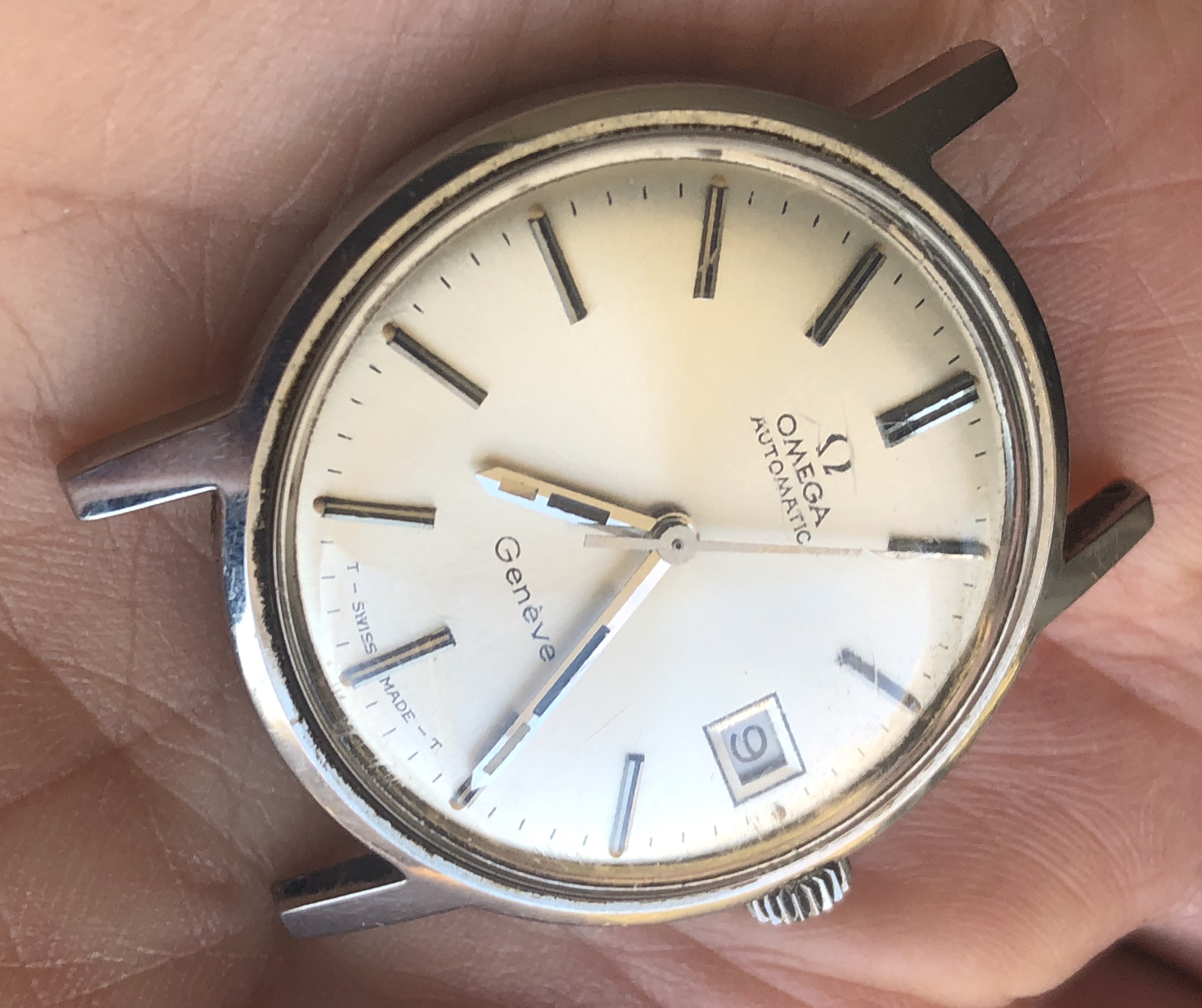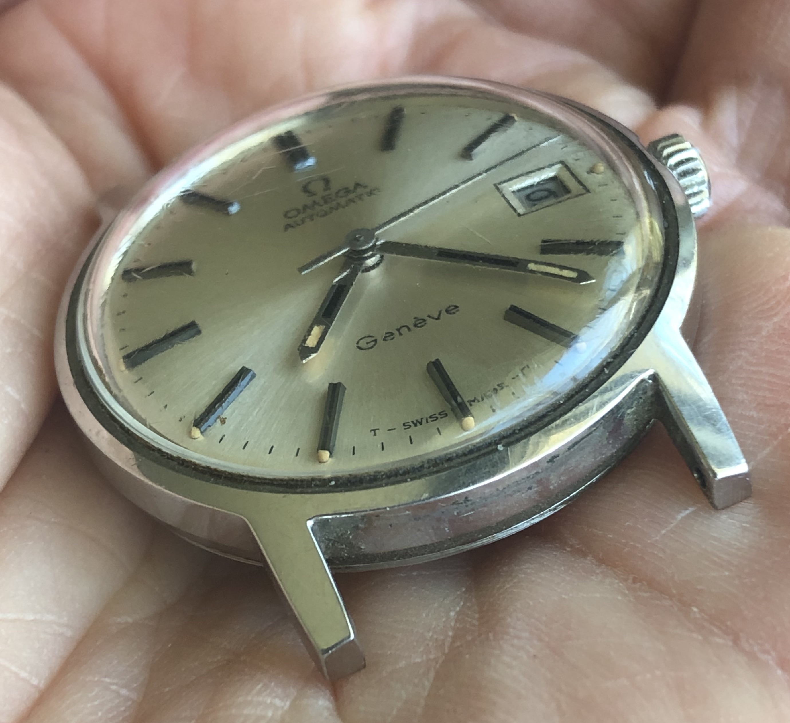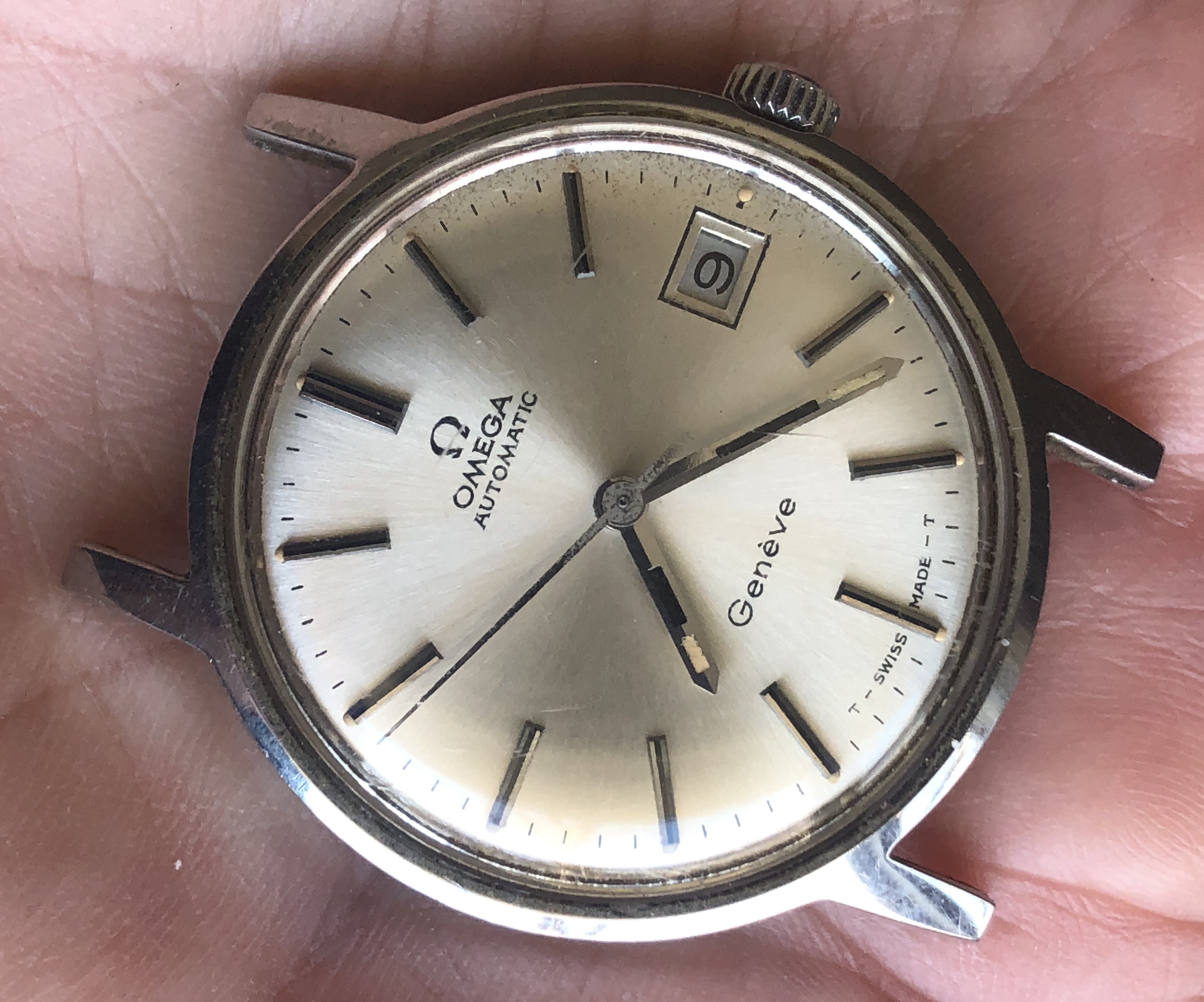 ·I bought this watch for the bracelet that was mounted on it with the intention of passing on the watch itself to another member. Nice entry-level vintage Omega, 35mm all-stainless case with high quality cal 565 movement. Attractive sunburst silver dial with beautifully aged lume dots and matching hands. Minor scratches on the Omega-signed crystal and a few tool marks on the caseback. The watch is running and setting and the movement looks clean by eye, but the crown is extremely stiff in the winding position and I can barely turn it, so it is being sold as needing service and priced accordingly.