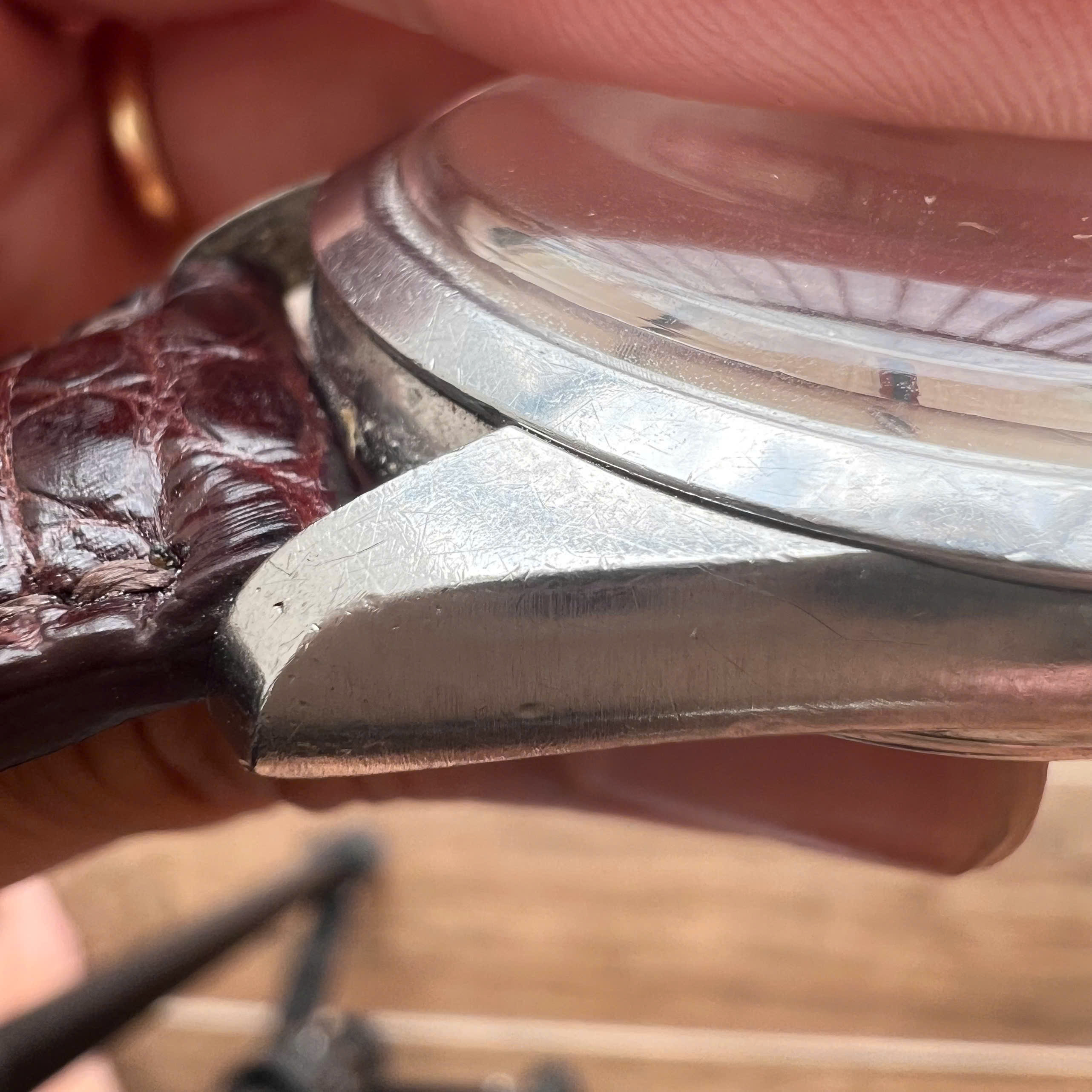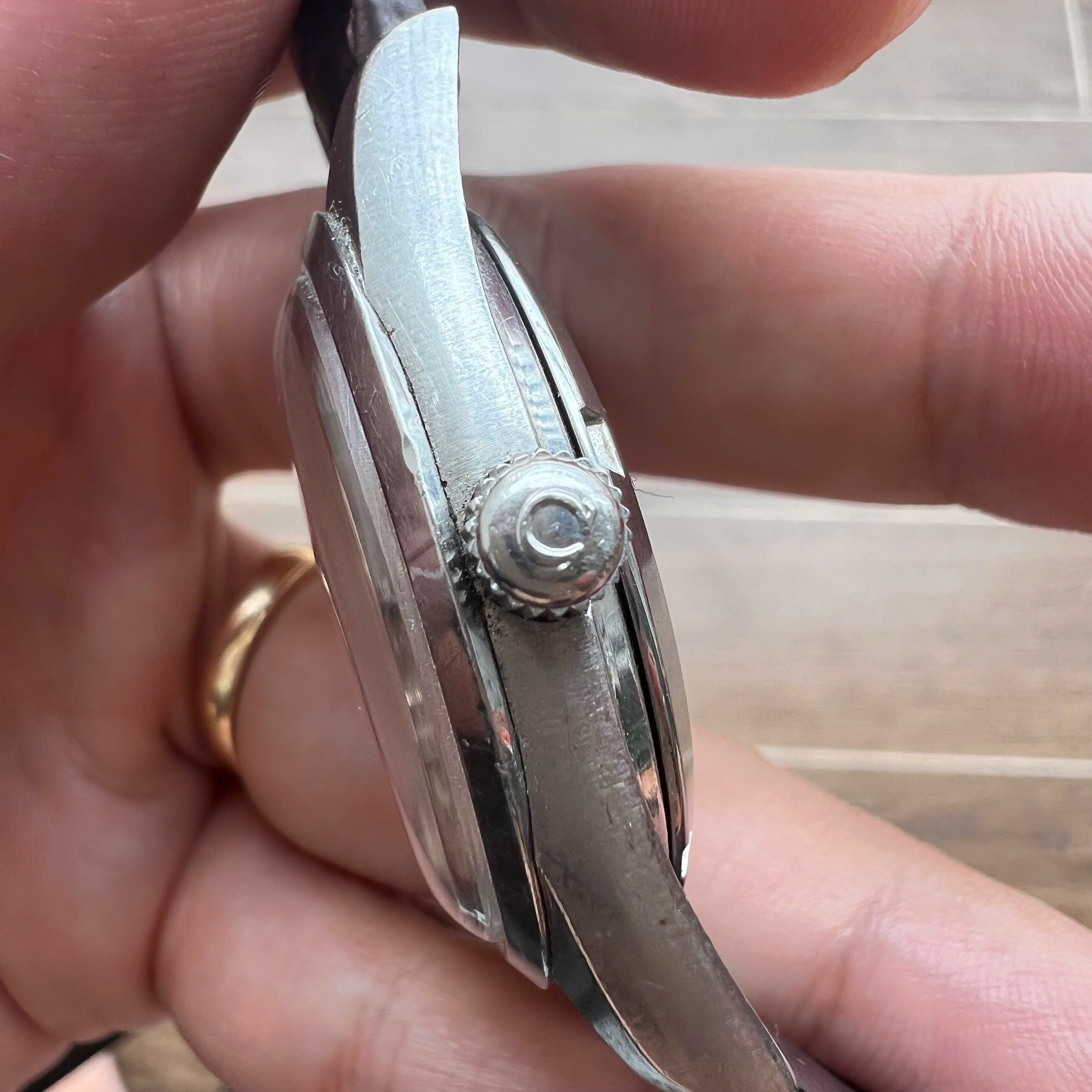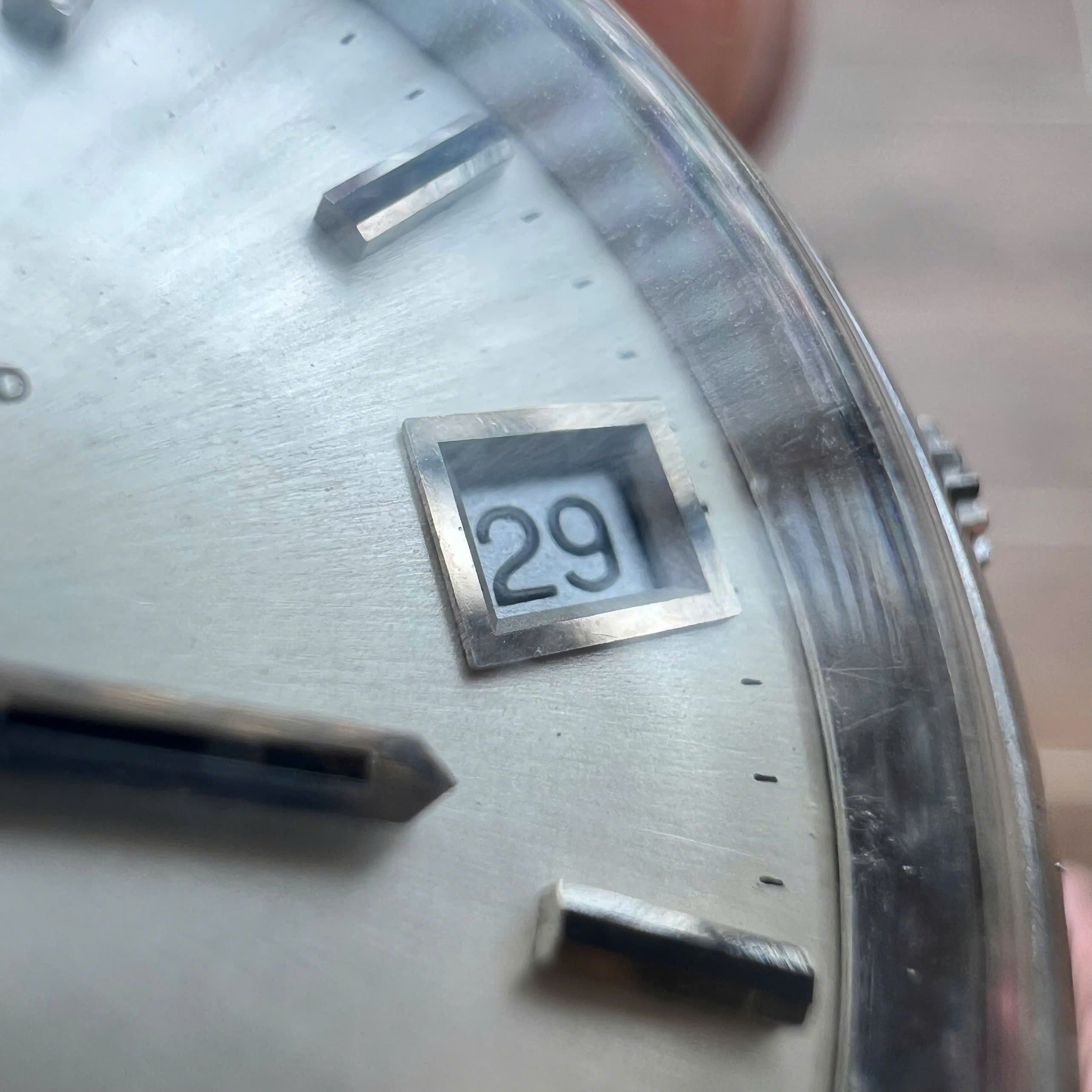 - Case: 35.5mm case, unpolished with sharp edges with vertical brush effect on the sides are still presented. With hairline scratches and a few tiny dents.