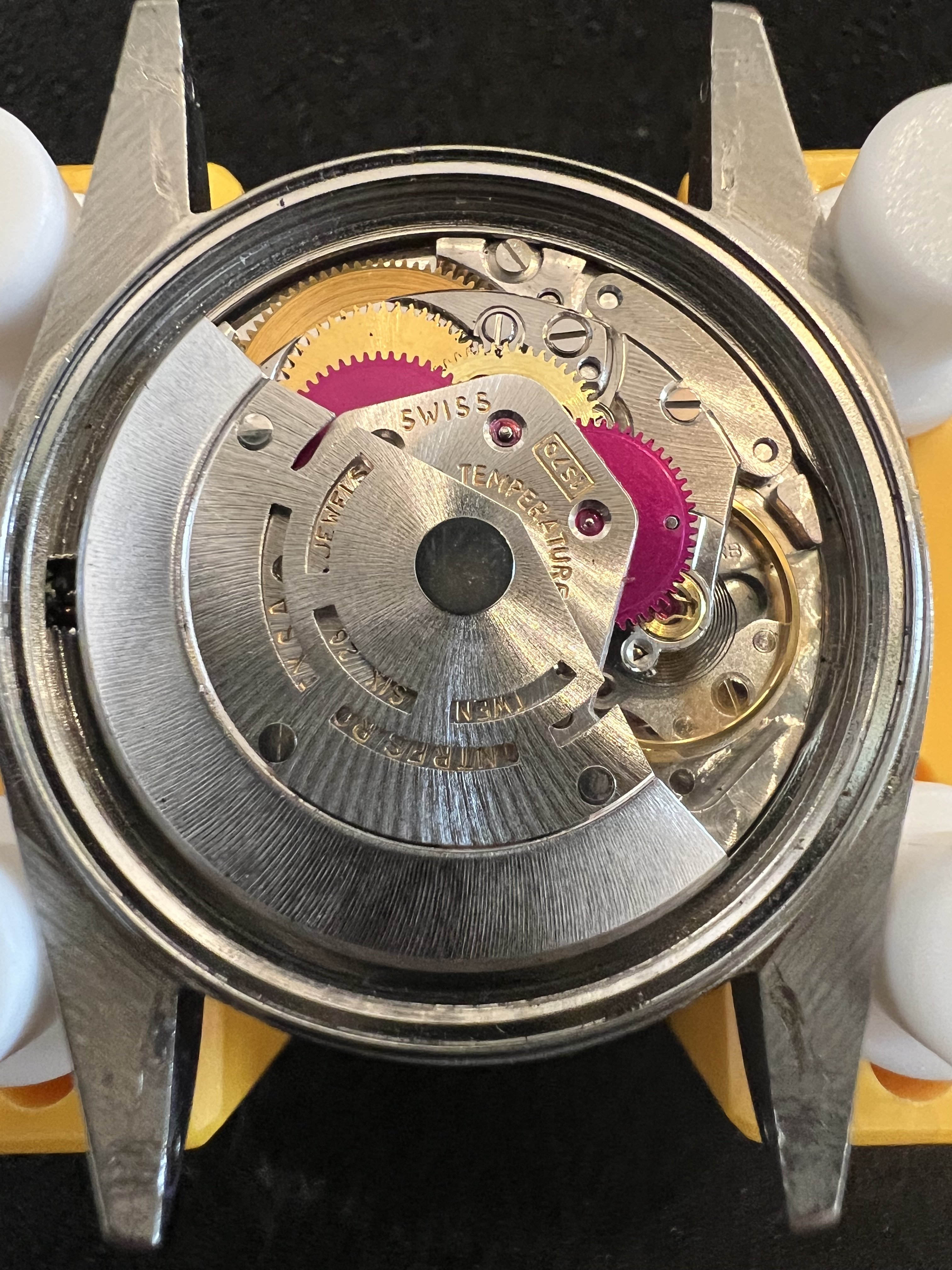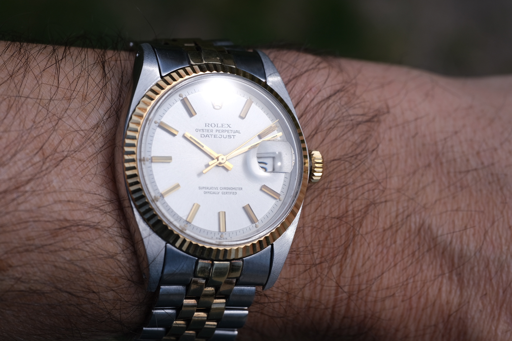 MOVEMENT: The Rolex automatic cal 1570 is working beautifully. Service history unknown but winds and sets perfectly, date changes over crisply, and keeps within about 9 seconds a day.