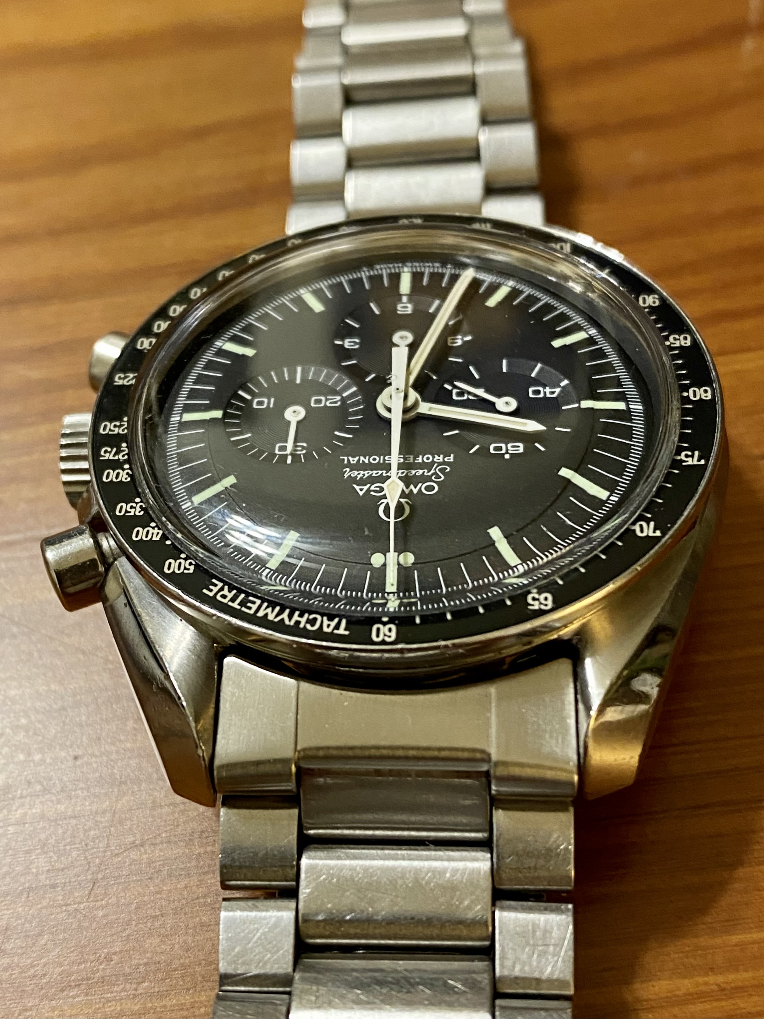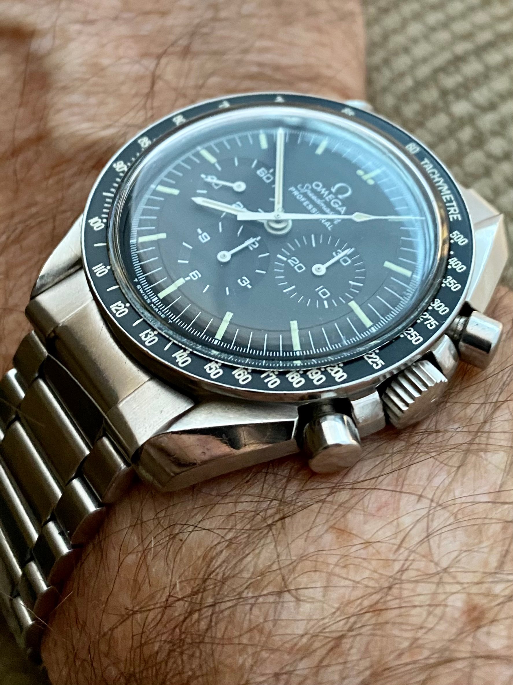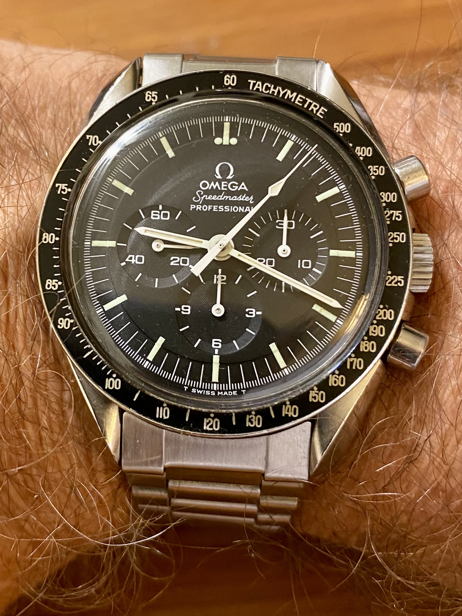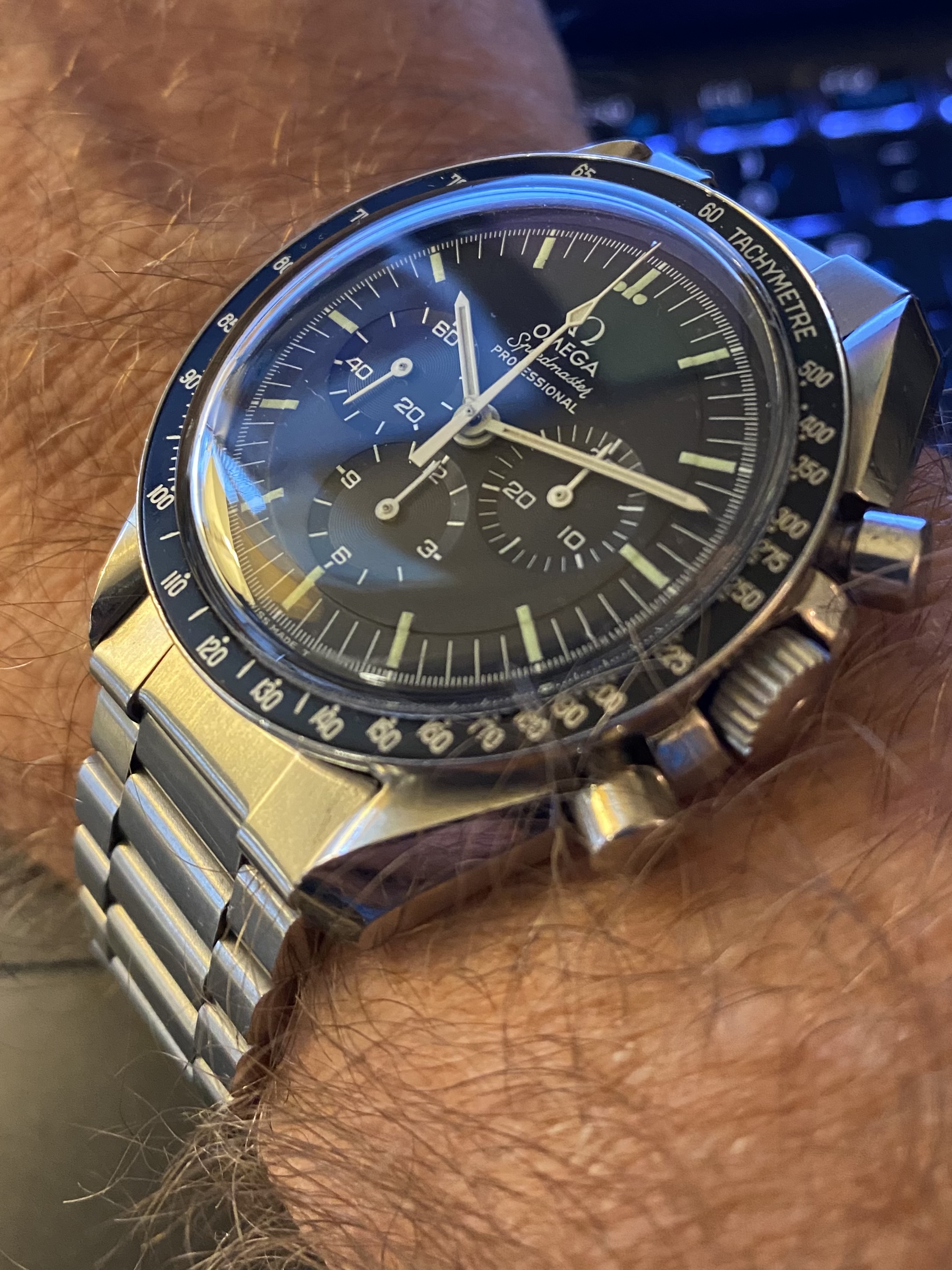 ·Good day all. Up for sale is my 1971 Speedmaster Professional. I acquired this watch in March of 2021 from one of my watchmakers. To my knowledge, it is fully original with the exception of the Omega 1175/640 flat link bracelet which I added after purchase and which is correct for this reference (the watch came with an incorrect 1171-1 service bracelet when I bought it, so the 1175/640 is a significant upgrade). I will let the photos speak for themselves, but this is the nicest example of a 1971 Speedy that I have ever seen. The case is unpolished with just a few minor scratches. The bezel is perfect as are the tritium dial and handset. Although I do not have service records, I can represent that the watch was serviced immediately prior to my purchasing it and is still under warranty through March of 2023. I can supply the warranty card. It winds up smoothly, runs well within specifications, and all chronograph functions work as they should. I am selling it only because I recently acquired a 1969 Speedmaster Straight Writing and I really don’t need two Speedies in my collection. The price is $6,000 USD. I value the watch head at $5,200 per the Speedmaster 101 price chart for a “very good” example and the 1175/640 bracelet and end links at another $800. I am throwing in free shipping and insurance worldwide as well as one of the new style Omega lacquered wooden watch boxes with cream leather interior. All in all, it’s a very nice package. Payment via Wise, bank wire transfer or PayPal F&F. No returns unless I’ve grossly misrepresented the watch’s condition - which I haven’t. 😀 I’ve been a very active member of OF since 2018 and I think that I can round up a few members who will vouch for my character without me having to pay them. You can also check my feedback under username gbesq on eBay and I can provide references from C24 as well. Please don’t be offended if I decide to ask for references from you as well. I’m happy to answer any questions, just PM me. Thanks for looking and now for the pics: