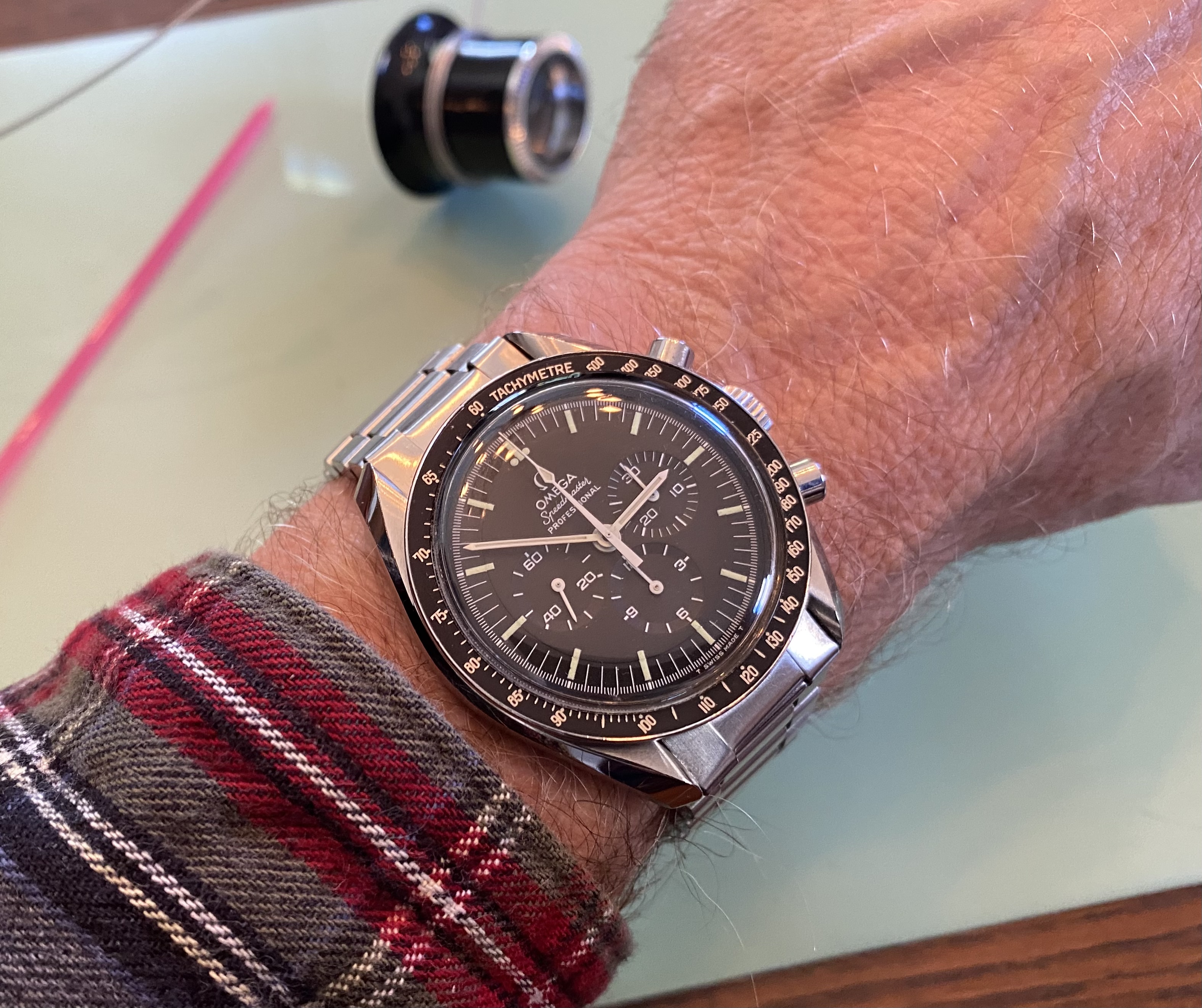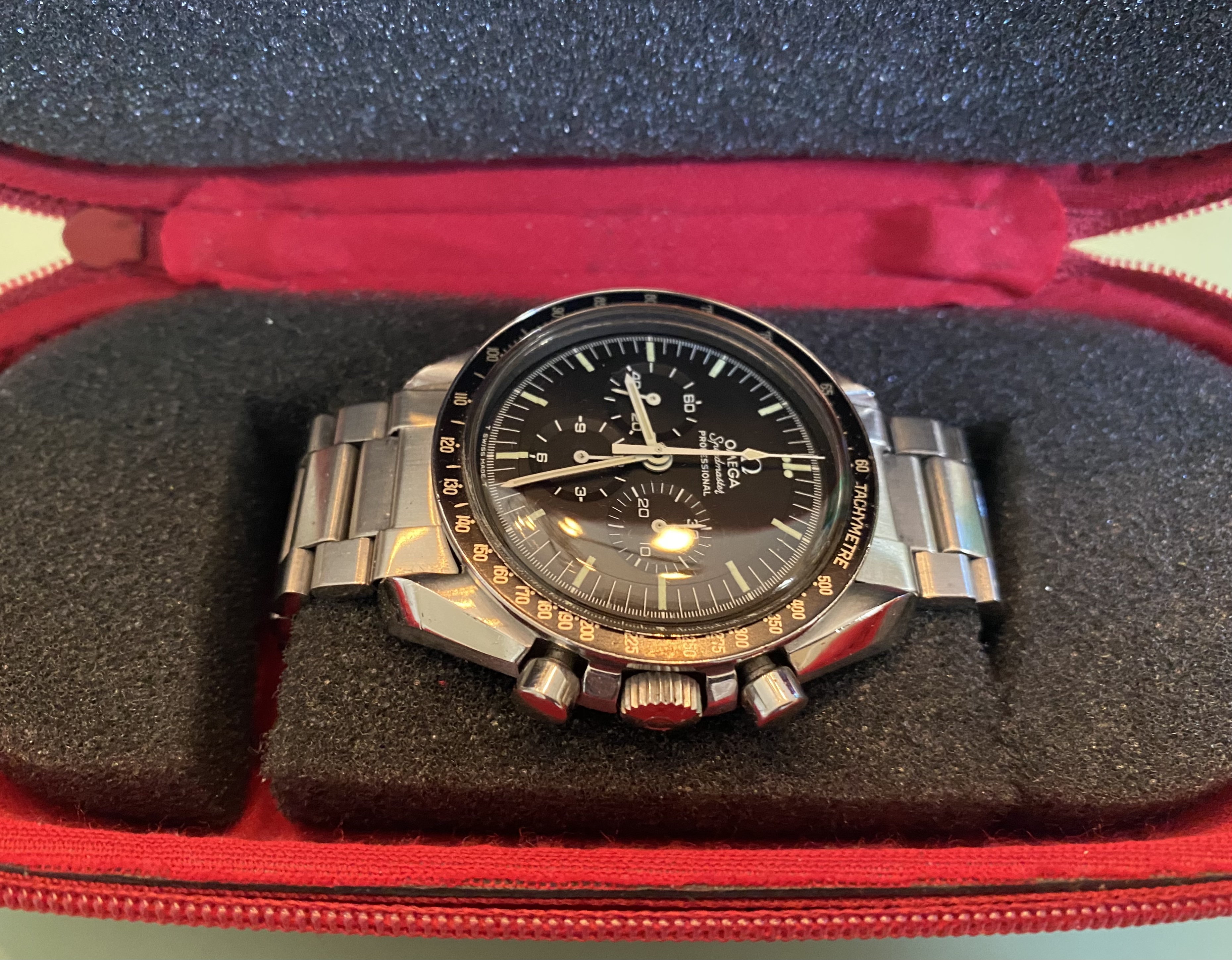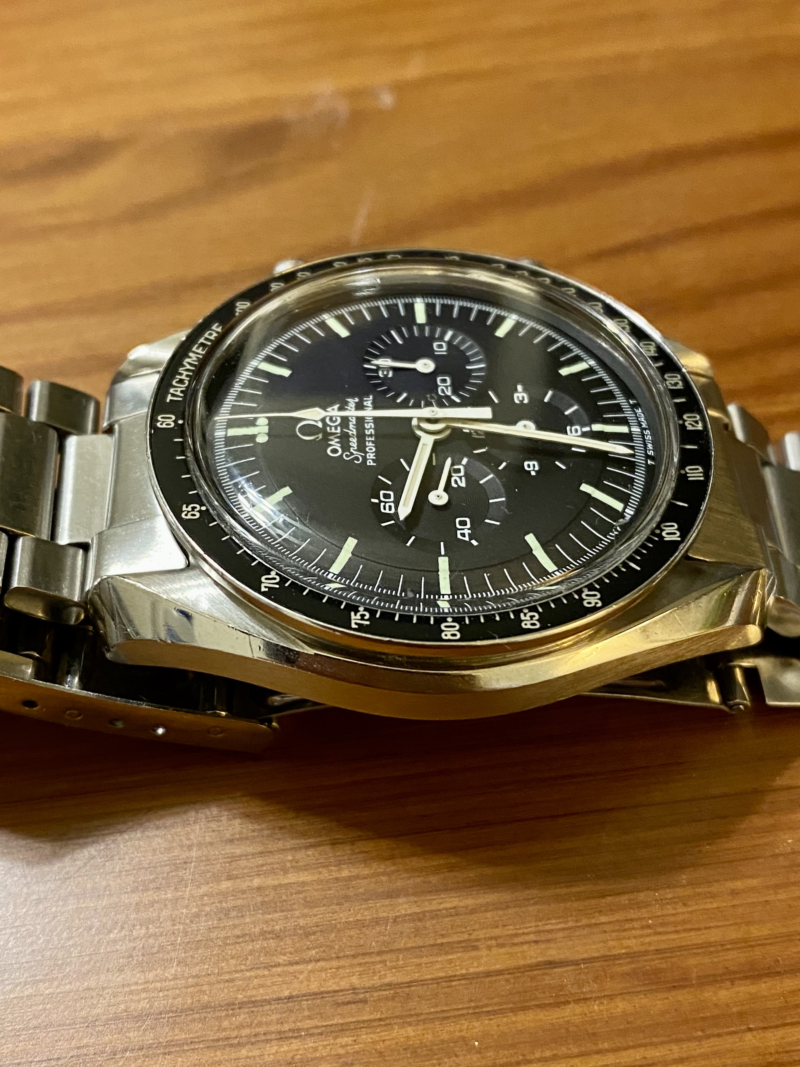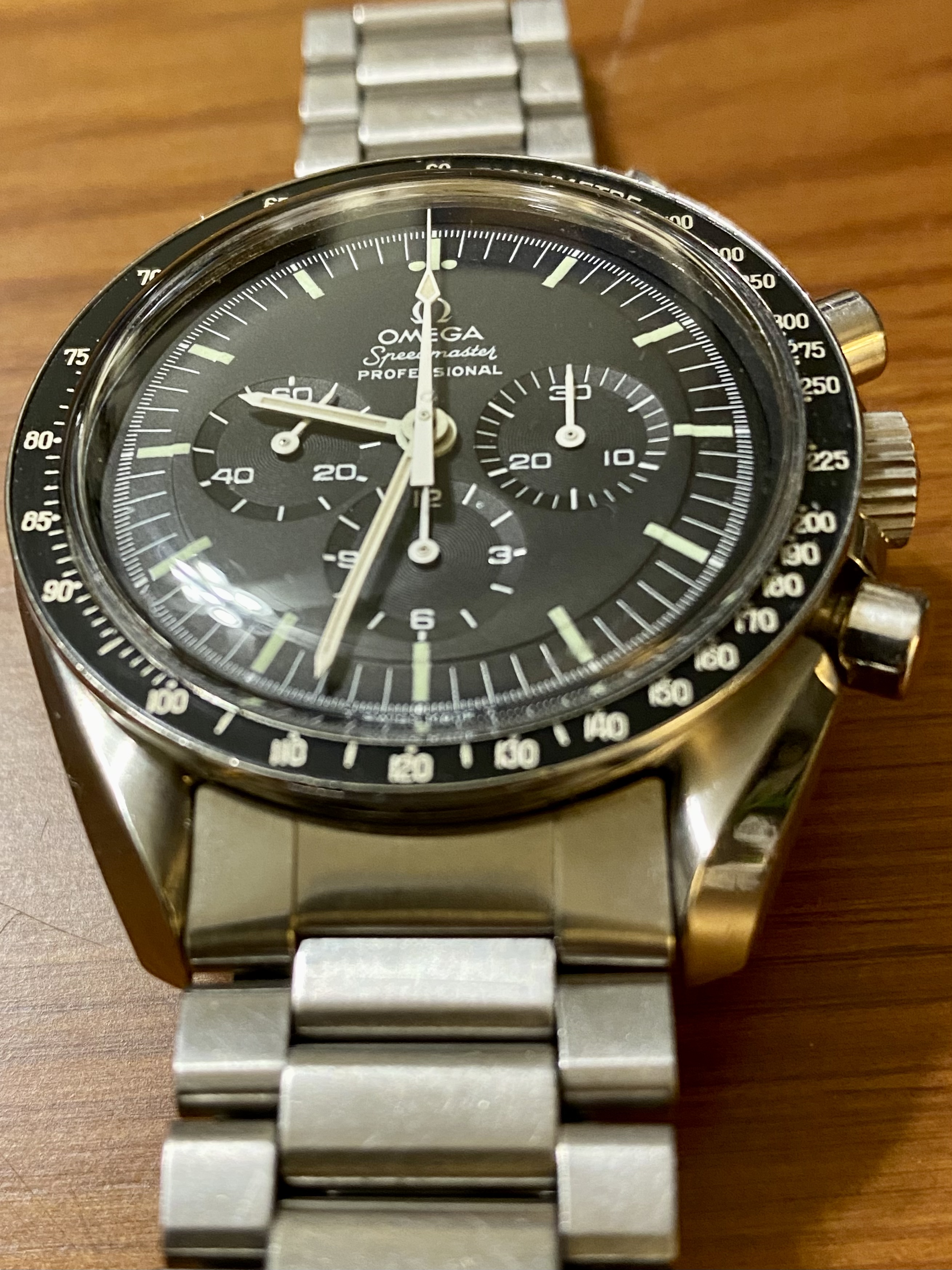 ·Good day all. Up for sale is my 1971 Speedmaster Professional. I acquired this watch in March of 2021 from one of my watchmakers. To my knowledge, it is fully original with the exception of the Omega 1175/640 flat link bracelet which I added after purchase and which is correct for this reference (the watch came with an incorrect 1171-1 service bracelet when I bought it, so the 1175/640 is a significant upgrade). I will let the photos speak for themselves, but this is the nicest example of a 1971 Speedy that I have ever seen. The case is unpolished with just a few minor scratches. The bezel is perfect as are the tritium dial and handset. Although I do not have service records, I can represent that the watch was serviced immediately prior to my purchasing it and is still under warranty through March of 2023. I can supply the warranty card. It winds up smoothly, runs well within specifications, and all chronograph functions work as they should. I am selling it only because I recently acquired a 1969 Speedmaster Straight Writing and I really don’t need two Speedies in my collection. The price is $6,000 USD. I value the watch head at $5,200 per the Speedmaster 101 price chart for a “very good” example and the 1175/640 bracelet and end links at another $800. I am throwing in free shipping and insurance worldwide as well as one of the new style Omega lacquered wooden watch boxes with cream leather interior. All in all, it’s a very nice package. Payment via Wise, bank wire transfer or PayPal F&F. No returns unless I’ve grossly misrepresented the watch’s condition - which I haven’t. 😀 I’ve been a very active member of OF since 2018 and I think that I can round up a few members who will vouch for my character without me having to pay them. You can also check my feedback under username gbesq on eBay and I can provide references from C24 as well. Please don’t be offended if I decide to ask for references from you as well. I’m happy to answer any questions, just PM me. Thanks for looking and now for the pics: