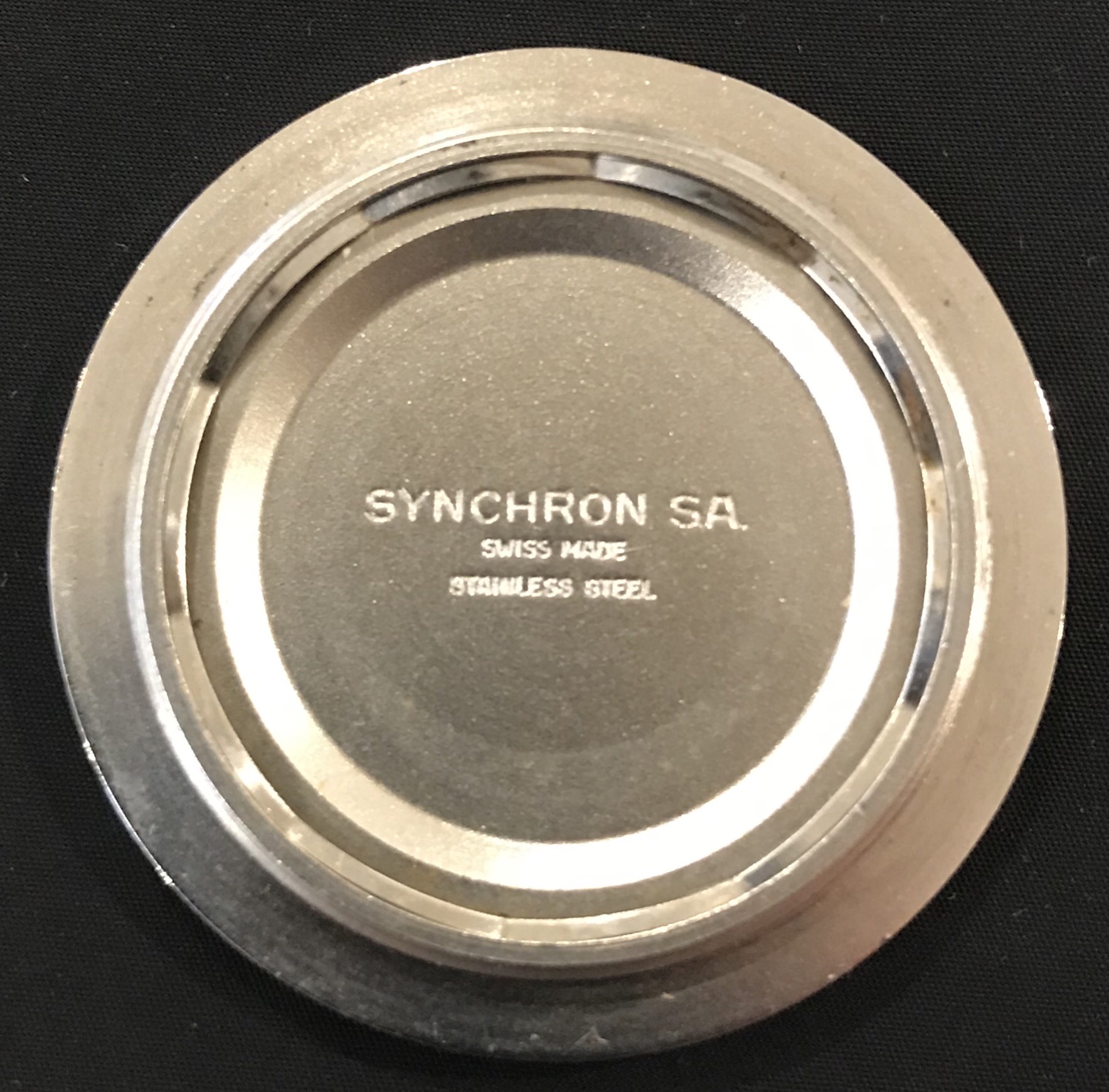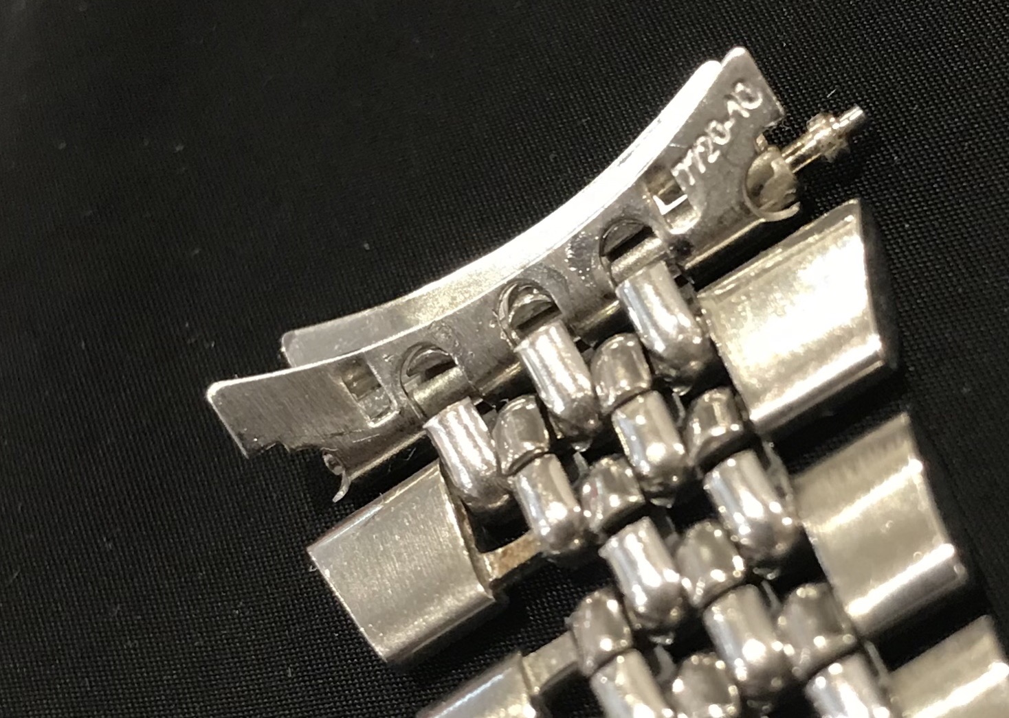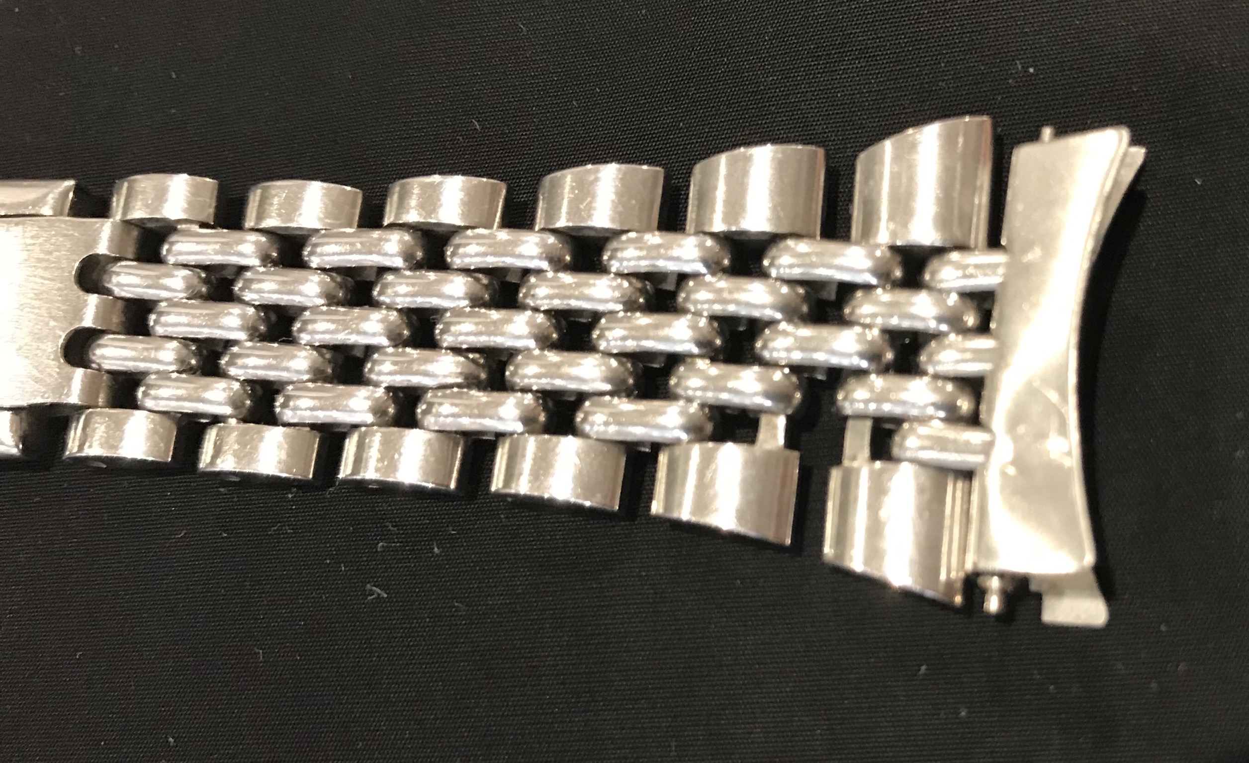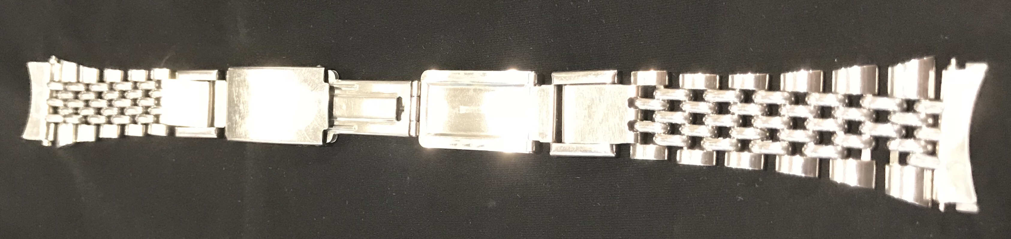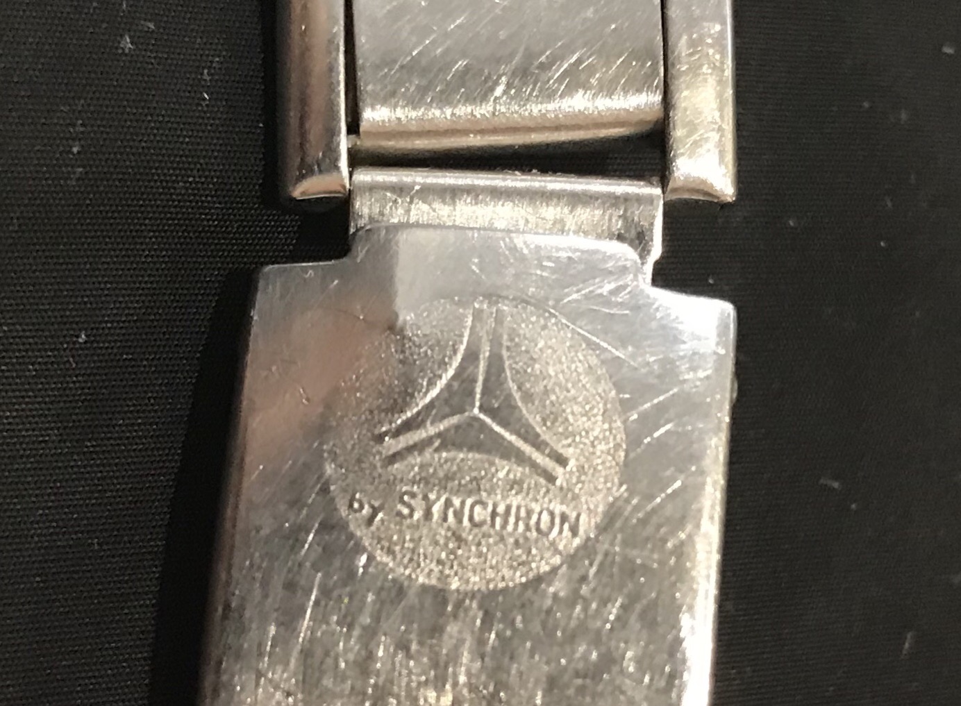 Rare original bracelet with dive extensions and “by Synchron” circle logo on clasp. One center link near endlink is missing (see photo) but easily replaceable by any competent jeweler (simply a stainless oval ring). Max stretch shown in pics.