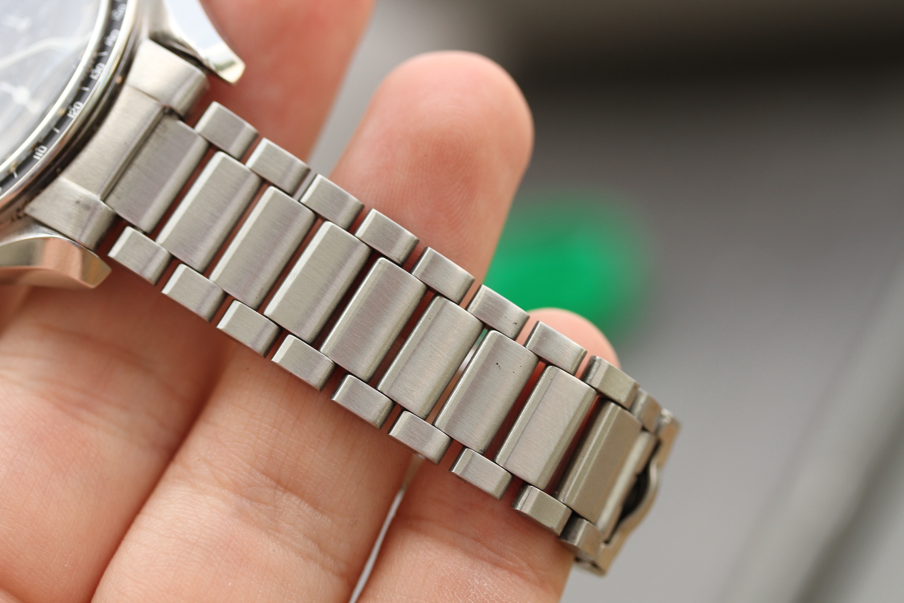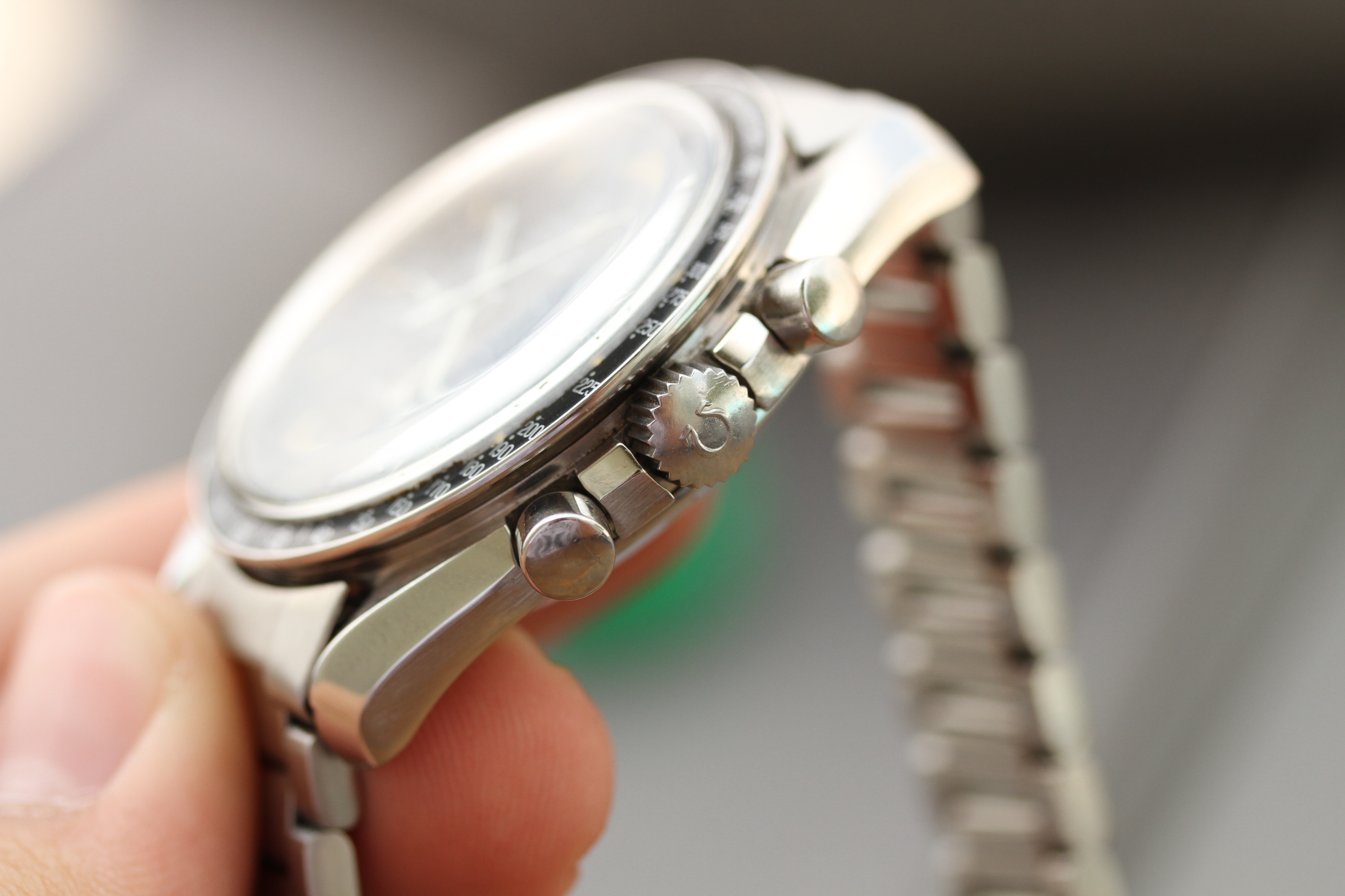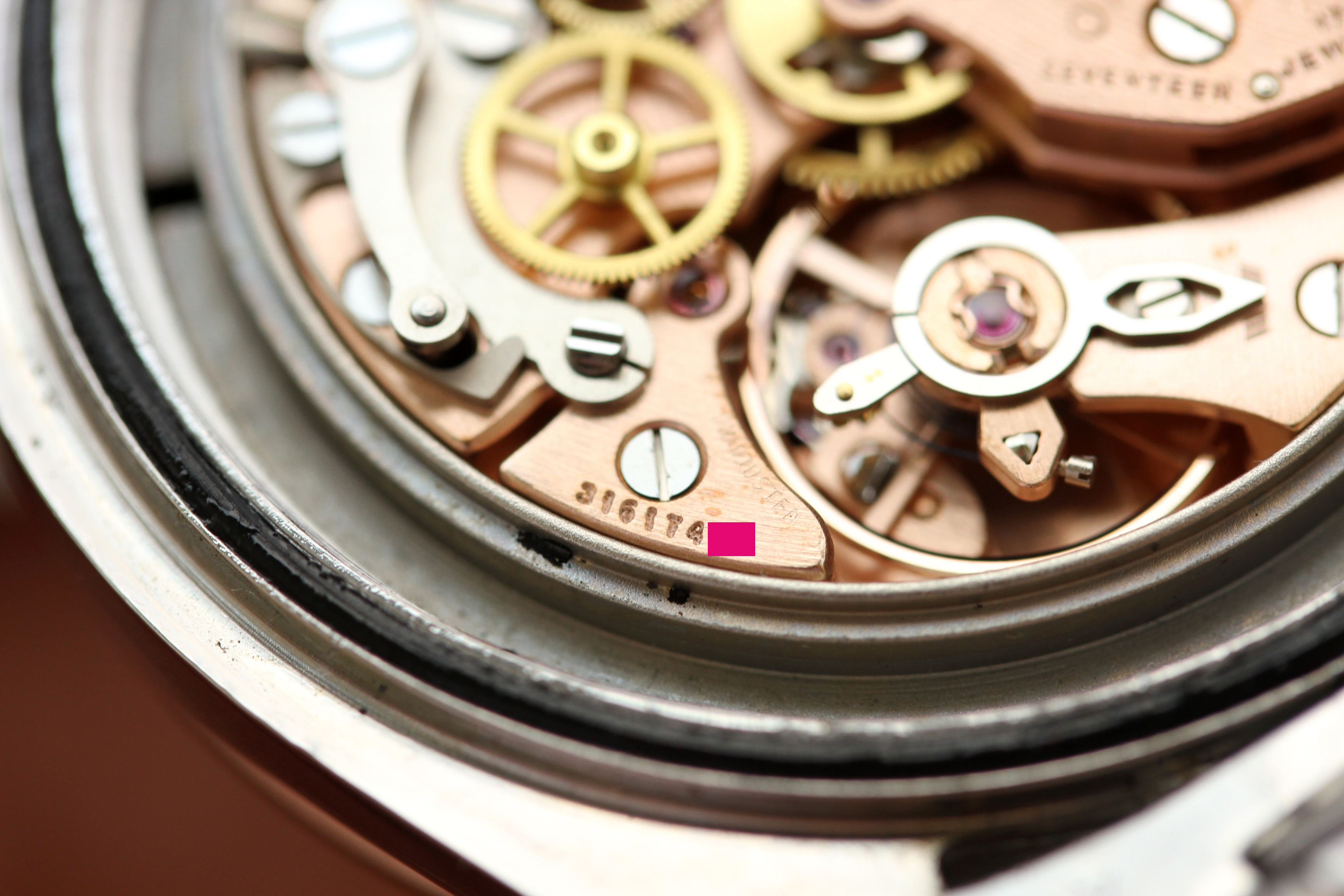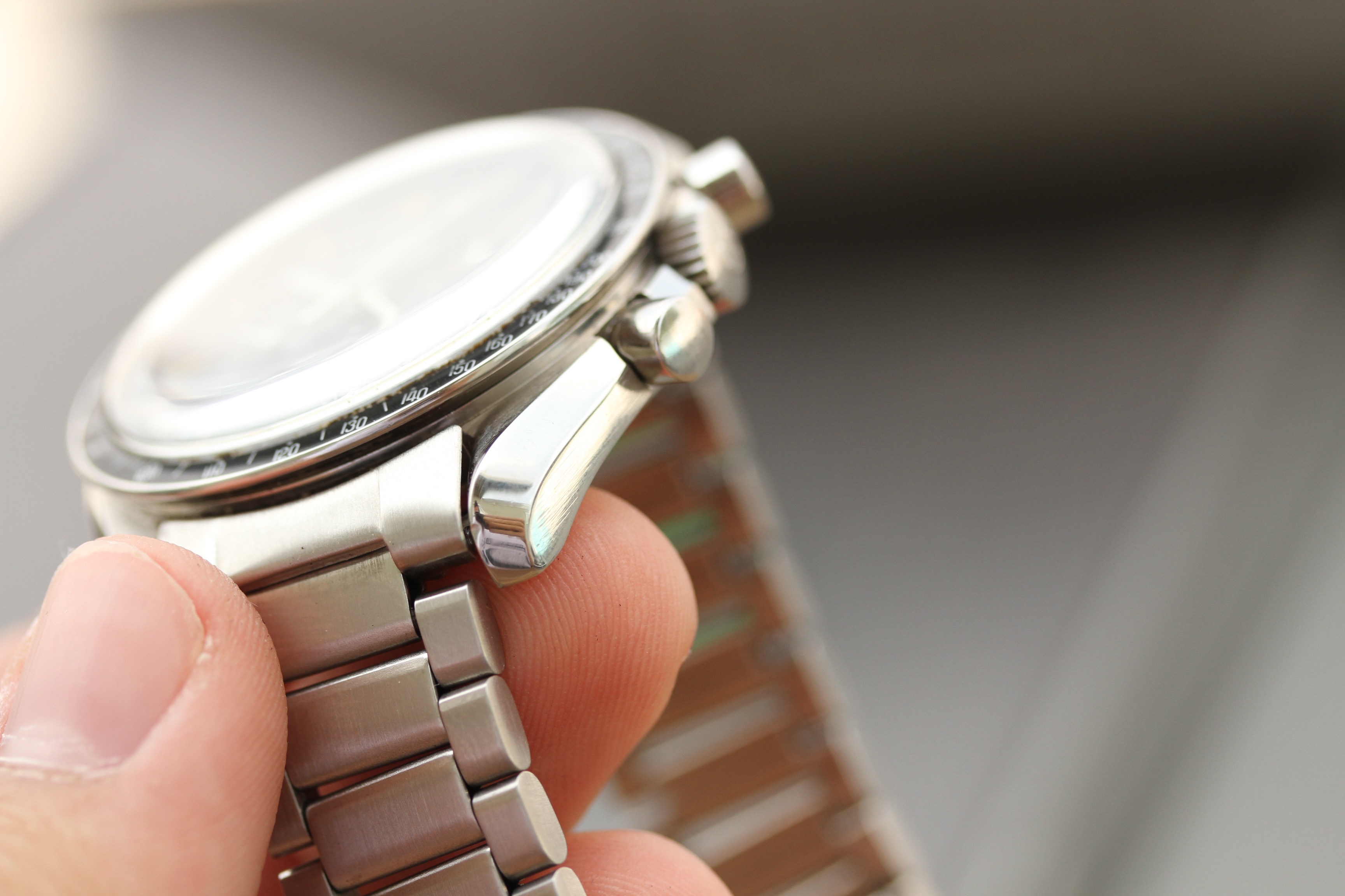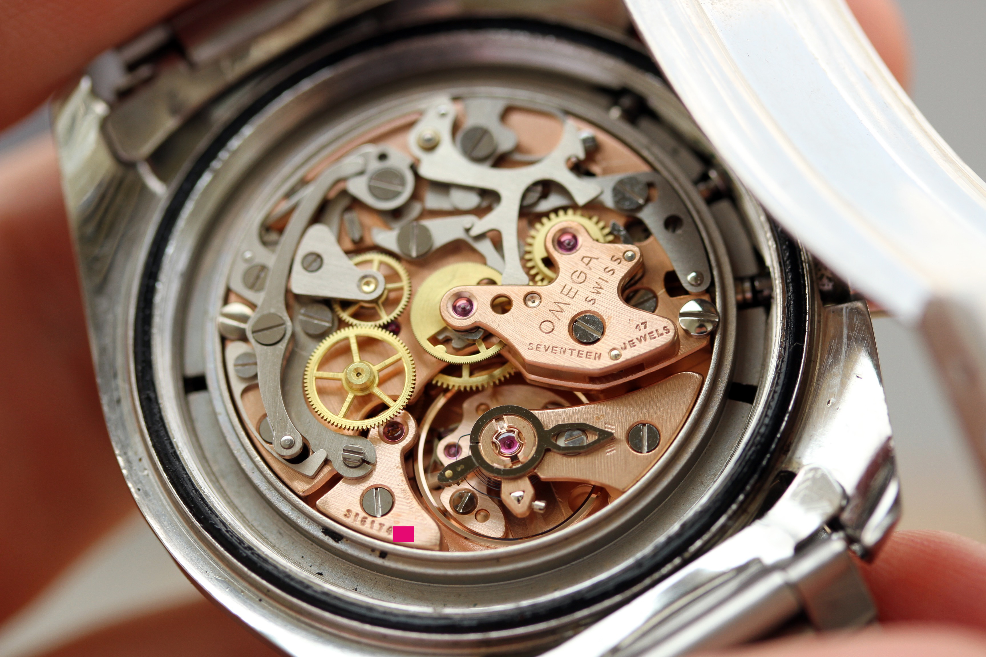 The caseback appears to have service marks from 2014. Watch runs well, winds smoohtly, and chrono operates as it should. Timekeeping is within COSC currently.