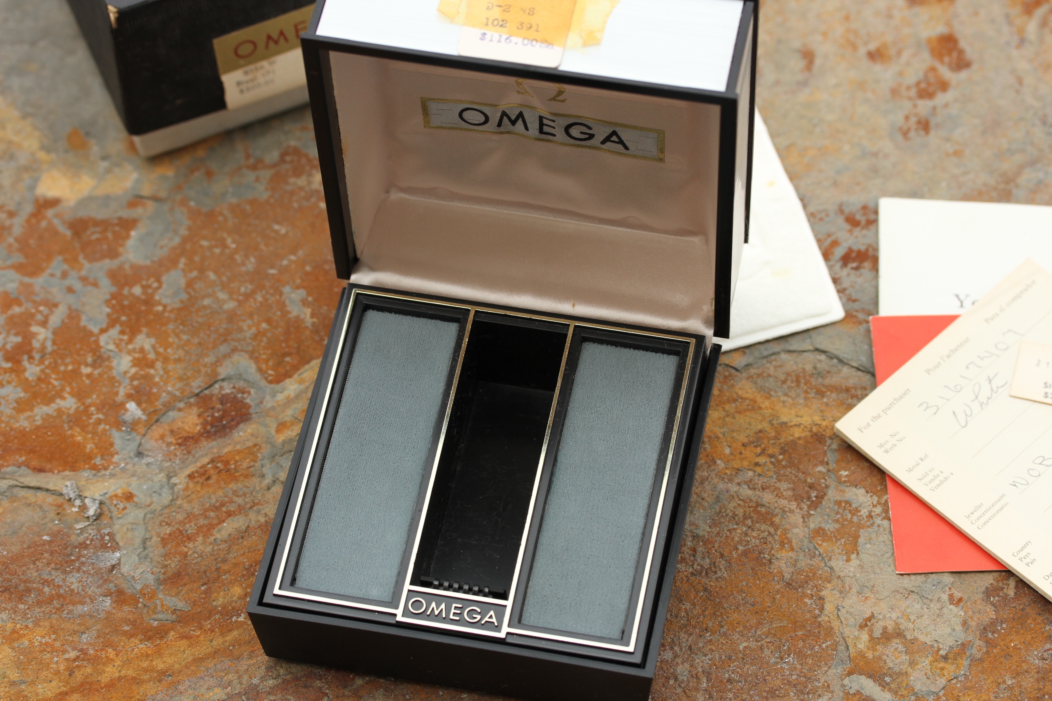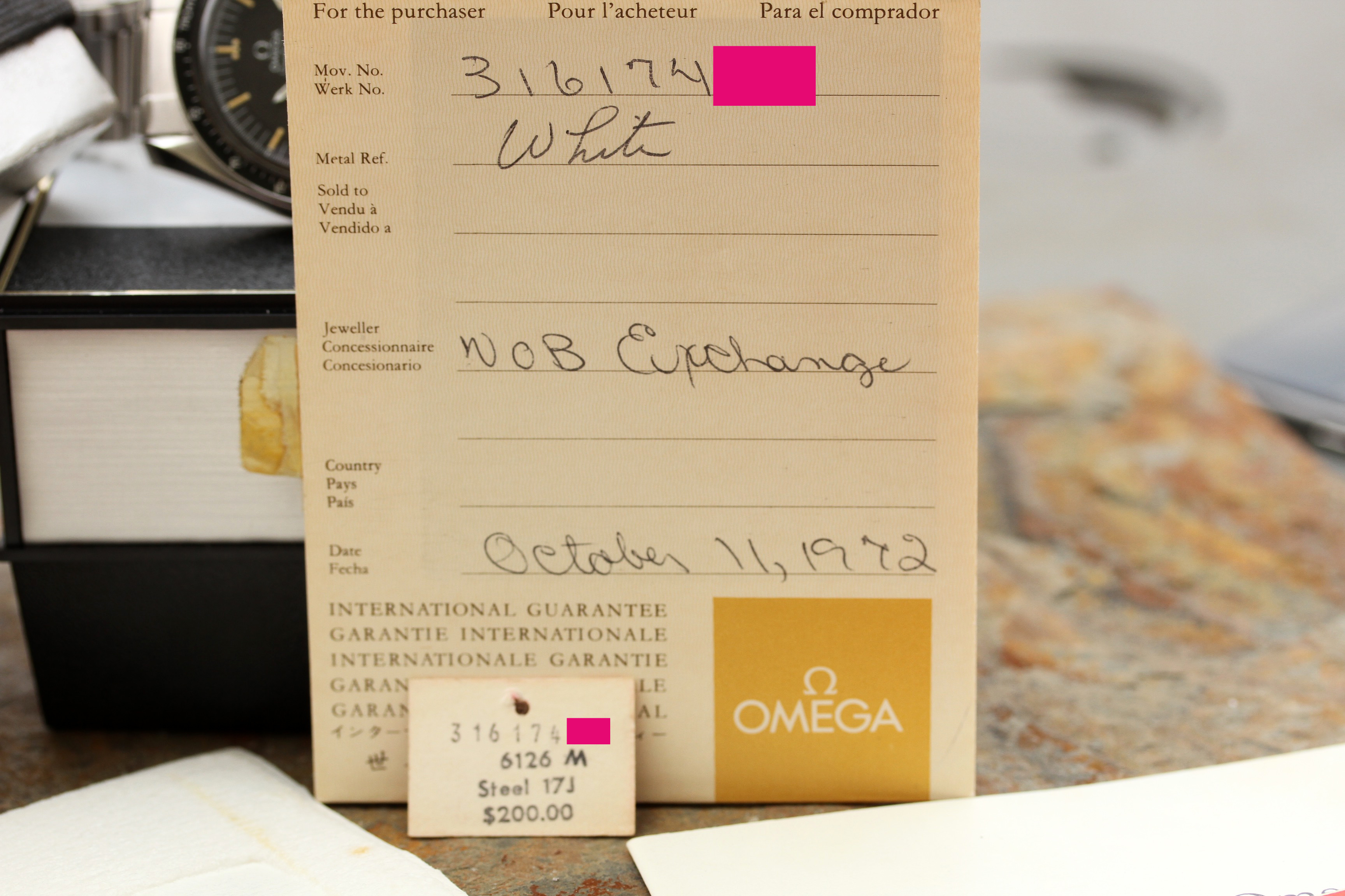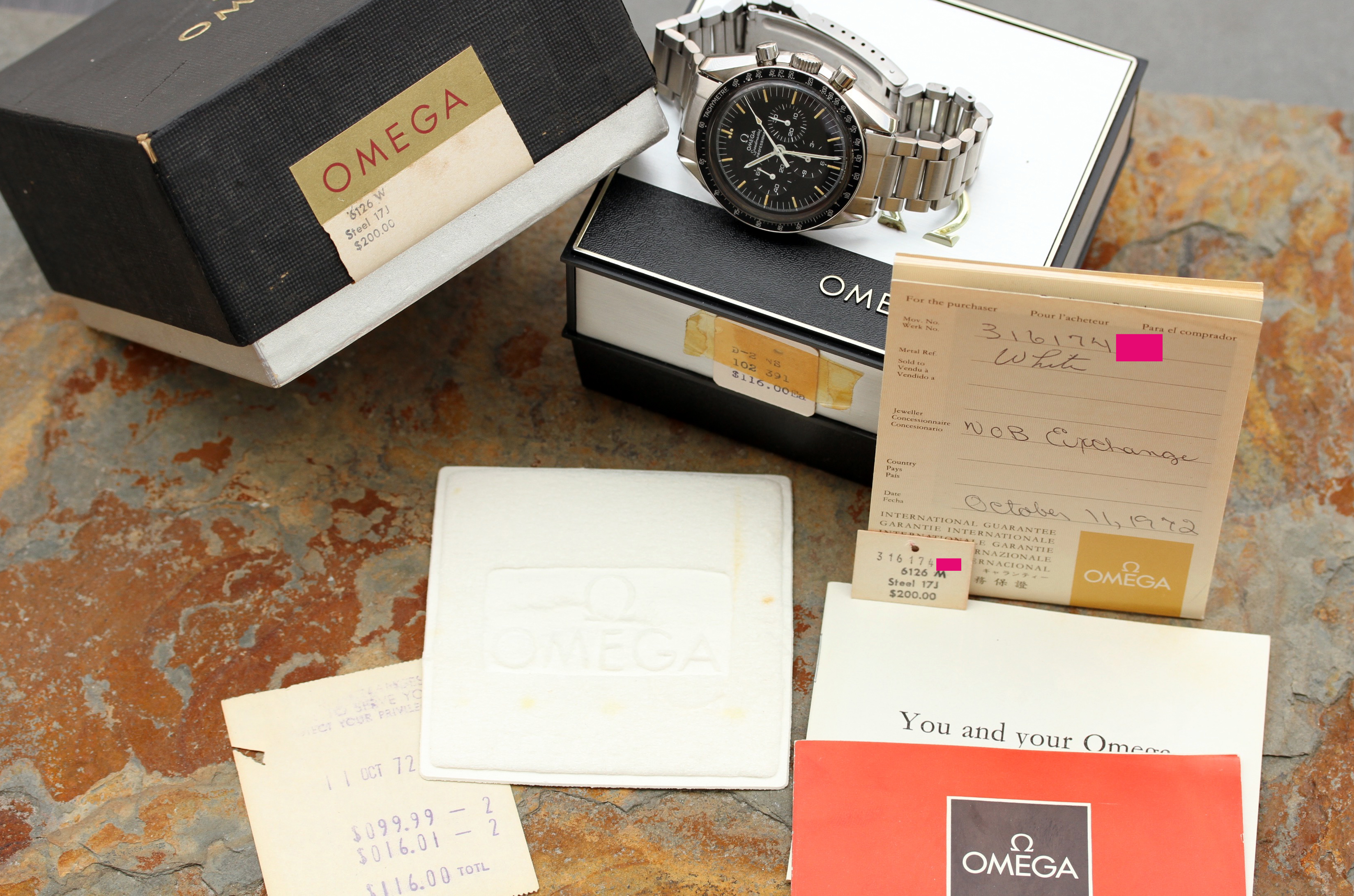 This watch comes from original owner who purchased it in 1972 at NOB (Norfolk Operations Base) Exchange, local to me. Original boxes (inner box is missing the watch cuff), manuals, warranty papers, even the sales receipt and matching price tag were all kept together for almost 43 years.