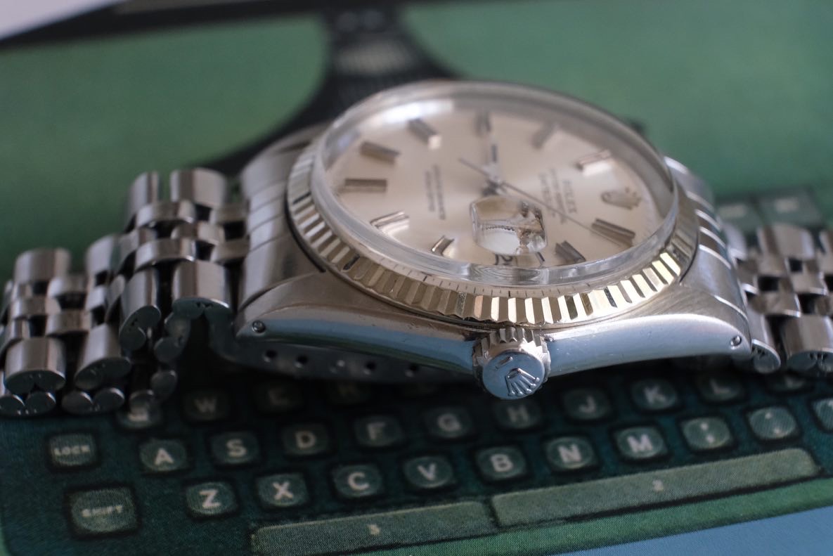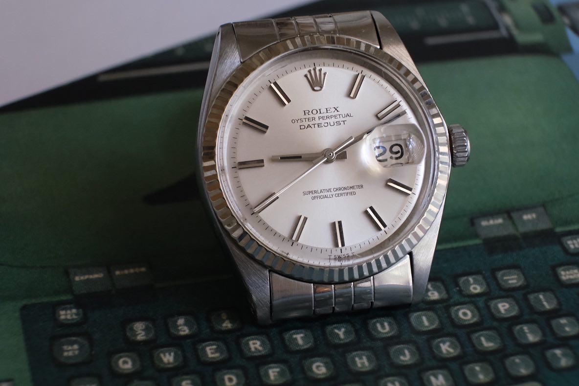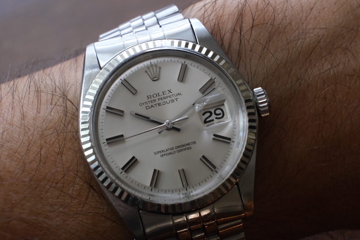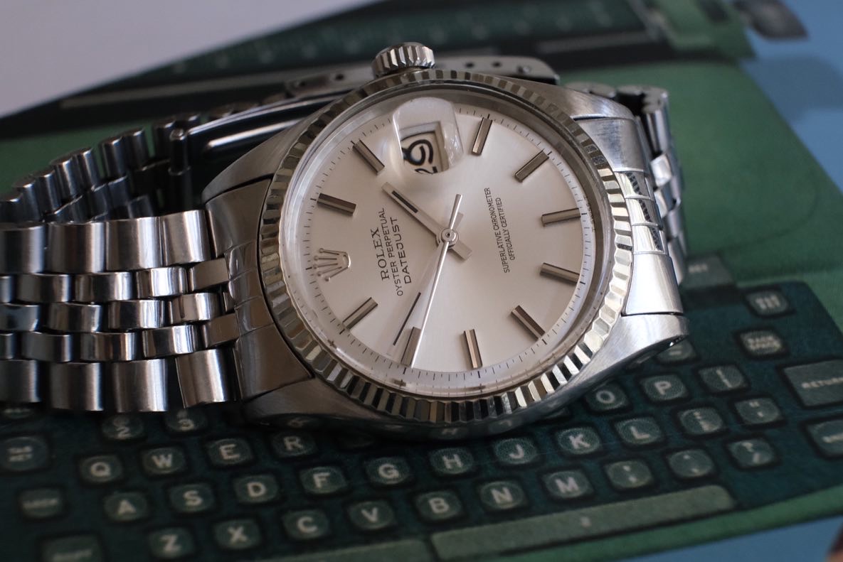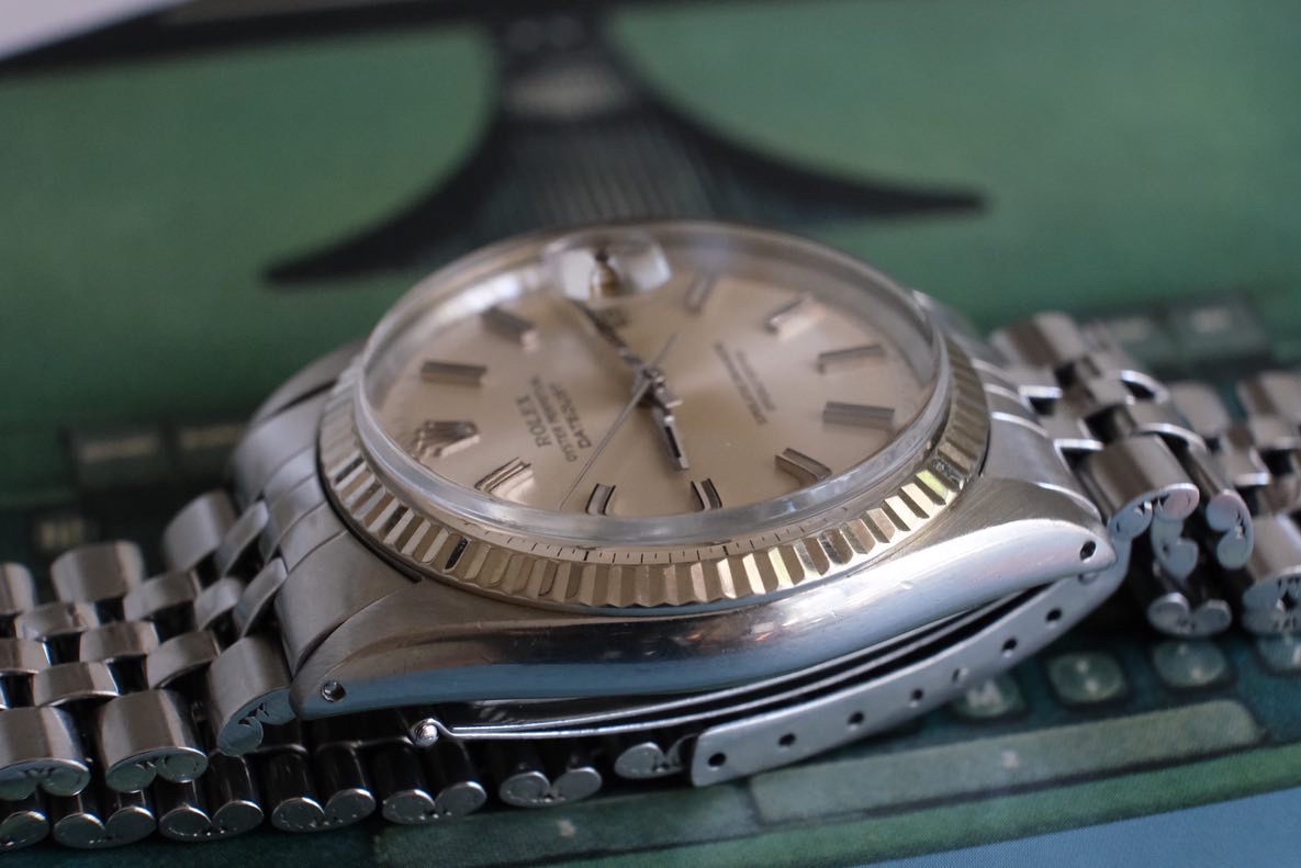 ·This is such a beauty, a 1972 Rolex Datejust, reference 1601. This has the lesser seen no lume dial that instead has onyx on the markers and hands. That and the classic datejust pie pan dial = a really stunning combo!