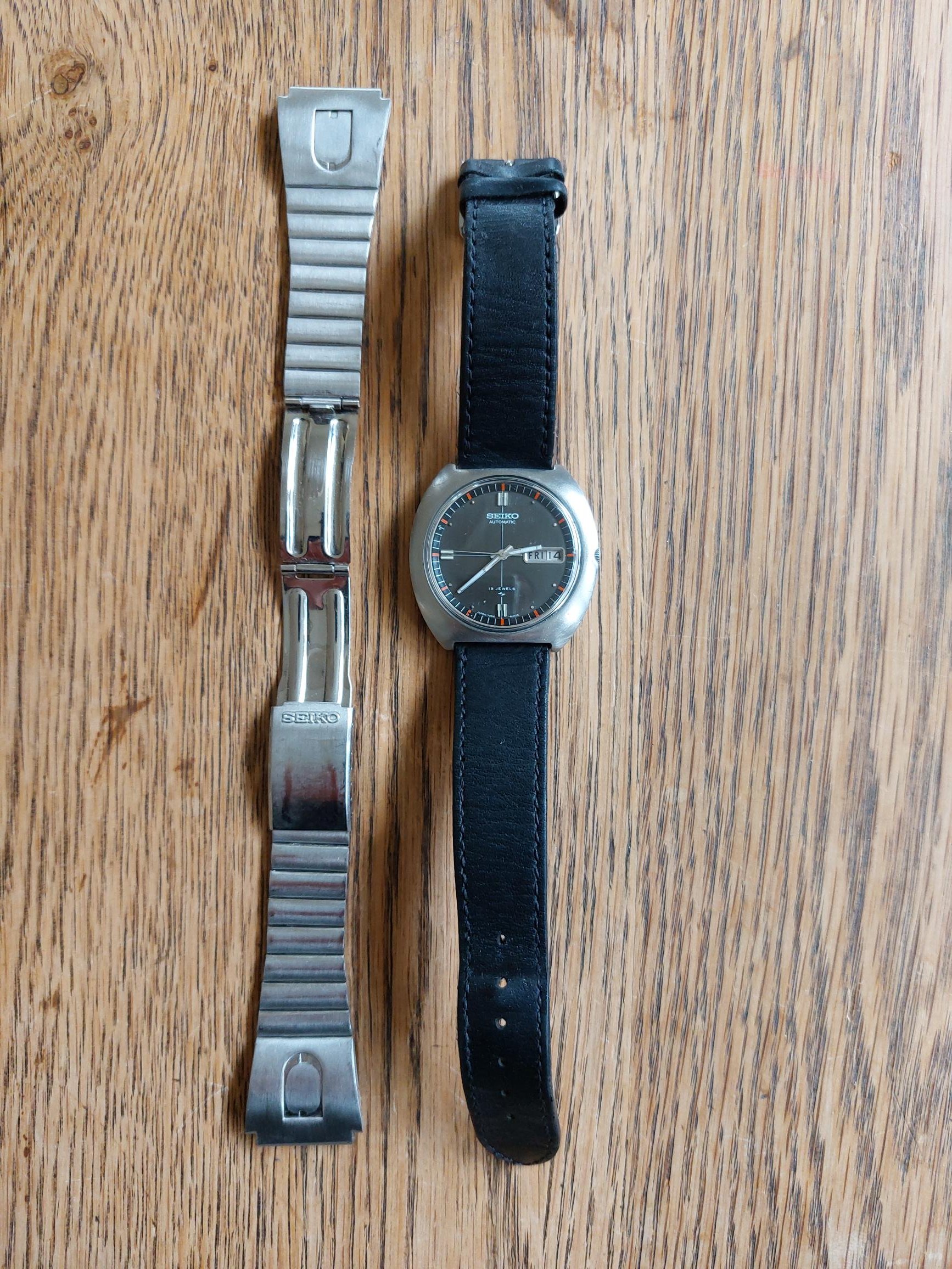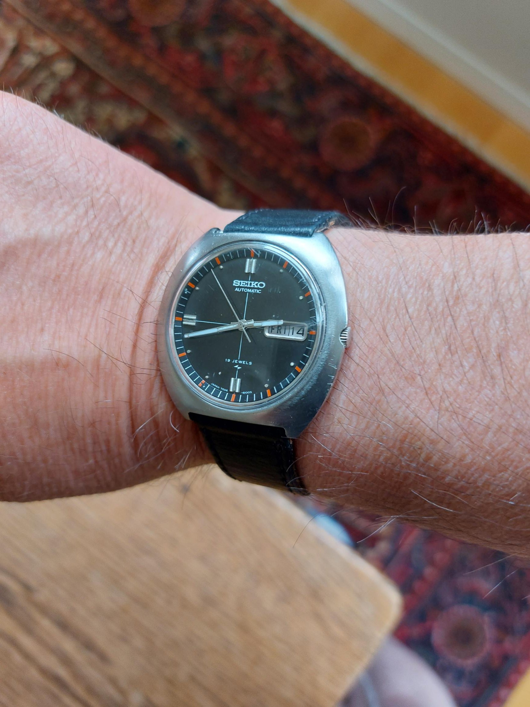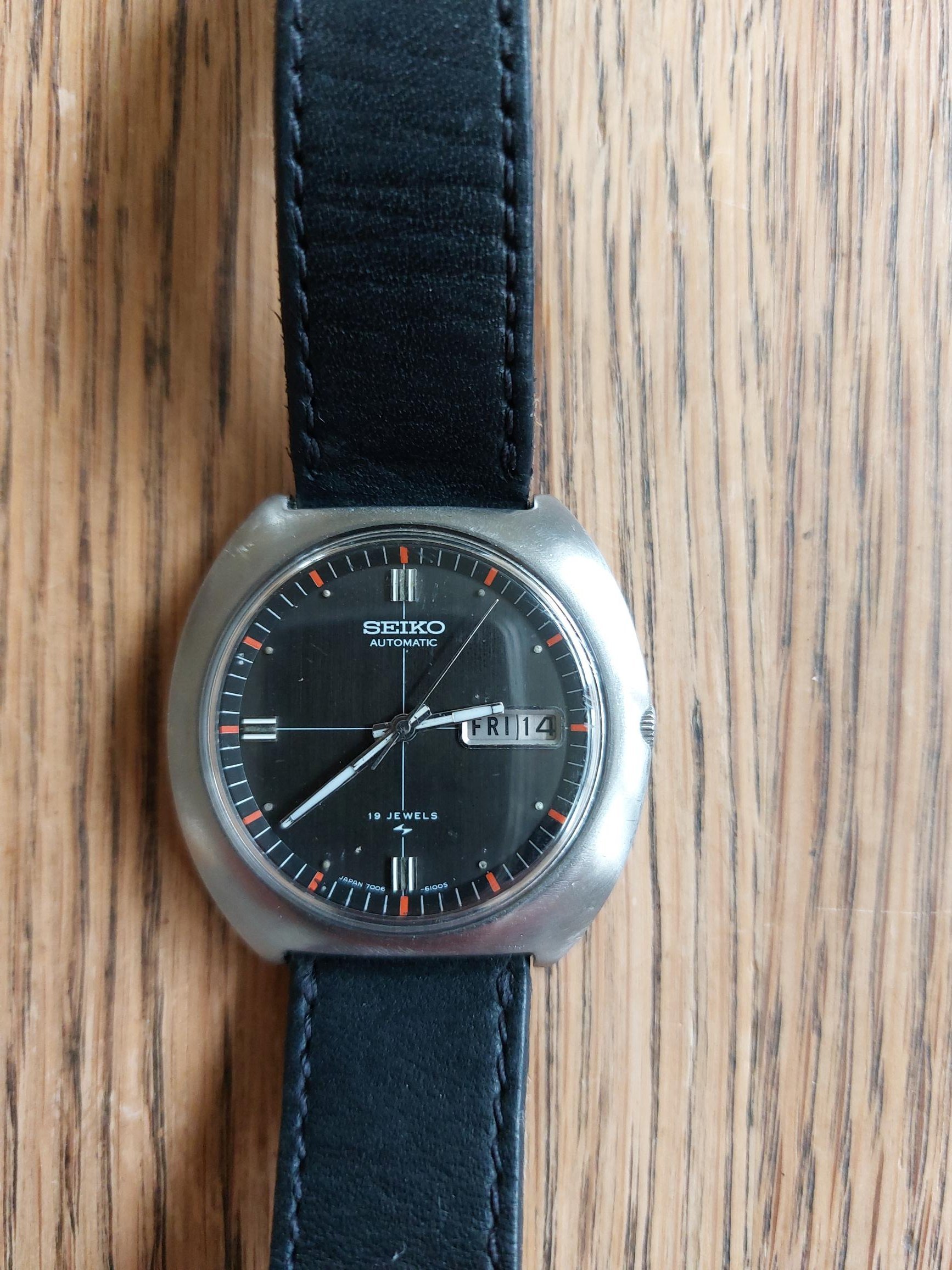 Offering here a clean black dialed 7006-6010 - IMO having a fun 1970s groove without going over the top. Simply clearing out to many watches. Full service by Jerry at Jerry's Watch Repair in Seattle. I had him replace the faceted crystal with a standard Seiko crystal - I found the facets to be too much and made it hard to fully appreciate the dial (unfortunately, the faceted crystal has disappeared). 39mm diameter side to side not including crown. The dial is interesting, with different presentations in different aspects - sometimes glossy, with very slight vertical striations. Also, the red chapter markers are great. Fun detail of thumbnail chamfer at crown, enabling crown to be partially recessed. Hands relumed. Made in June 1972 (per the seiko serial calculator) at the Daini factory. Running like a champ. The day advances using the forward wind/midnight technique; the date advances with the crown in 2nd position winding backward. Includes existing black leather band as well as cool stainless original band. Please consider photos to be part of description. $300 US plus shipping, in US - you would be getting the watch for the cost of the service.