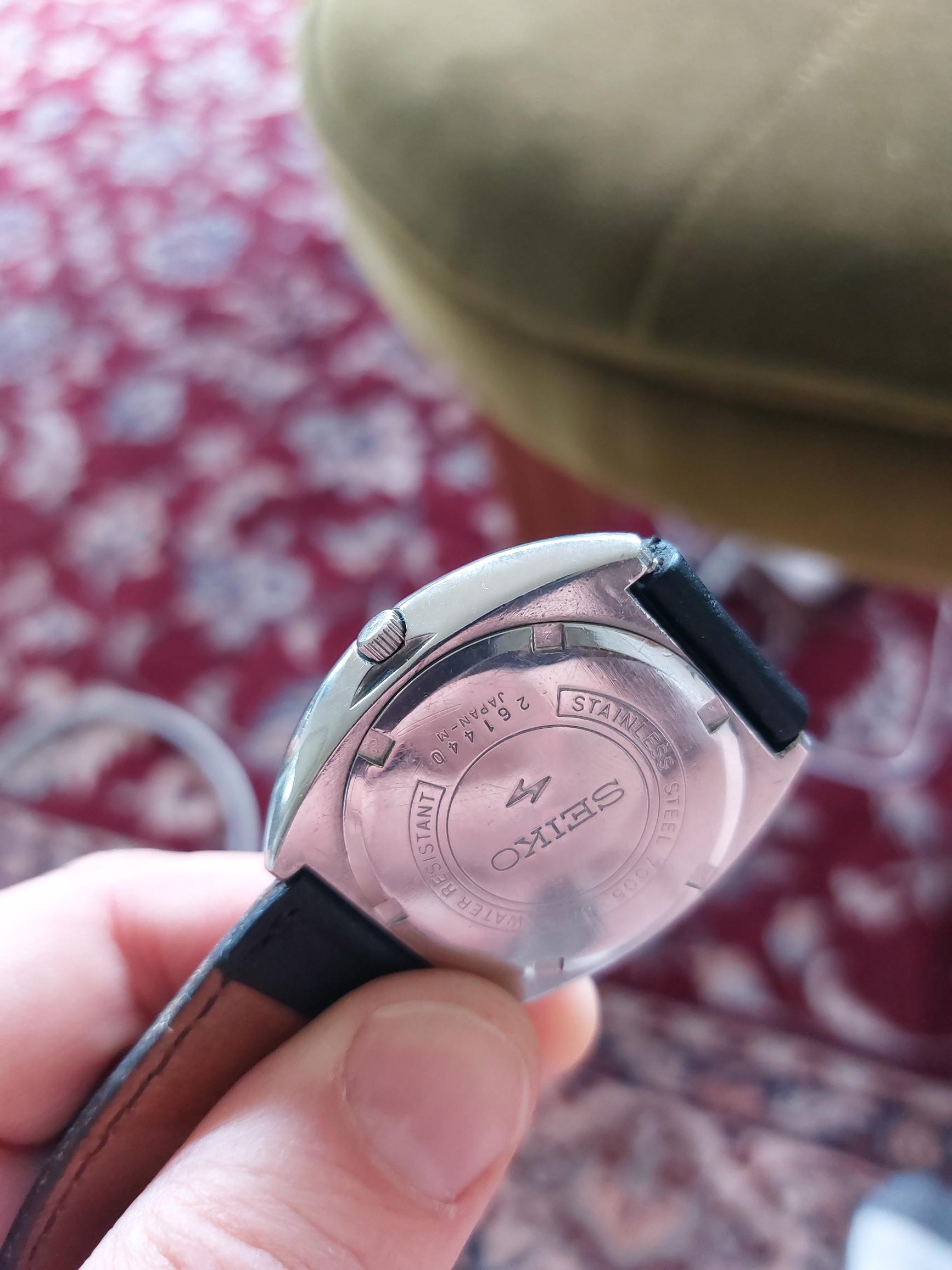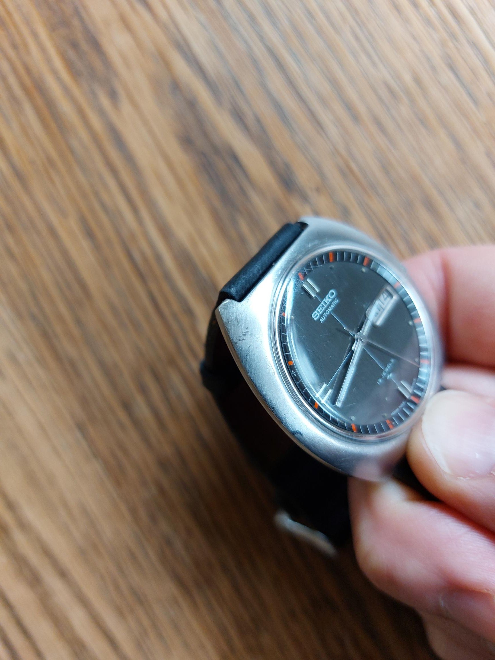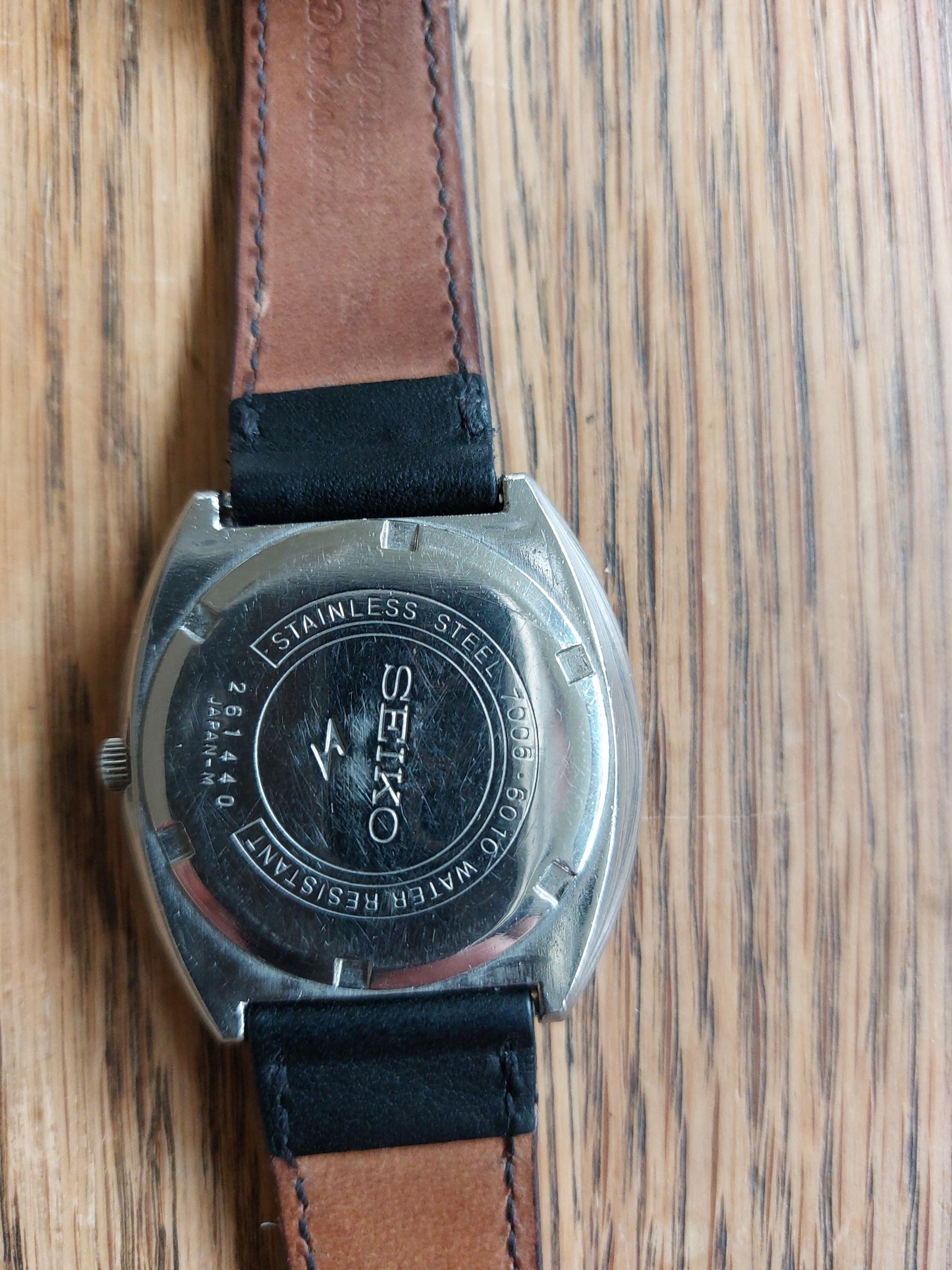 Offering here a clean black dialed 7006-6010 - IMO having a fun 1970s groove without going over the top. Simply clearing out to many watches. Full service by Jerry at Jerry's Watch Repair in Seattle. I had him replace the faceted crystal with a standard Seiko crystal - I found the facets to be too much and made it hard to fully appreciate the dial (unfortunately, the faceted crystal has disappeared). 39mm diameter side to side not including crown. The dial is interesting, with different presentations in different aspects - sometimes glossy, with very slight vertical striations. Also, the red chapter markers are great. Fun detail of thumbnail chamfer at crown, enabling crown to be partially recessed. Hands relumed. Made in June 1972 (per the seiko serial calculator) at the Daini factory. Running like a champ. The day advances using the forward wind/midnight technique; the date advances with the crown in 2nd position winding backward. Includes existing black leather band as well as cool stainless original band. Please consider photos to be part of description. $300 US plus shipping, in US - you would be getting the watch for the cost of the service.