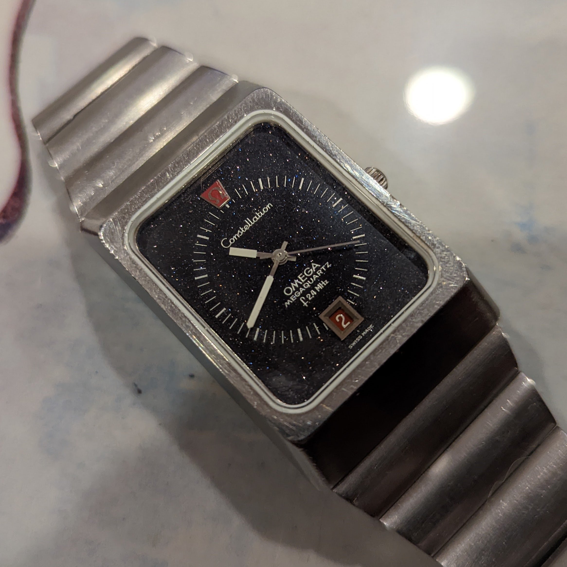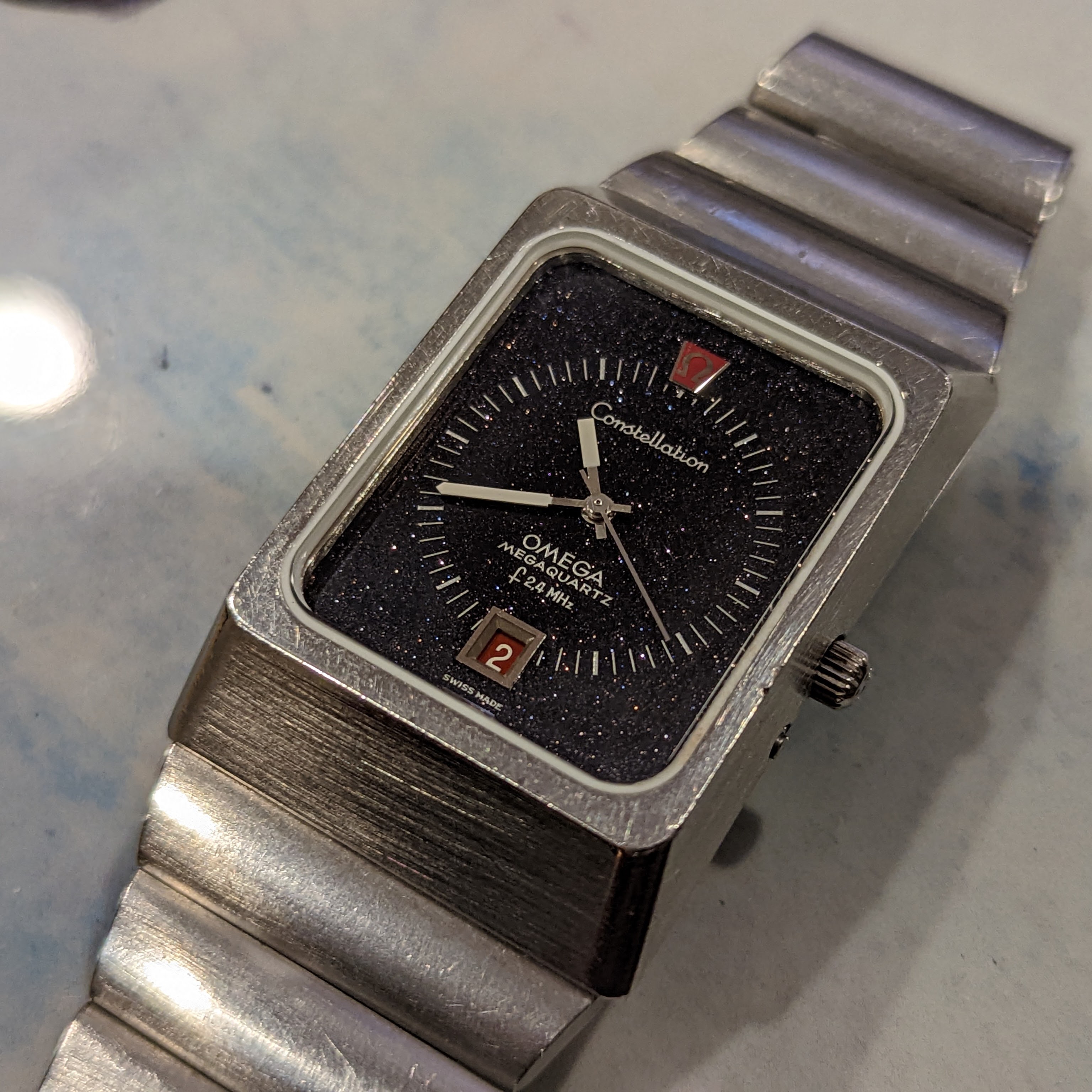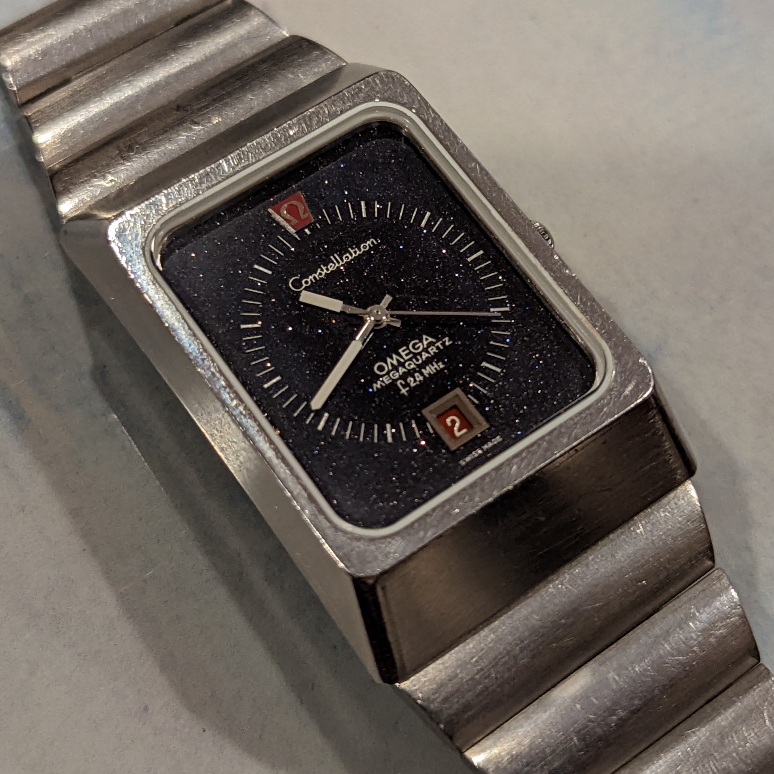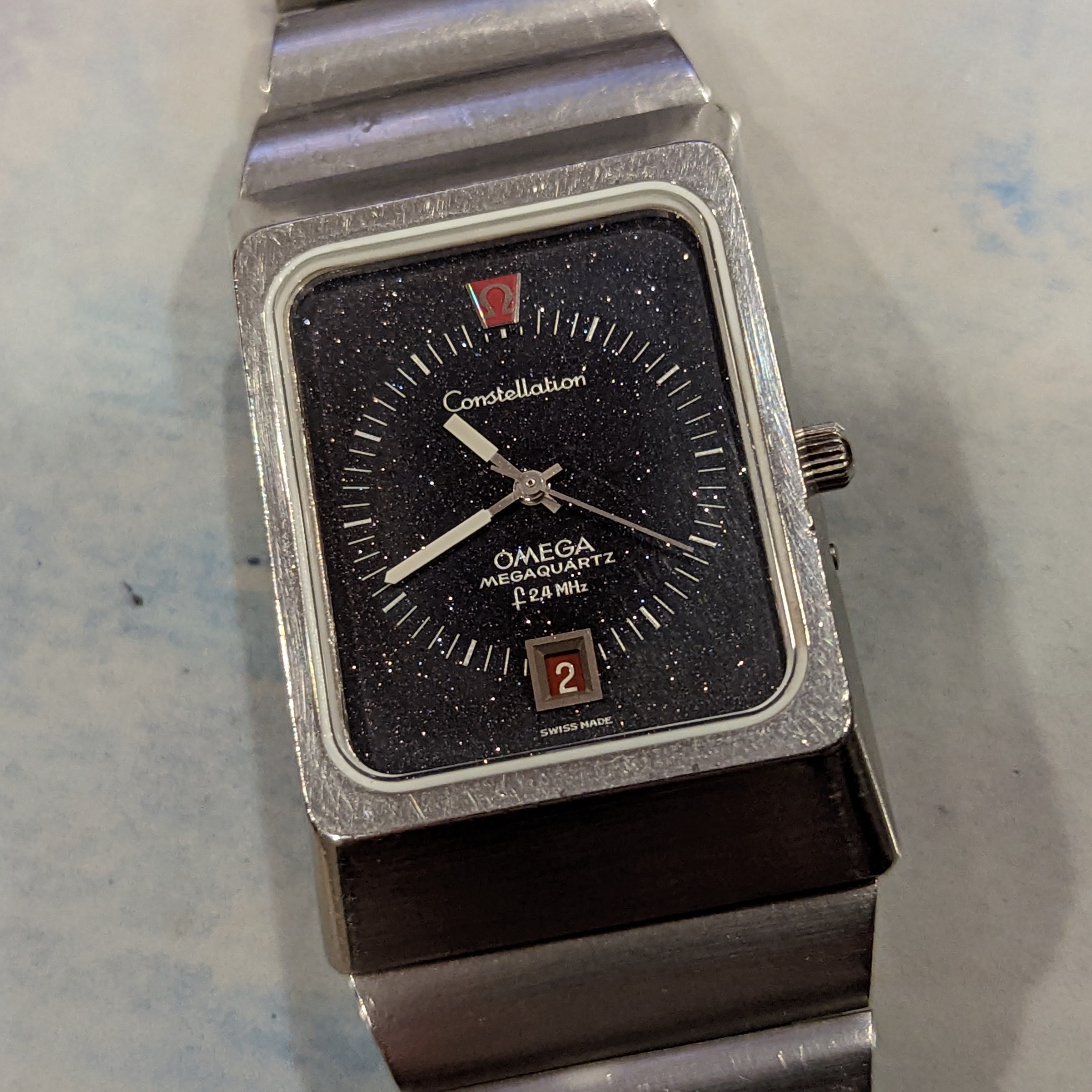 For sale is my 1973 Omega Constellation f2.4 mhz Aventurine Stardust. It features the cal. 1510, the most accurate non-thermocompensated quartz movement ever made. This one is in great condition. It had the crystal and gaskets replaced by Omega in 2018. It has the full length original bracelet. It's running great, keeping nearly perfect time. Rare for this model, the dial has no cracks. It's an all original survivor!