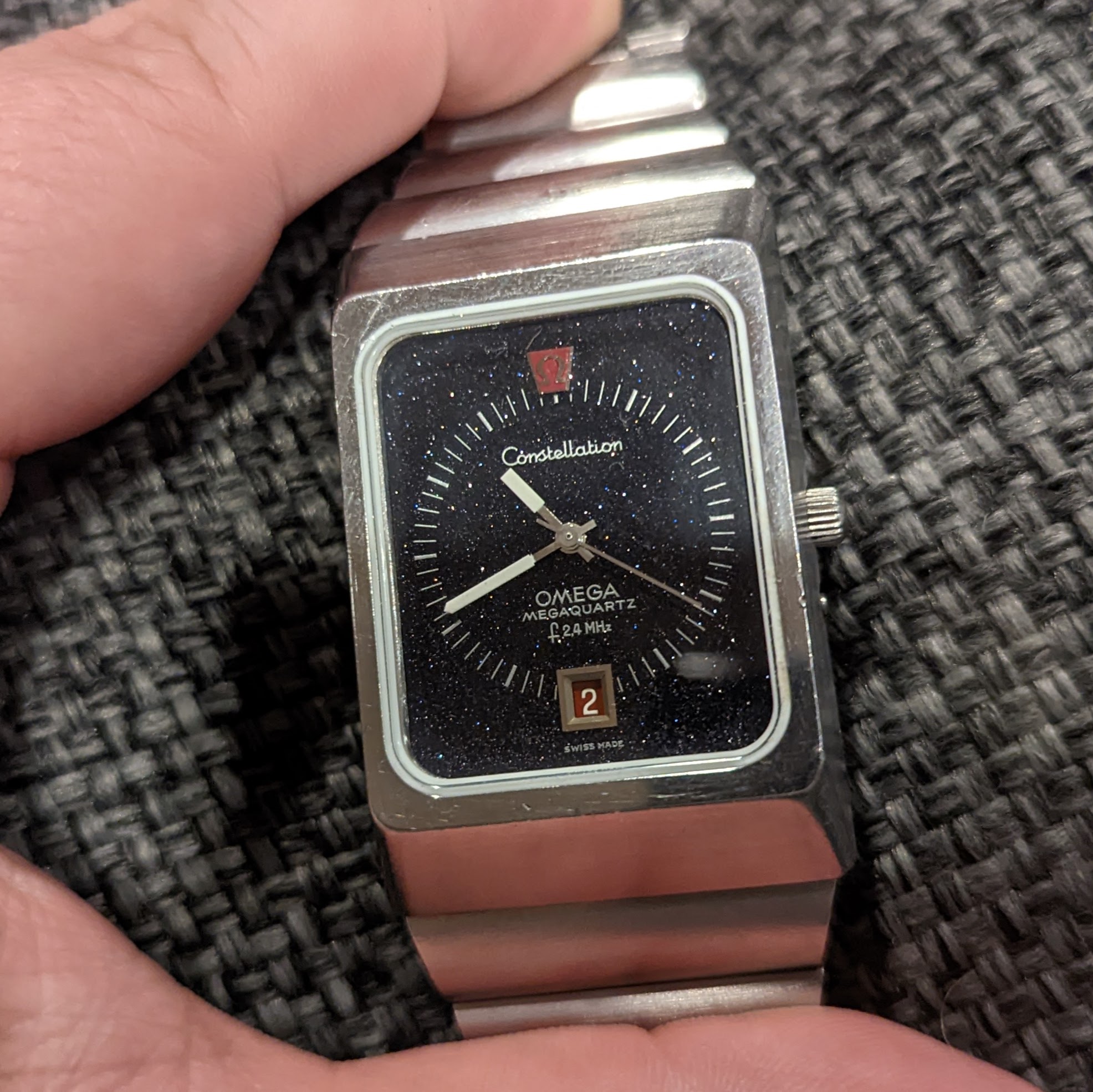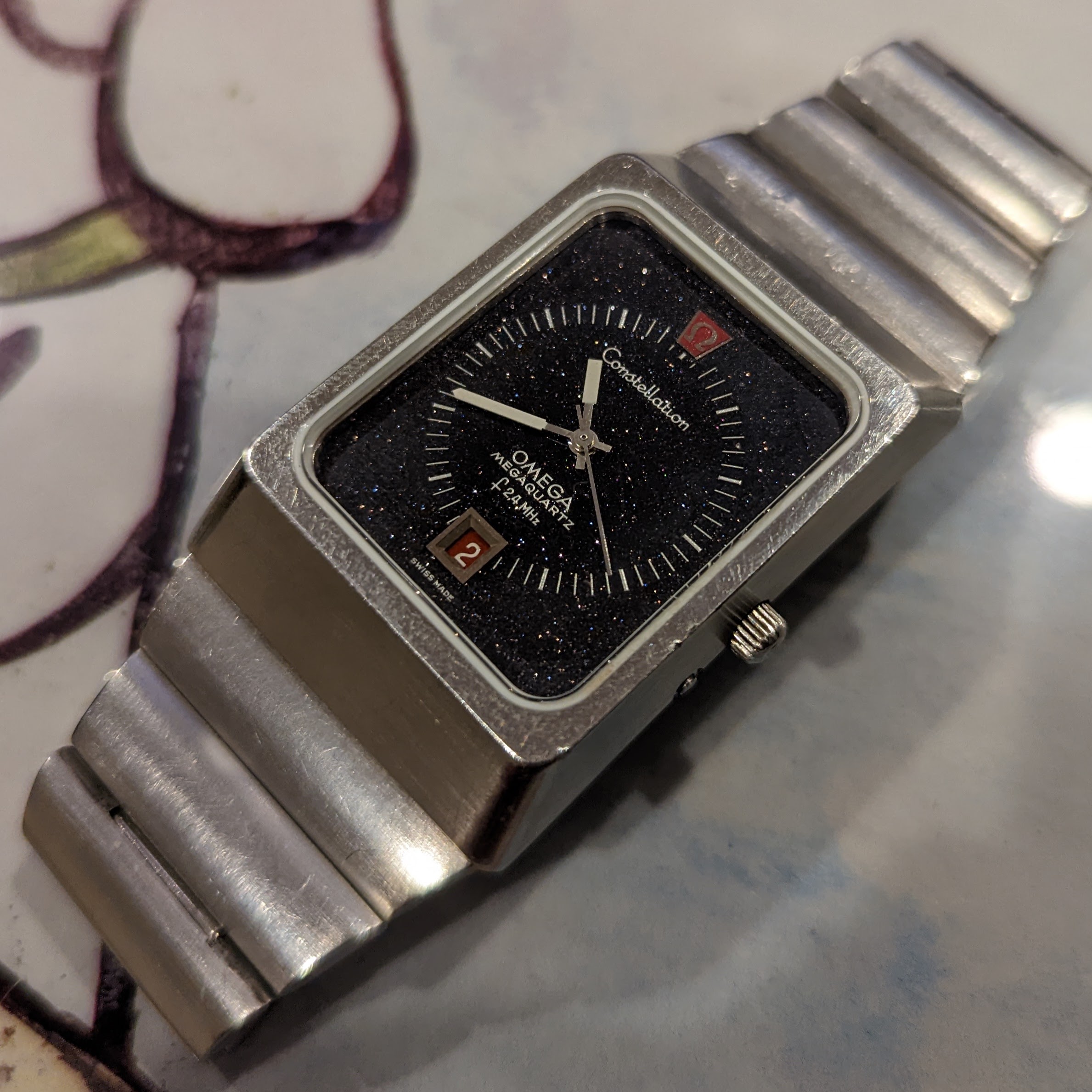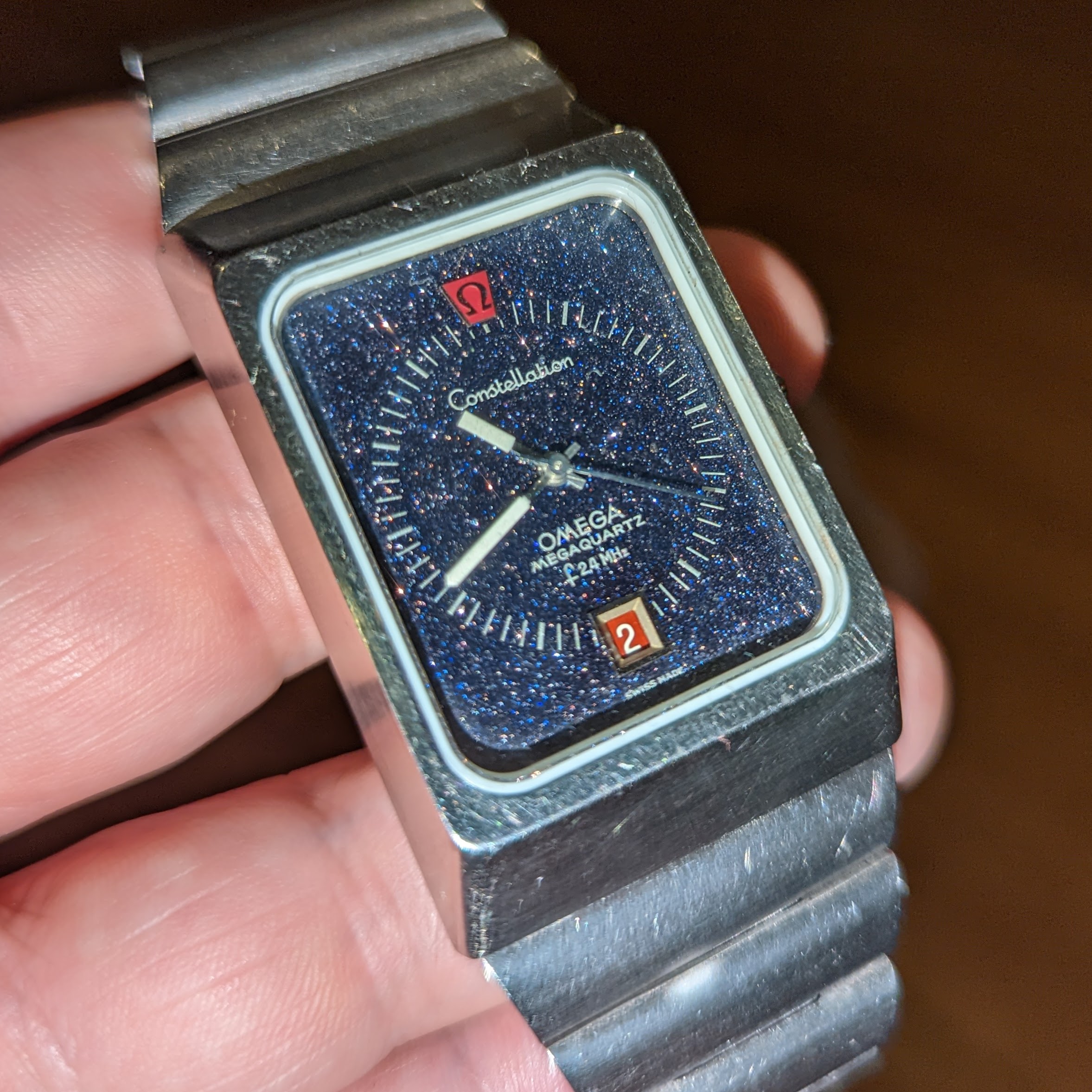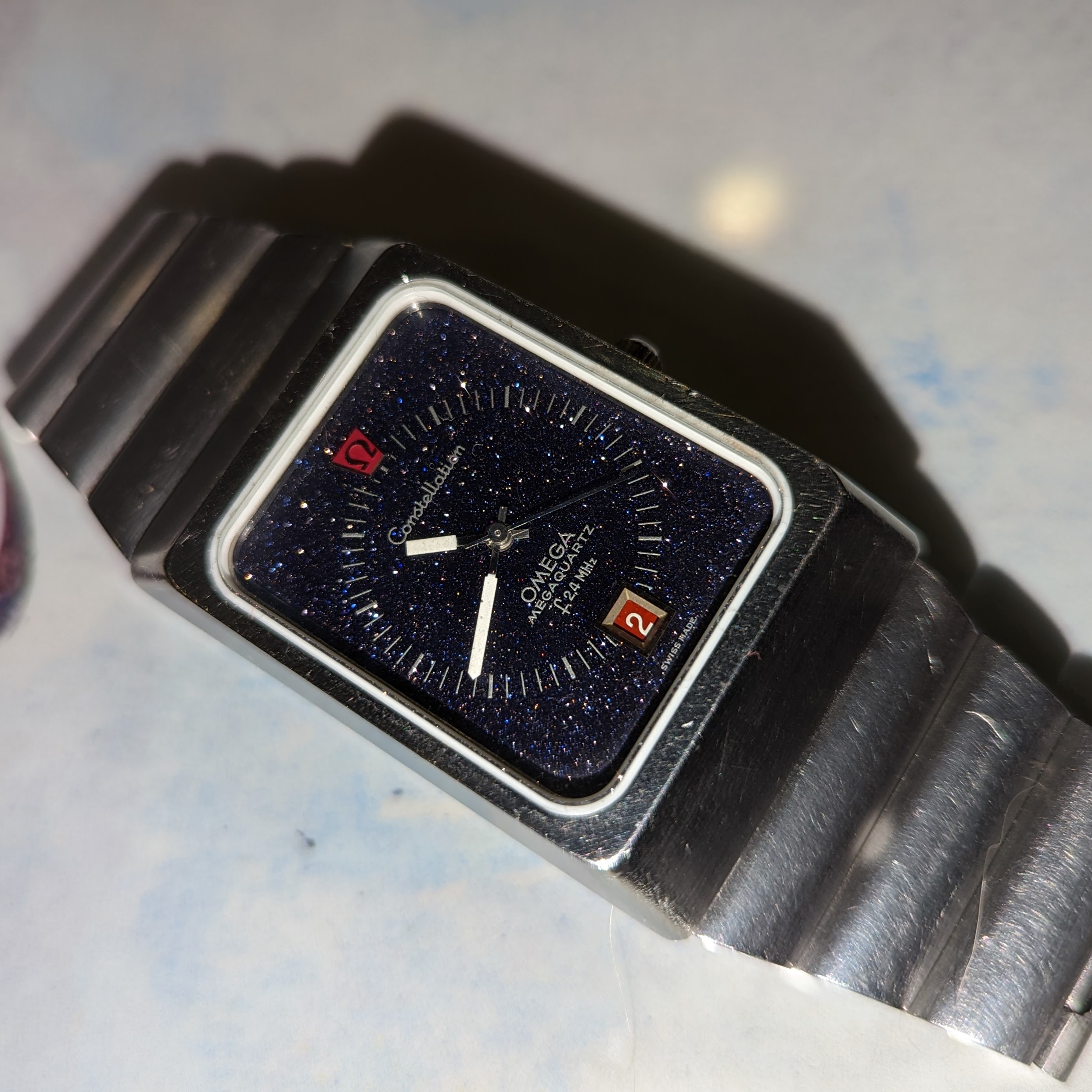 For sale is my 1973 Omega Constellation f2.4 mhz Aventurine Stardust. It features the cal. 1510, the most accurate non-thermocompensated quartz movement ever made. This one is in great condition. It had the crystal and gaskets replaced by Omega in 2018. It has the full length original bracelet. It's running great, keeping nearly perfect time. Rare for this model, the dial has no cracks. It's an all original survivor!