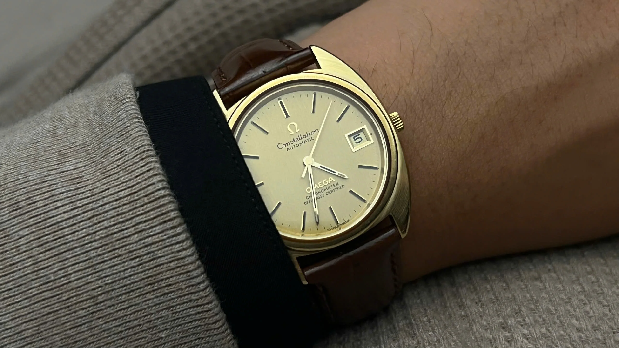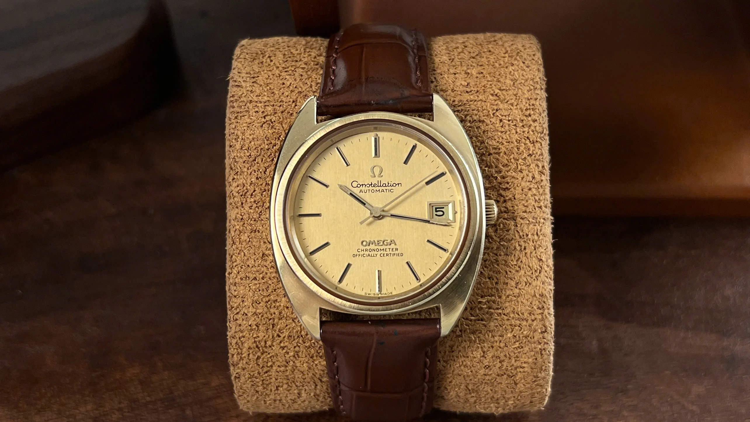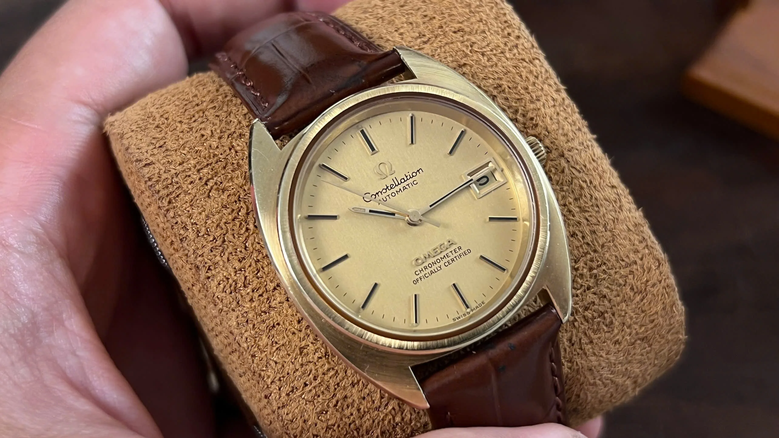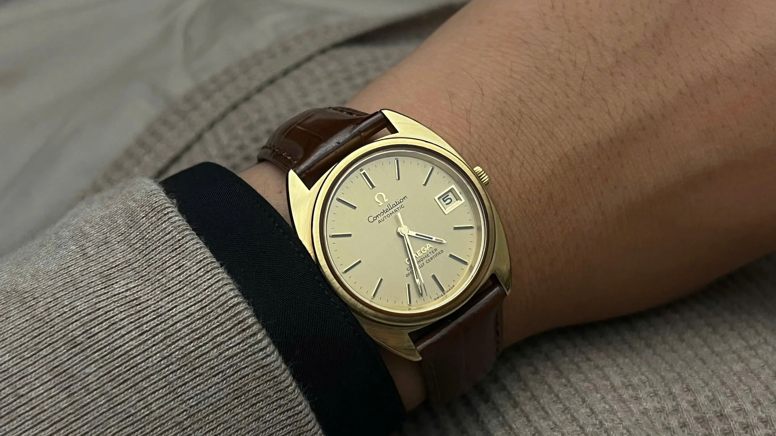For sale is an honest and well-preserved 1973 Omega Constellation reference 168.0056. This is one of the later C-Case Constellations, featuring a gold-capped case with a solid gold bezel and observatory medallion on the back. These design details give the watch both a subtle dress presence and the everyday practicality that the Constellation line was known for.