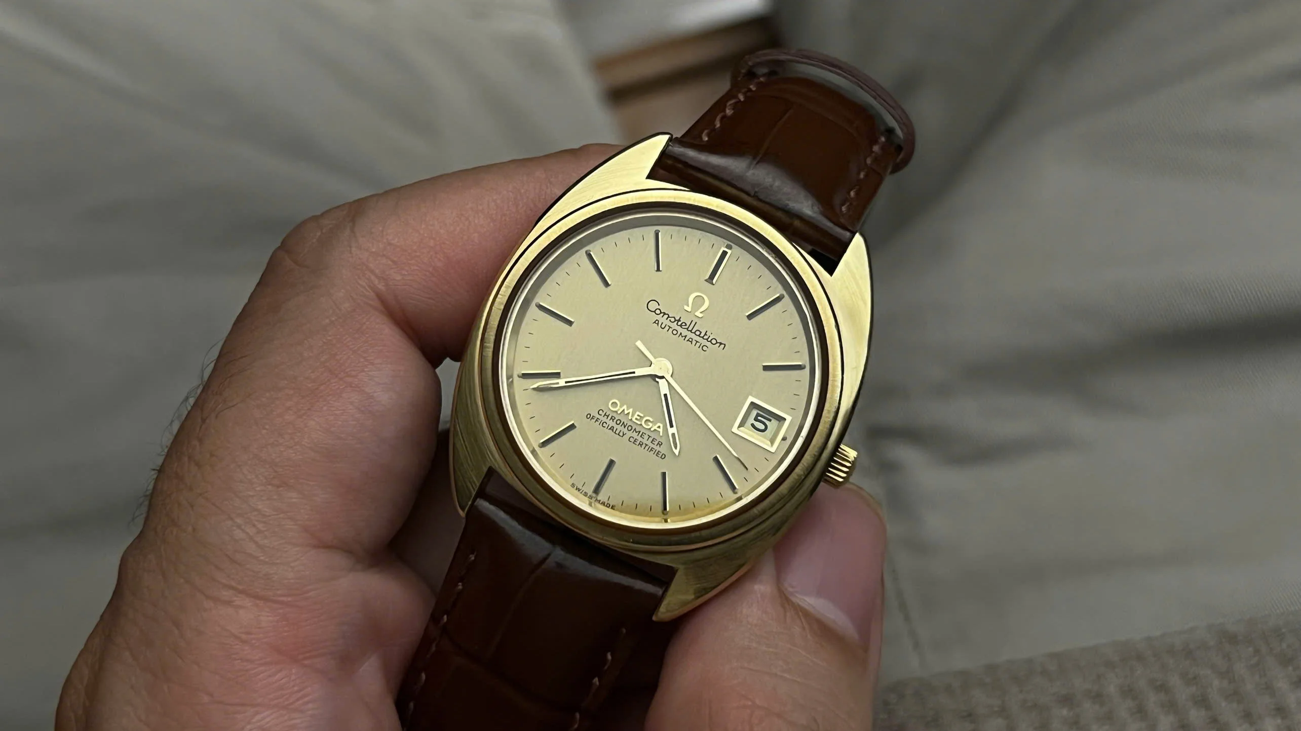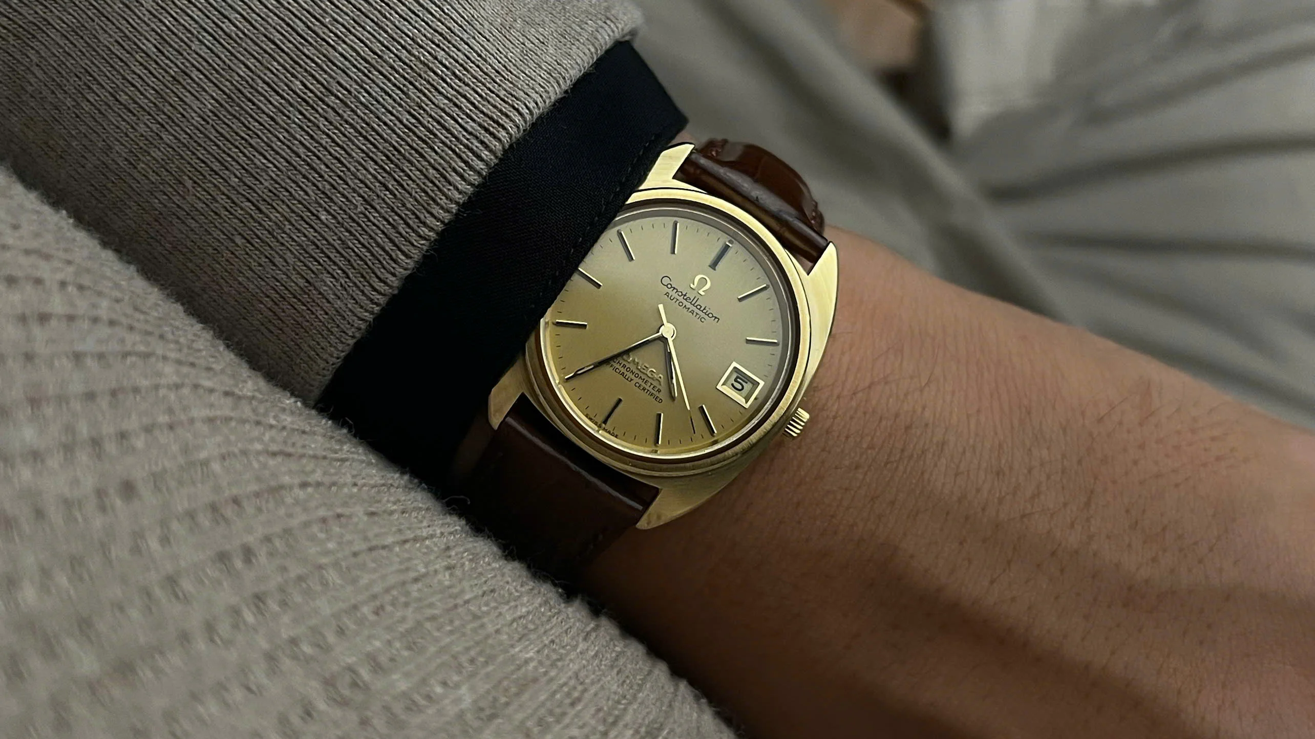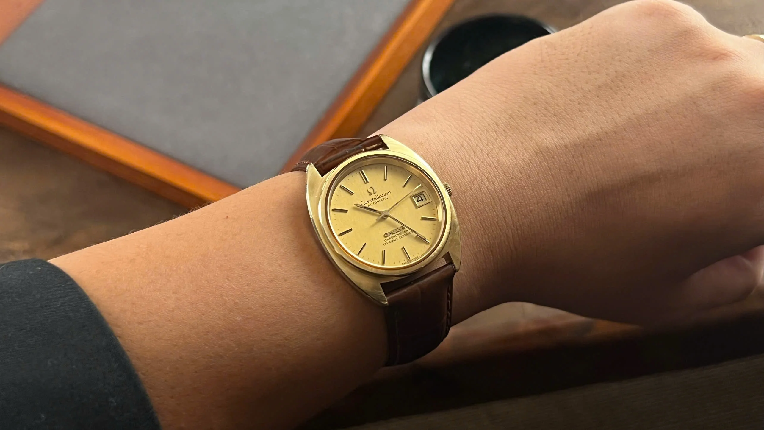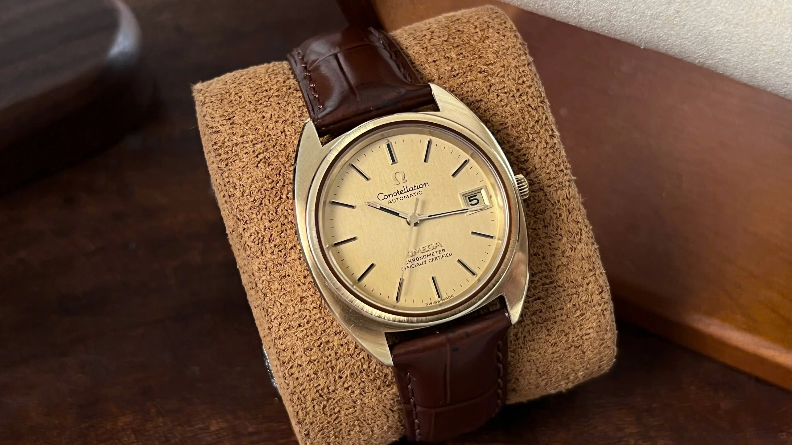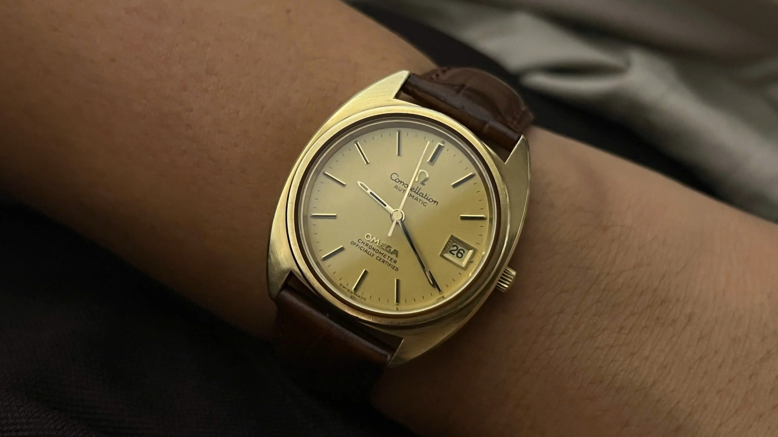 For sale is an honest and well-preserved 1973 Omega Constellation reference 168.0056. This is one of the later C-Case Constellations, featuring a gold-capped case with a solid gold bezel and observatory medallion on the back. These design details give the watch both a subtle dress presence and the everyday practicality that the Constellation line was known for.