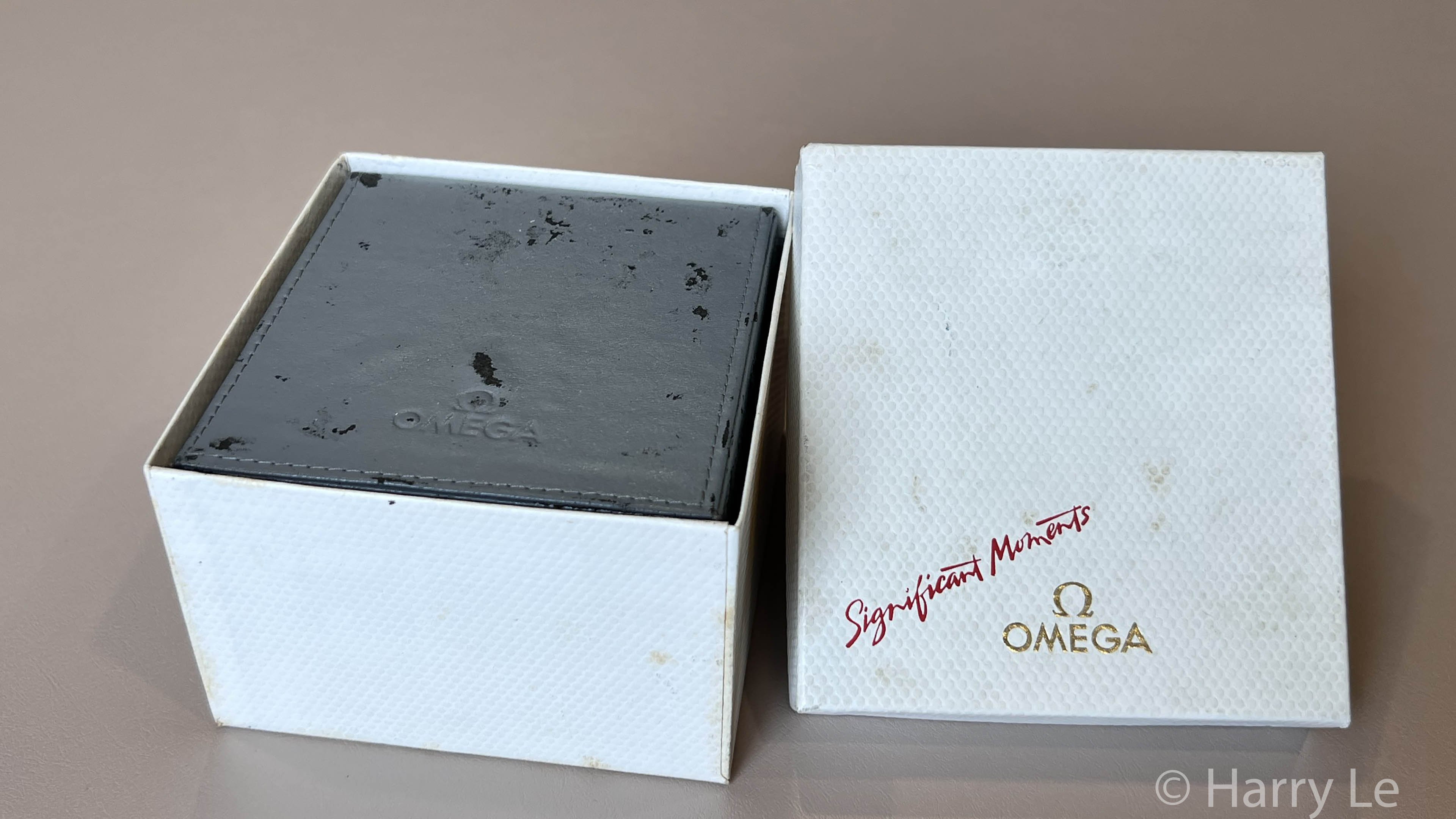 - Box: The watch comes with Omega's double boxing—white carton outer box and a grey leather box inside—in average (or below) condition.