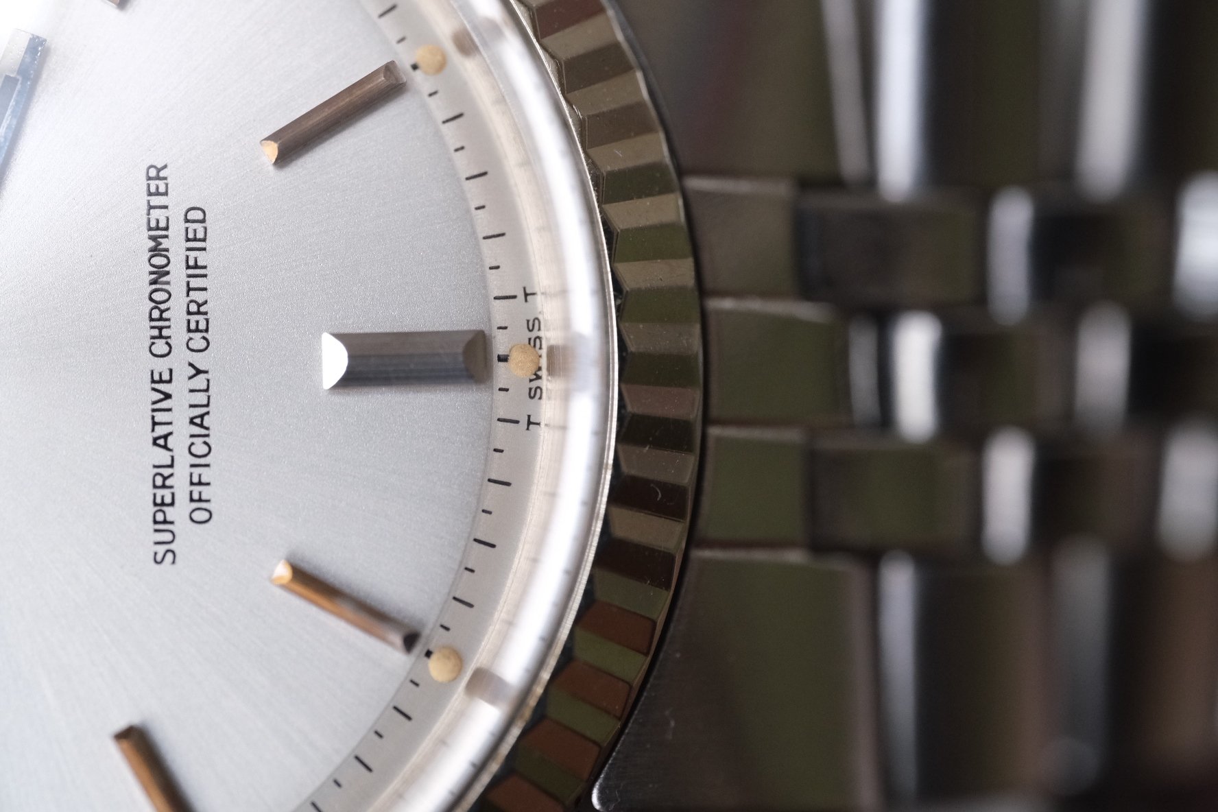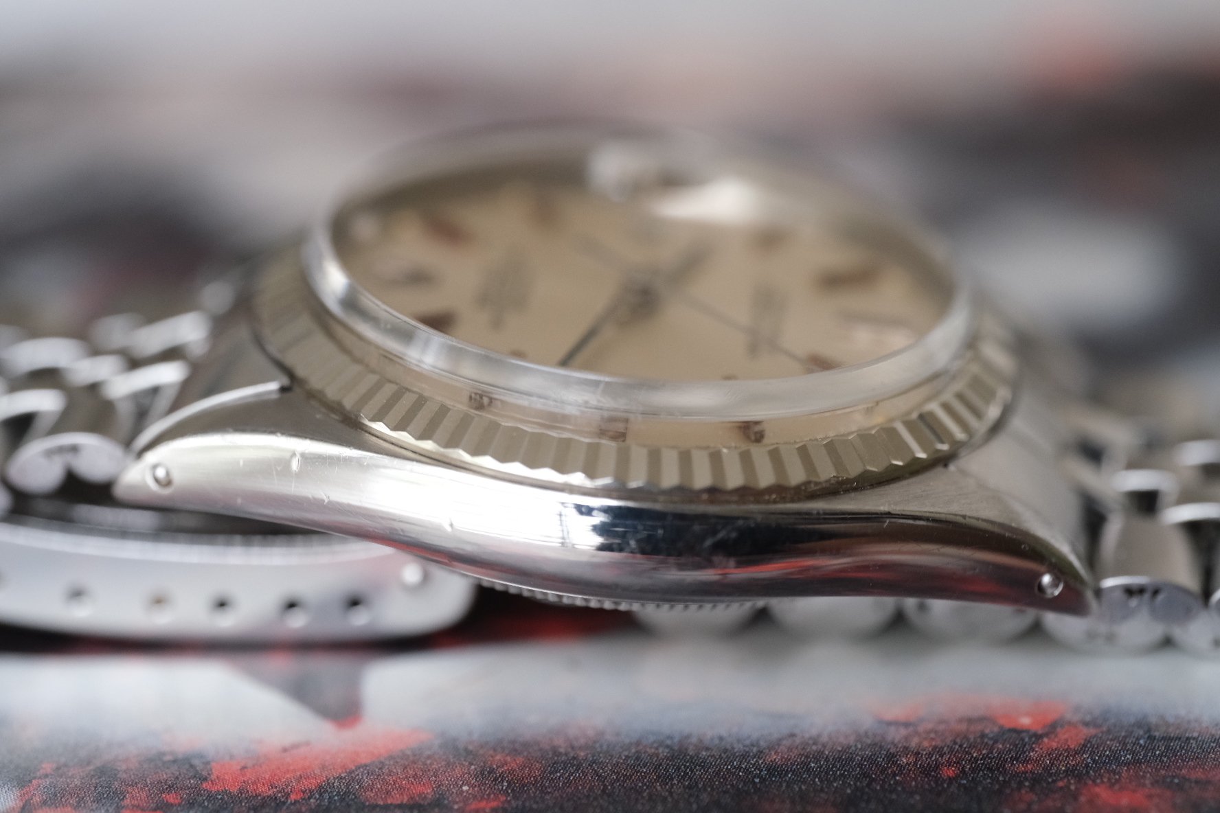 DIAL: LOVES ME a Rolex silver sunburst dial, and this is a great example! That sunburst finish is beautiful, with clean lettering and perfectly aged and full tritium lume plots. Lume on hands has aged darker but all original, all sparks the same under UV. I think what makes this one really cool is the aging that has occurred on the hour markers. Very subtle on the wrist, and even in macro, but when the light hits it right it pops with these incredible purples and browns - just awesome!