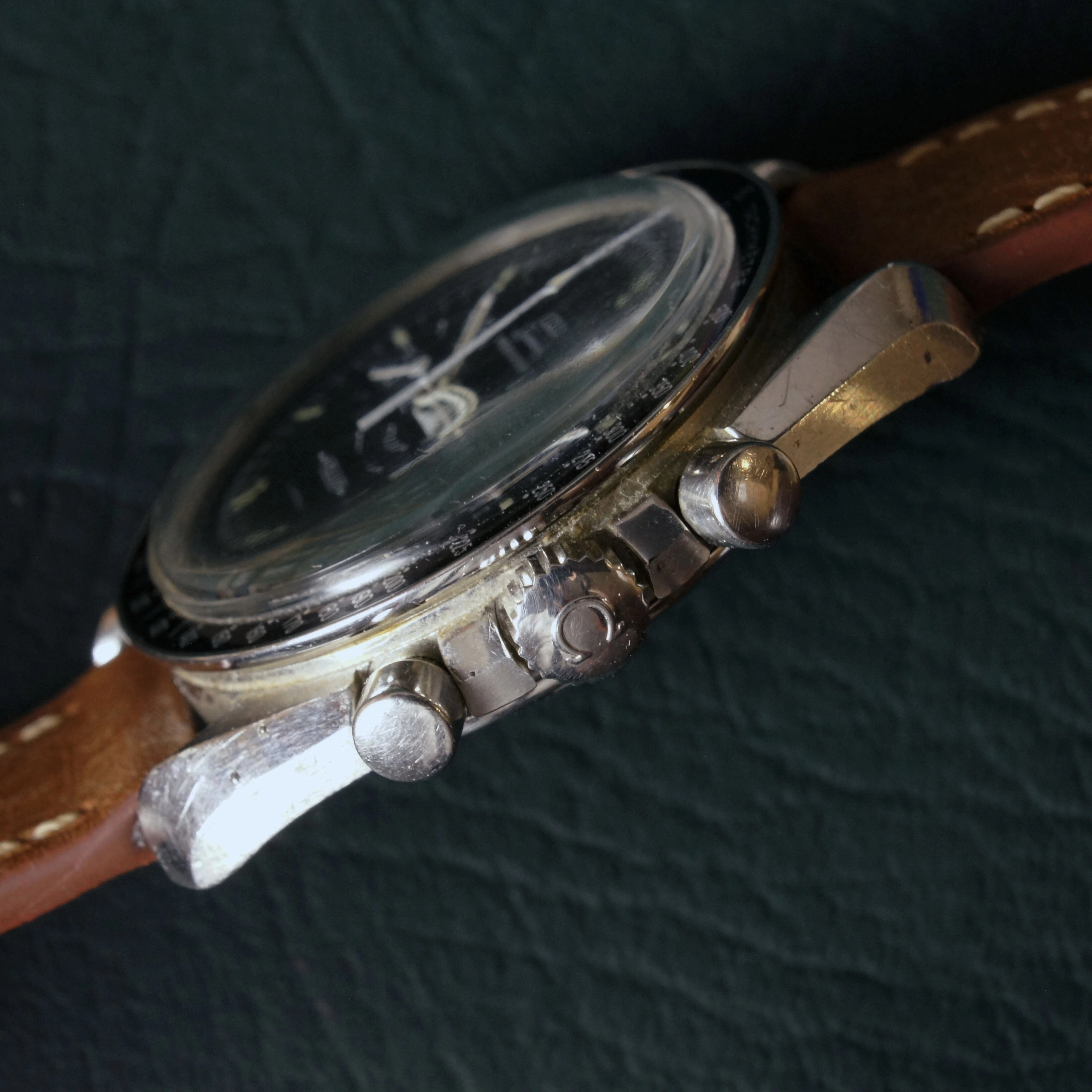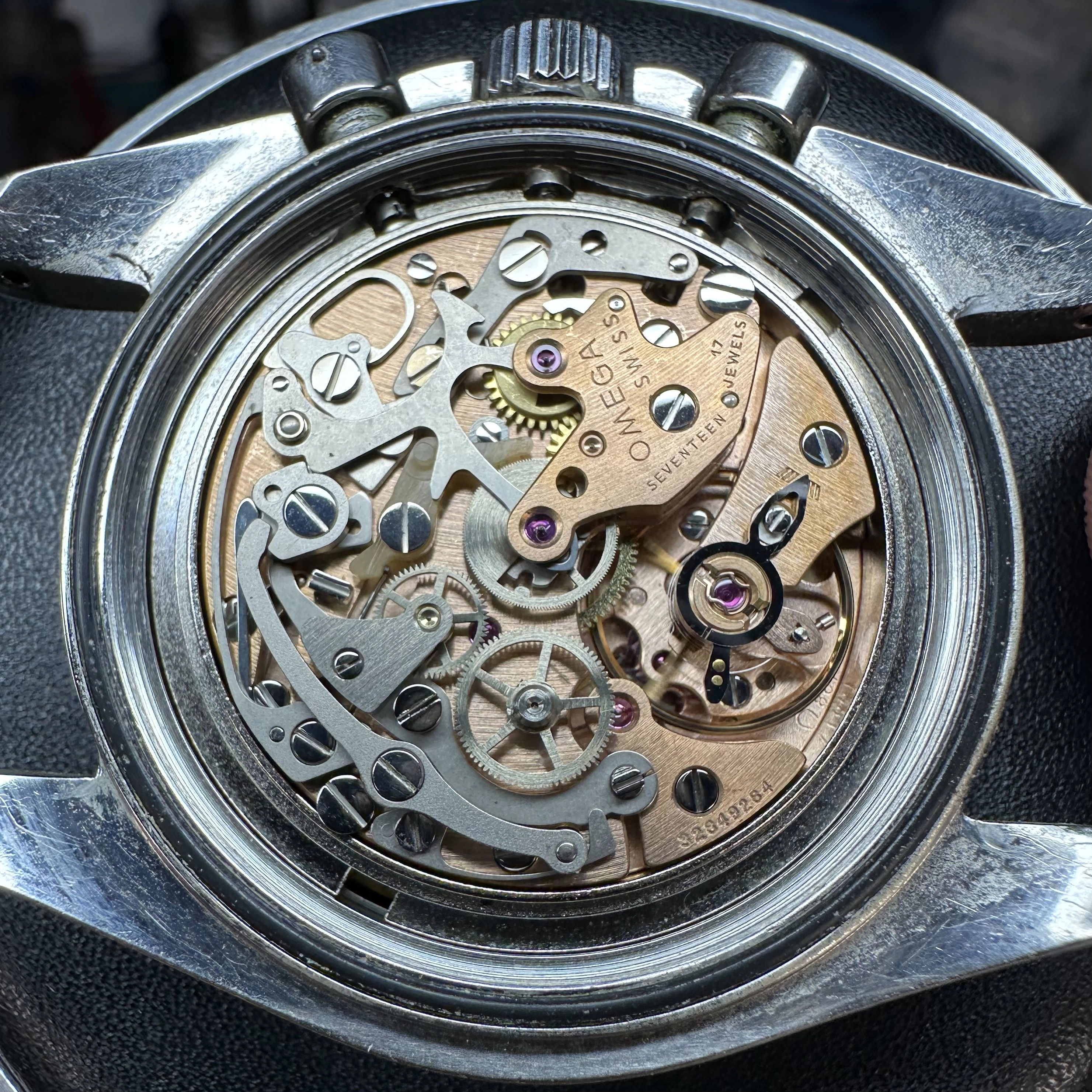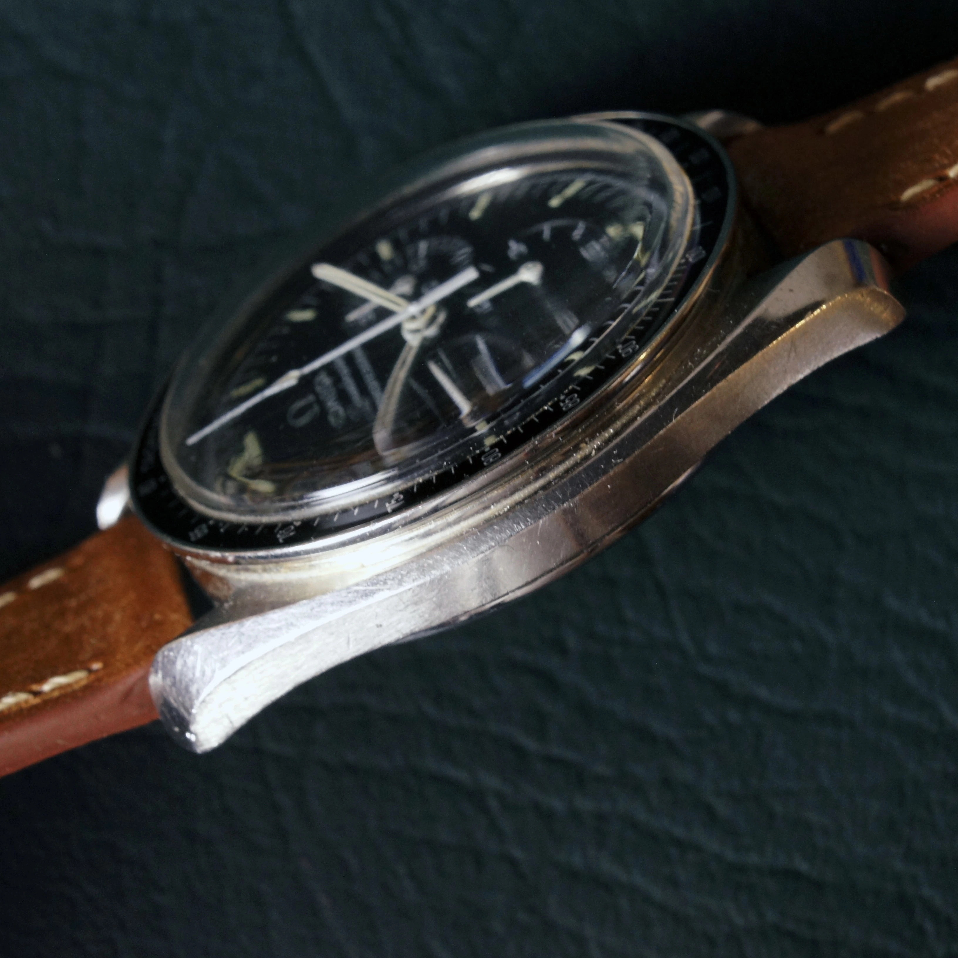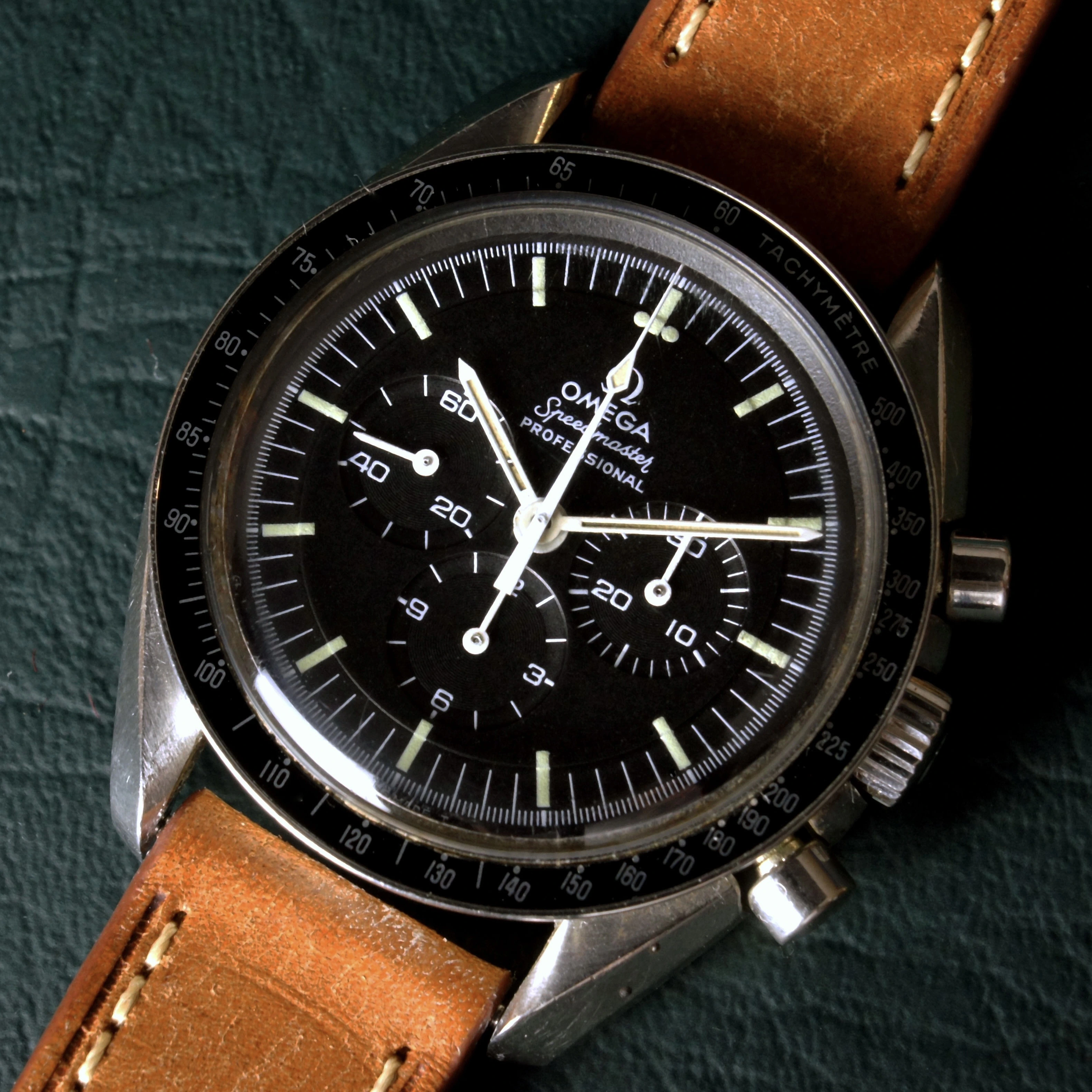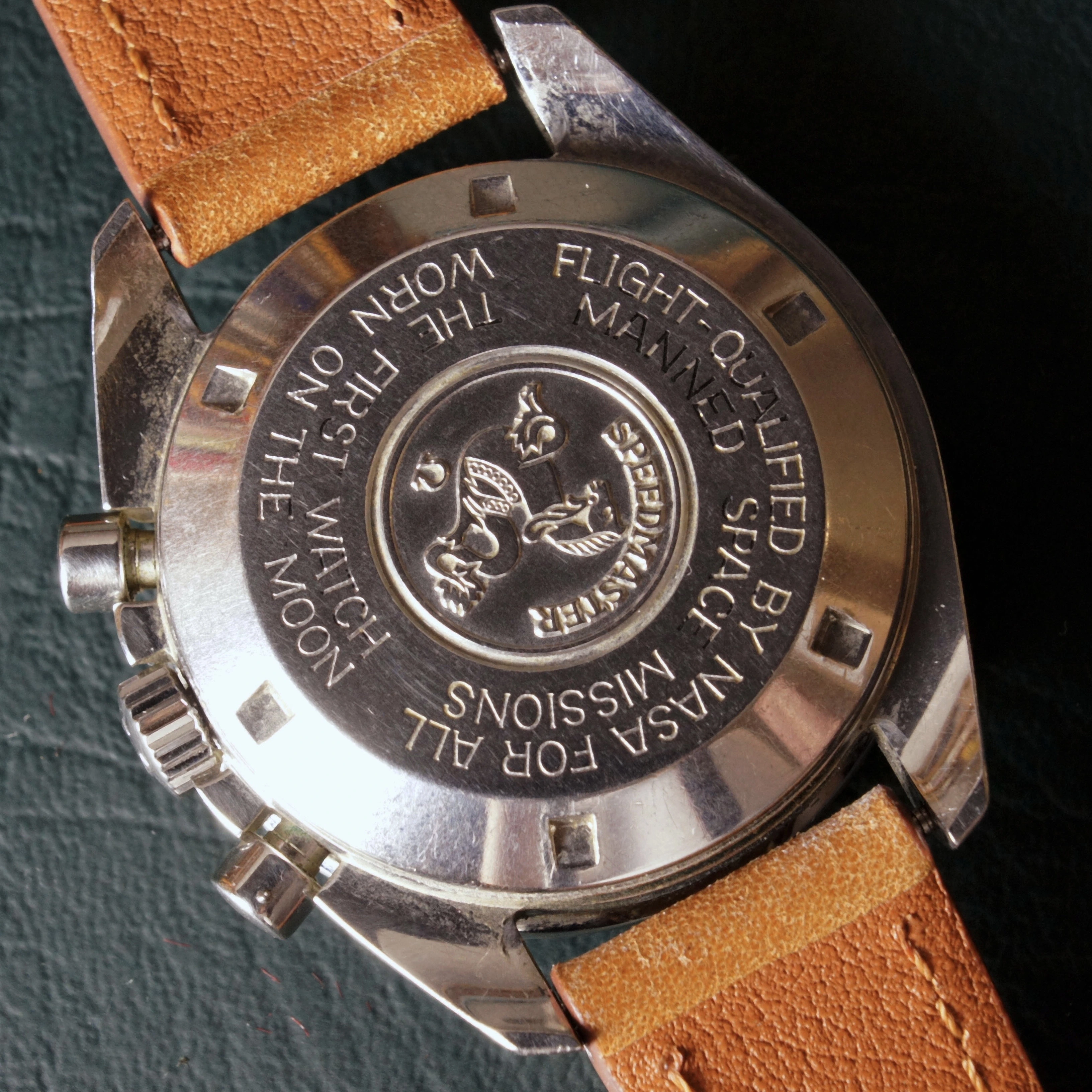 Movement: The watch runs and keeps time well. All chronograph functions operate properly--the chronograph starts, stops, and resets as intended. Service history is unknown. The 32 million serial number on the movement, dates this timepiece to approximately 1974 according to ilovemyspeedmaster.com