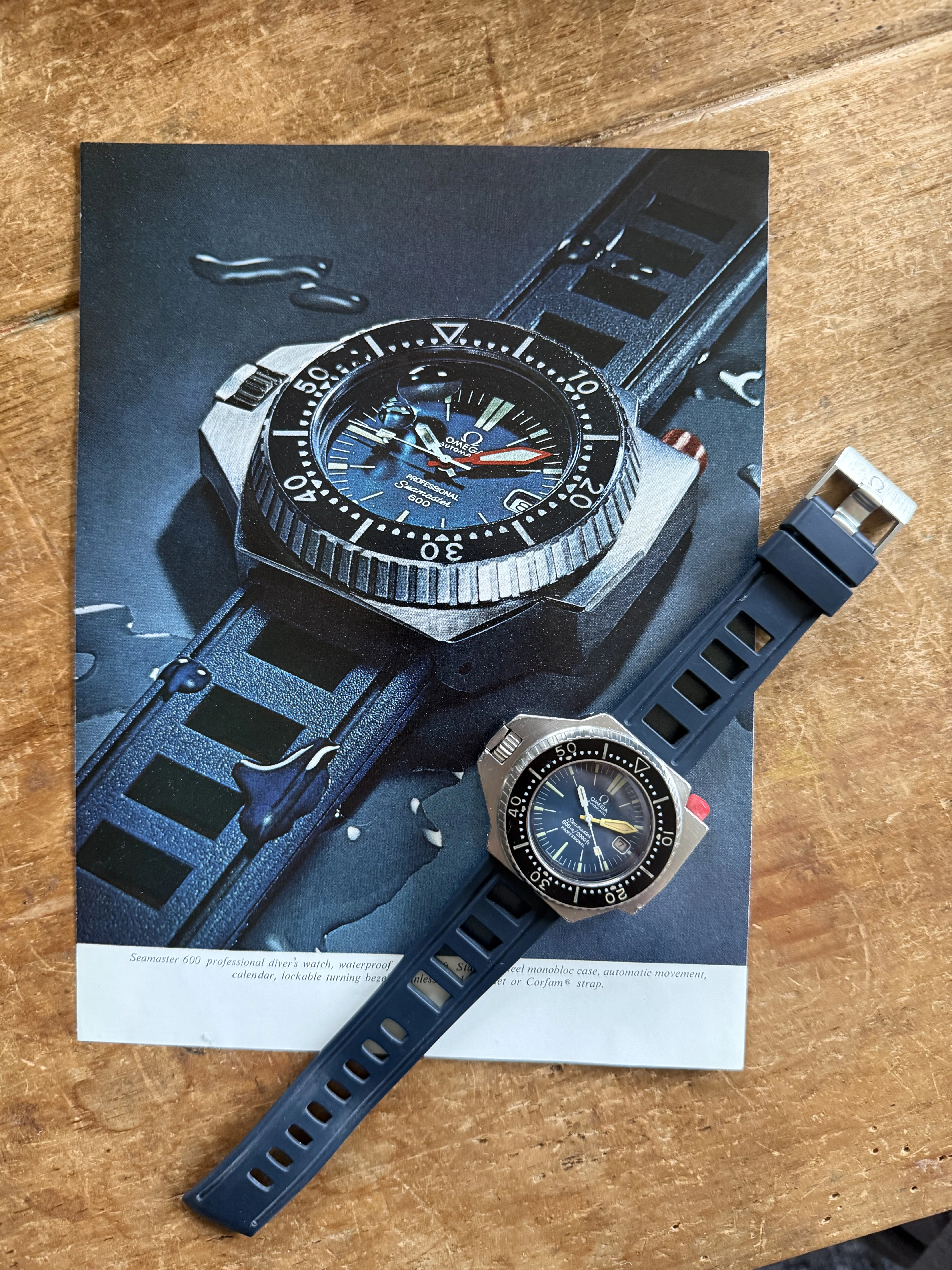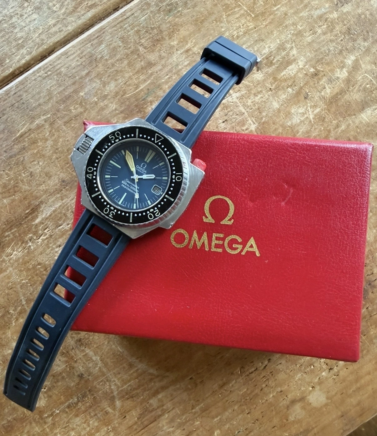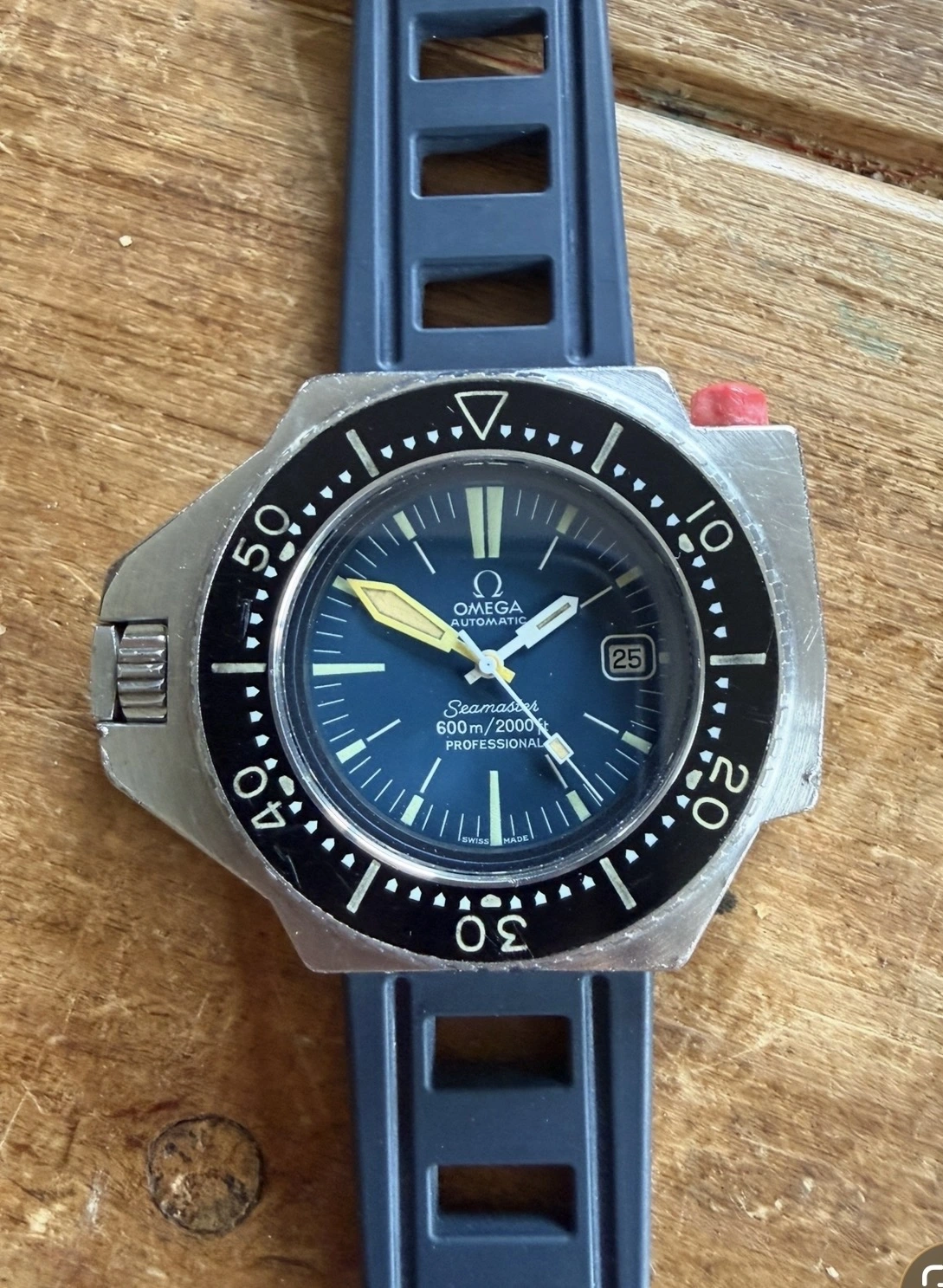 ·..So late last year, found and secured a deal on this 166.077. It was in non running condition, but looked completely original, even had the original Ploprof pamphlet. I seeked info on who to get it serviced by and was recommended Stefan Stefansson in London. He did an amazing job and keeping everything original. So my Ploprof dates from year that “Jaws” was first released; 1975. Dial is absolutely mesmerising. Hour hand faded to a yellowish hue. I sourced an original (modern) Omega blue rubber strap that gives the watch that authentic original poster ad look. It is running absolutely superbly. Completely smitten with my Ploprof 😍