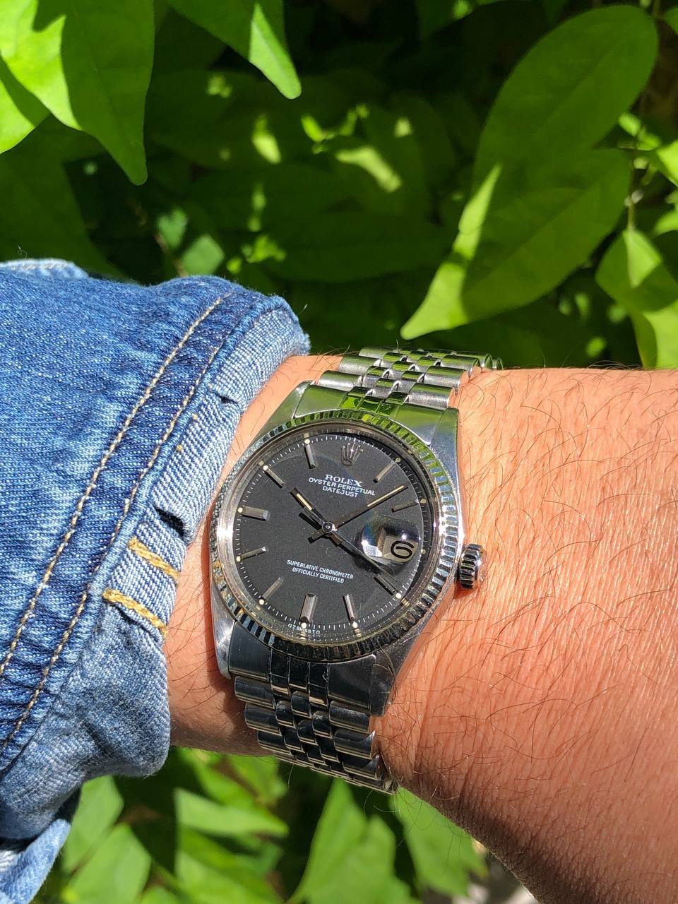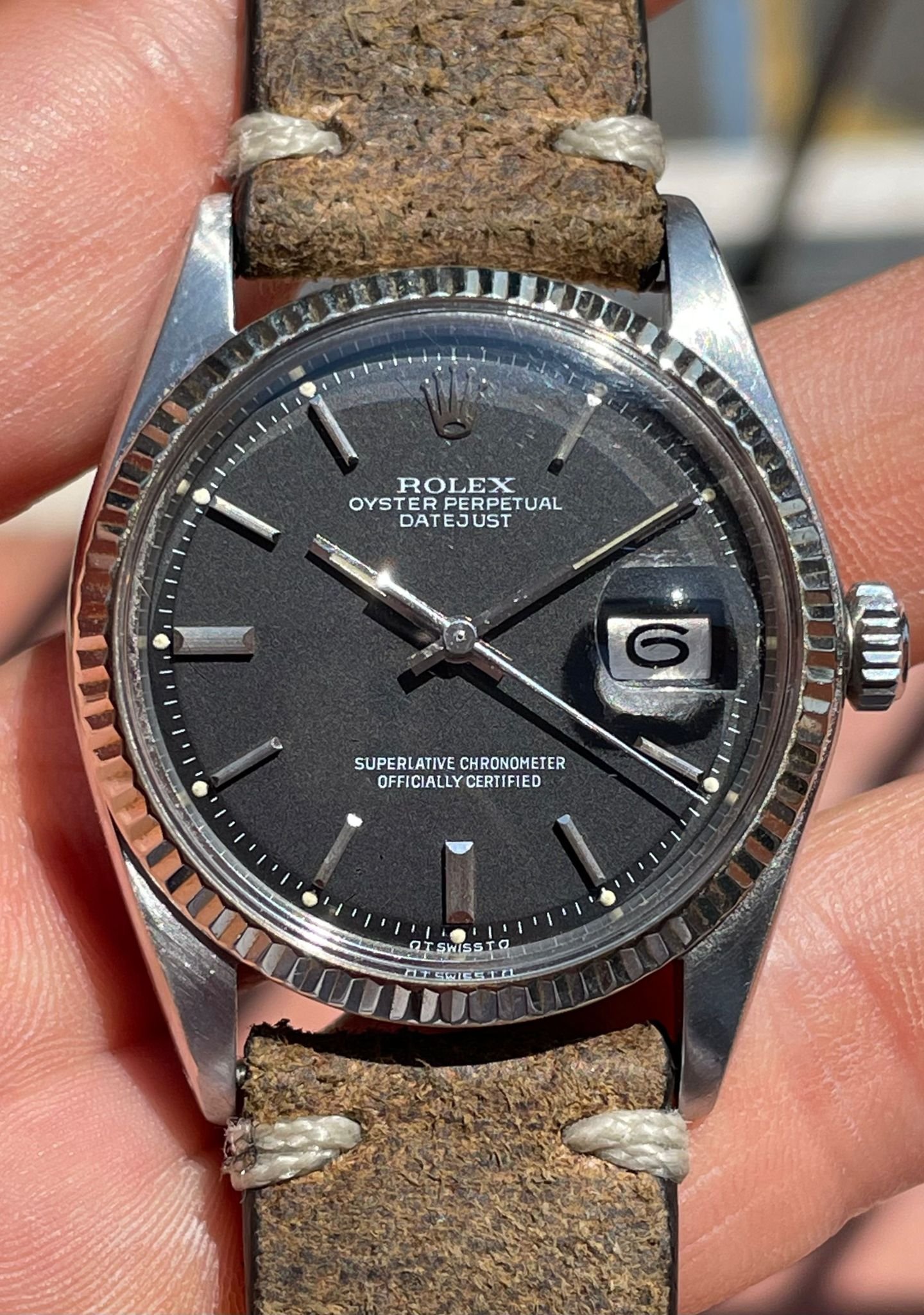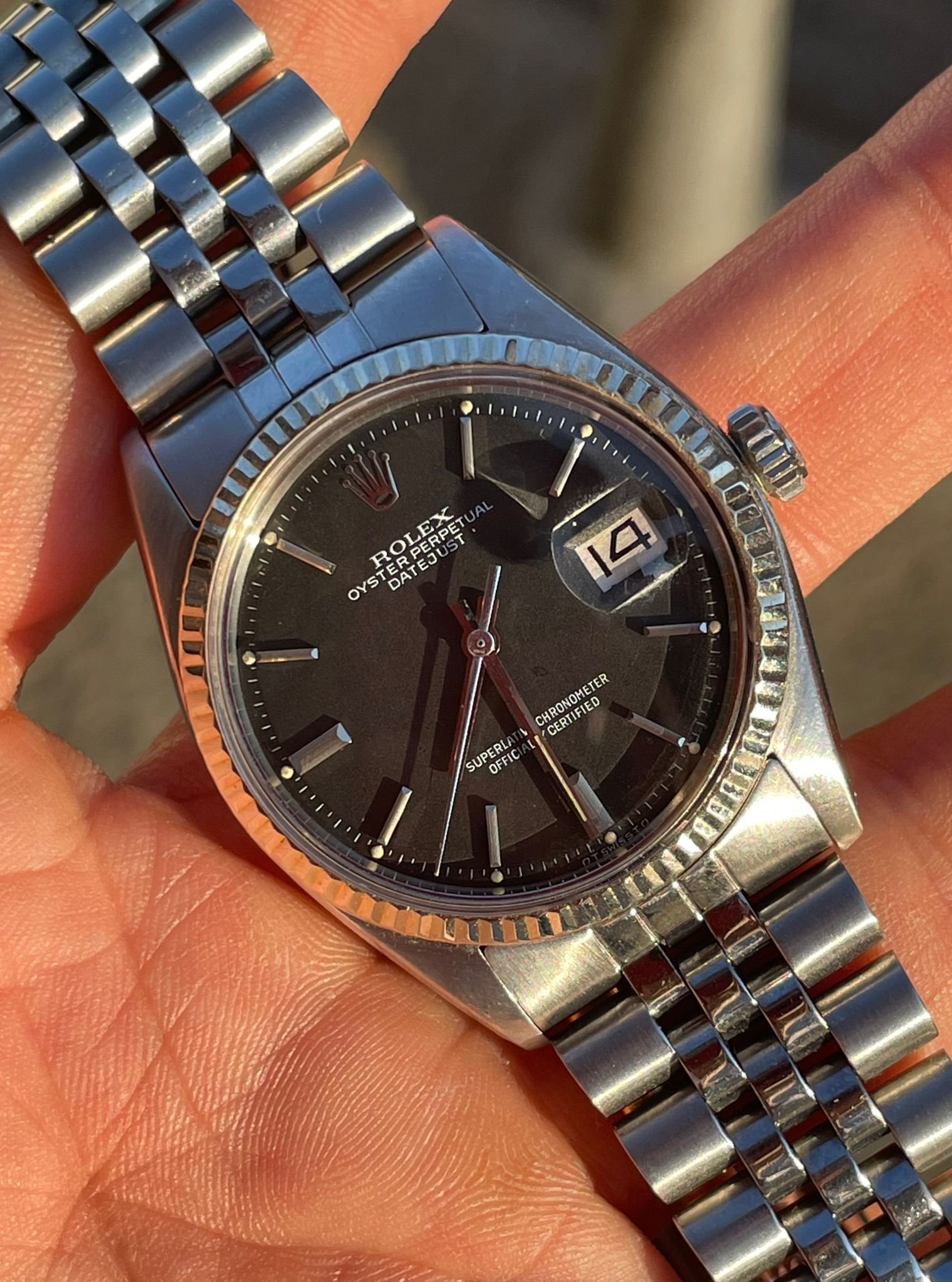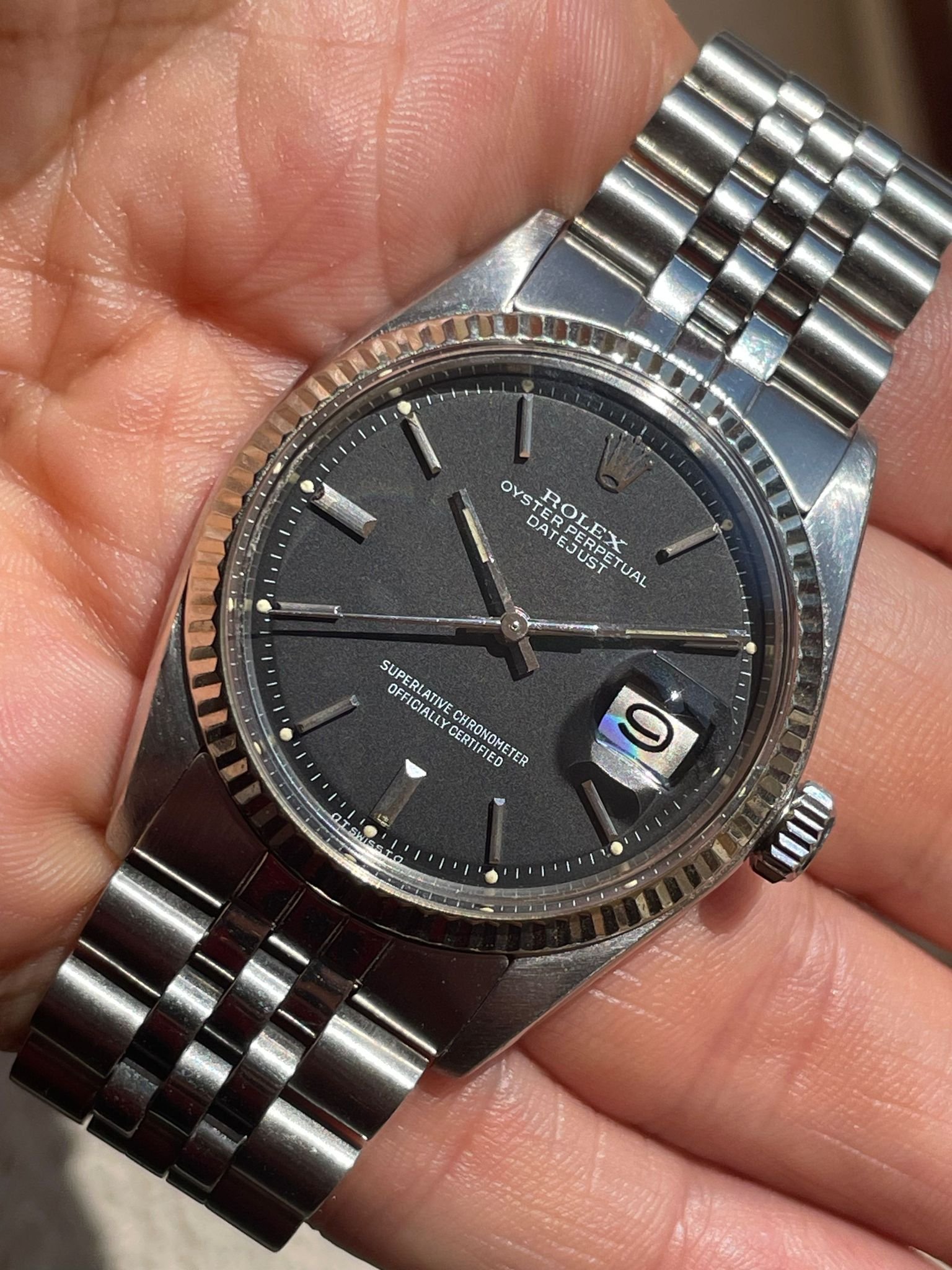 I have for sale a have for sale a real stunner: a 1975 Rolex Datejust ref.1601 with a very rare matte black pie pan "Sigma" dial in flawless condition, a solid case and excellent white gold fluted bezel.