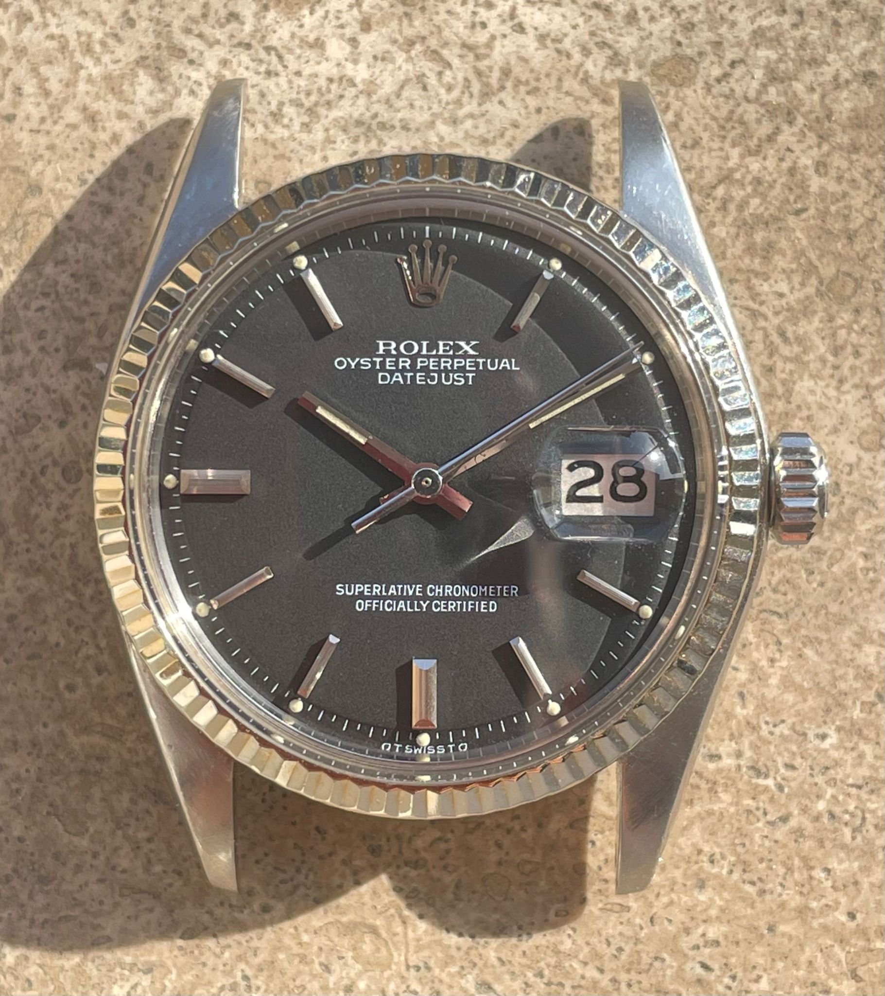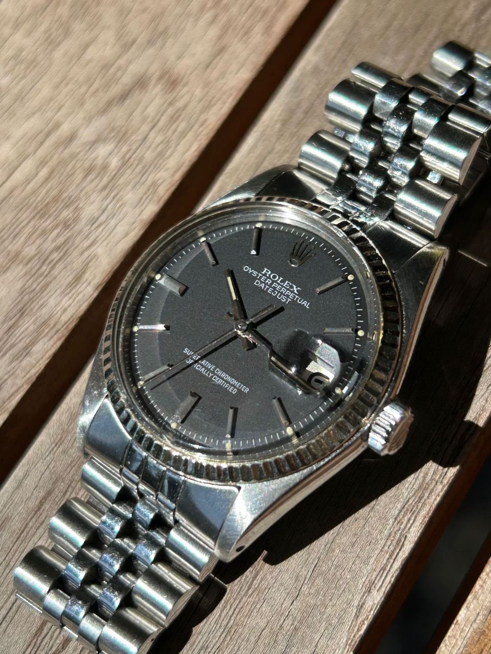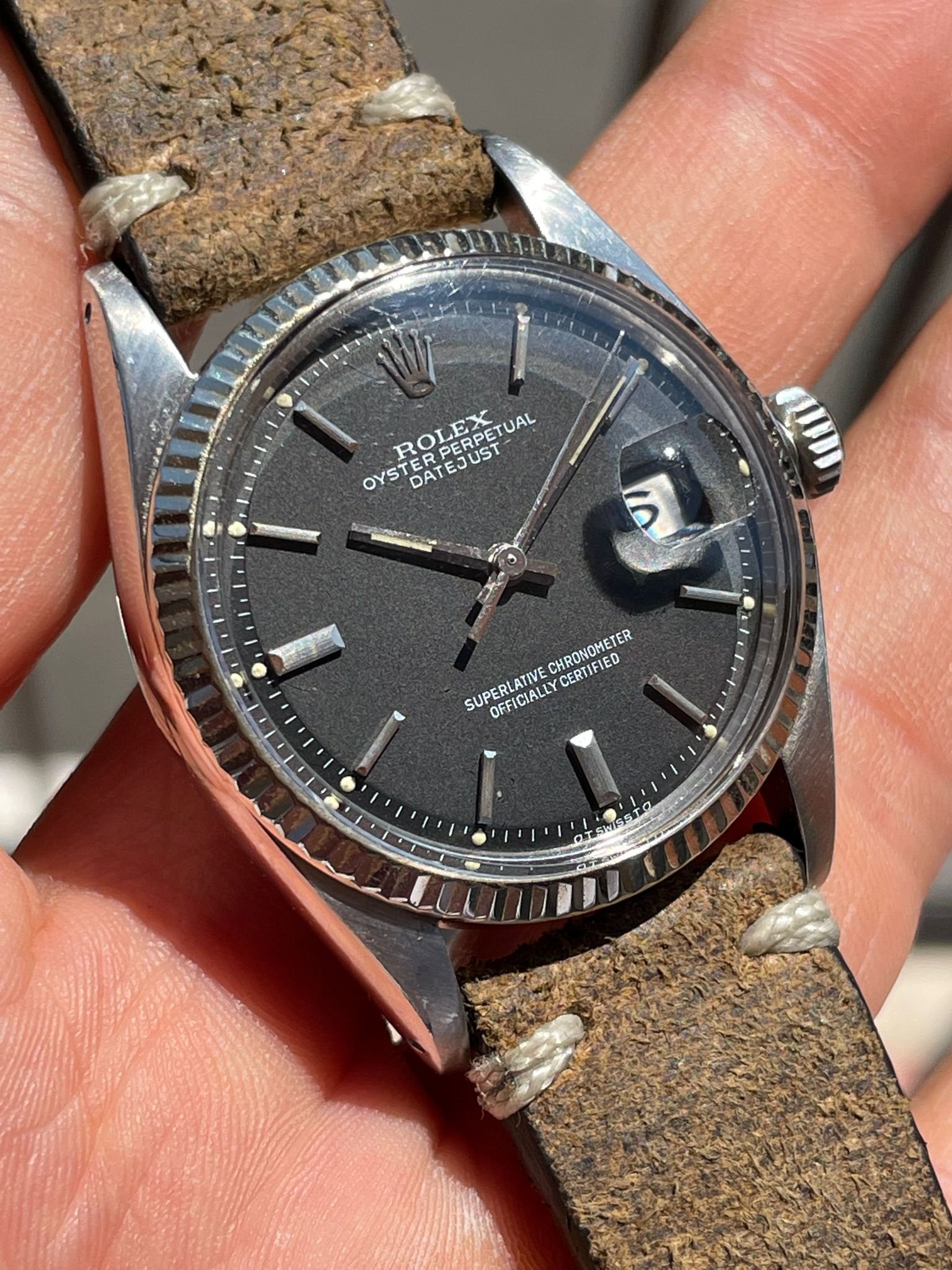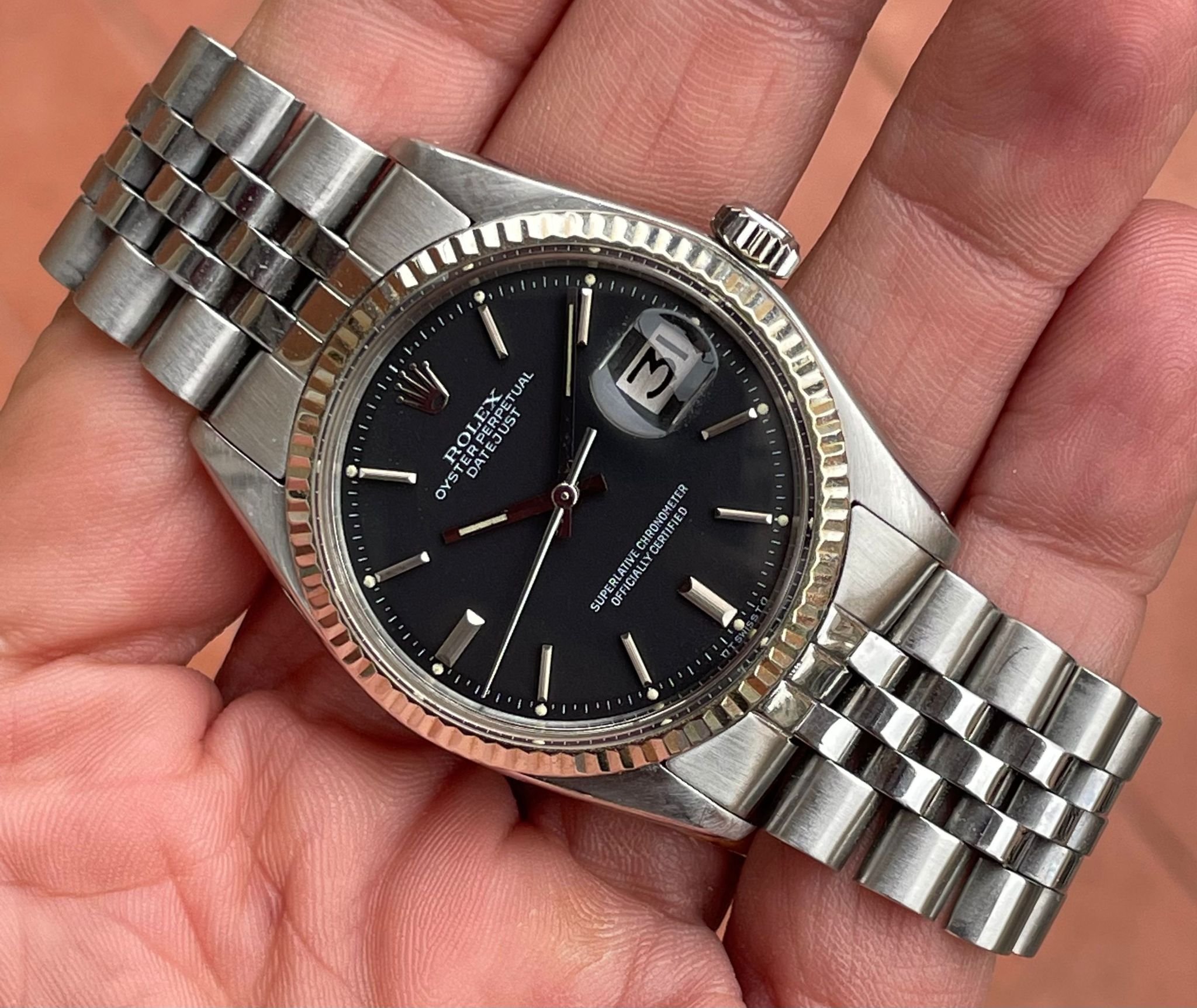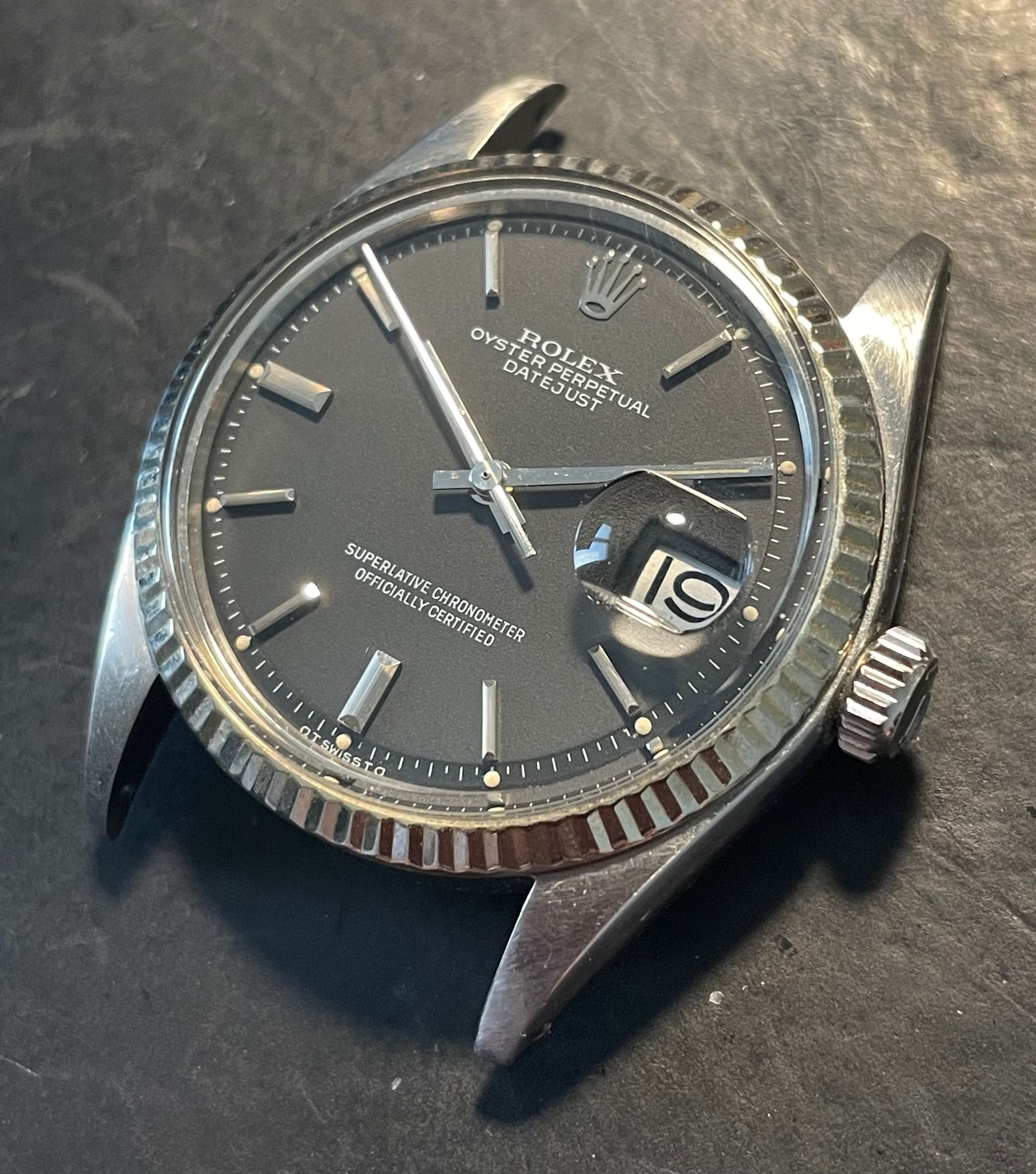 I have for sale a have for sale a real stunner: a 1975 Rolex Datejust ref.1601 with a very rare matte black pie pan "Sigma" dial in flawless condition, a solid case and excellent white gold fluted bezel.