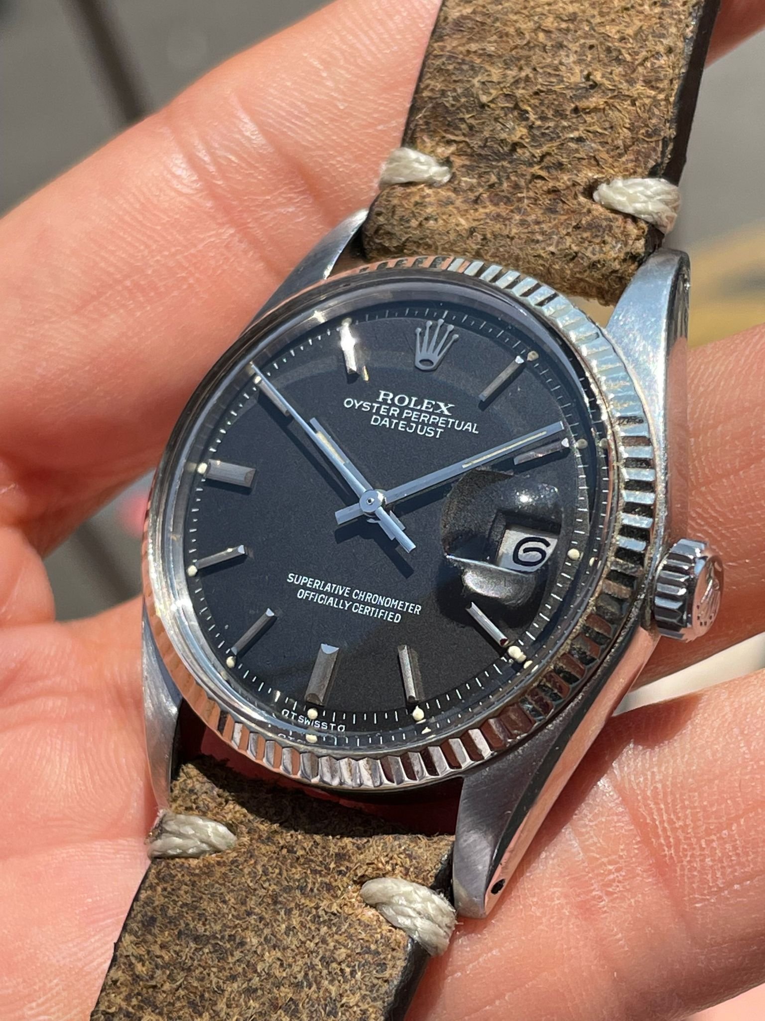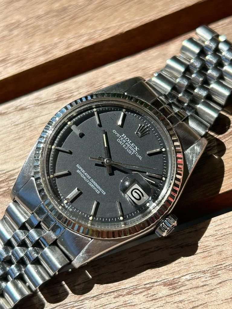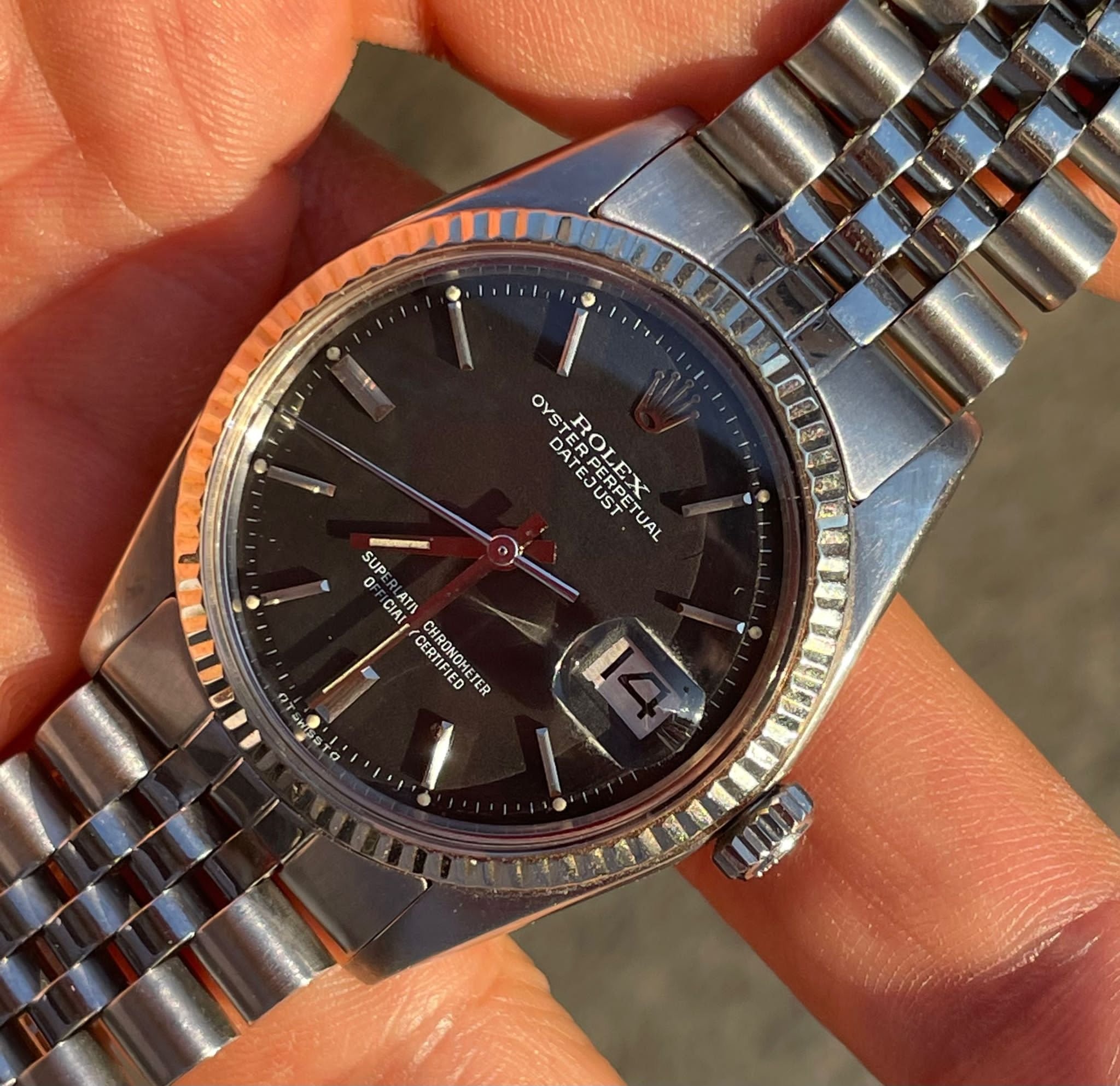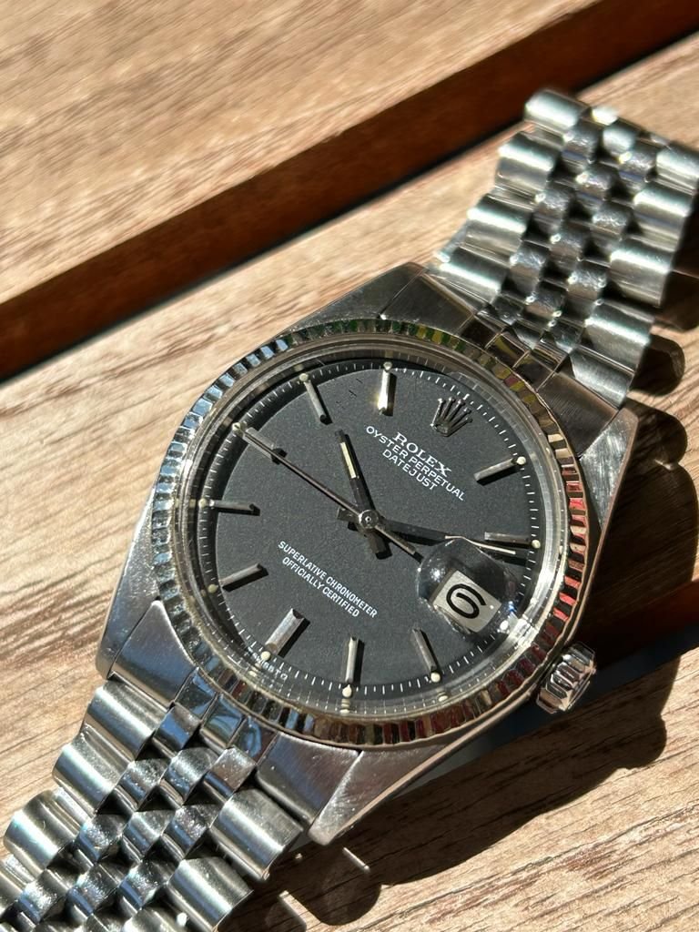 I have for sale a have for sale a real stunner: a 1975 Rolex Datejust ref.1601 with a very rare matte black pie pan "Sigma" dial in flawless condition, a solid case and excellent white gold fluted bezel.