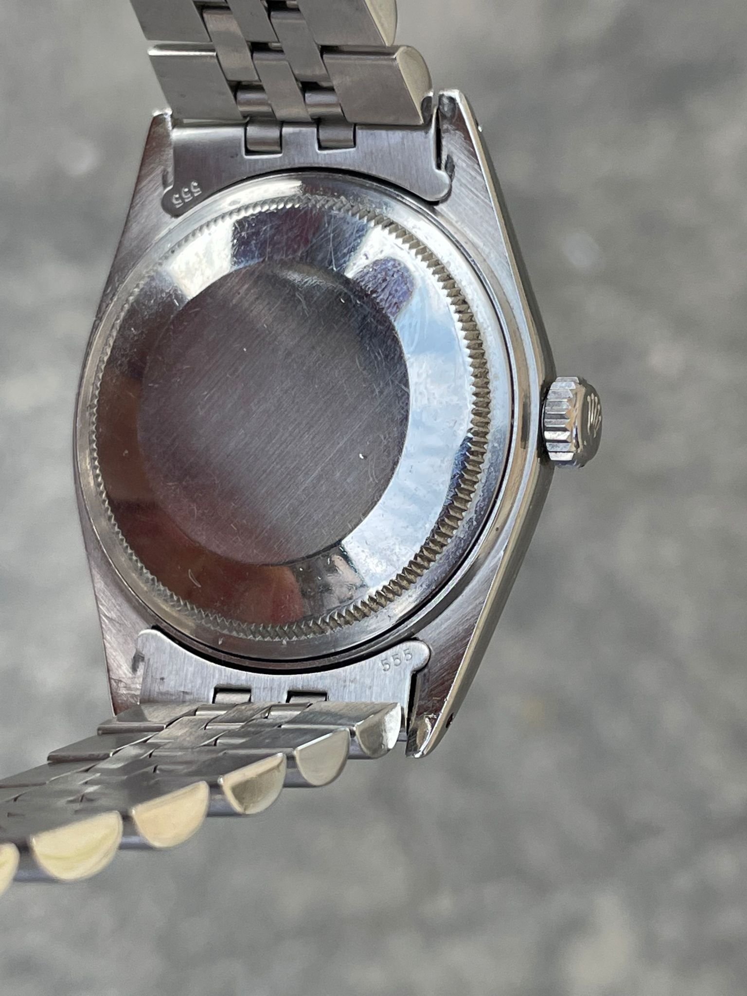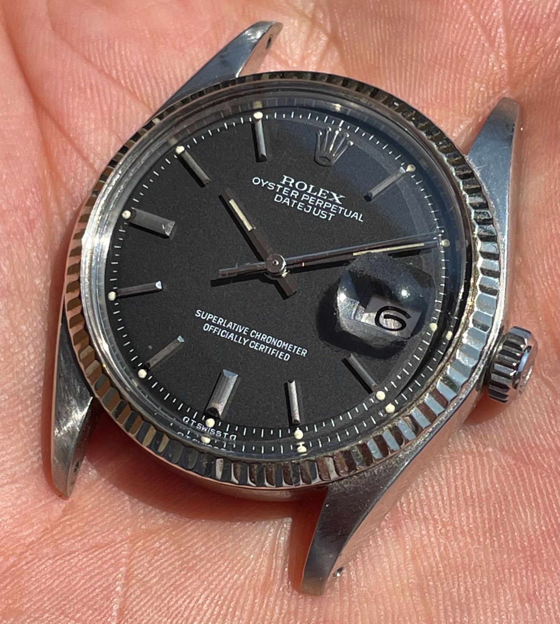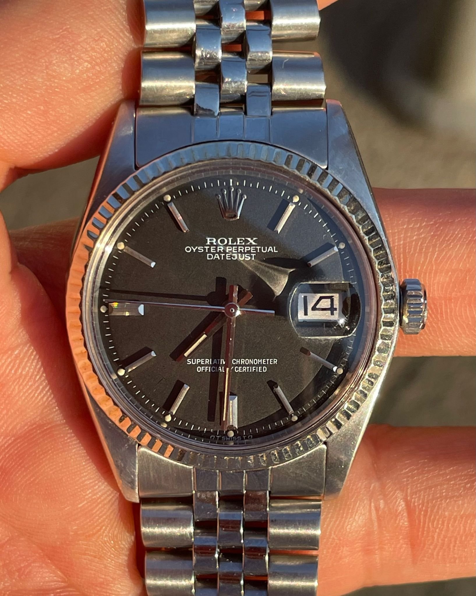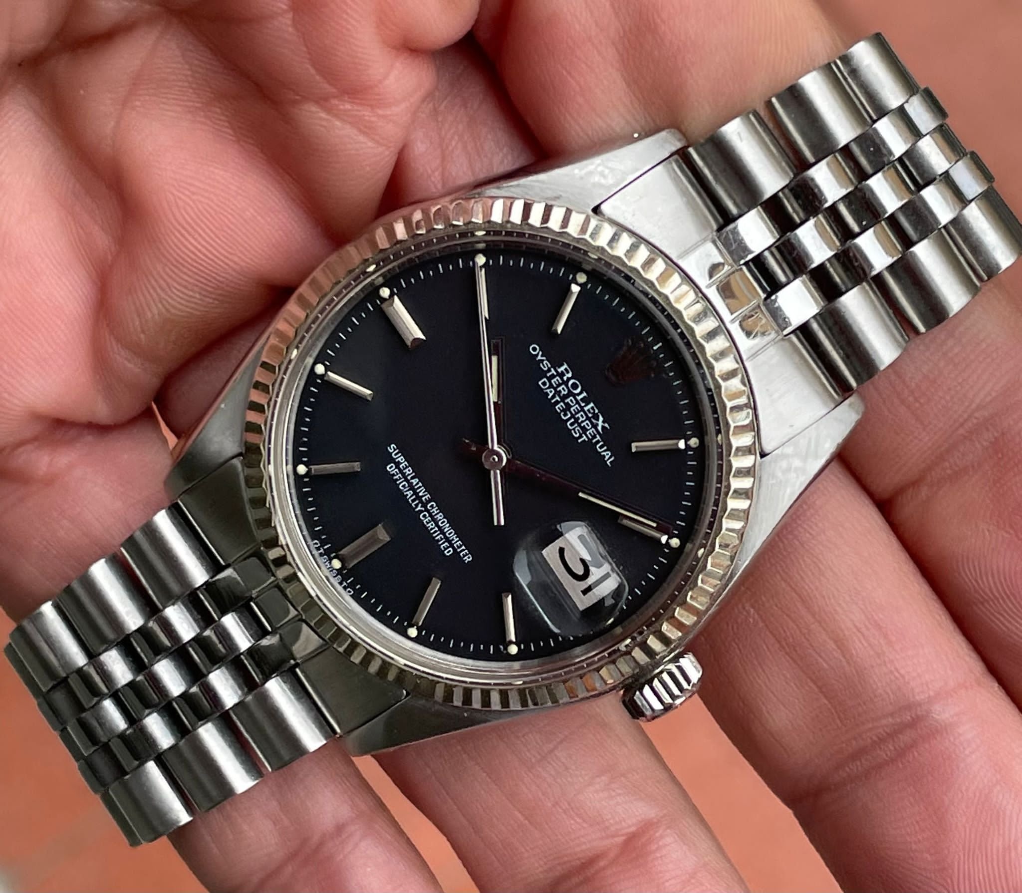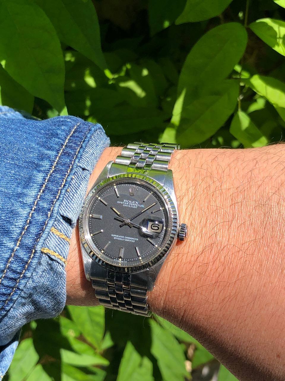 I have for sale a have for sale a real stunner: a 1975 Rolex Datejust ref.1601 with a very rare matte black pie pan "Sigma" dial in flawless condition, a solid case and excellent white gold fluted bezel.