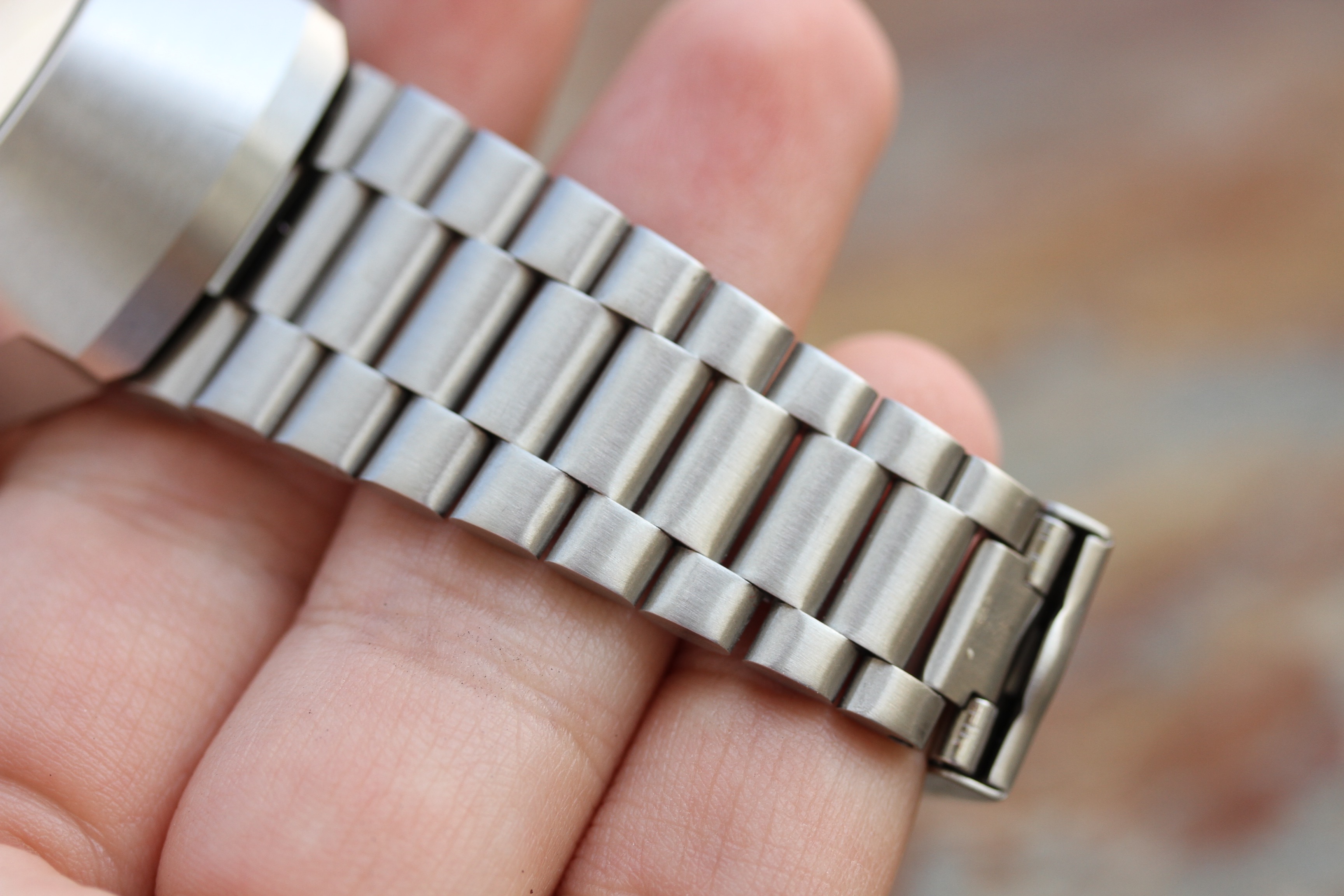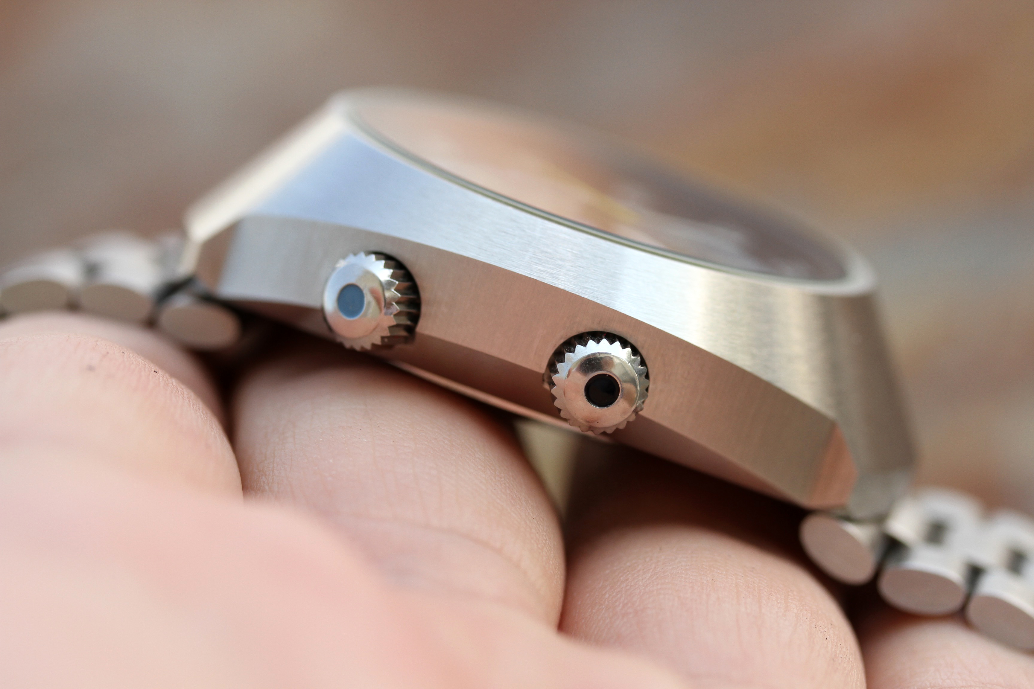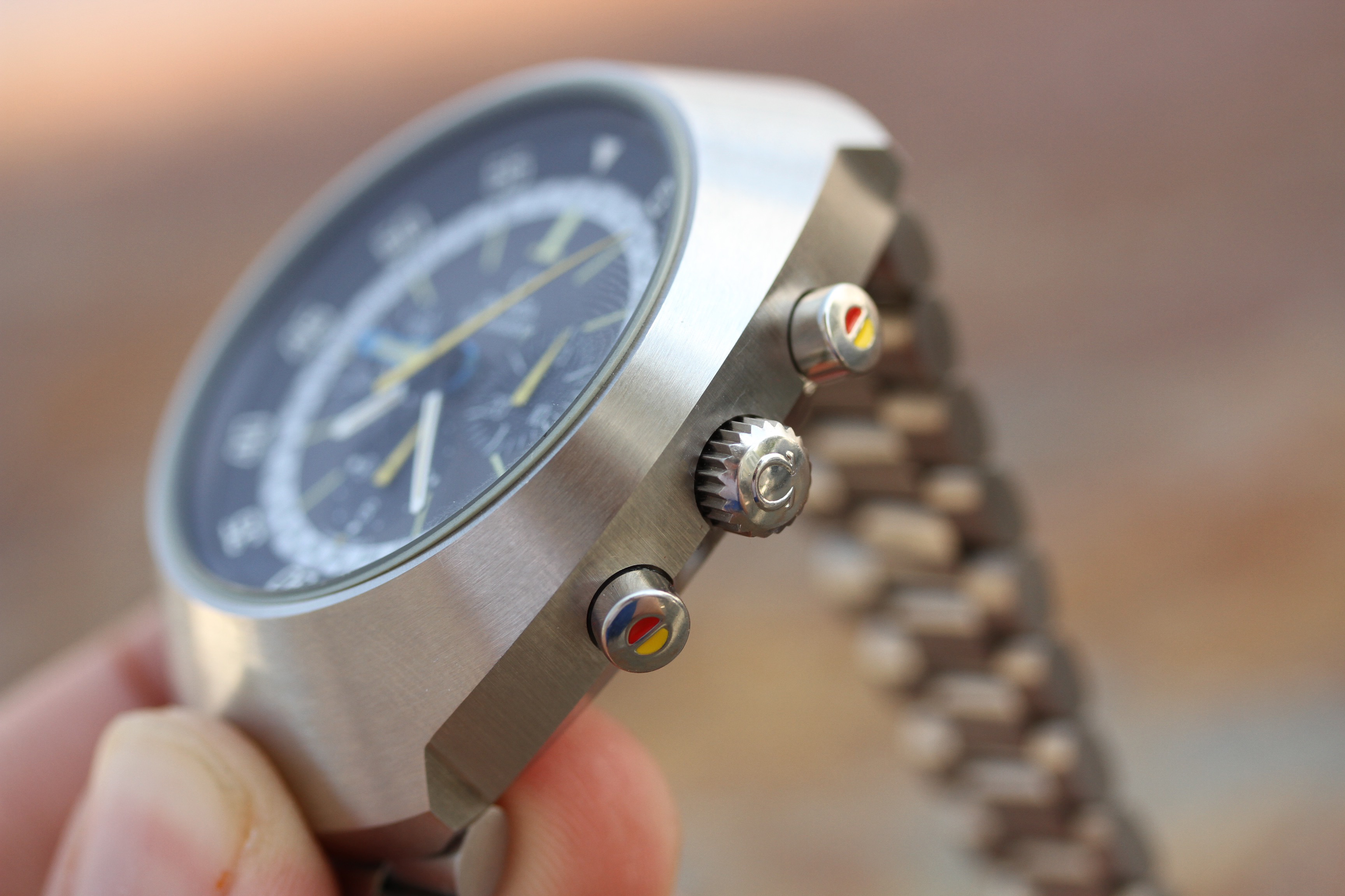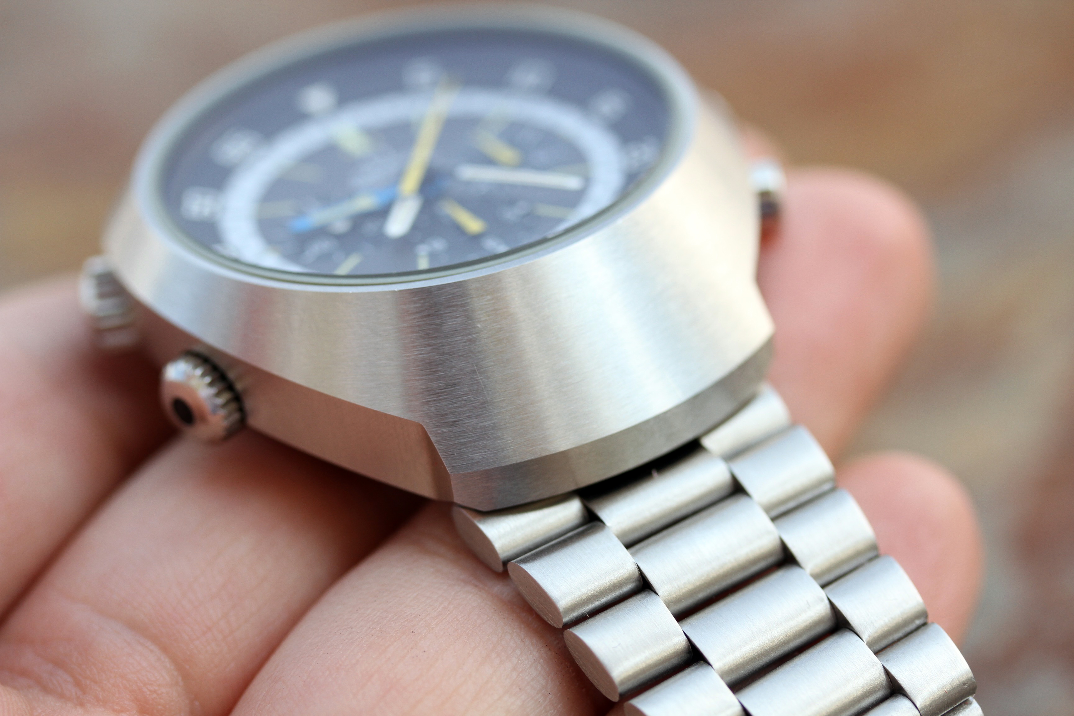 Super vintage condition case. Case has clearly never been polished. No dings, dents, or any notable scratches. The watch has probably never been worn. If you microscope it, you can see what I would call showcase wear from being in and out of AD showcase or possibly worn few times. These are very small hairline scratches here and there. No kinds of corrosion, oxydation on pushers, etc.