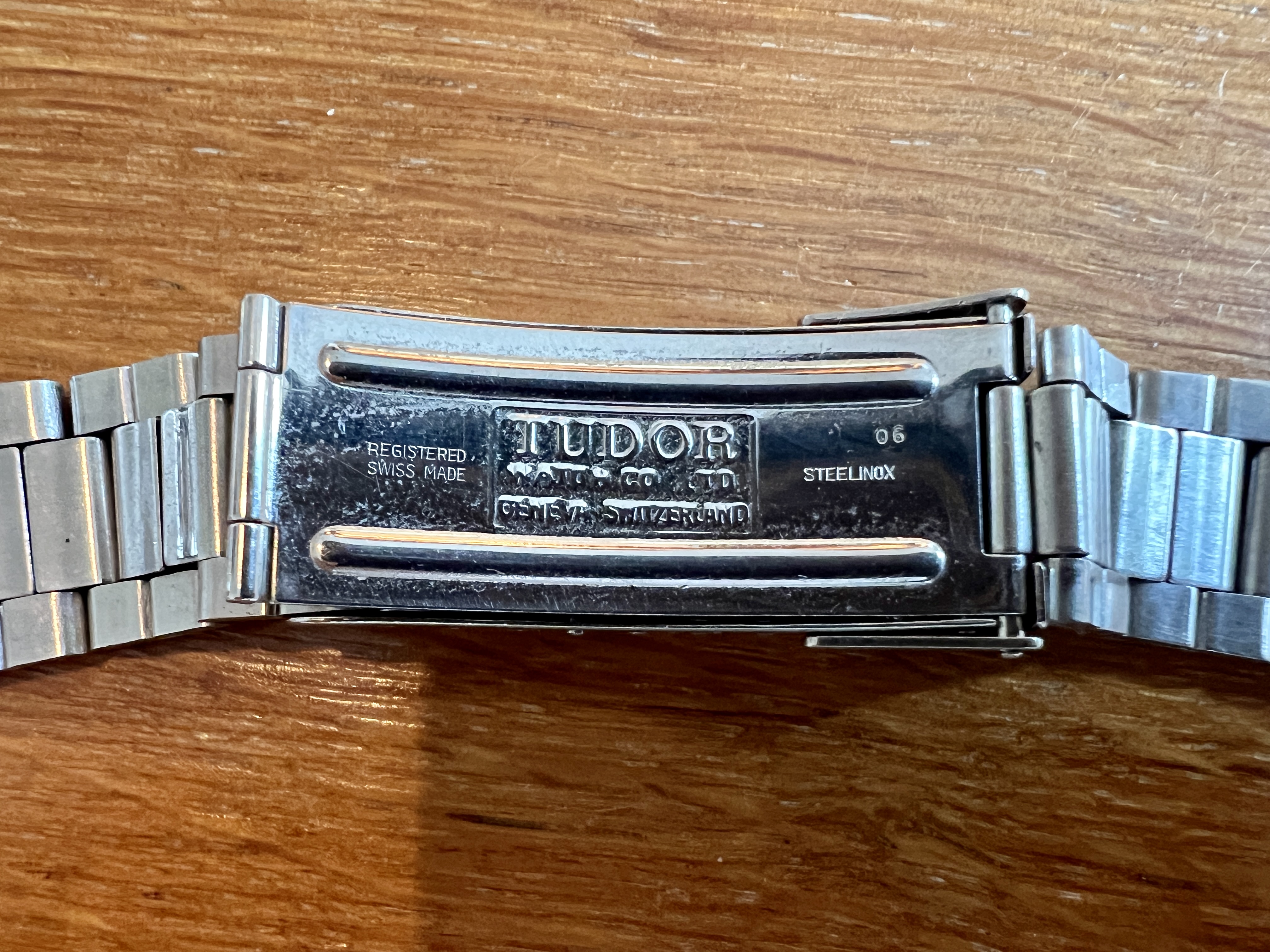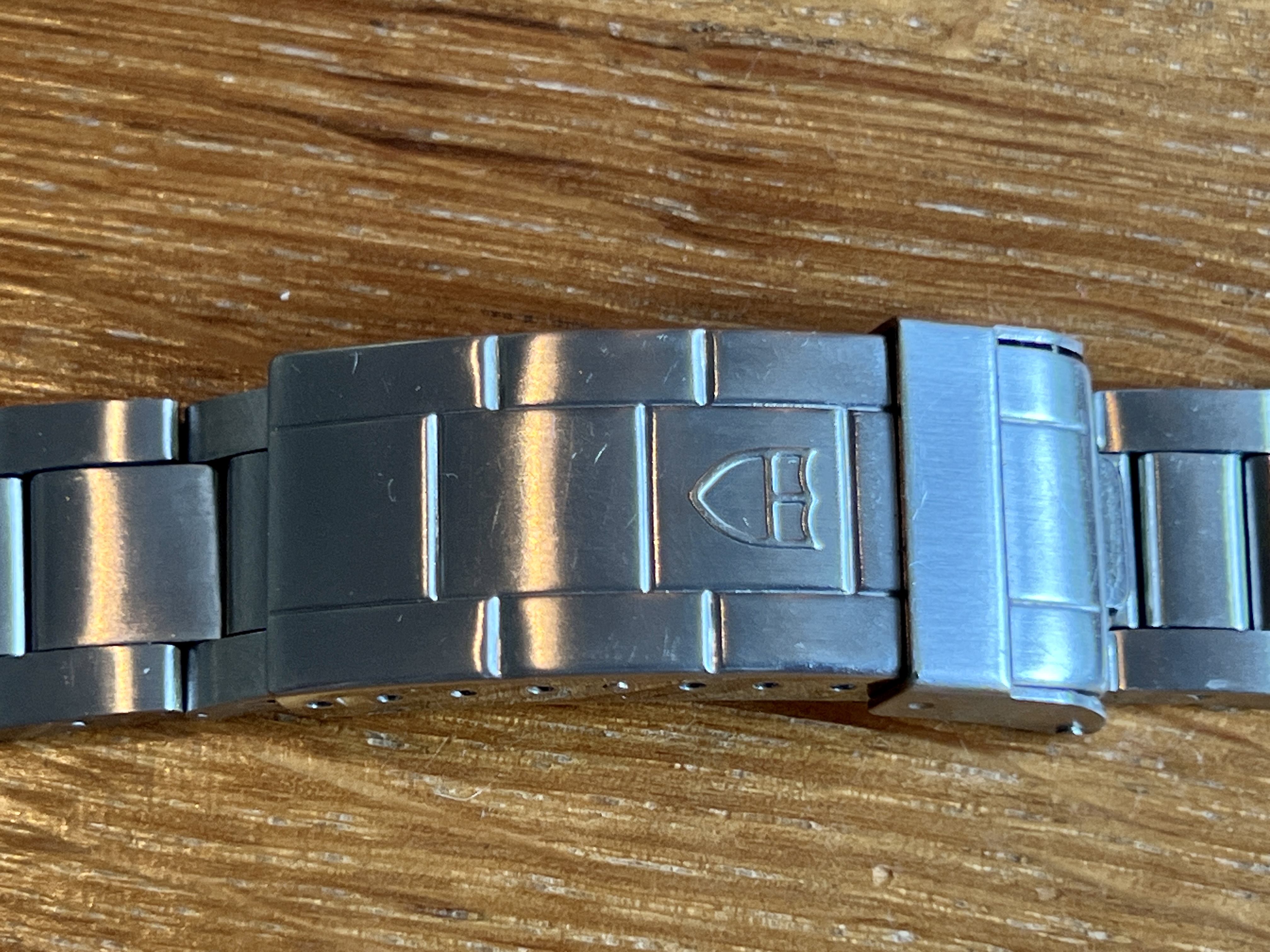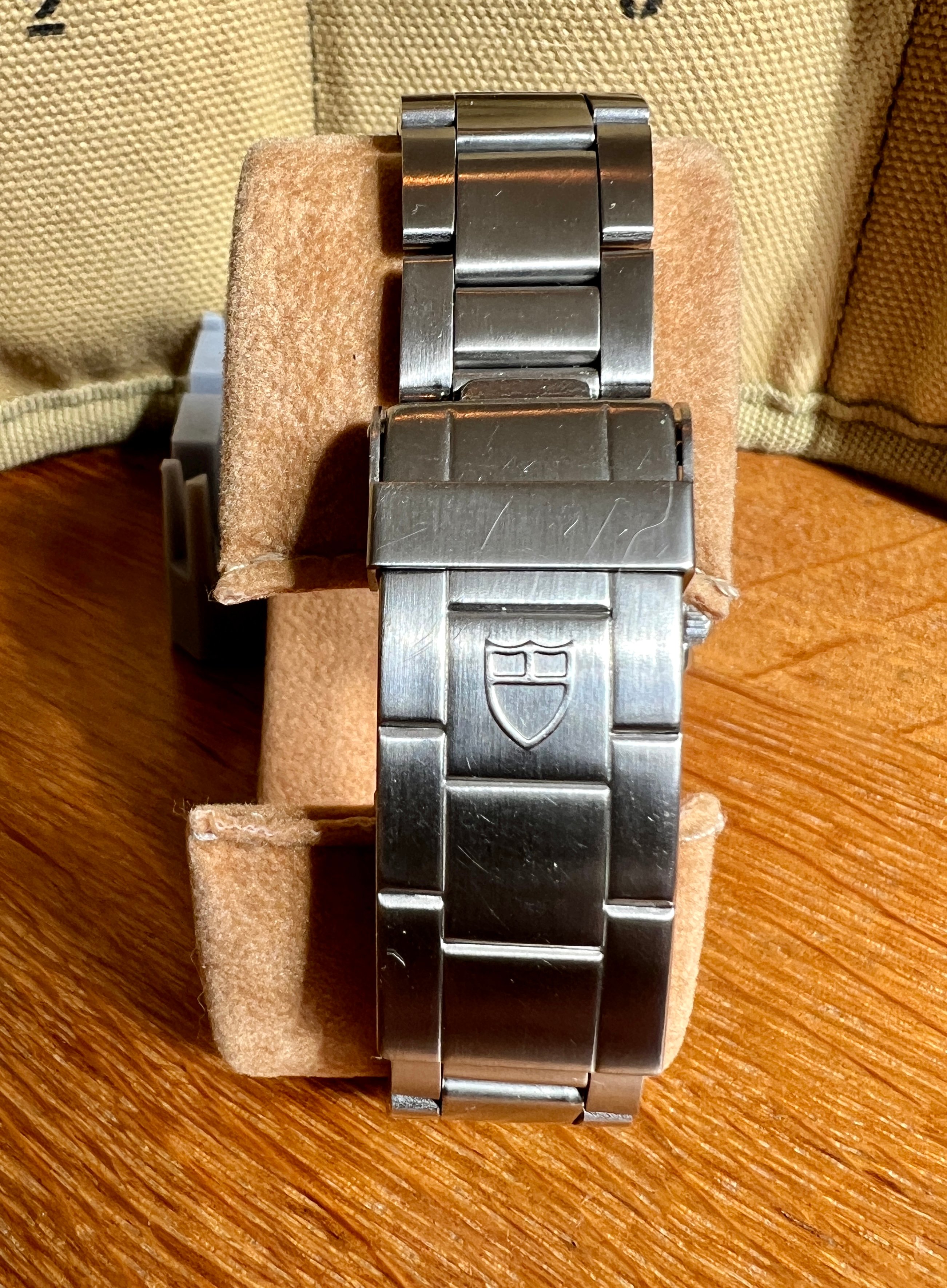It shows signs of an active life and wear commensurate to its age. The case is worn and has a few knicks and scars. The dial is in excellent condition and the plots have a very nice aged patina which matches the hands with no noticeable flaws. It is currently fitted to a later Tudor bracelet reference 9315 with 380B end links. The clasp is stamped 06. It appears full length with its divers extension.