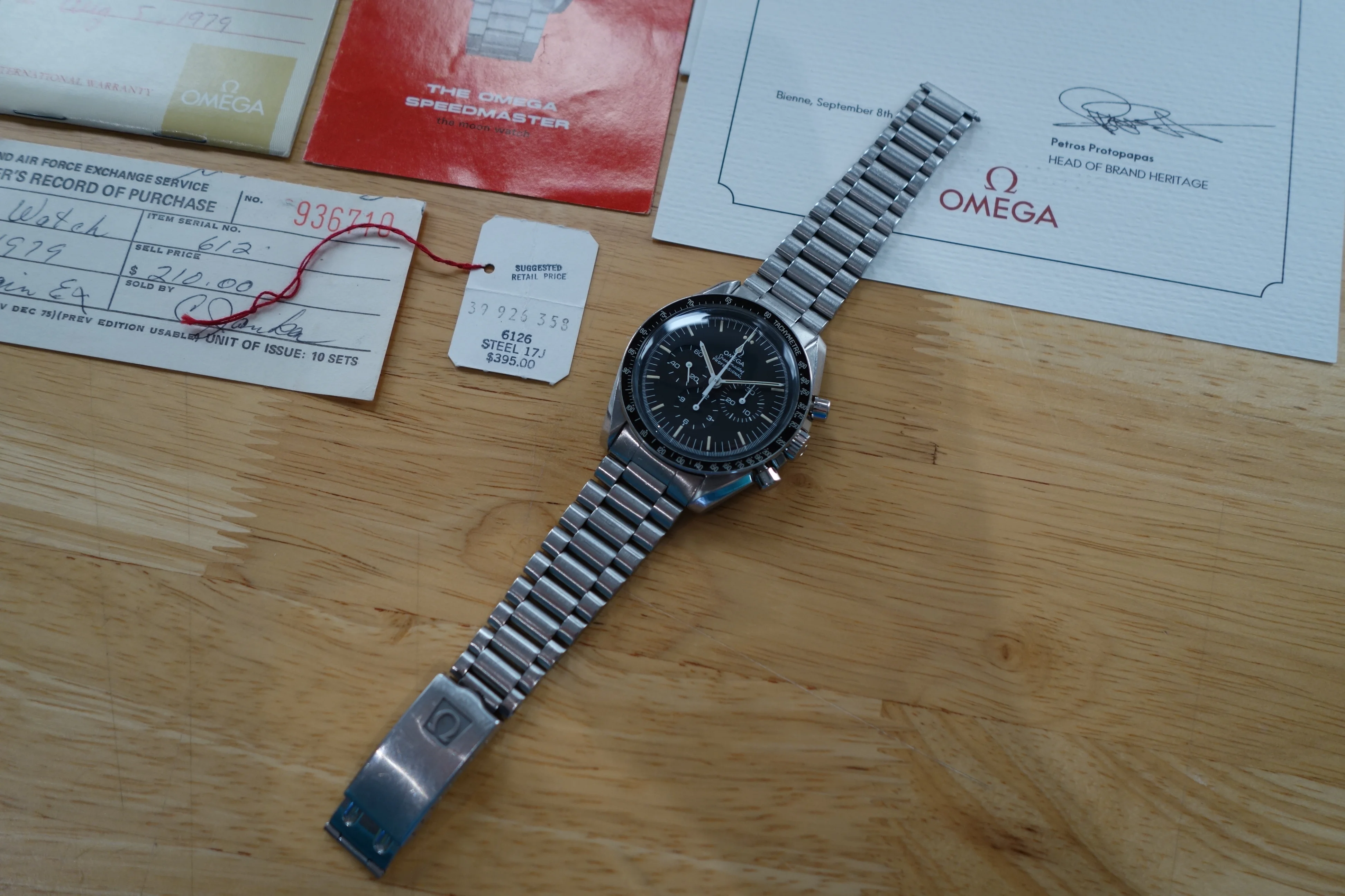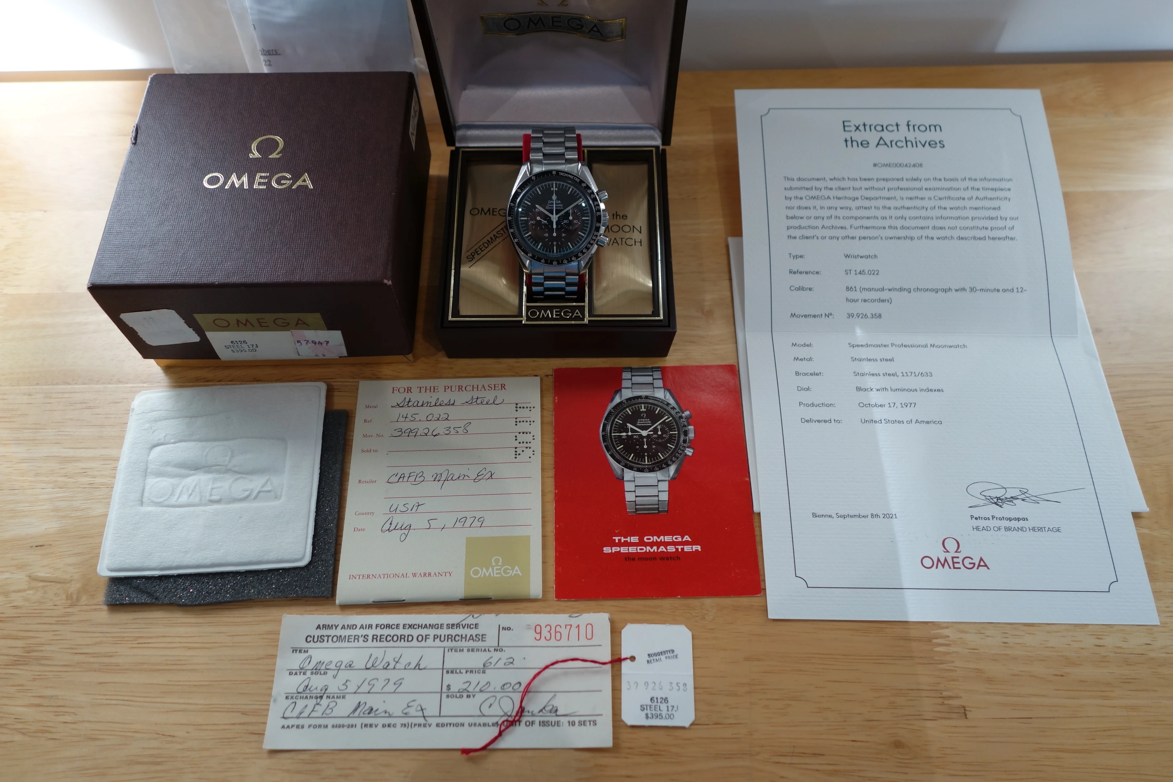 ACCESSORIES: Original box, booklet, warranty papers, hangtag, and Extract of the Archives showing production of October 17th, 1977 and delivery to the USA. This watch also comes with sales slips from CAFB, which is most likely Columbus Air Force Base, though Castle AFB and Cannon AFB are possibilities as well. Service receipts from 2023 are included as well. Overall, a fantastic package.