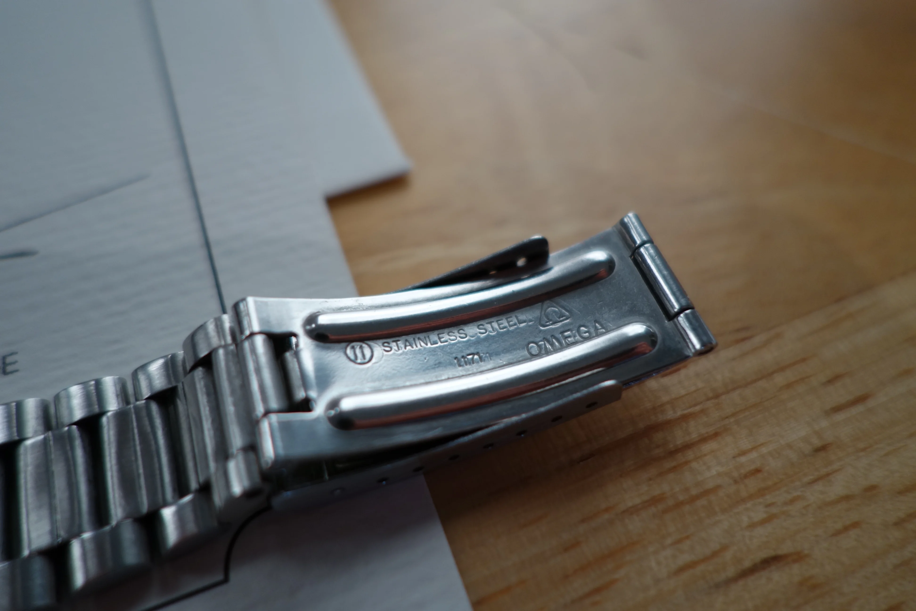 BRACELET: Omega 1171 with 633 endlinks and trapezoid logo, light scuffs on clasp and shows minor stretch.