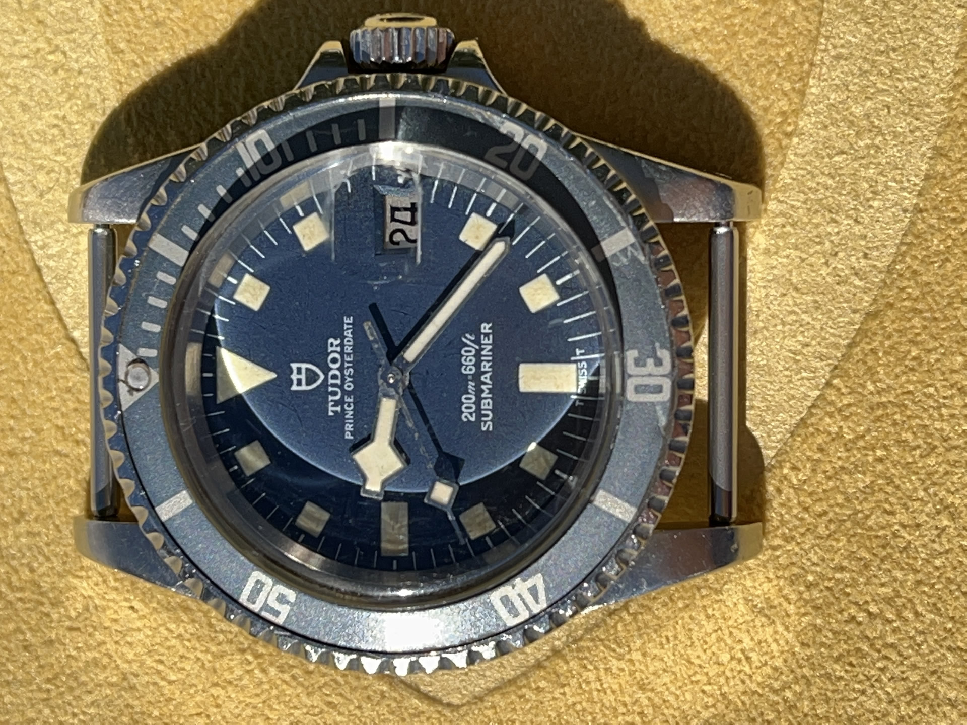 Watch was just serviced by Phillip Ridley, runs fantastic, keeps great time. Because it has original parts (crown / tube, crystal) it is not guaranteed to swim or dive. I have no doubt that service Crown/Tube/Crystal would pass full 200M.