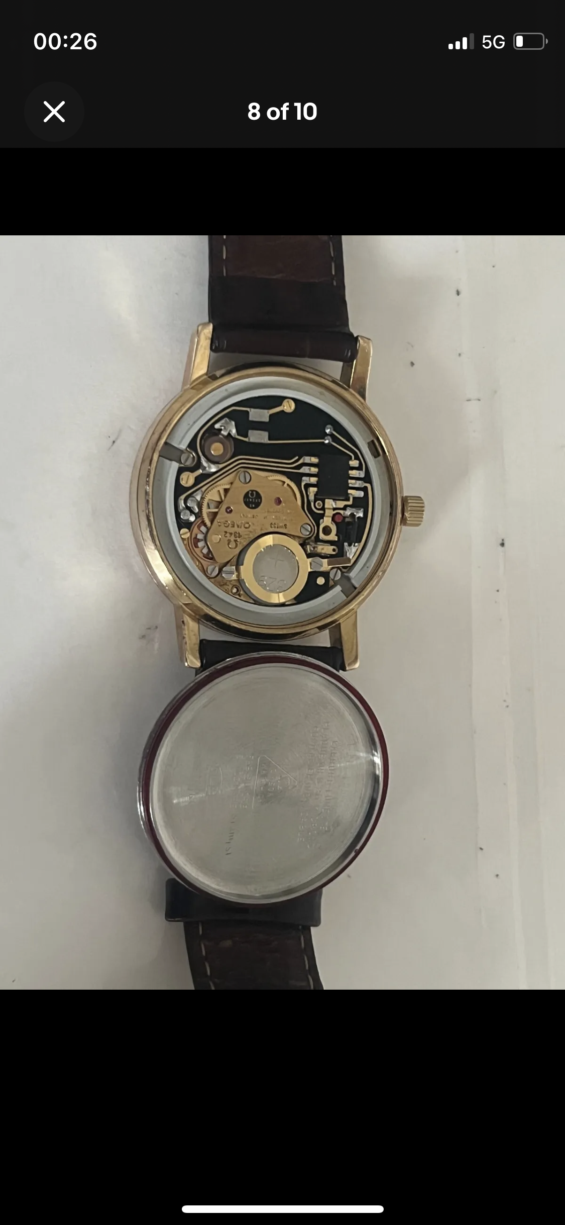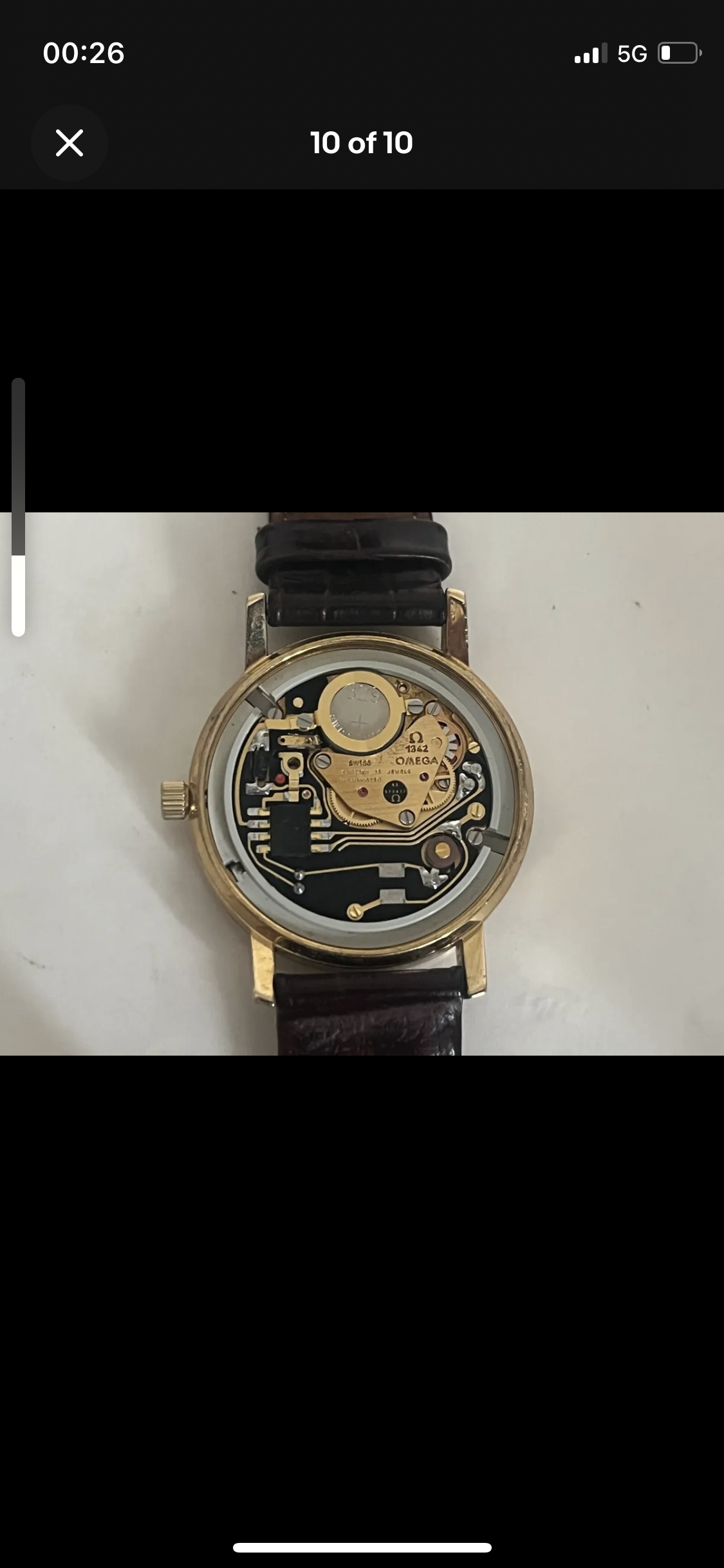 Now the bad news: In these photos it is not running. A non-running plated model needing a check-over and at least one part is essentially valueless. There are watchmakers who will work on these but they are hard to find. Wanting to get my 1342 running again for sentimental reasons I bit the bullet and sent it to Omega at a cost of several hundred Cowrie Shells. YMMV on whether that is worth it to you.