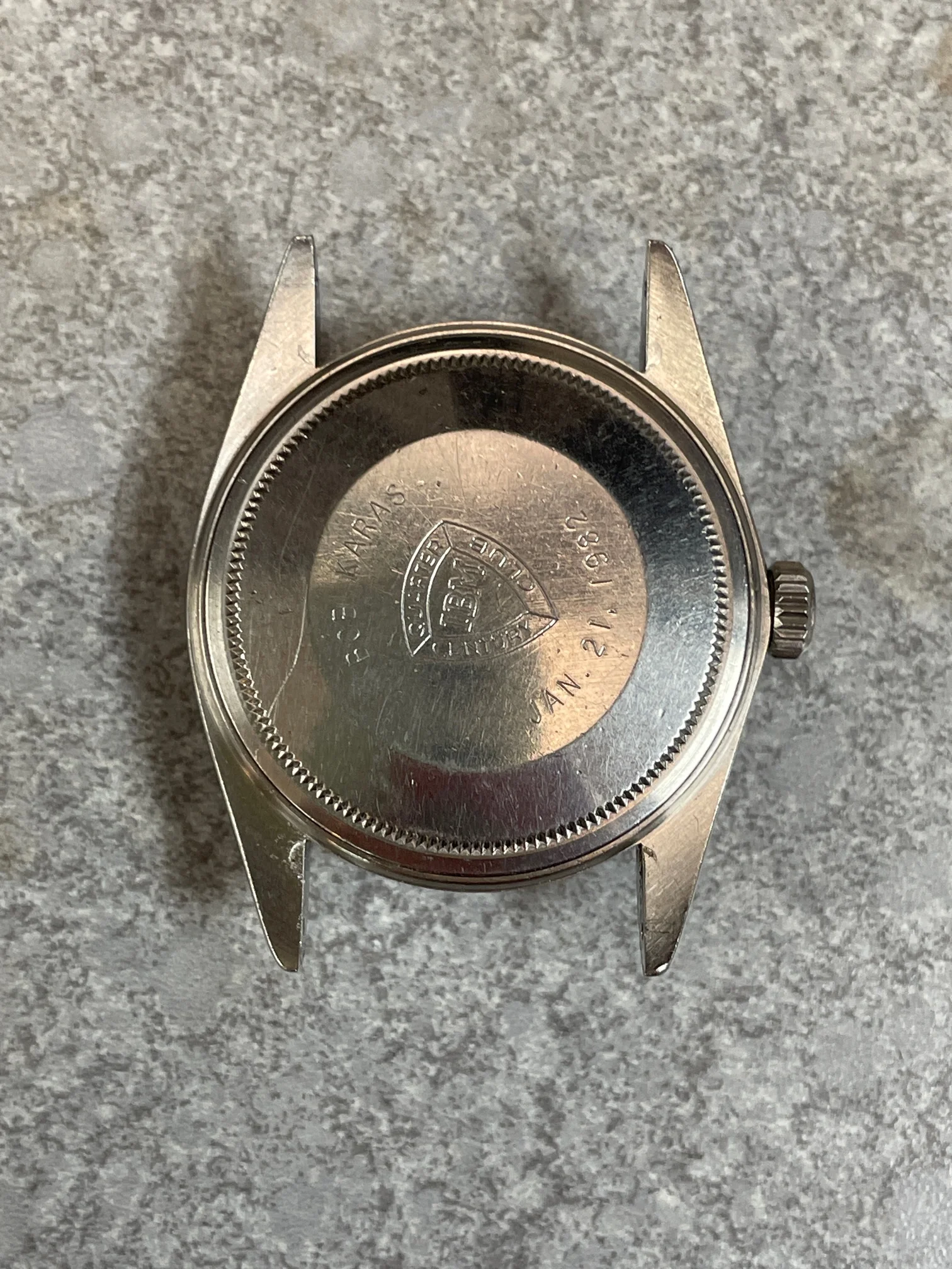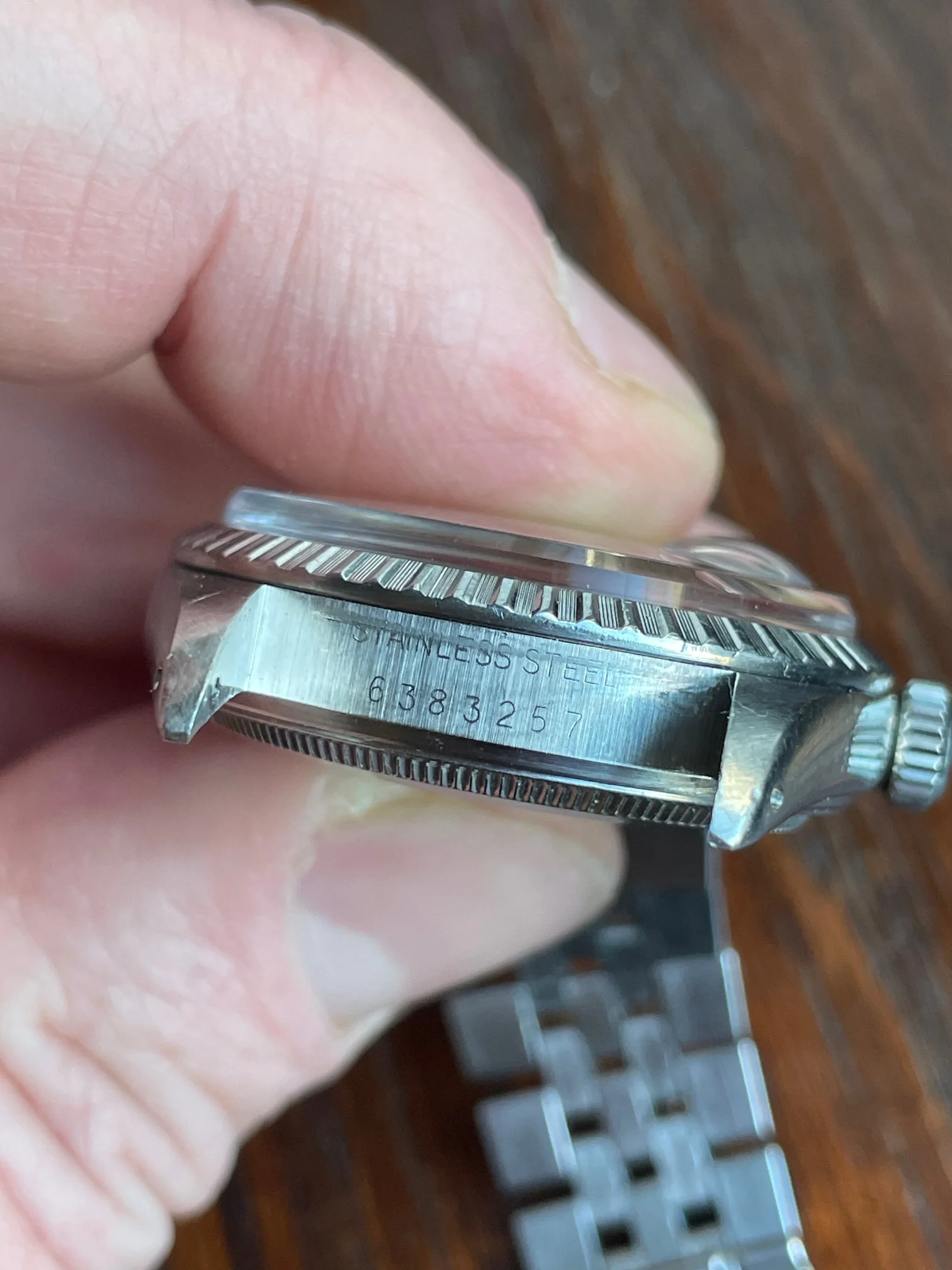 CASE: unpolished 36mm, the etchings are clear between the lugs and on the caseback, the case shows mild signs of wear (not bad for 40+years). The crystal's excellent, the original crown screws down correctly, and the bracelet is both a) slightly stretched and b) original to the watch, with a D stamp indicating it's from '79 (the story I've read about the IBM watches is that they were purchased in bulk, hence this watch being from 1980 but dated on the caseback to January of '82). The bracelet should accommodate up to a 7.5" wrist.