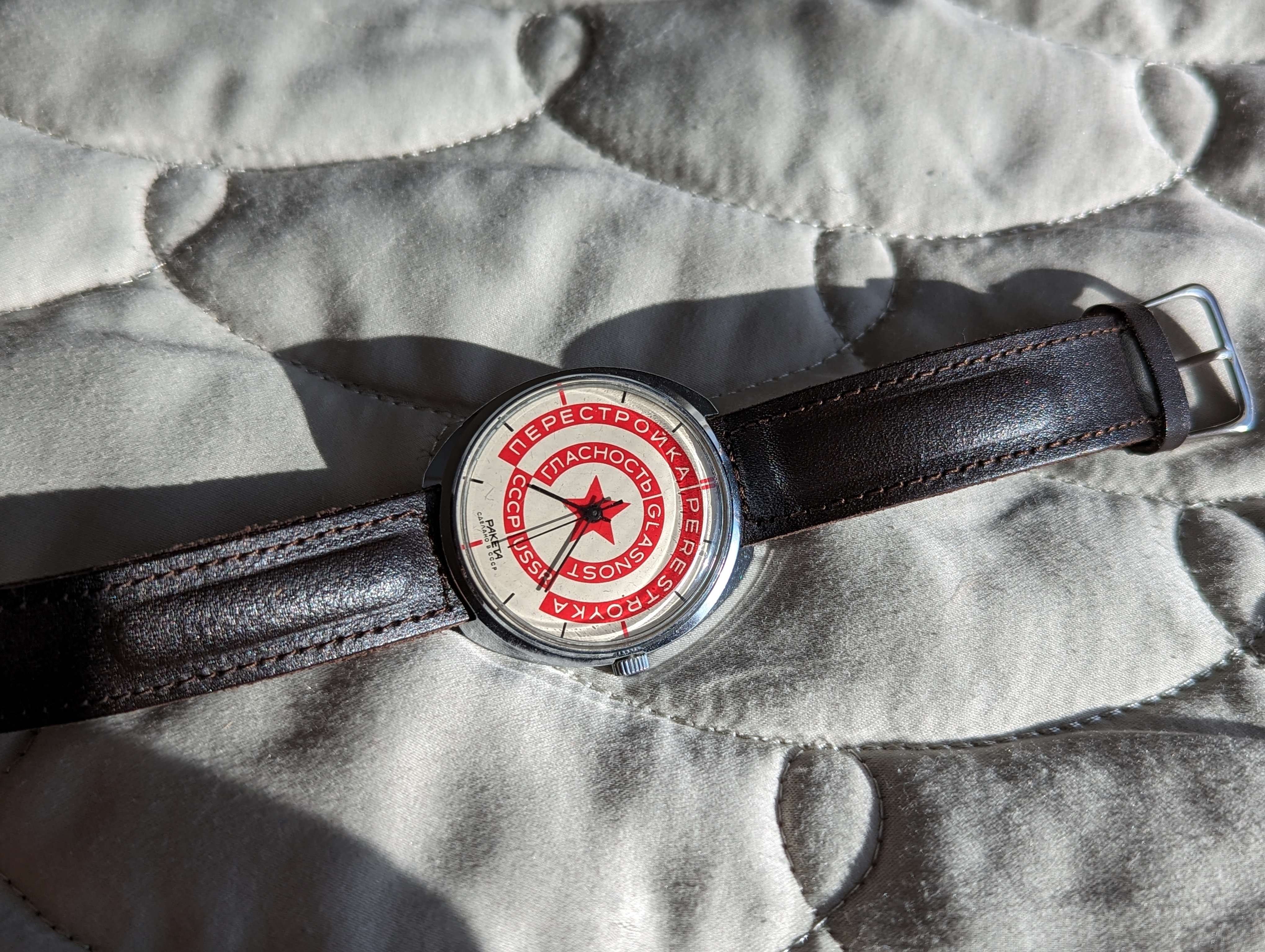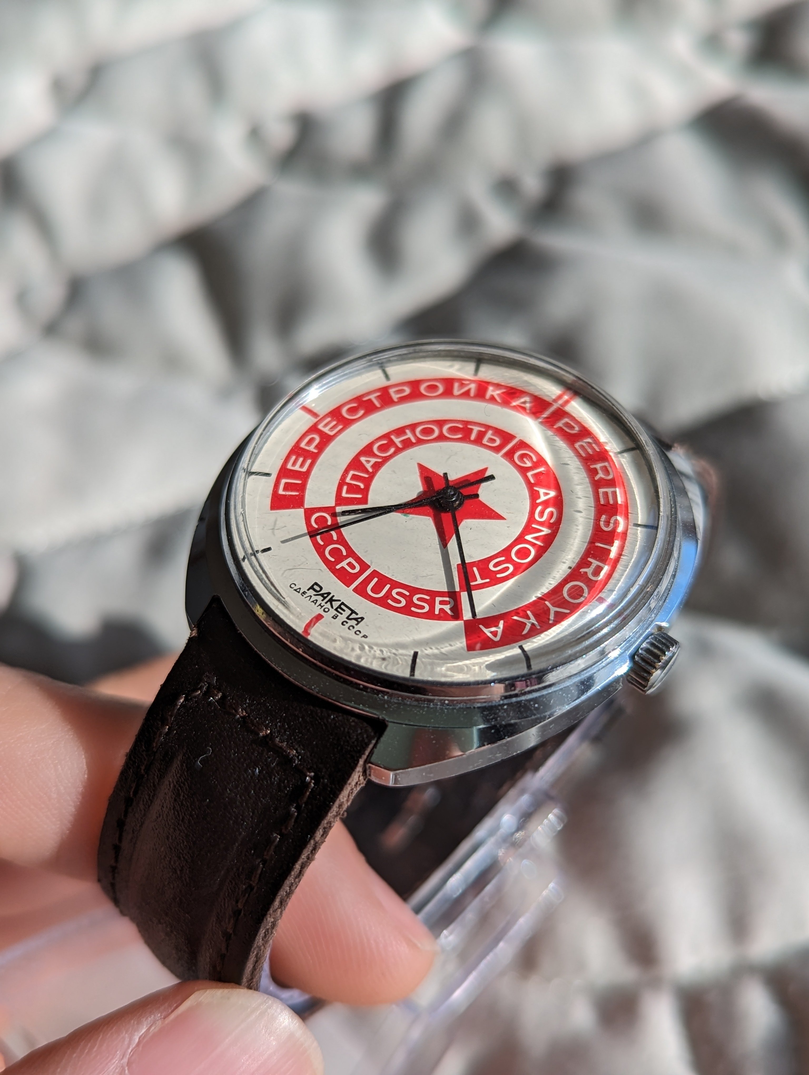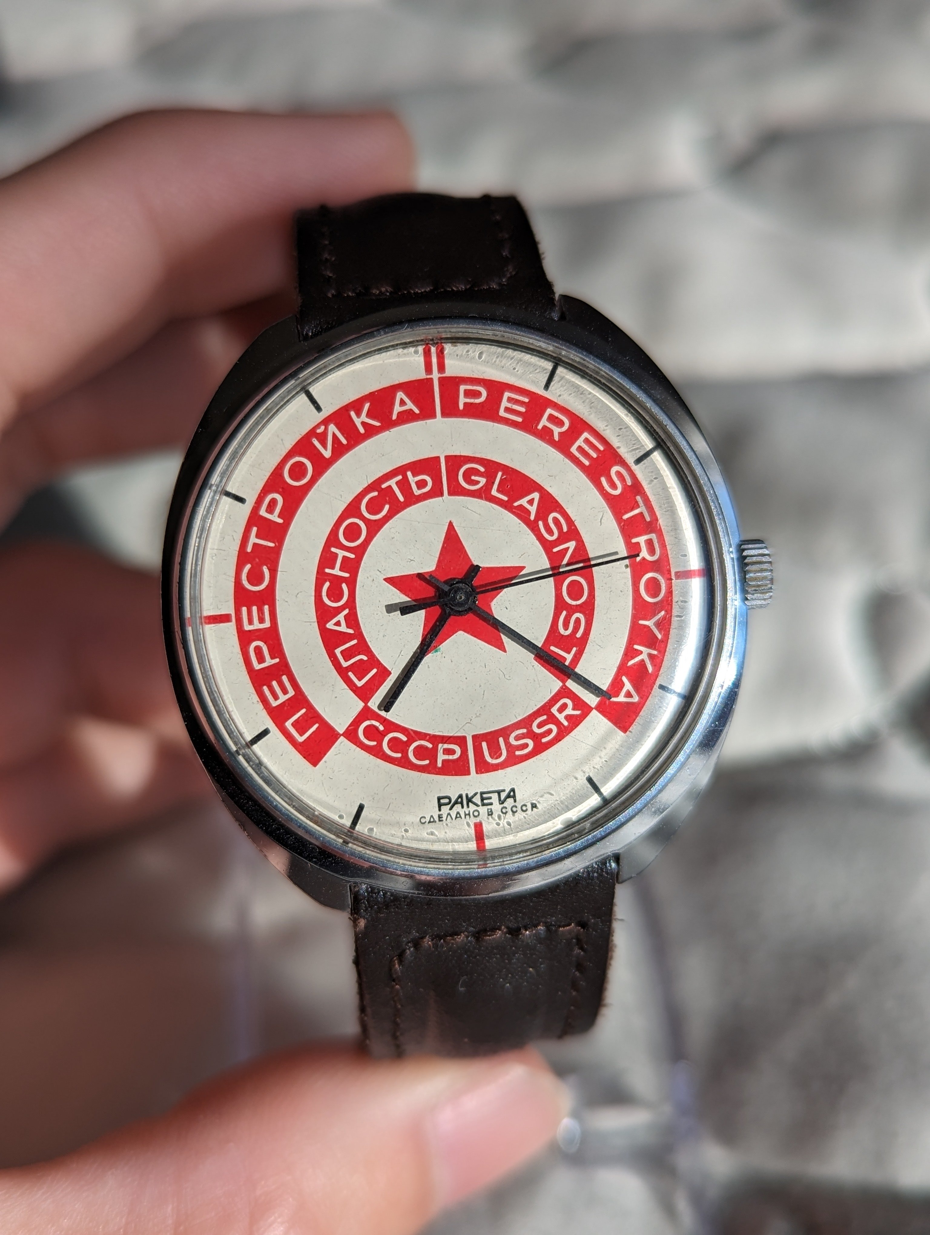 ·Here we have a 1980's Soviet Raketa. Honestly, I don't know what the writing on the dial means, so perhaps someone could tell me. The movement is a manual wind, and keeps great time, but I do not know the service history. The case is chrome plated and measures 39mm in diameter, 18mm lug width. It's in excellent condition, judge by the photos. I'm located in the US, so no waiting a few weeks for shipping, as most of these come from Russia or Ukraine. I'm asking only $100 for this cool piece of history. Thanks for looking.