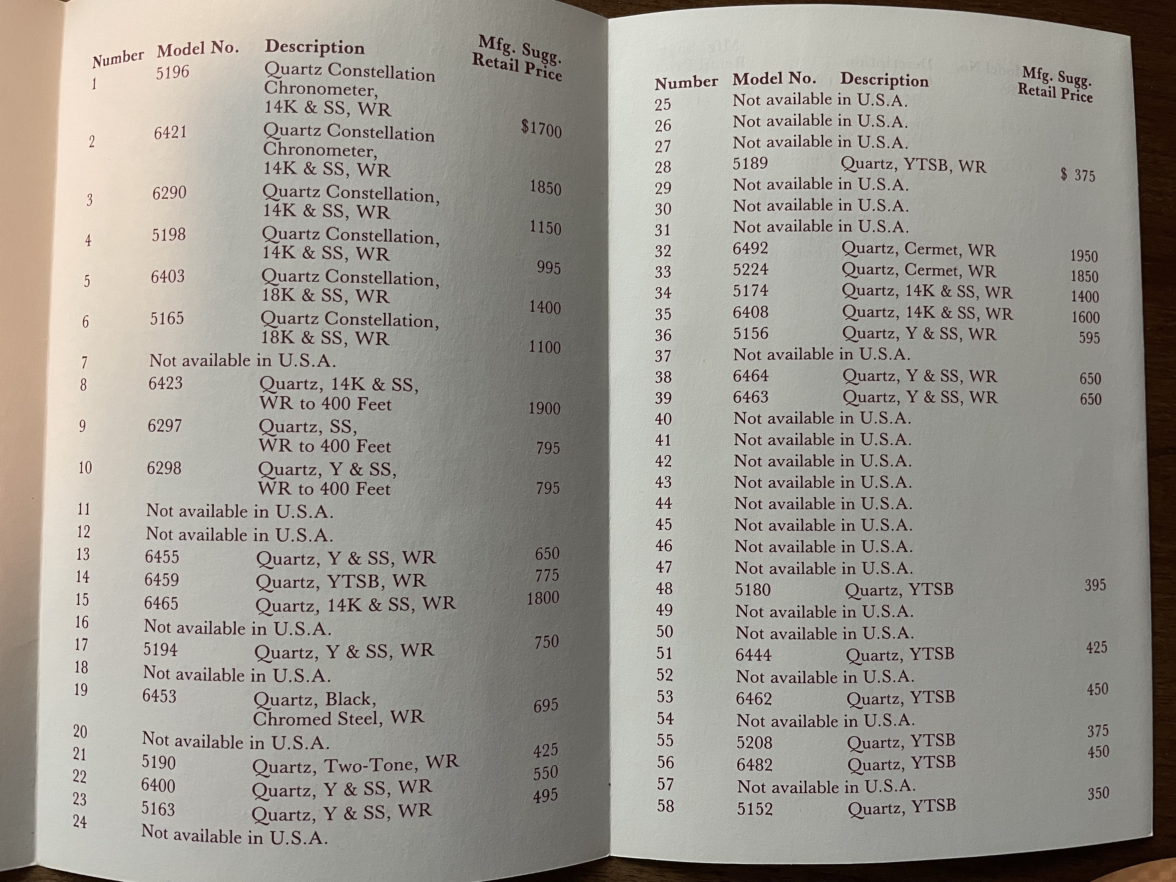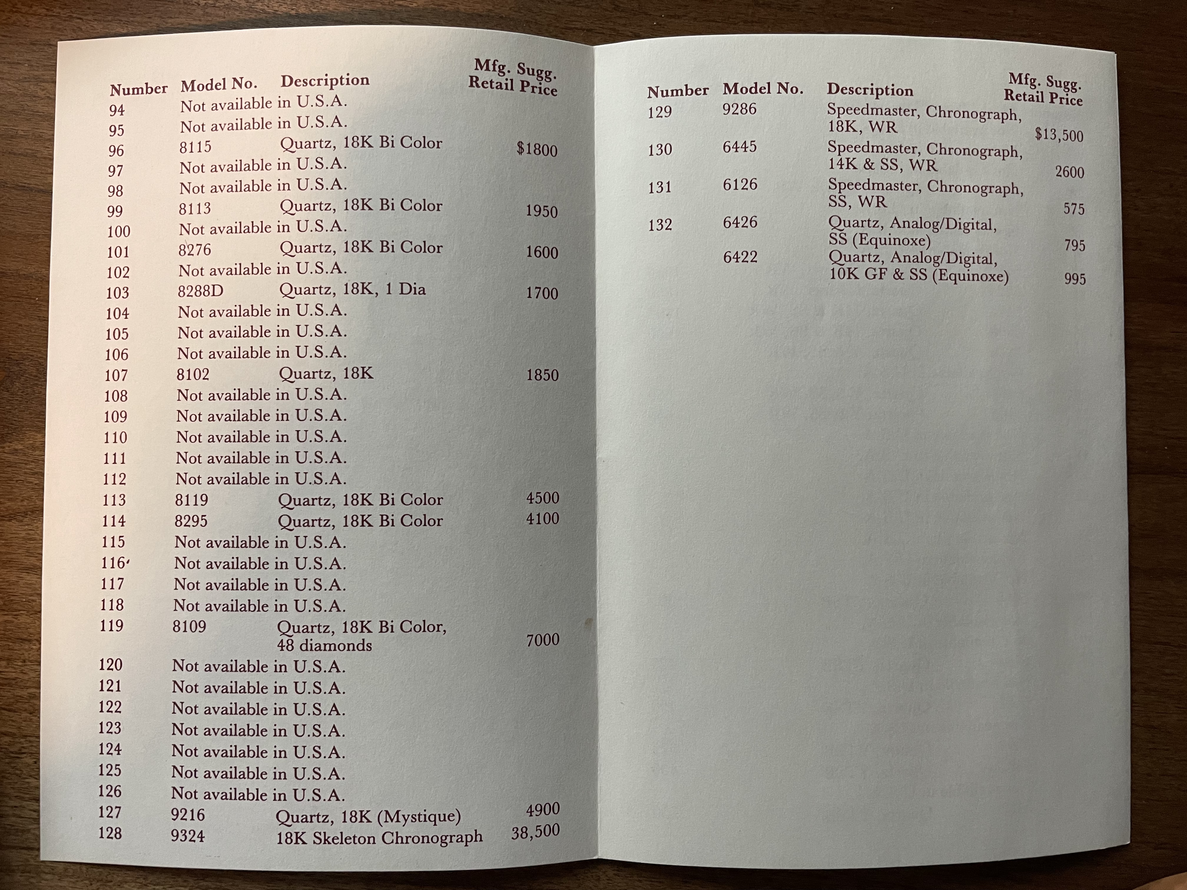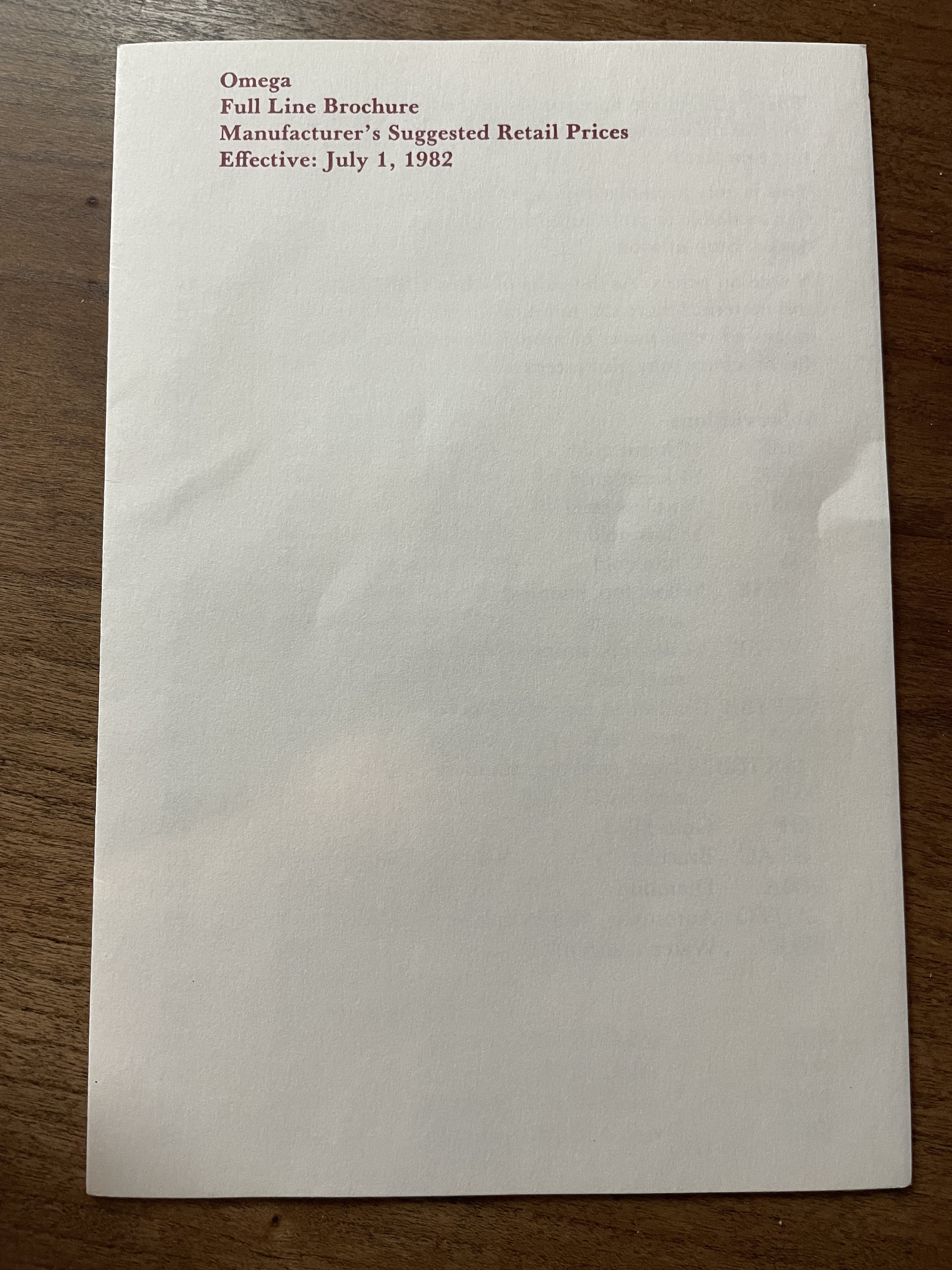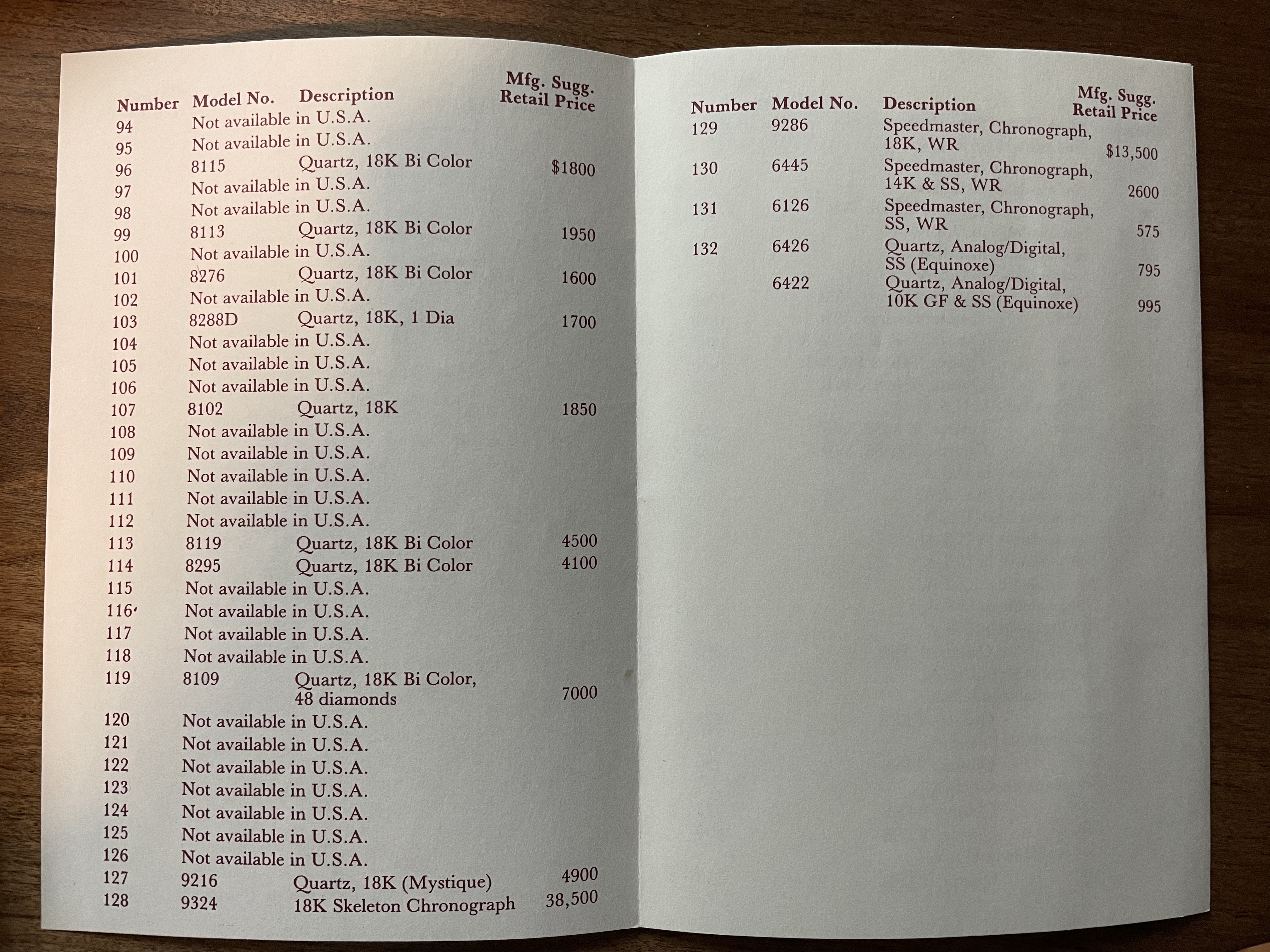 Bought a SMD recently and the shipper included a catalogue with retail pricing from July 1982. Not the most sought after models but might be of interest to some members. Some interesting models and price info for models like the Mystique and 18k Skeleton Chronograph (a whopping $38,500).