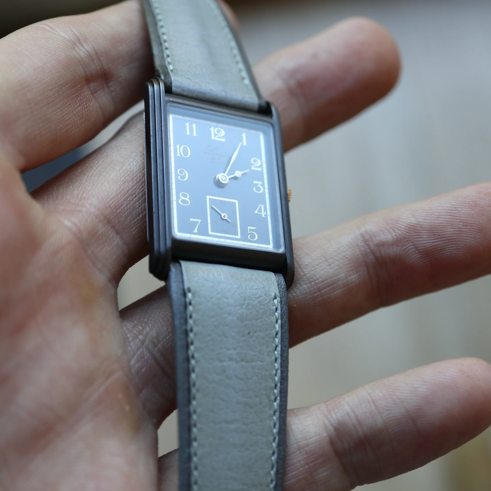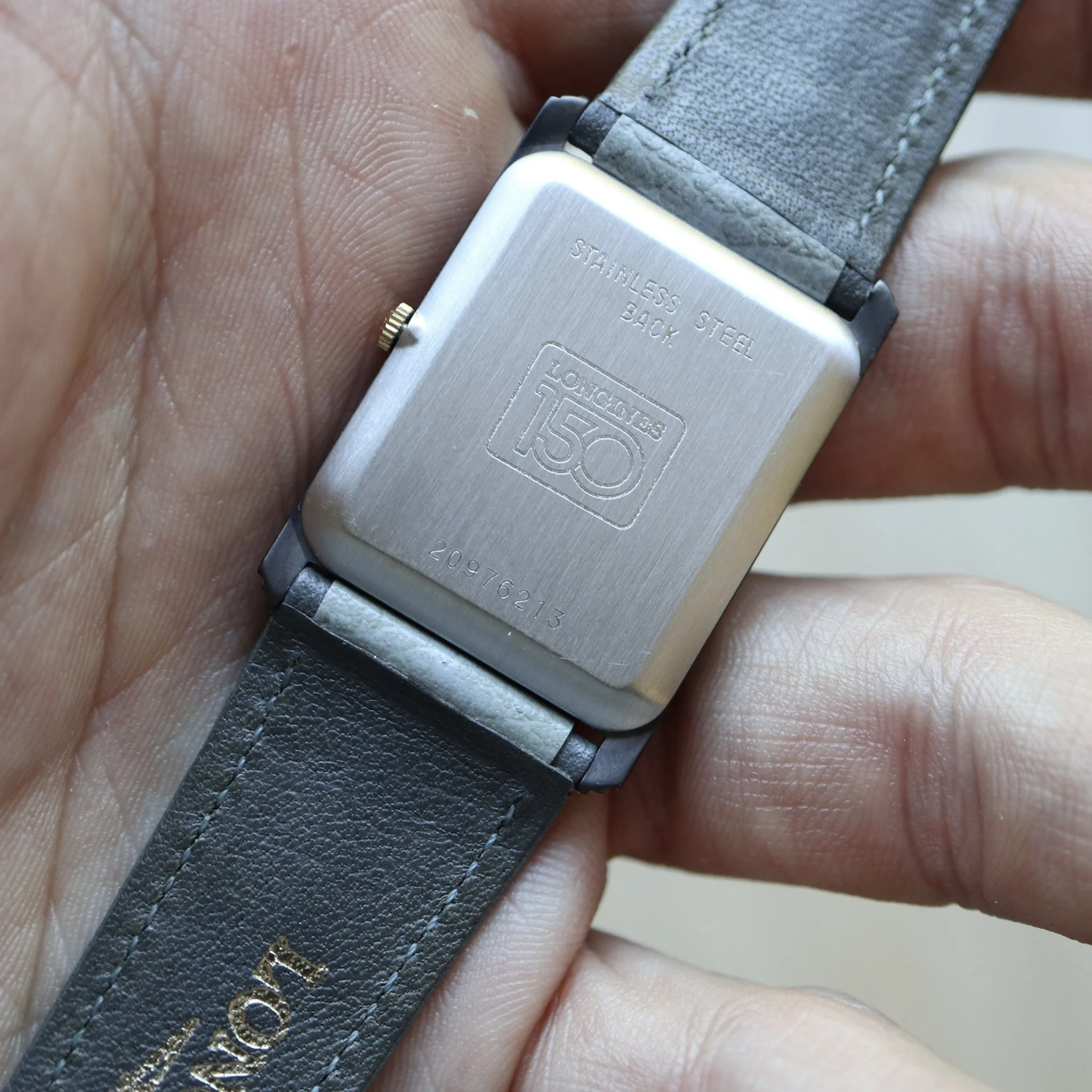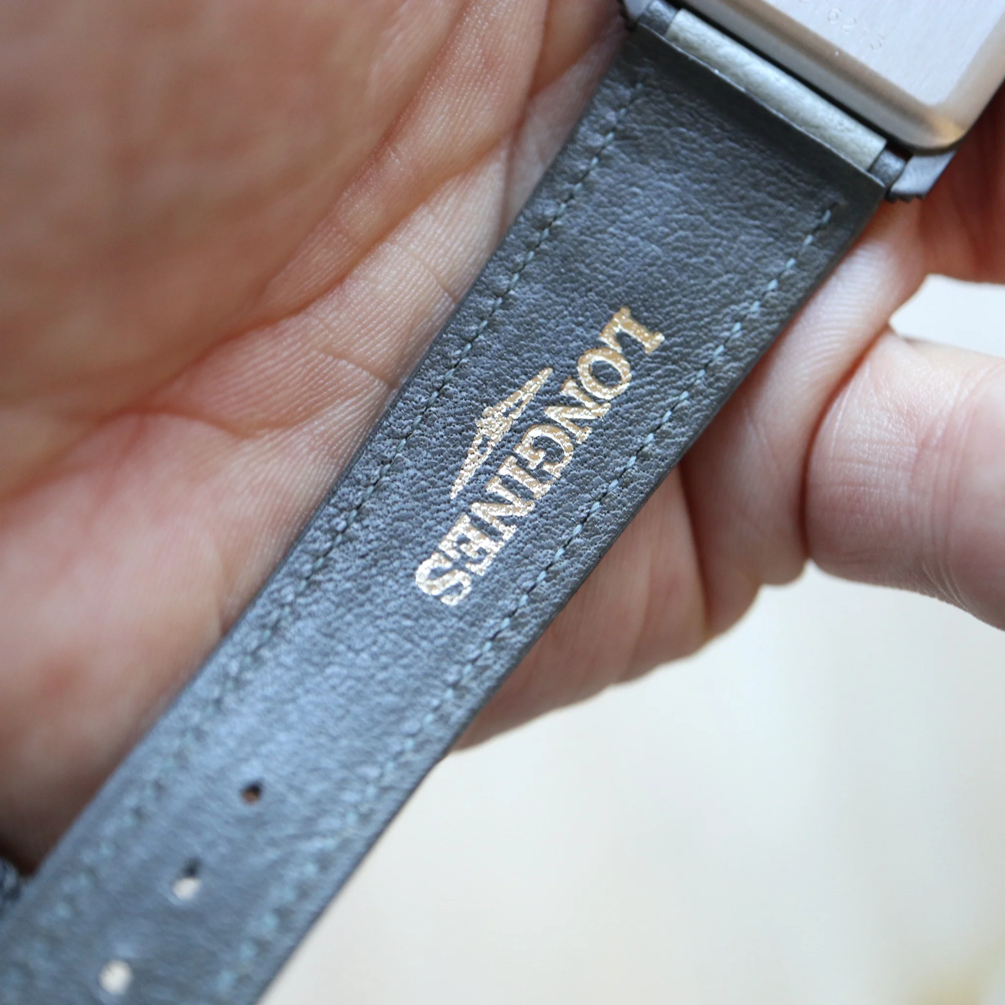 A nice Longines special anniversary reference in near NOS condition. Very thin and light on the wrist. PVD coated step case, stainless steel back, mineral glass, tri-color brushed center dial, breguet numerals, original signed crown, original bicolor leather strap, original pvd buckle. It runs perfectly. Lots of value for money! There is no damage, whatever you see on the case are dust particles!